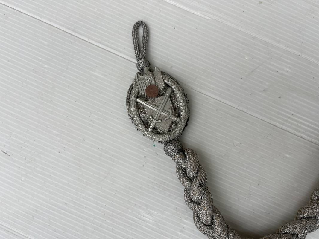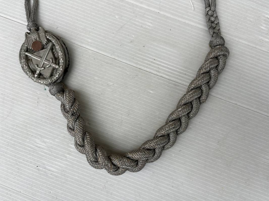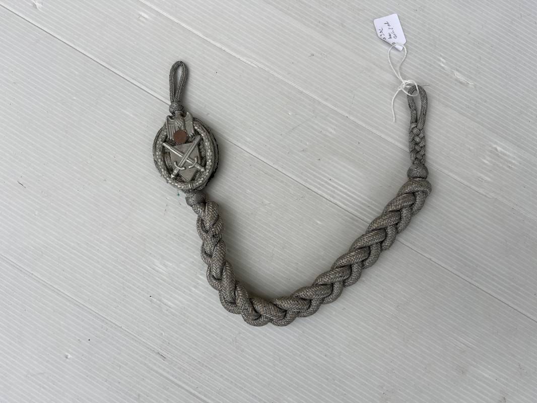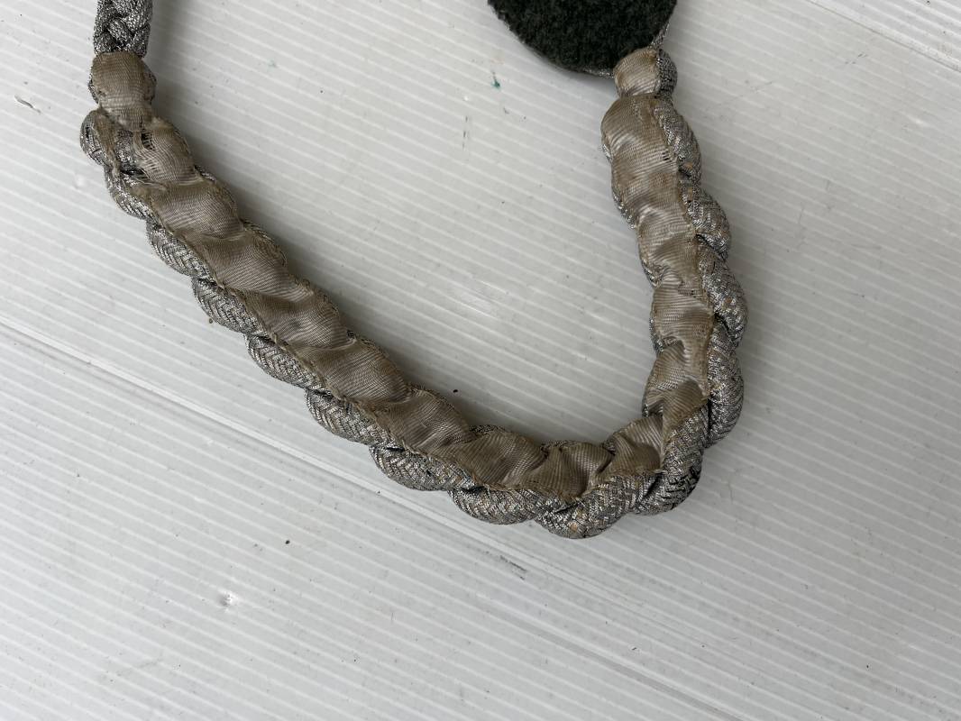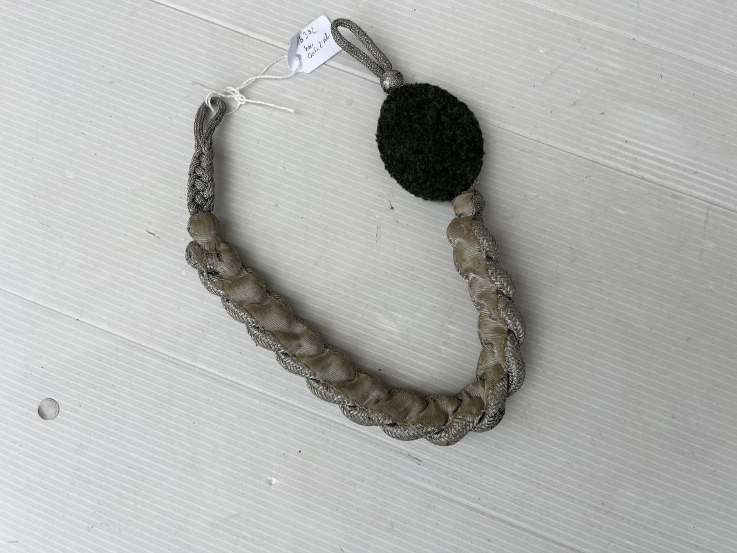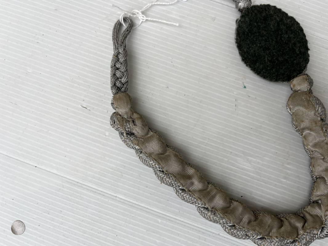 Beau cordon de tireur de la Heer du 2ème modèle. Écu en alu avec couronne feuilles de chêne, aigle et glaives. Cordon tressé en fil d'aluminium. Boutonnières. Légèrement porté en parfait état 1939/45. Ref 21204