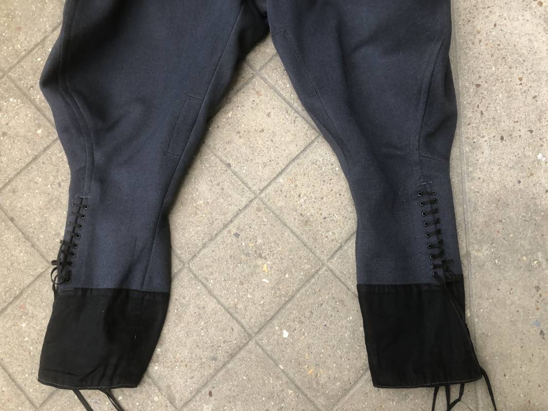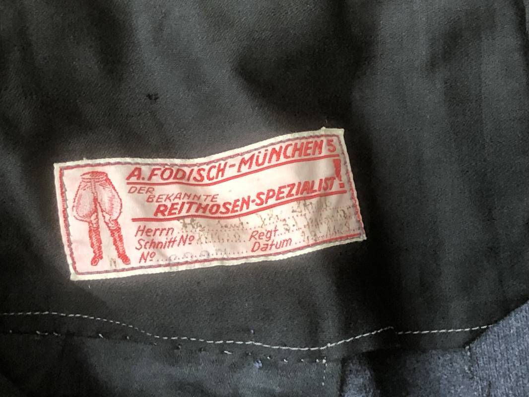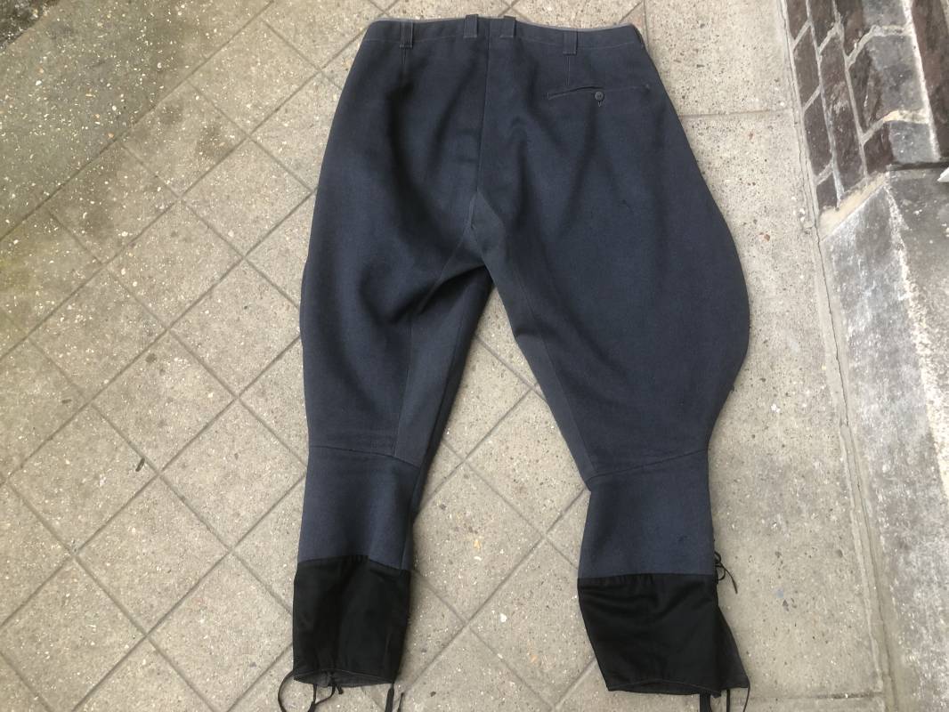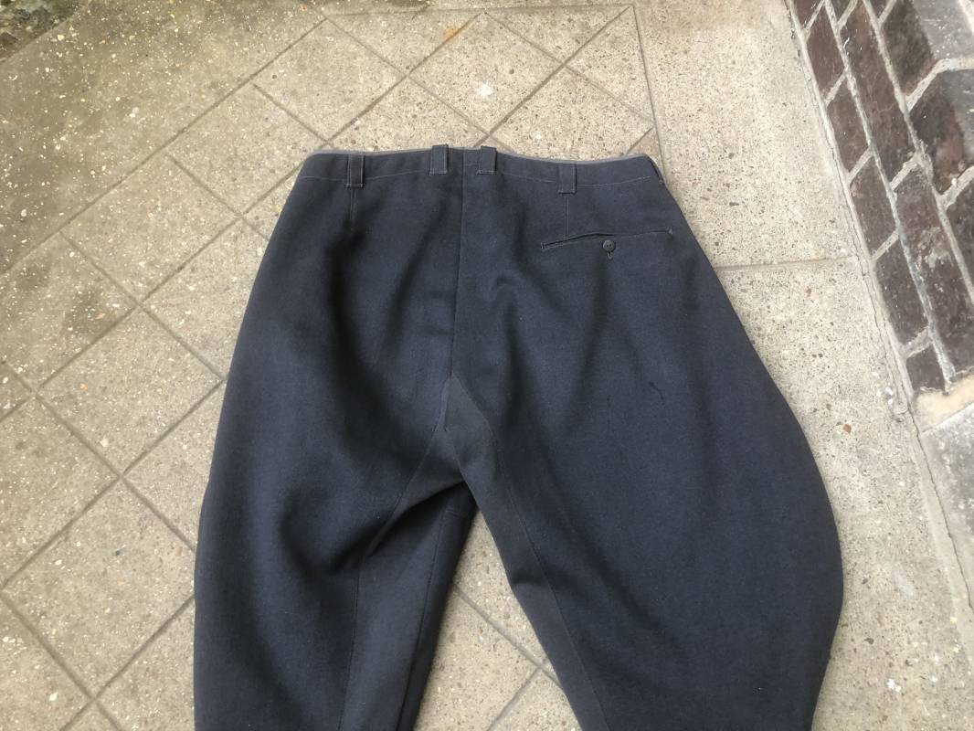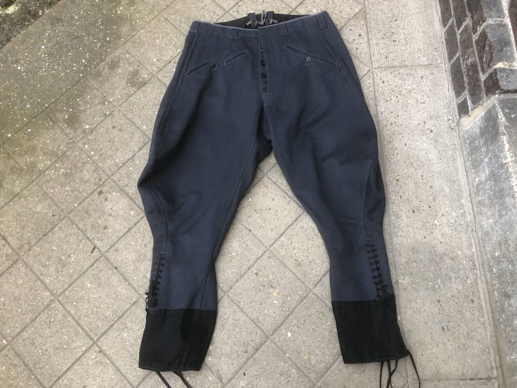 Trés belle culotte d'un officier de la Heer . Culotte en gabardine gris foncé . Passants de ceinturon en tissu , Trois poches dont une fessière , poche à gousset . Crochet métallique de braguette . Boutons plastique au nom du tailleur militaire FODISCH cousus d'origine . Bas de jambes à lacets et manchettes en coton noir , lacets d'origines en coton noir . Intérieur doublé en coton satiné noir . Etiquette fabricant du tailleur militaire A Fodisch Munchen . Nom de l'officier Rgt 3K/ Jager Rgt 135 . Daté 23 11 1938 . Numero matricule . Taille 40 longueur 96 cm . Culotte légèrement portée en parfait état . Gabardine trés fraiche . A noté petite reprise sous la braguette ( voir photos ) . Belle culotte de fabrication précoce d'avant guerre d'un officier d ela Heer 1935/40 Ref 19412
