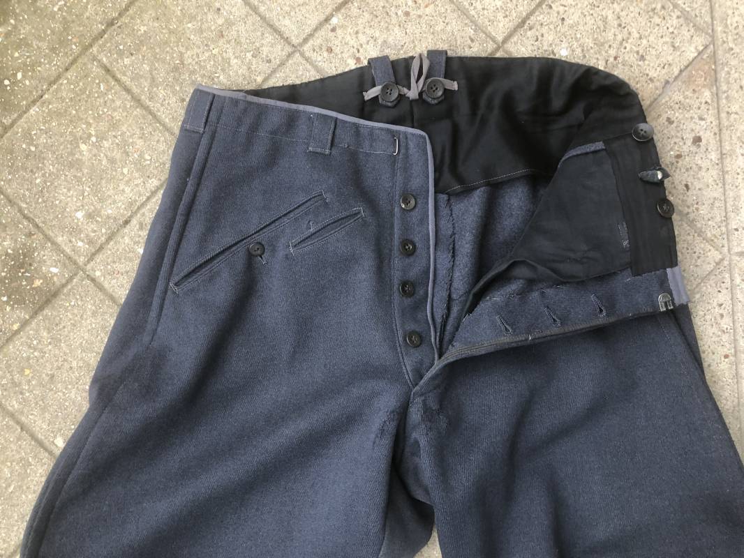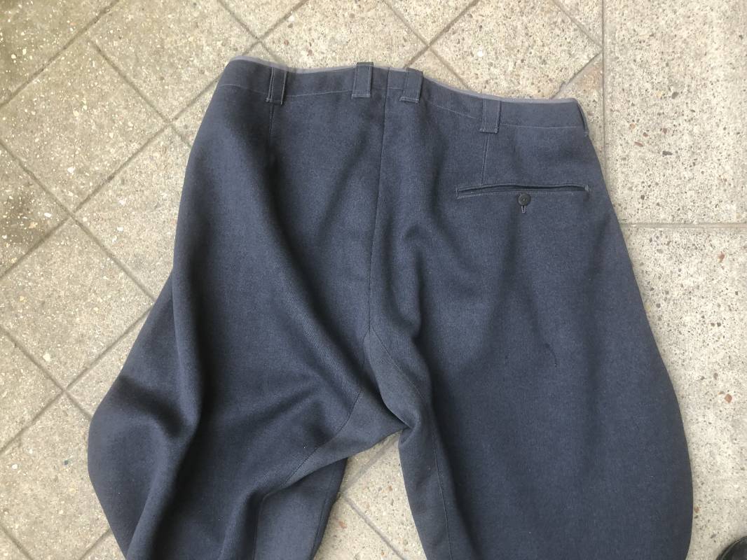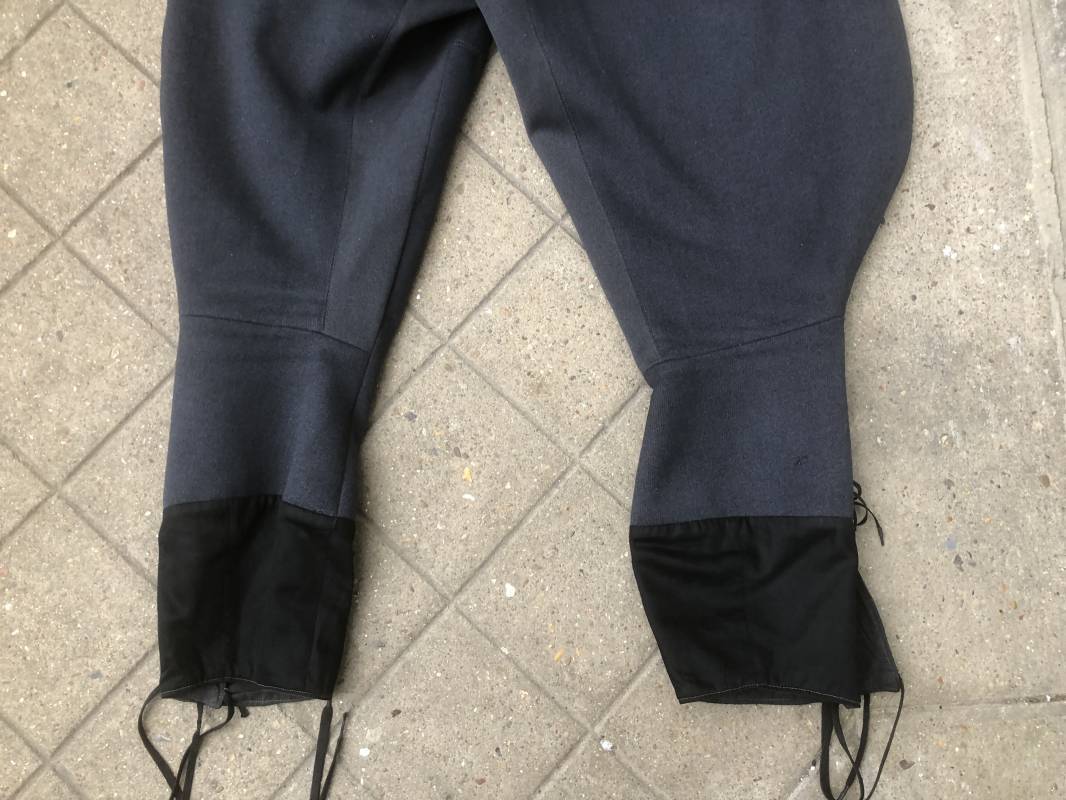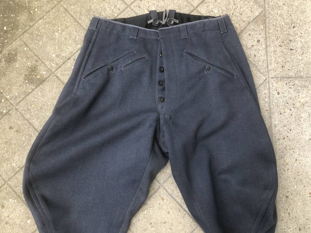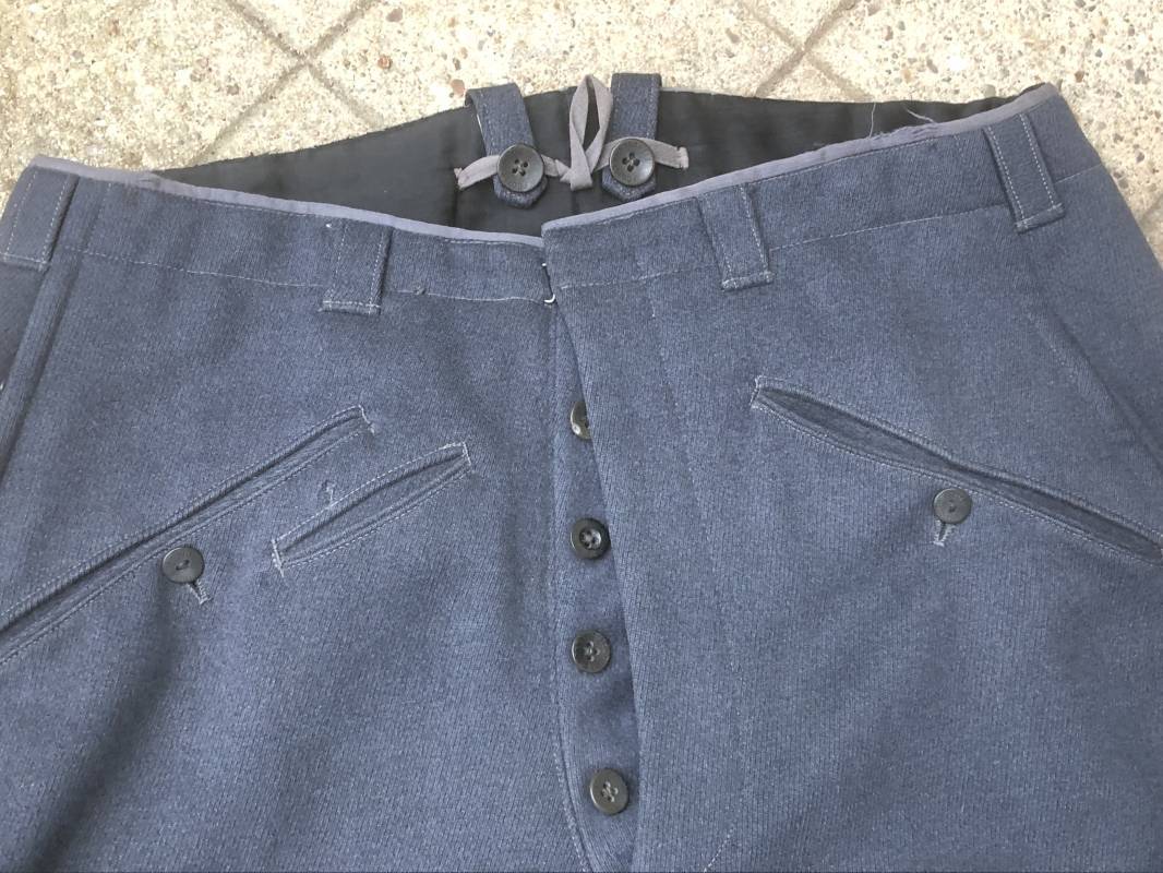 Trés belle culotte d'un officier de la Heer . Culotte en gabardine gris foncé . Passants de ceinturon en tissu , Trois poches dont une fessière , poche à gousset . Crochet métallique de braguette . Boutons plastique au nom du tailleur militaire FODISCH cousus d'origine . Bas de jambes à lacets et manchettes en coton noir , lacets d'origines en coton noir . Intérieur doublé en coton satiné noir . Etiquette fabricant du tailleur militaire A Fodisch Munchen . Nom de l'officier Rgt 3K/ Jager Rgt 135 . Daté 23 11 1938 . Numero matricule . Taille 40 longueur 96 cm . Culotte légèrement portée en parfait état . Gabardine trés fraiche . A noté petite reprise sous la braguette ( voir photos ) . Belle culotte de fabrication précoce d'avant guerre d'un officier d ela Heer 1935/40 Ref 19412