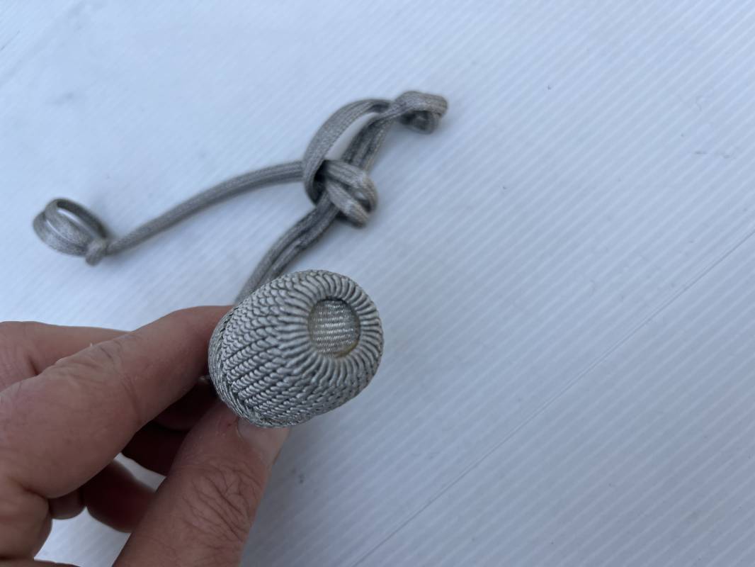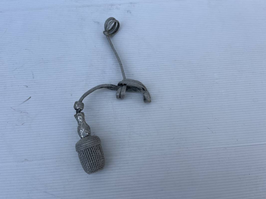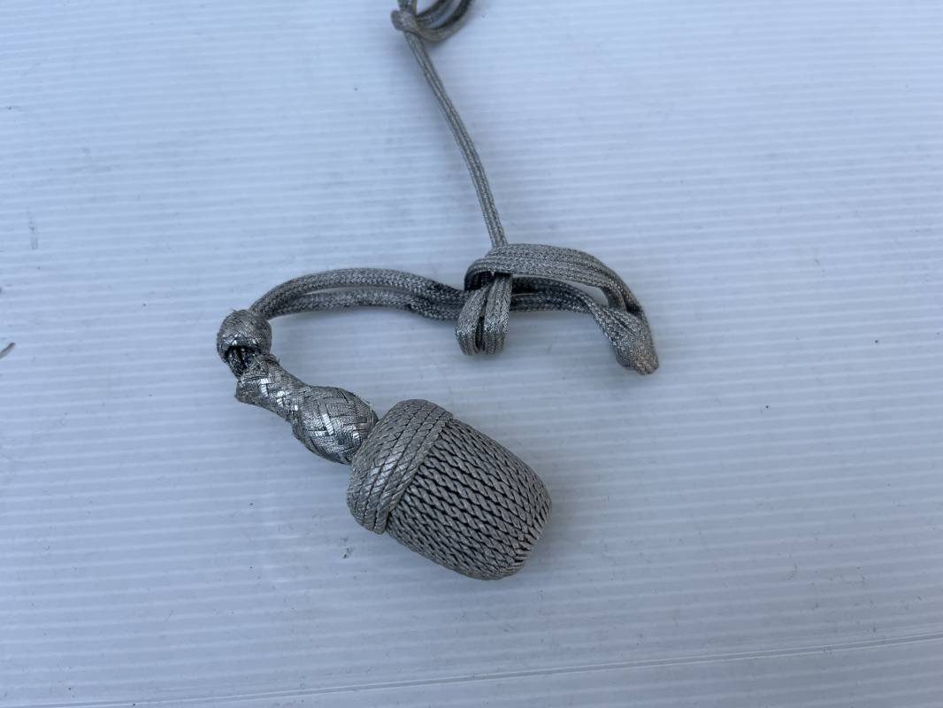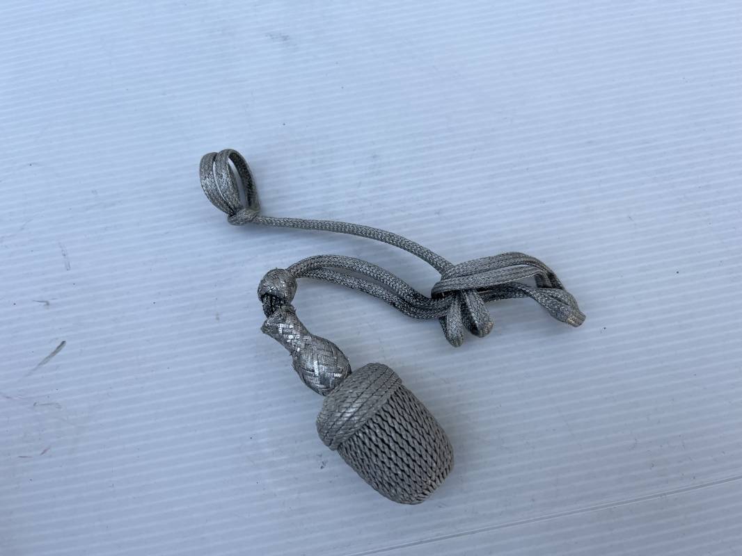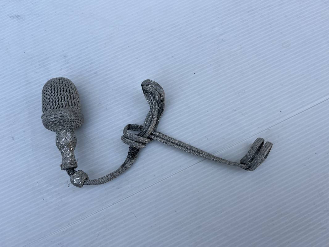 Trés belle dragonne de la dague officier modéle 1935 . Dragonne légèrement utilisée utilisée ayant conservé la forme de la poignée et de la garde de la dague Heer M35 ! . Ficelles d origines . Dragonne en fil d aluminium avec gland en cannetille . Longueur totale 30 cm .Trés bel état 1935/45 Ref 15883
