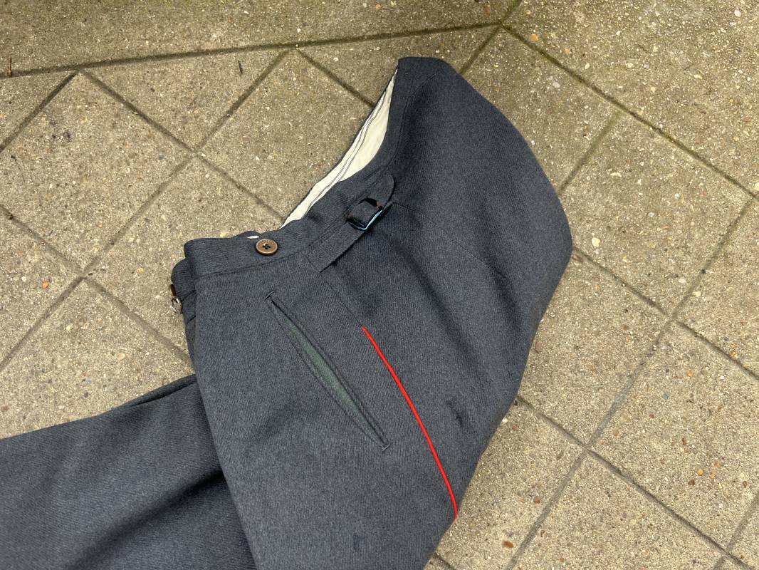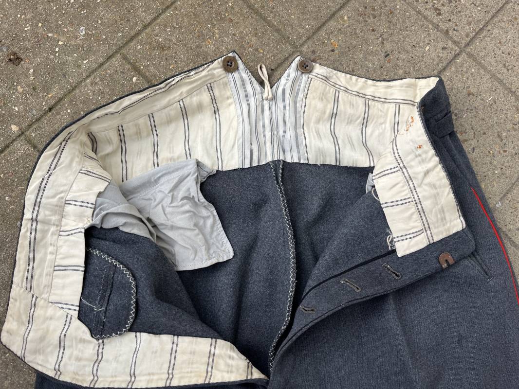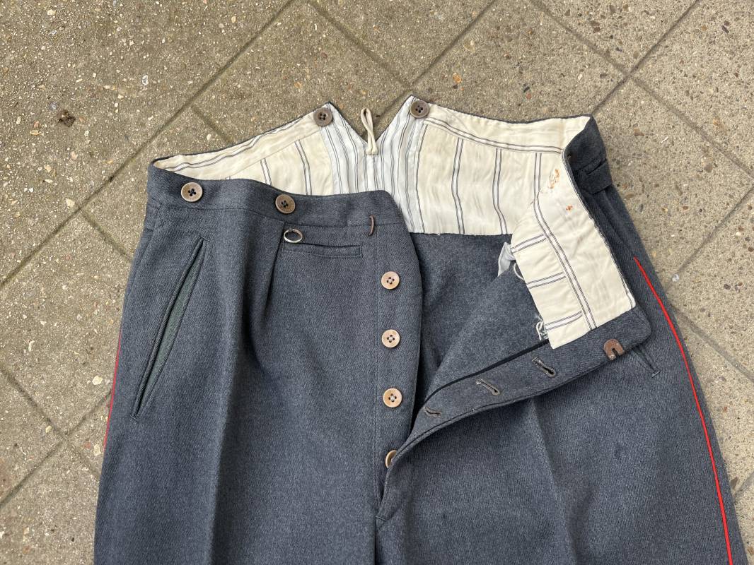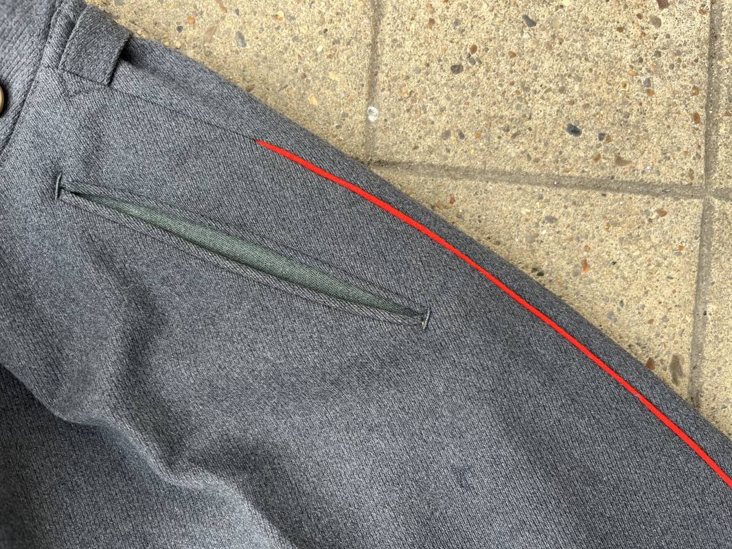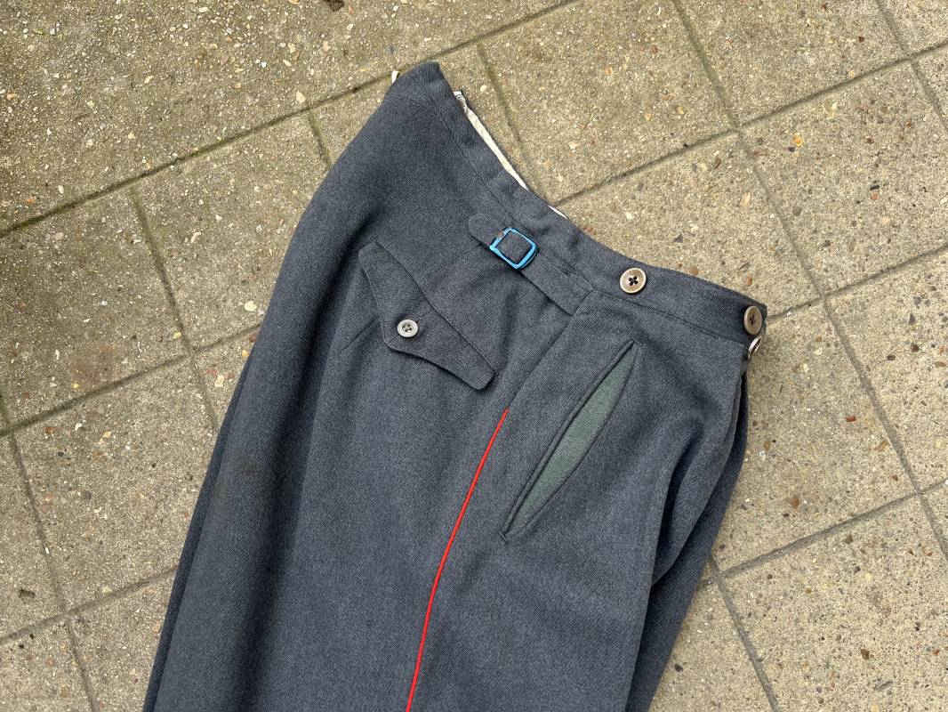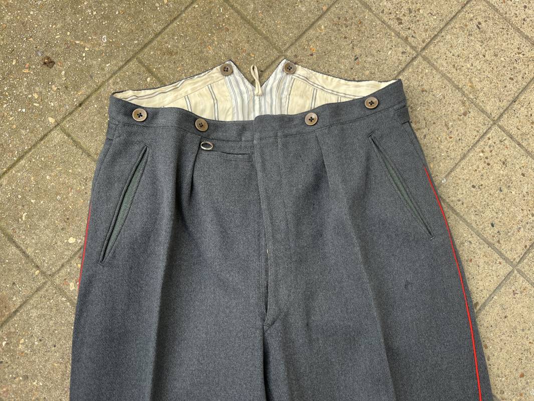 Beau pantalon droit en gabardine de couleur gris pierre (stein grau ) pour cadre (officier ou sous officier) de l artillerie de la Heer .Pantalon droit passepoilé rouge de l artillerie pour tenue de service ou de sortie . Crochet fer, poche à gousset, martingale, bouton plastique avec nom du tailleur ' J.Brenner Augsburg ' cousus d'origine. Trois poches dont une fessière , poche à gousset . Intérieur doublé en satinette rayée, taille 40. Largeur 103 cm. Pantalon légèrement porté en parfait état. . 1935/45 Ref 19821