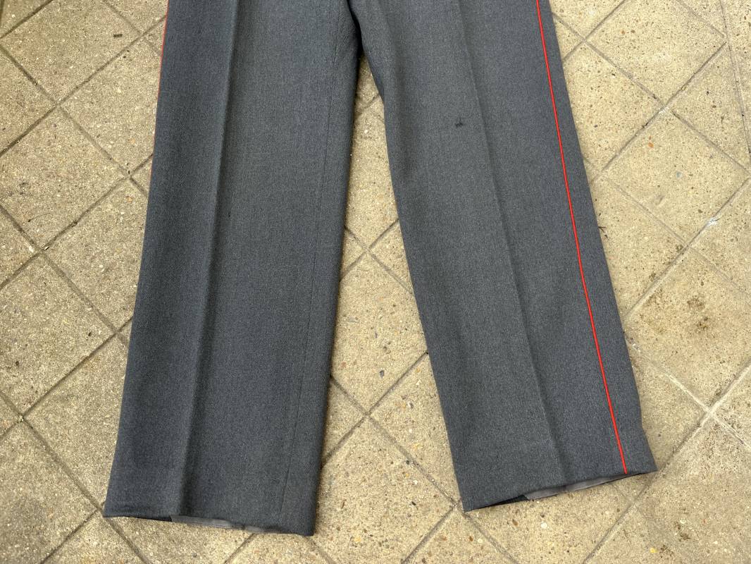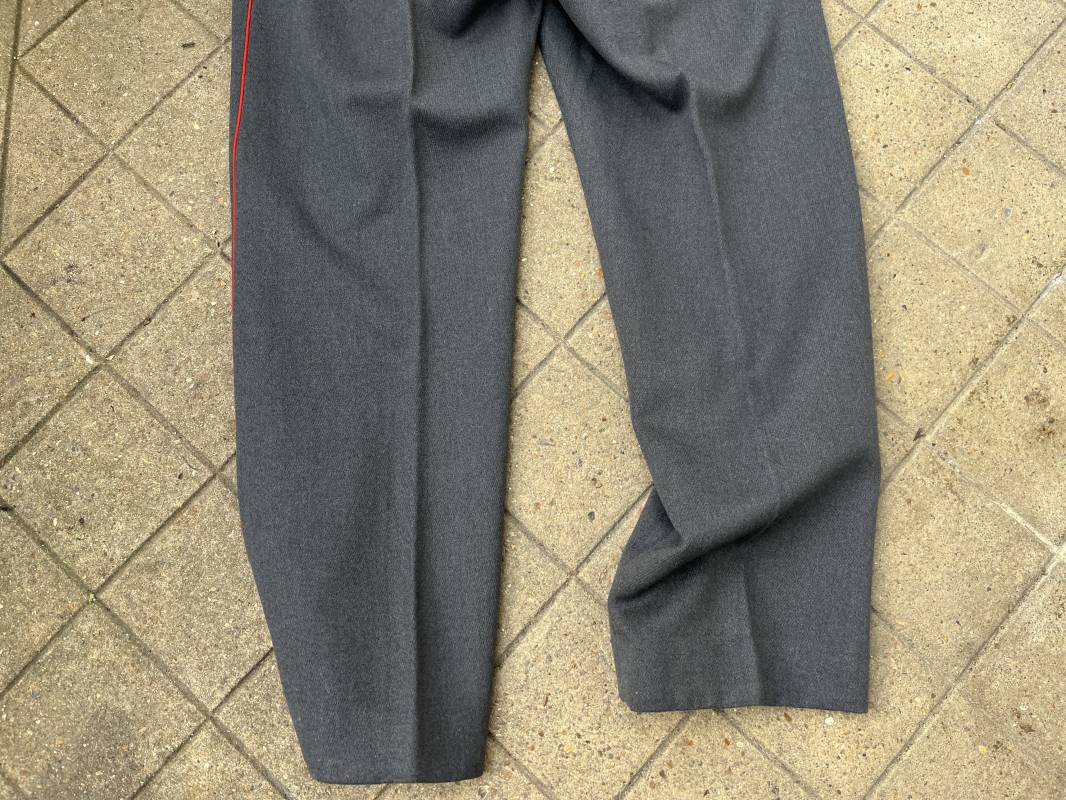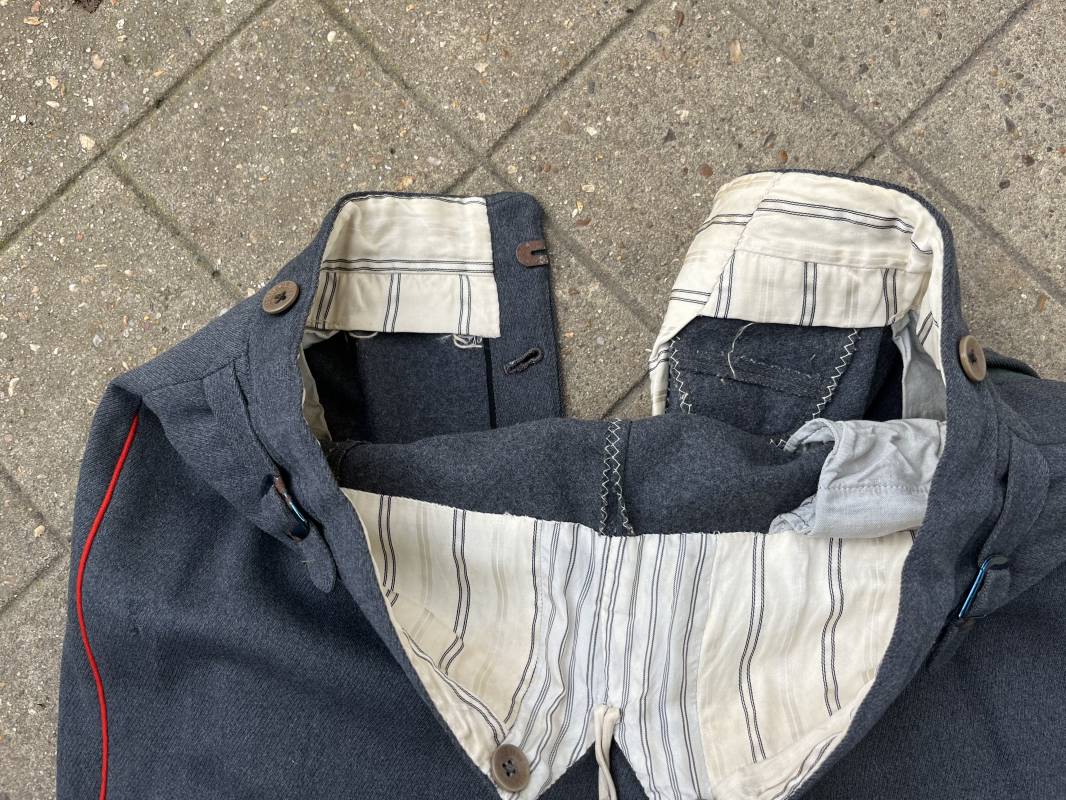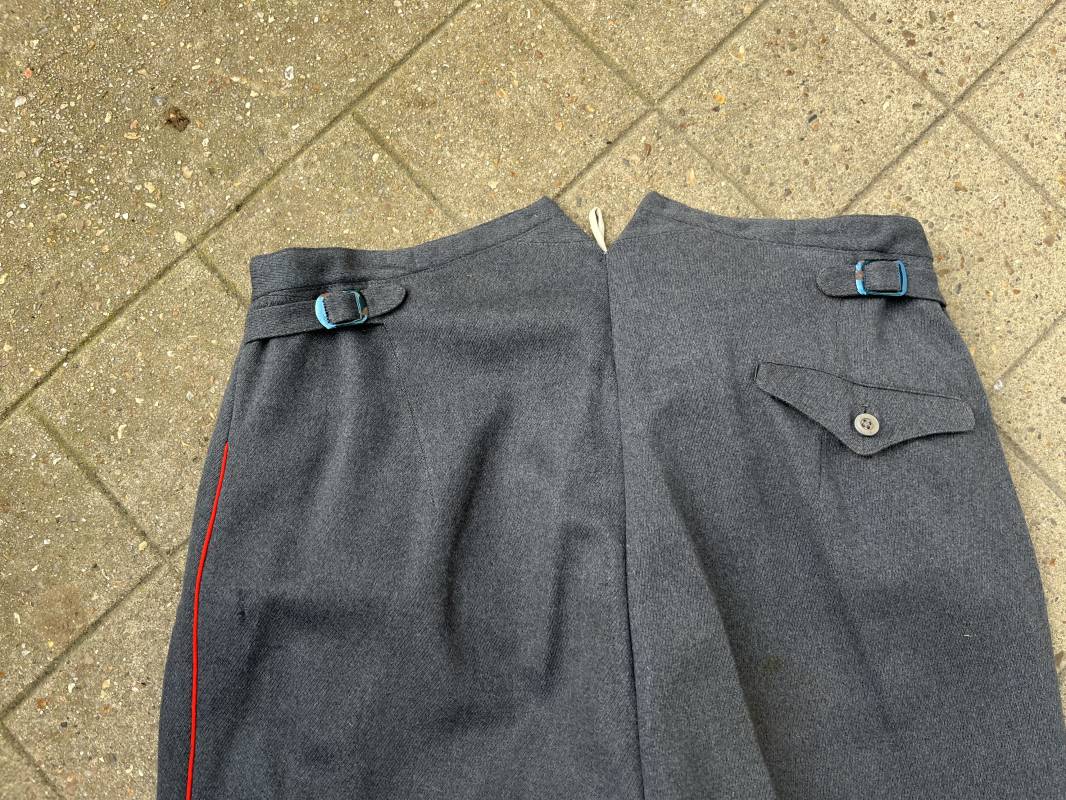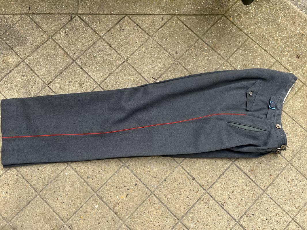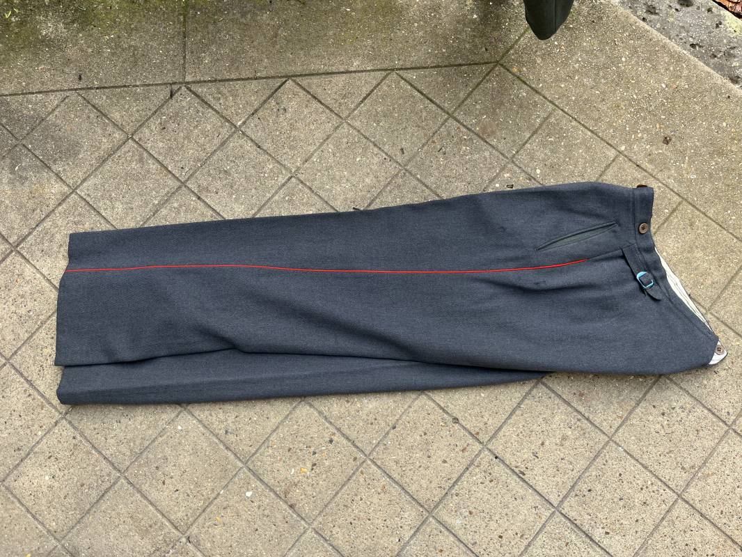 Beau pantalon droit en gabardine de couleur gris pierre (stein grau ) pour cadre (officier ou sous officier) de l artillerie de la Heer .Pantalon droit passepoilé rouge de l artillerie pour tenue de service ou de sortie . Crochet fer, poche à gousset, martingale, bouton plastique avec nom du tailleur ' J.Brenner Augsburg ' cousus d'origine. Trois poches dont une fessière , poche à gousset . Intérieur doublé en satinette rayée, taille 40. Largeur 103 cm. Pantalon légèrement porté en parfait état. . 1935/45 Ref 19821