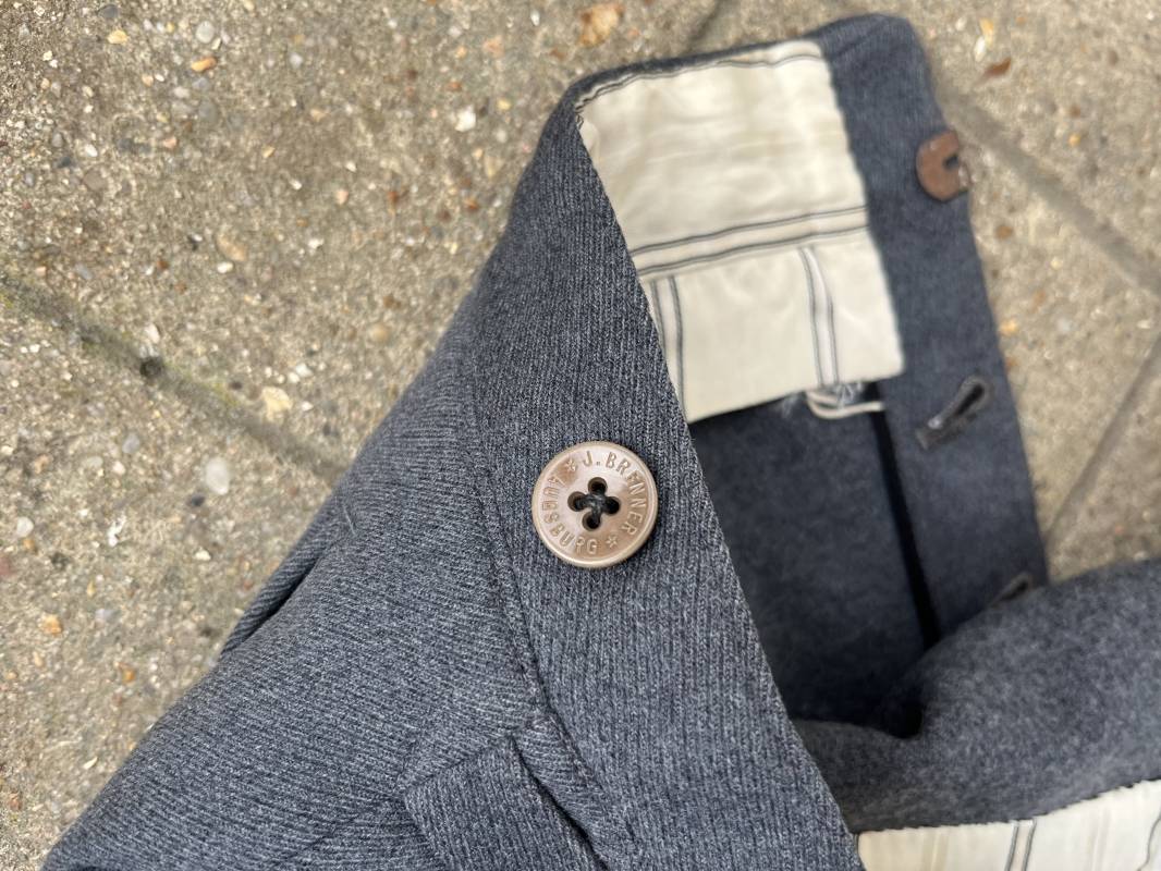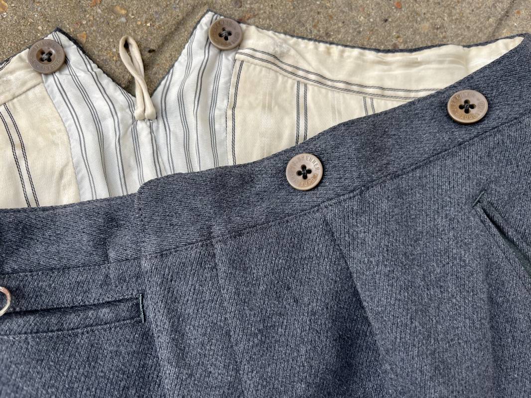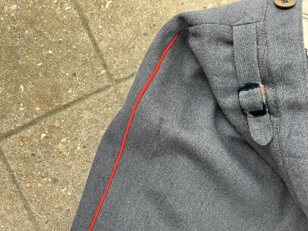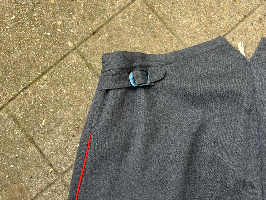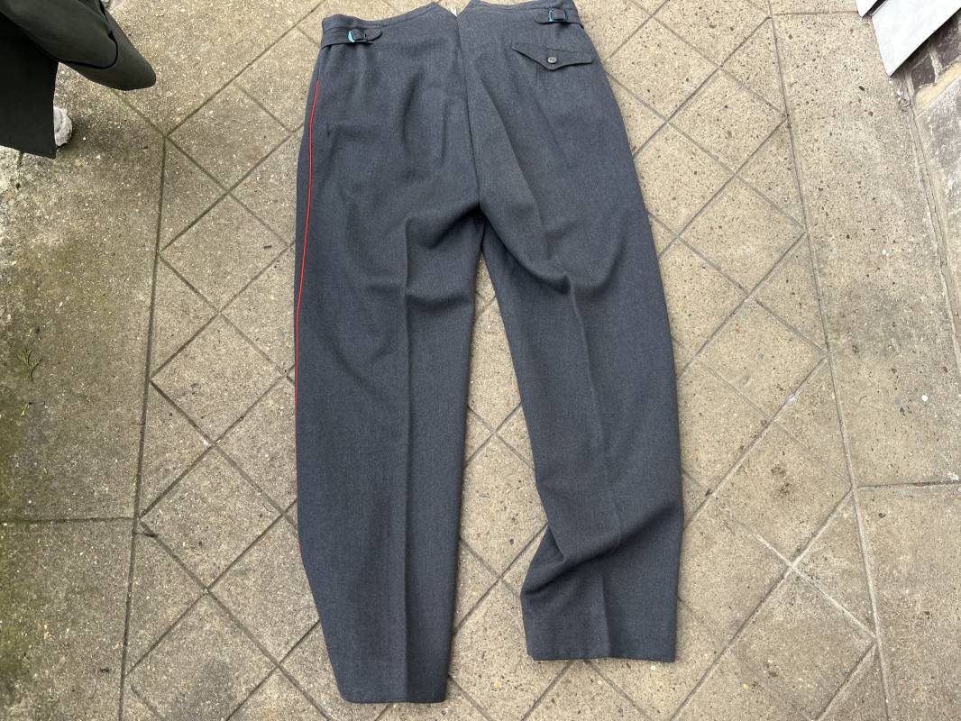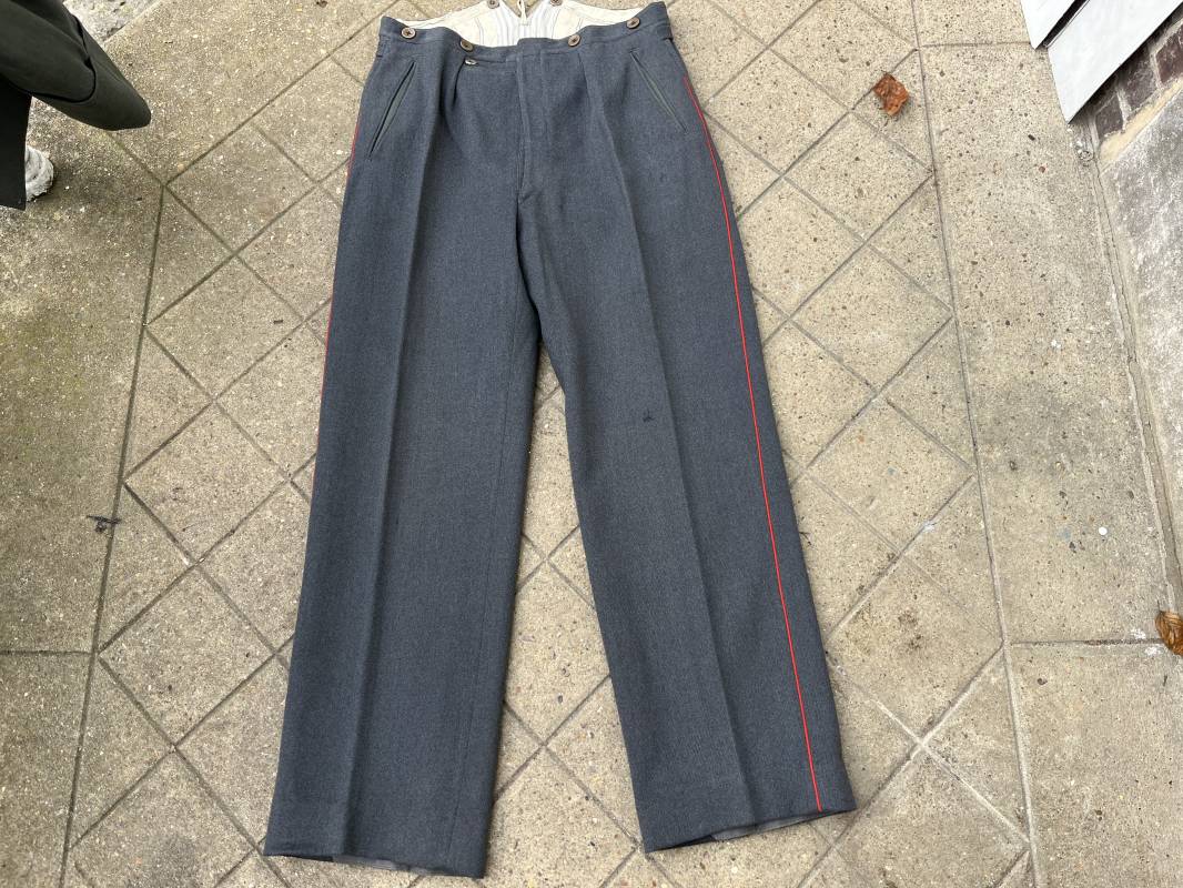 Beau pantalon droit en gabardine de couleur gris pierre (stein grau ) pour cadre (officier ou sous officier) de l artillerie de la Heer .Pantalon droit passepoilé rouge de l artillerie pour tenue de service ou de sortie . Crochet fer, poche à gousset, martingale, bouton plastique avec nom du tailleur ' J.Brenner Augsburg ' cousus d'origine. Trois poches dont une fessière , poche à gousset . Intérieur doublé en satinette rayée, taille 40. Largeur 103 cm. Pantalon légèrement porté en parfait état. . 1935/45 Ref 19821