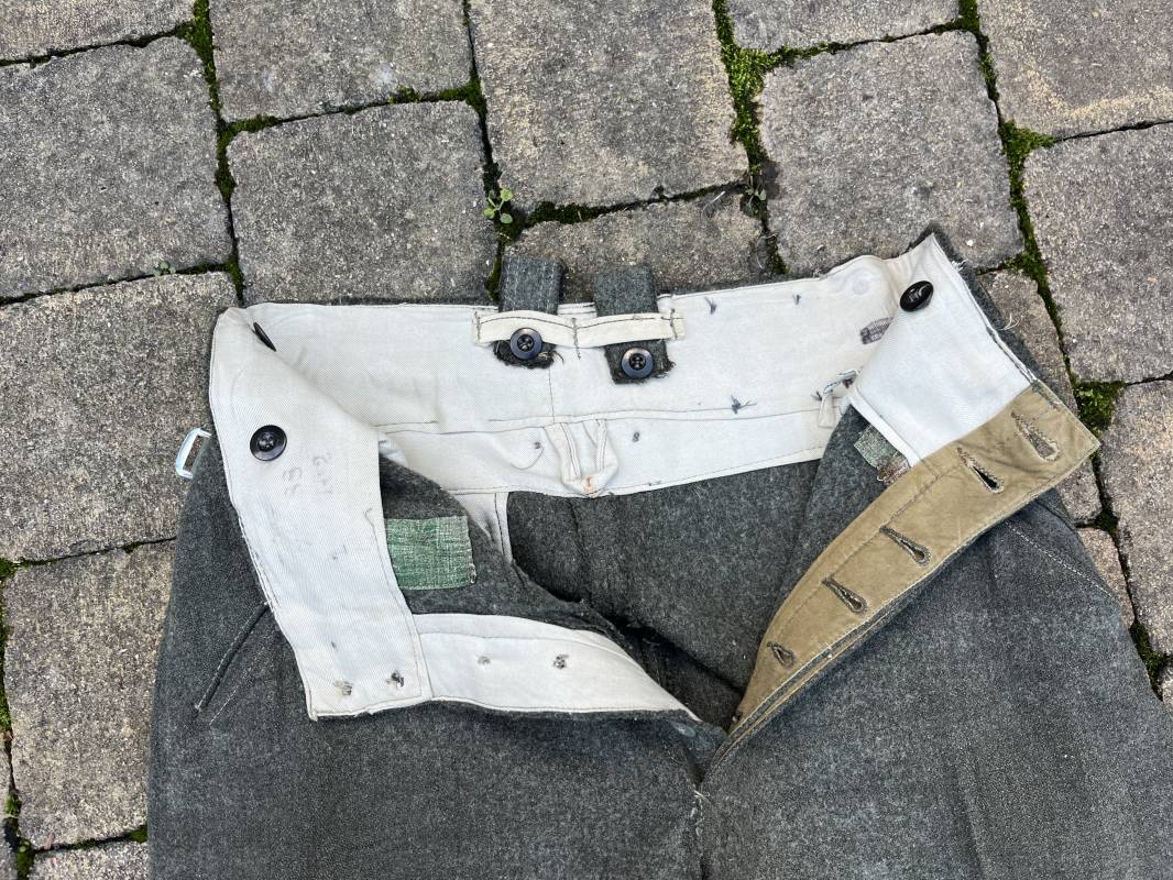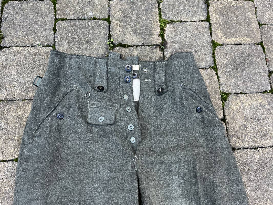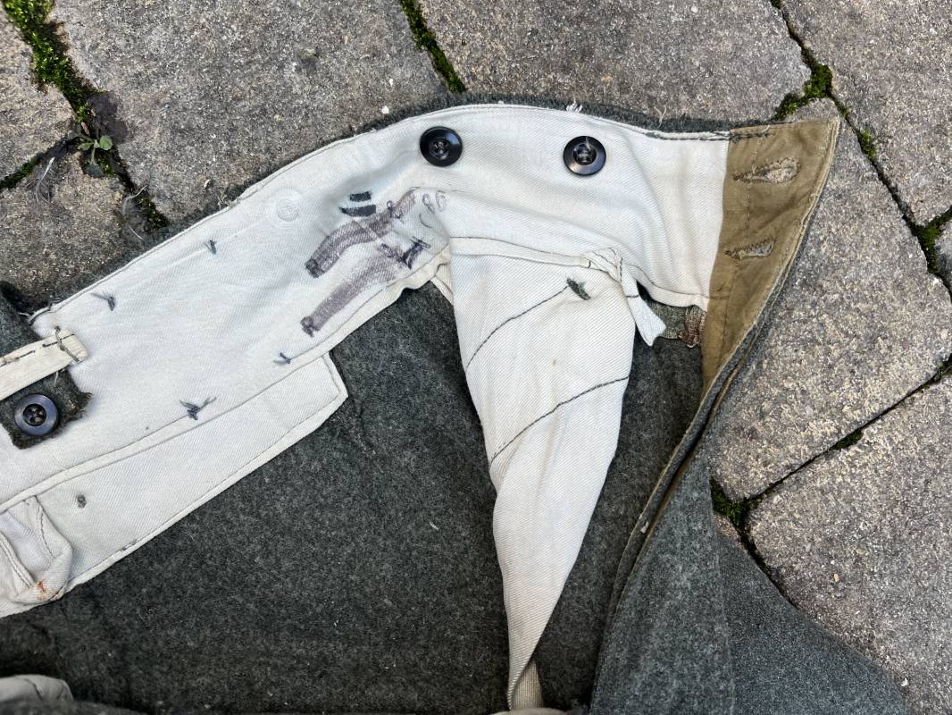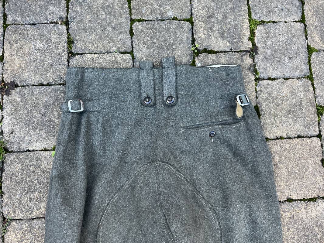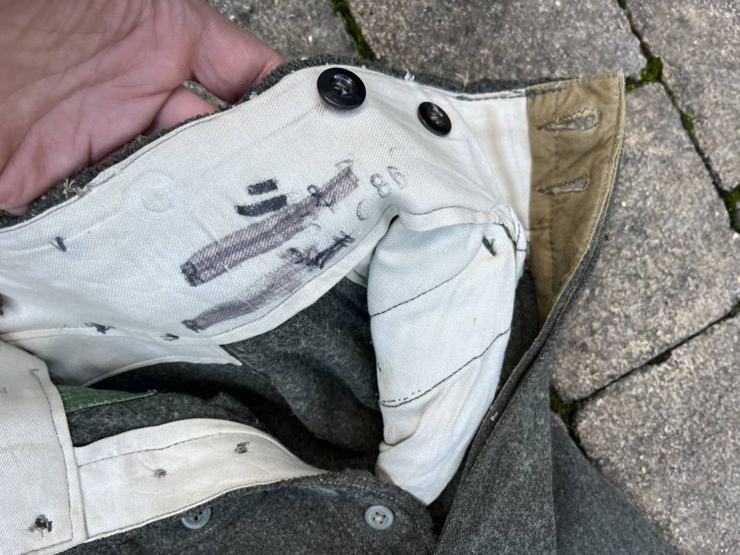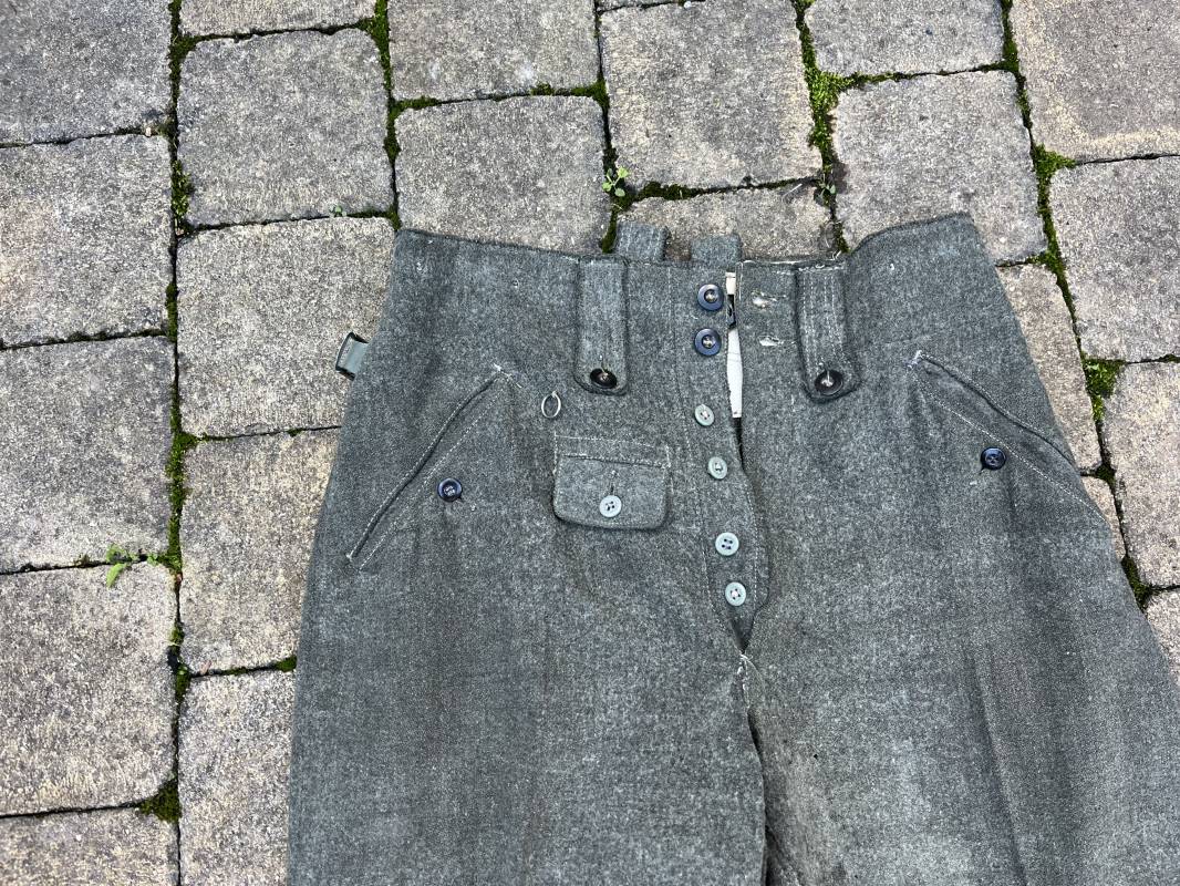 Trés beau pantalon troupe modèle 1943 de la Heer en drap feldgrau . Pantalon de dotation de coupe fuseau trois poches boutonnées dont une fessière. Poche à gousset avec rabat boutonné . Passants tissu de ceinturon. Bas des jambes de coupe fuseau manque les lacets de serrage en coton . Boutons plastique vert et noir cousus d'origine .Renfort de fesse en drap feldgrau . Deux pattes de serrage de taille sur les cotés en drap avec boucles en métal . Intérieur doublé en coton blanc. Marquage taille . Pantalon légèrement porté en parfait état. Drap très frais. Taille 40. Longueur 104 cm. Rare pantalon modèle 1943 de la Heer 1944/45. Piéce définitive en collection 1943/45 Ref 21201