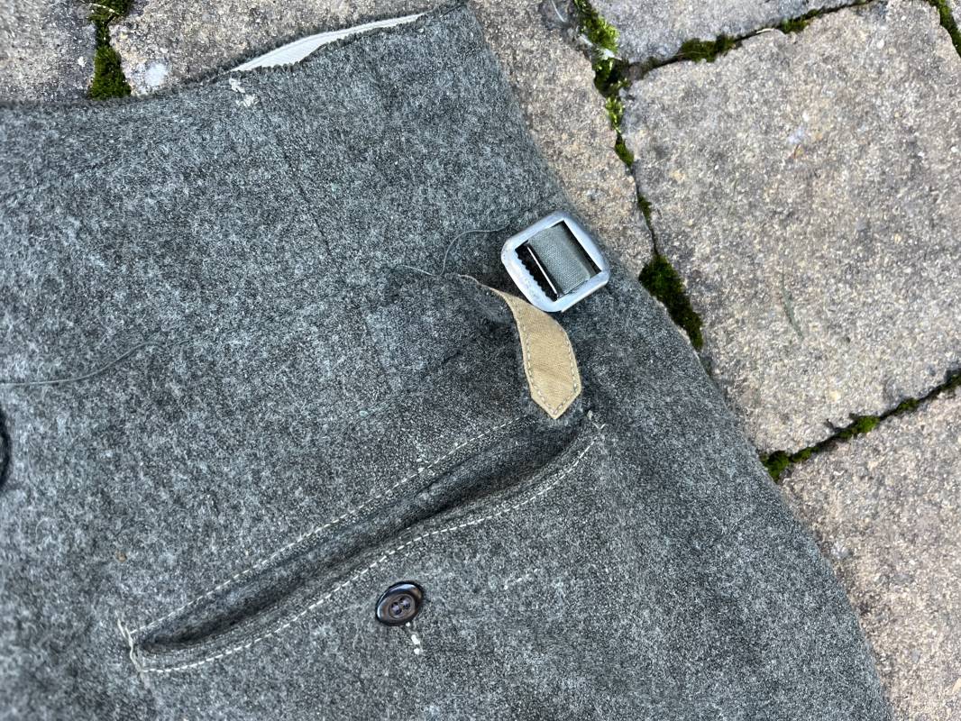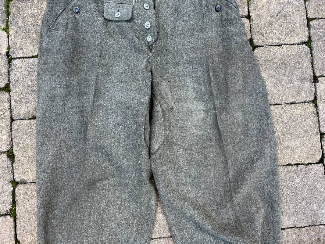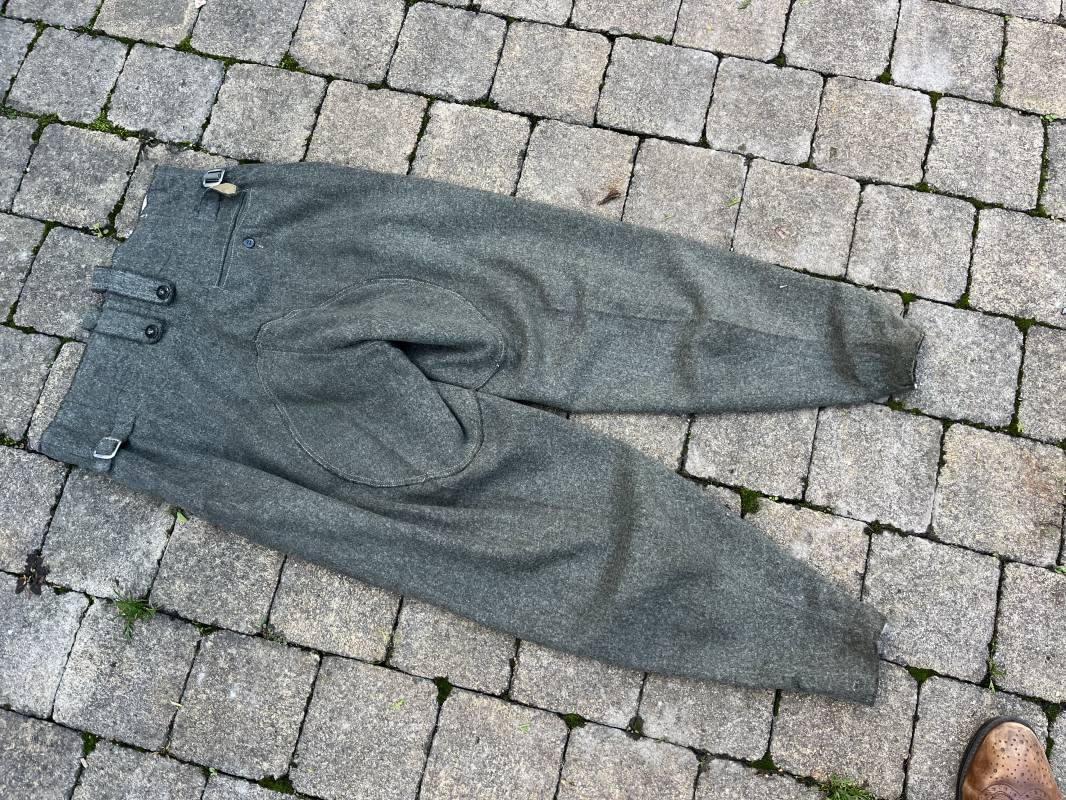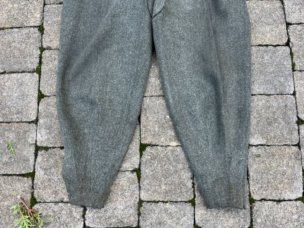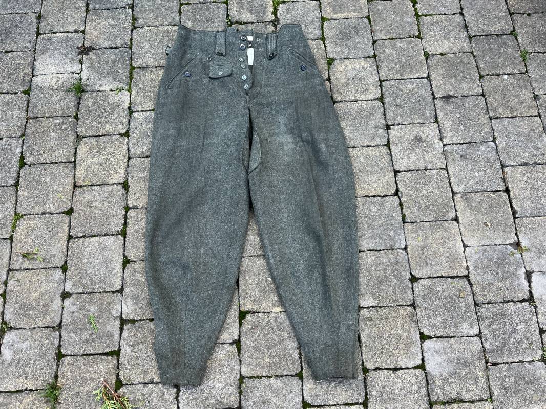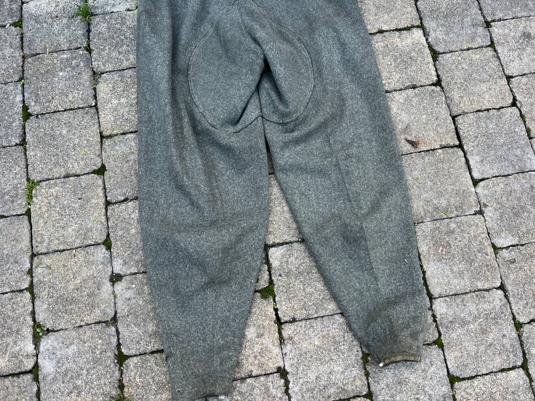 Trés beau pantalon troupe modèle 1943 de la Heer en drap feldgrau . Pantalon de dotation de coupe fuseau trois poches boutonnées dont une fessière. Poche à gousset avec rabat boutonné . Passants tissu de ceinturon. Bas des jambes de coupe fuseau manque les lacets de serrage en coton . Boutons plastique vert et noir cousus d'origine .Renfort de fesse en drap feldgrau . Deux pattes de serrage de taille sur les cotés en drap avec boucles en métal . Intérieur doublé en coton blanc. Marquage taille . Pantalon légèrement porté en parfait état. Drap très frais. Taille 40. Longueur 104 cm. Rare pantalon modèle 1943 de la Heer 1944/45. Piéce définitive en collection 1943/45 Ref 21201