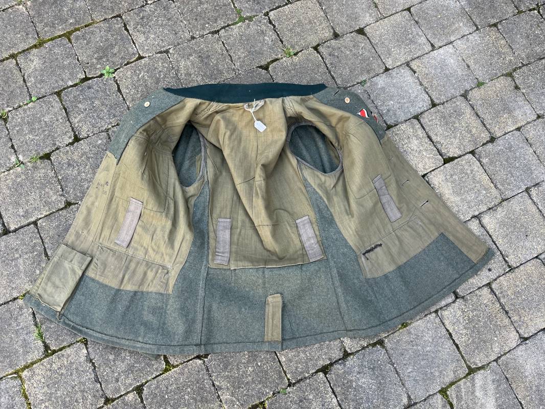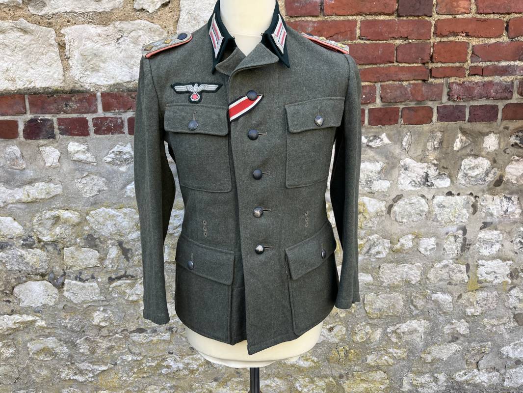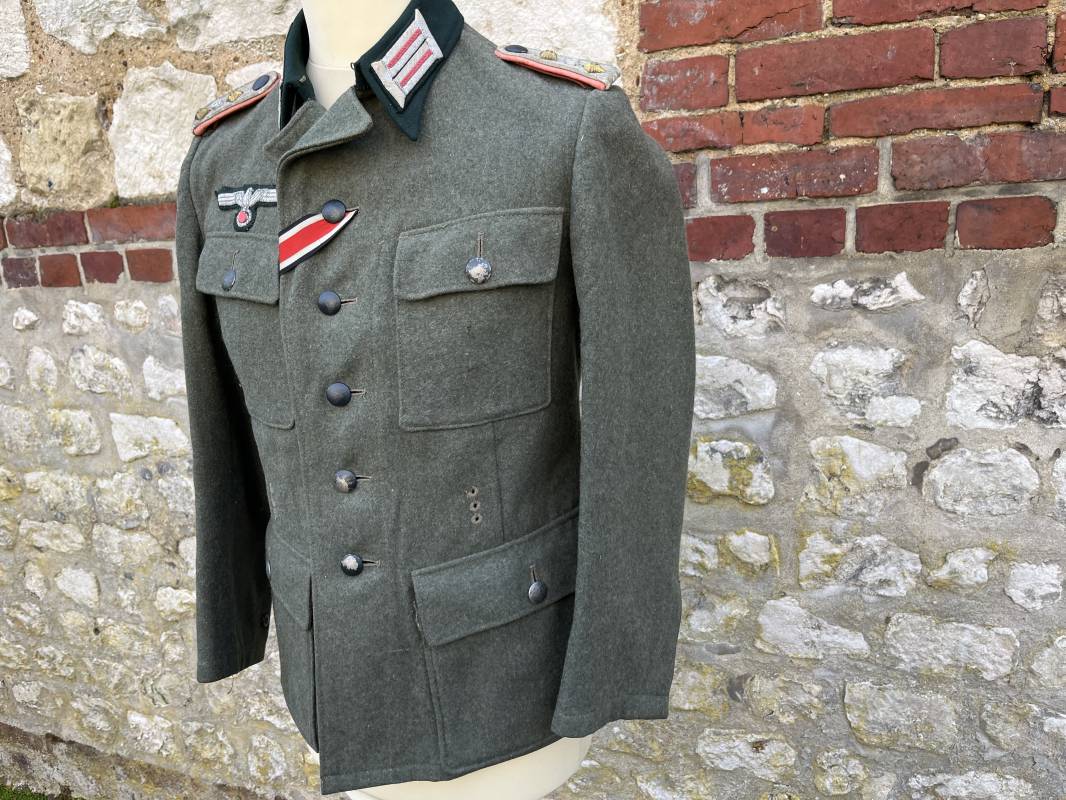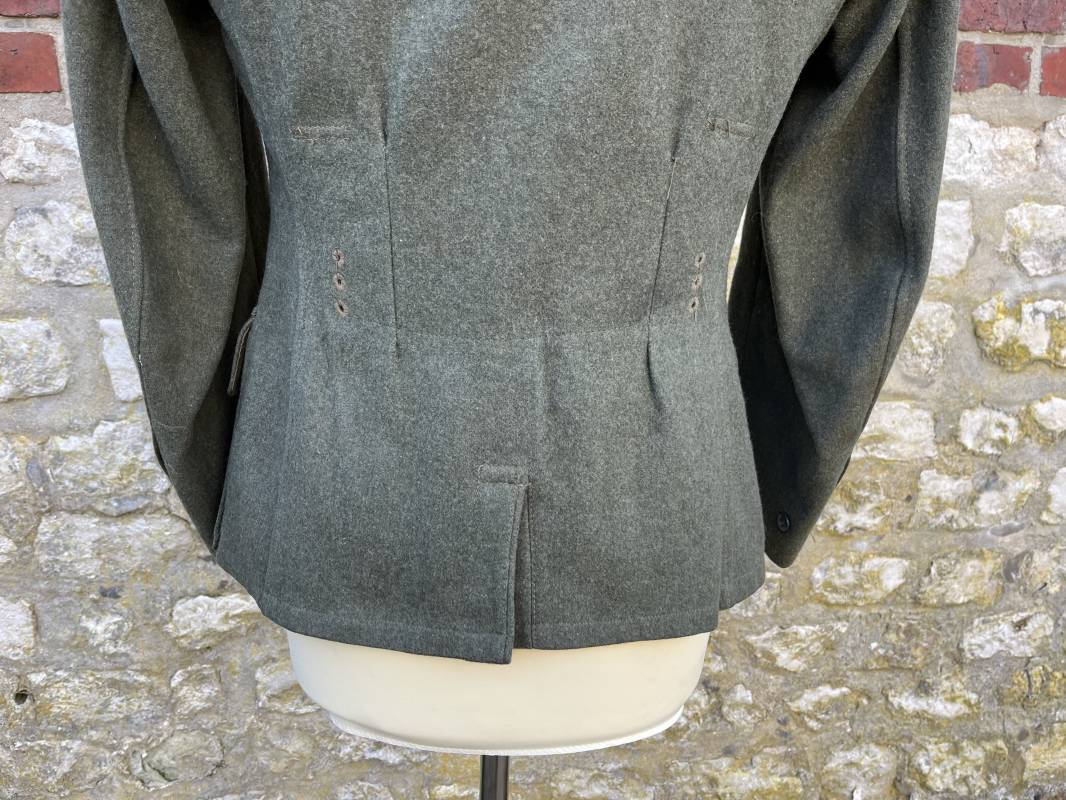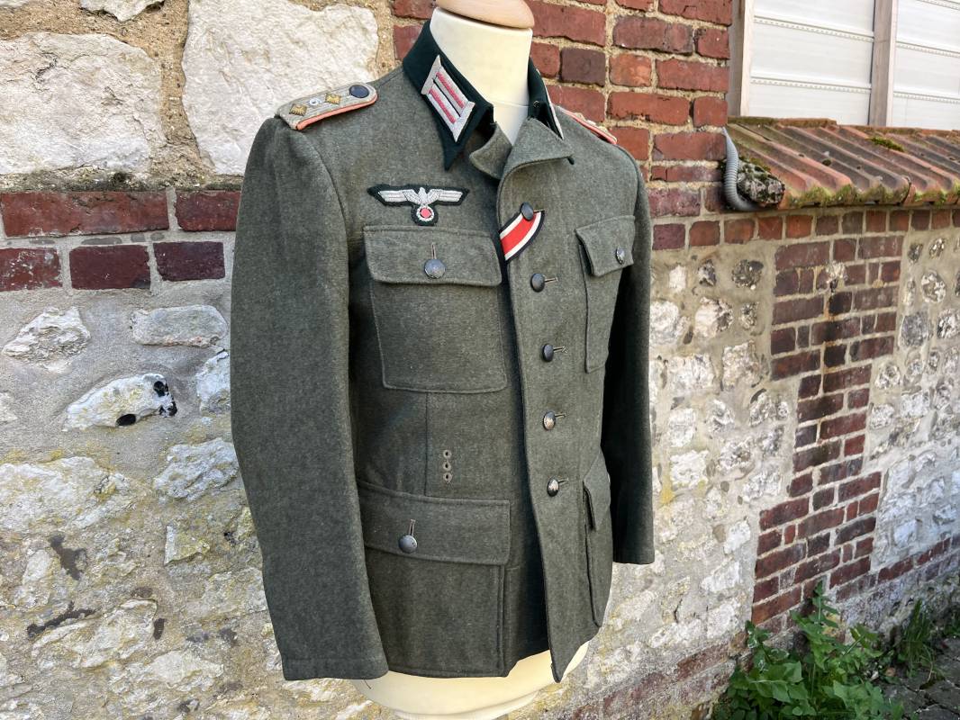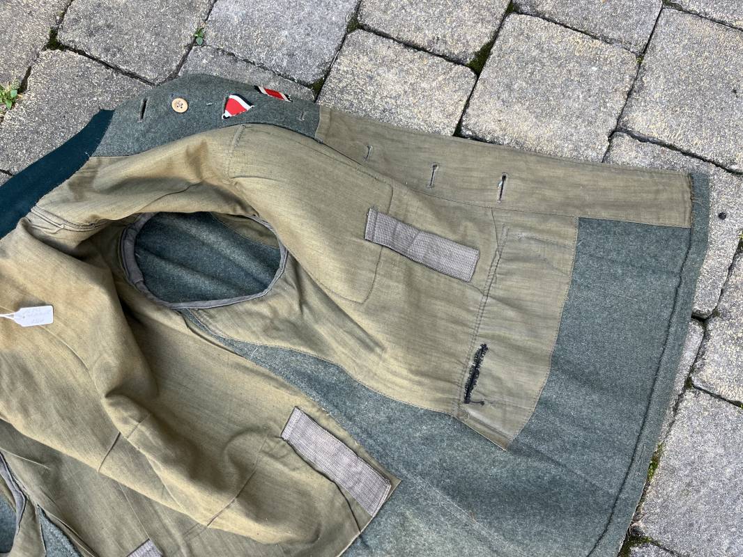 Rare veste de combat modéle 1943 d un officier panzer de la Heer . Cette veste a été trouvée en succession familiale en Allemagne .Cette veste est entièrement montée d origine Veste modèle 1943 de dotation pour la troupe modifiée pour officier en tenue de campagne . Conformément au réglement cette veste a été fournie par le corps de troupe a l officier pour sa tenue de campagne . Veste en drap feldgrau , fermeture frontale à six boutons . Quatre poches sans plis watteau rabats droits boutonnés . Boutons modèle 1943 en fer grenelé peints en gris . Col vert foncé rigide pour officier crochets métalliques au col . Col ouvert , litzen en cannetille argent , liseré rose . Aigle de poitrine en cannetille argent . Pattes d epaules du modèle à rabats et amovibles , liseré rose , grade de capitaine ( hauptmann ) , chiffres métalliques régimentaires '6' . Rubans de décorations en boutonnière ( EKII 39 ) , Trace du port d un badge de poitrine sur poche gauche . Intérieur doublé en toile de coton vert , marquages taille Daté H 1944 . Fente pour passage de dague . . Drap trés frais , veste légèrement porté en tres bel état . Largeur épaules 43 cm , longueur 68 cm , manche 55 cm . Rare veste d ecombat d un chef de compagnie des panzer truppen de la Heer 1944/45 RARE uniforme Ref 16745