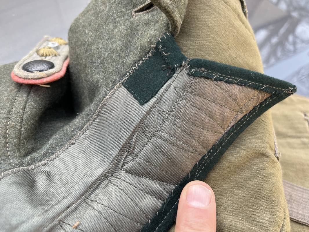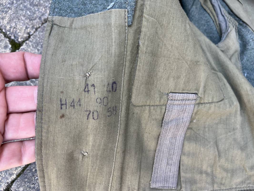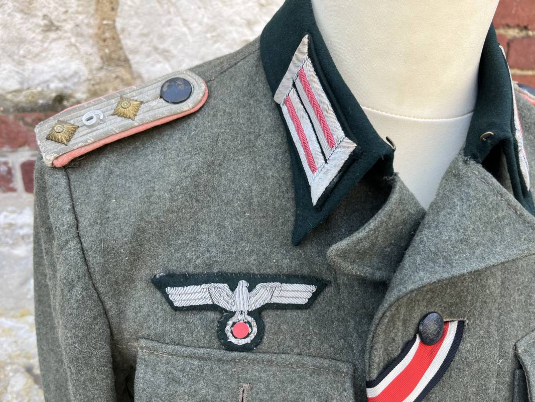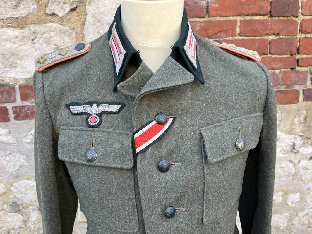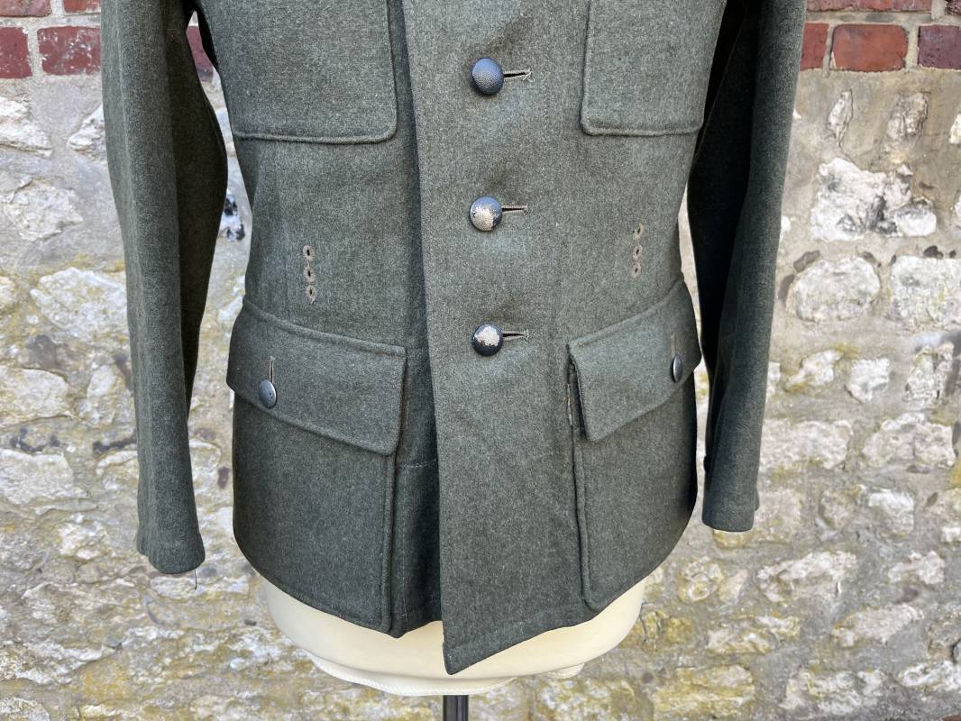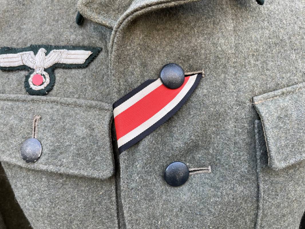 Rare veste de combat modéle 1943 d un officier panzer de la Heer . Cette veste a été trouvée en succession familiale en Allemagne .Cette veste est entièrement montée d origine Veste modèle 1943 de dotation pour la troupe modifiée pour officier en tenue de campagne . Conformément au réglement cette veste a été fournie par le corps de troupe a l officier pour sa tenue de campagne . Veste en drap feldgrau , fermeture frontale à six boutons . Quatre poches sans plis watteau rabats droits boutonnés . Boutons modèle 1943 en fer grenelé peints en gris . Col vert foncé rigide pour officier crochets métalliques au col . Col ouvert , litzen en cannetille argent , liseré rose . Aigle de poitrine en cannetille argent . Pattes d epaules du modèle à rabats et amovibles , liseré rose , grade de capitaine ( hauptmann ) , chiffres métalliques régimentaires '6' . Rubans de décorations en boutonnière ( EKII 39 ) , Trace du port d un badge de poitrine sur poche gauche . Intérieur doublé en toile de coton vert , marquages taille Daté H 1944 . Fente pour passage de dague . . Drap trés frais , veste légèrement porté en tres bel état . Largeur épaules 43 cm , longueur 68 cm , manche 55 cm . Rare veste d ecombat d un chef de compagnie des panzer truppen de la Heer 1944/45 RARE uniforme Ref 16745