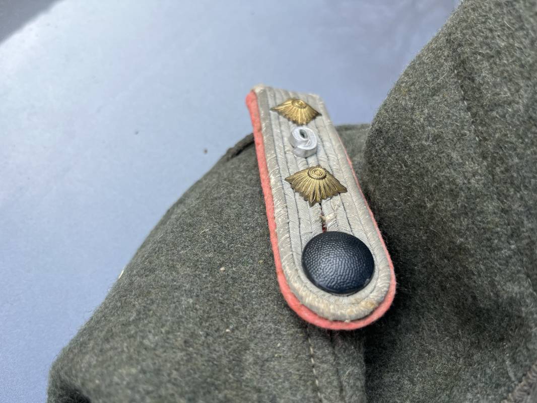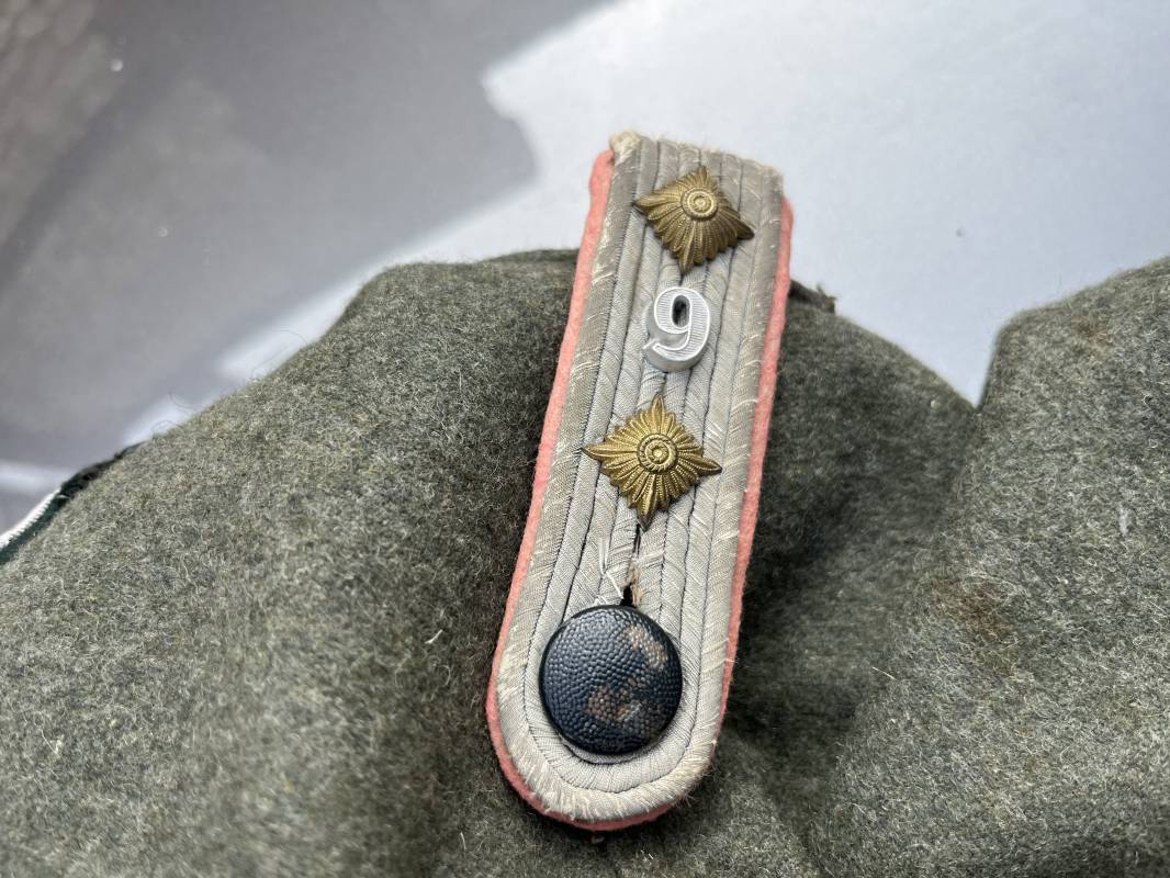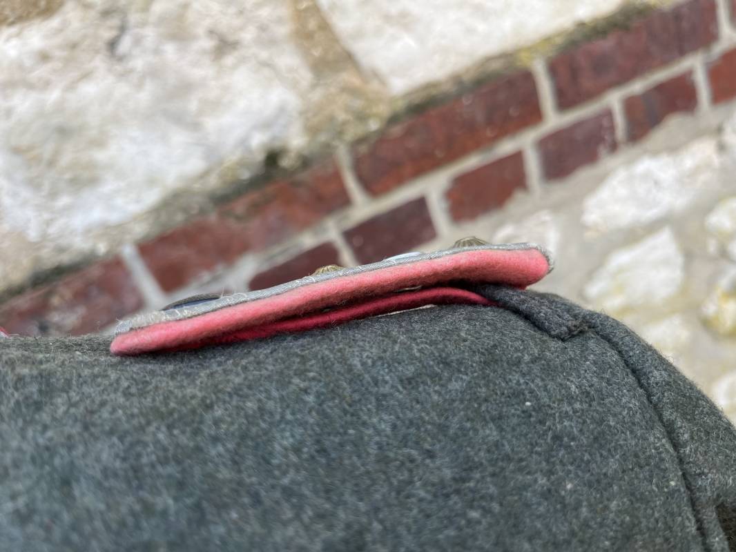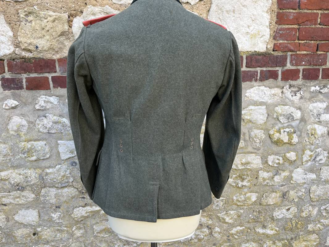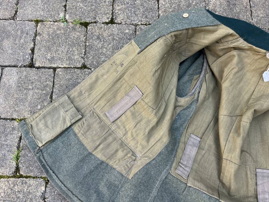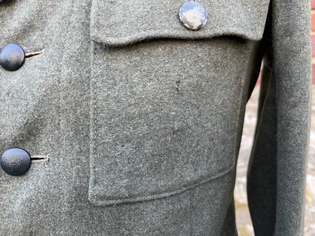 Rare veste de combat modéle 1943 d un officier panzer de la Heer . Cette veste a été trouvée en succession familiale en Allemagne .Cette veste est entièrement montée d origine Veste modèle 1943 de dotation pour la troupe modifiée pour officier en tenue de campagne . Conformément au réglement cette veste a été fournie par le corps de troupe a l officier pour sa tenue de campagne . Veste en drap feldgrau , fermeture frontale à six boutons . Quatre poches sans plis watteau rabats droits boutonnés . Boutons modèle 1943 en fer grenelé peints en gris . Col vert foncé rigide pour officier crochets métalliques au col . Col ouvert , litzen en cannetille argent , liseré rose . Aigle de poitrine en cannetille argent . Pattes d epaules du modèle à rabats et amovibles , liseré rose , grade de capitaine ( hauptmann ) , chiffres métalliques régimentaires '6' . Rubans de décorations en boutonnière ( EKII 39 ) , Trace du port d un badge de poitrine sur poche gauche . Intérieur doublé en toile de coton vert , marquages taille Daté H 1944 . Fente pour passage de dague . . Drap trés frais , veste légèrement porté en tres bel état . Largeur épaules 43 cm , longueur 68 cm , manche 55 cm . Rare veste d ecombat d un chef de compagnie des panzer truppen de la Heer 1944/45 RARE uniforme Ref 16745