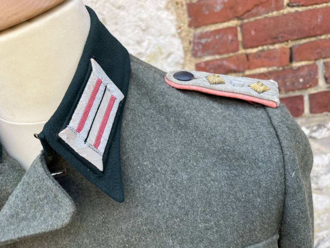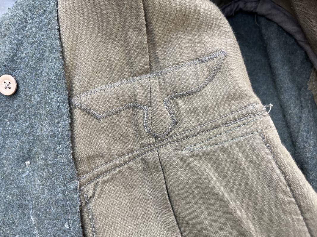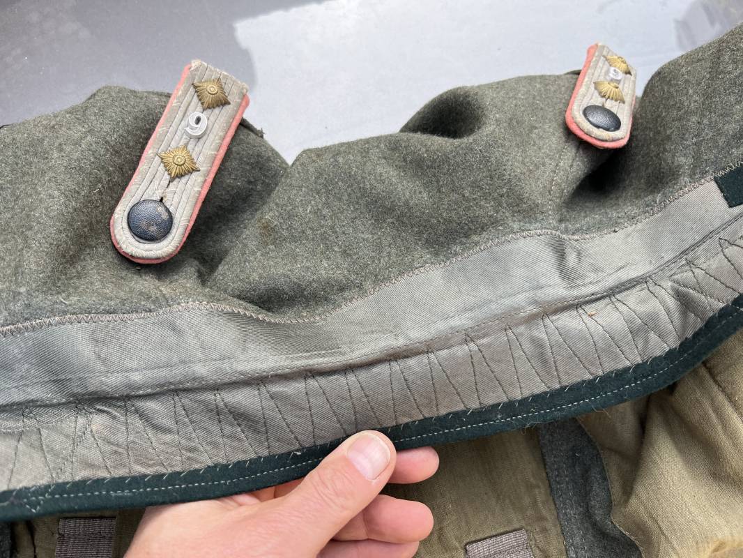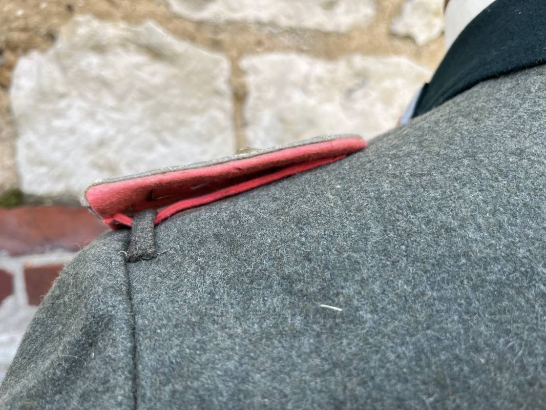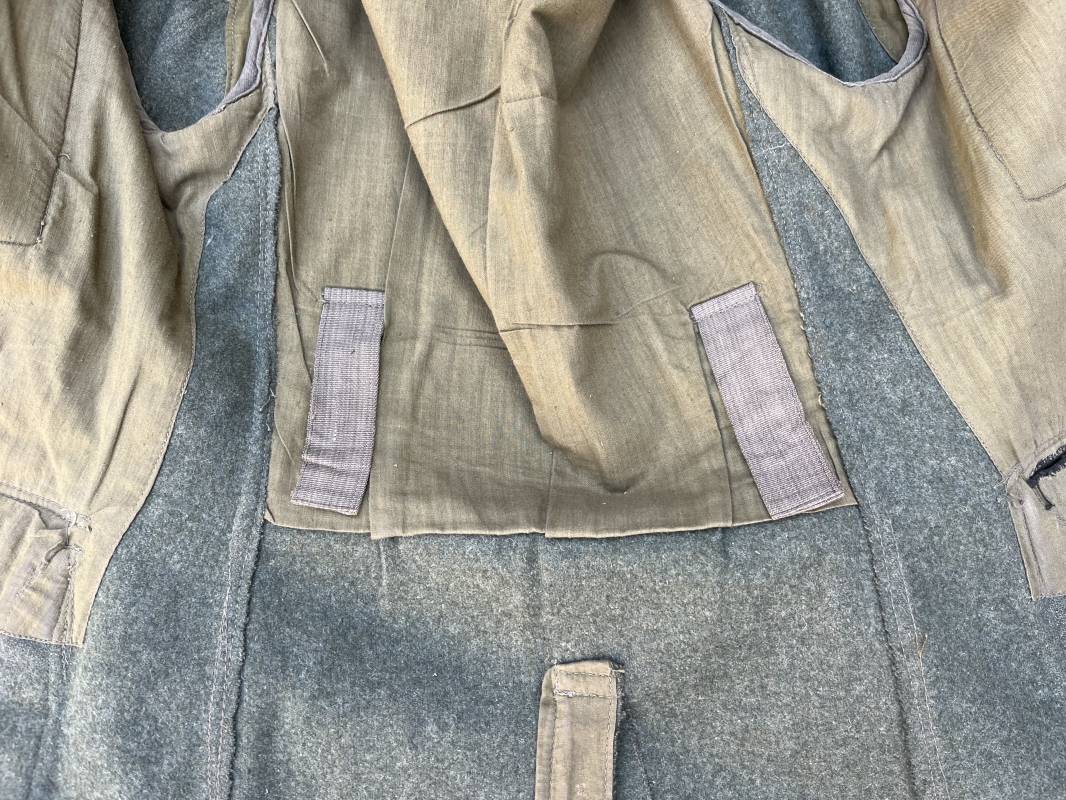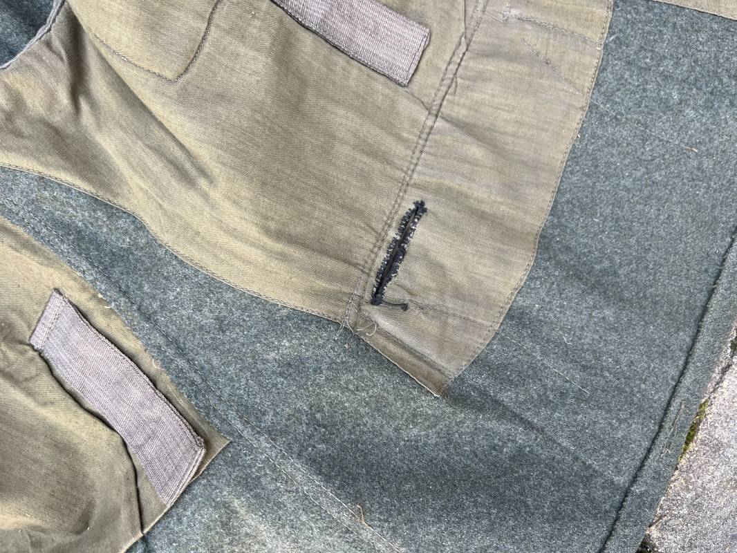 Rare veste de combat modéle 1943 d un officier panzer de la Heer . Cette veste a été trouvée en succession familiale en Allemagne .Cette veste est entièrement montée d origine Veste modèle 1943 de dotation pour la troupe modifiée pour officier en tenue de campagne . Conformément au réglement cette veste a été fournie par le corps de troupe a l officier pour sa tenue de campagne . Veste en drap feldgrau , fermeture frontale à six boutons . Quatre poches sans plis watteau rabats droits boutonnés . Boutons modèle 1943 en fer grenelé peints en gris . Col vert foncé rigide pour officier crochets métalliques au col . Col ouvert , litzen en cannetille argent , liseré rose . Aigle de poitrine en cannetille argent . Pattes d epaules du modèle à rabats et amovibles , liseré rose , grade de capitaine ( hauptmann ) , chiffres métalliques régimentaires '6' . Rubans de décorations en boutonnière ( EKII 39 ) , Trace du port d un badge de poitrine sur poche gauche . Intérieur doublé en toile de coton vert , marquages taille Daté H 1944 . Fente pour passage de dague . . Drap trés frais , veste légèrement porté en tres bel état . Largeur épaules 43 cm , longueur 68 cm , manche 55 cm . Rare veste d ecombat d un chef de compagnie des panzer truppen de la Heer 1944/45 RARE uniforme Ref 16745