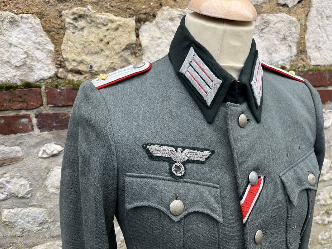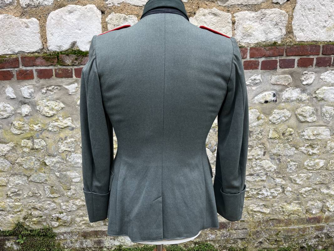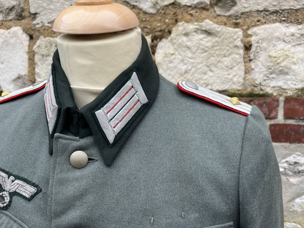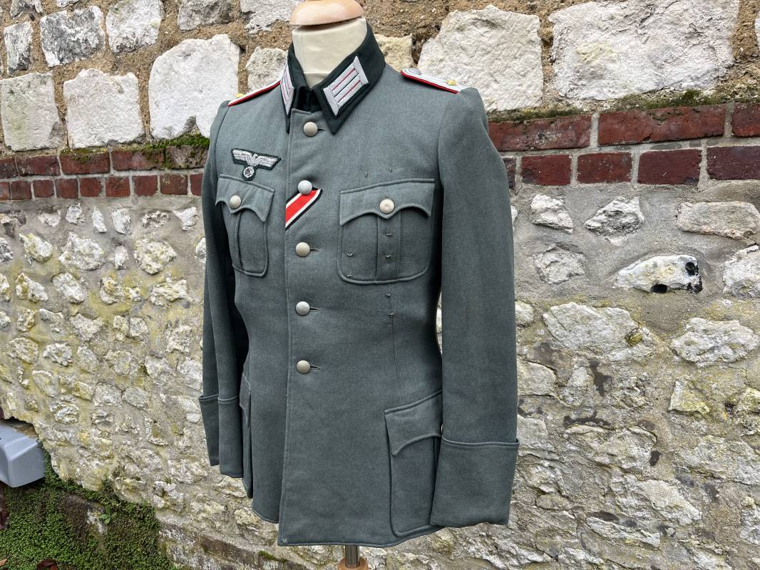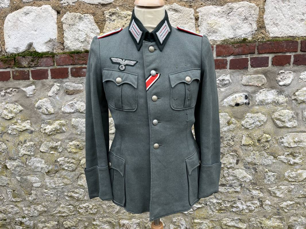 Trés belle veste modéle 1936 d un officier de l artillerie de la Heer . Veste quatre poches a plis watteau en gabardine feldgrau , col en drap vert foncé , Pattes de col montées machine et pattes d épaules cousues aux enmanchures liseré rouge de l artillerie Grade de Lieutenant ( ober leutnant) Aigle de poitrine brodé cannetille pour officier , ruban de croix de fer 2me classe 1939 cousu a la boutonnière . Passants pour le port de badges et décorations de poitrine . Intérieur doublé en satinette feldgrau , deux poches intéreures . Etiquette tailleur militaire a Munich . Veste de service d un artilleur ; legerement portée en parfait état Largeur épaules 40 cm , longueur 74 cm , manches 61 cm . Bel uniforme en parfait état 1935/45 Ref 21575