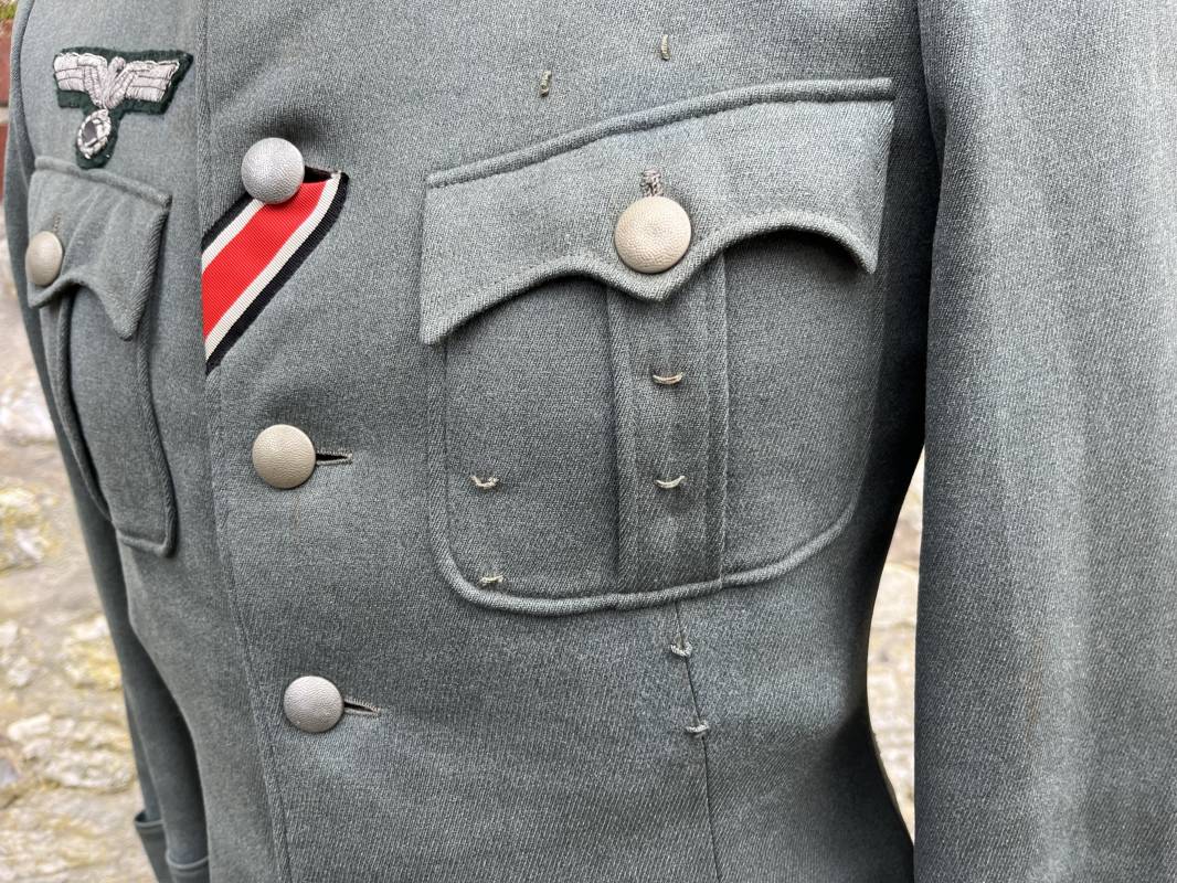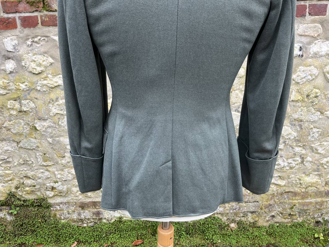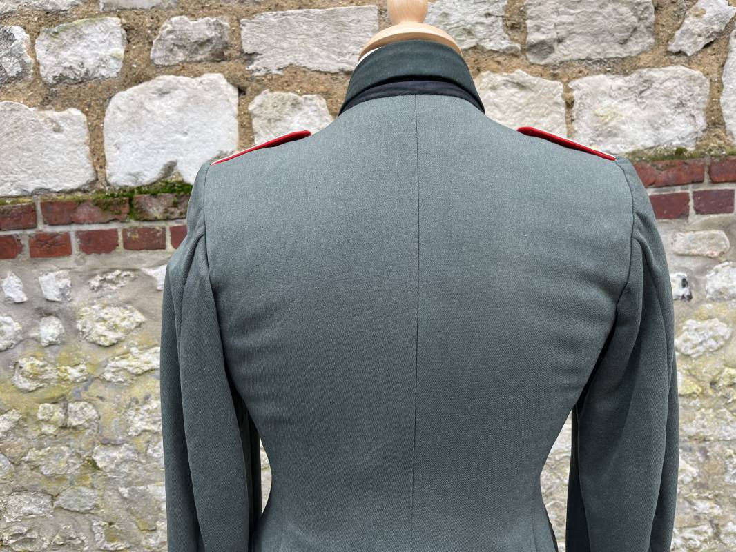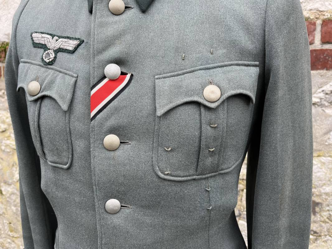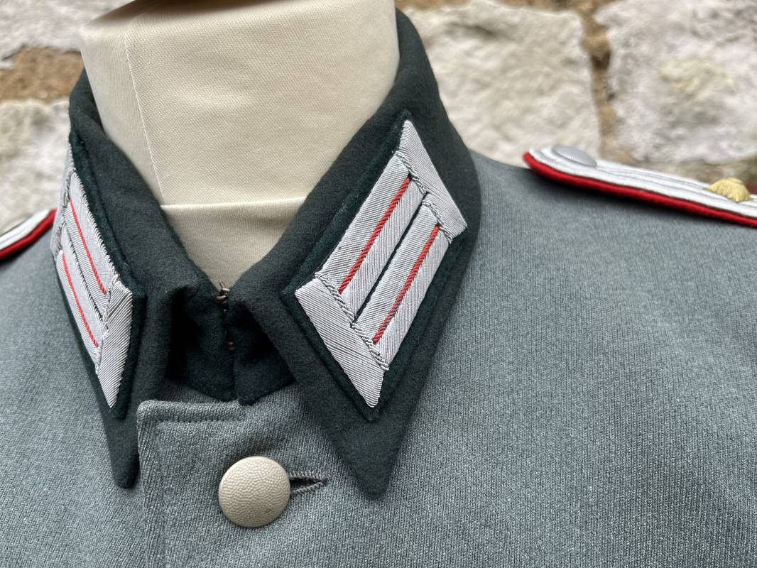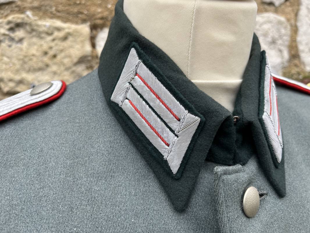 Trés belle veste modéle 1936 d un officier de l artillerie de la Heer . Veste quatre poches a plis watteau en gabardine feldgrau , col en drap vert foncé , Pattes de col montées machine et pattes d épaules cousues aux enmanchures liseré rouge de l artillerie Grade de Lieutenant ( ober leutnant) Aigle de poitrine brodé cannetille pour officier , ruban de croix de fer 2me classe 1939 cousu a la boutonnière . Passants pour le port de badges et décorations de poitrine . Intérieur doublé en satinette feldgrau , deux poches intéreures . Etiquette tailleur militaire a Munich . Veste de service d un artilleur ; legerement portée en parfait état Largeur épaules 40 cm , longueur 74 cm , manches 61 cm . Bel uniforme en parfait état 1935/45 Ref 21575