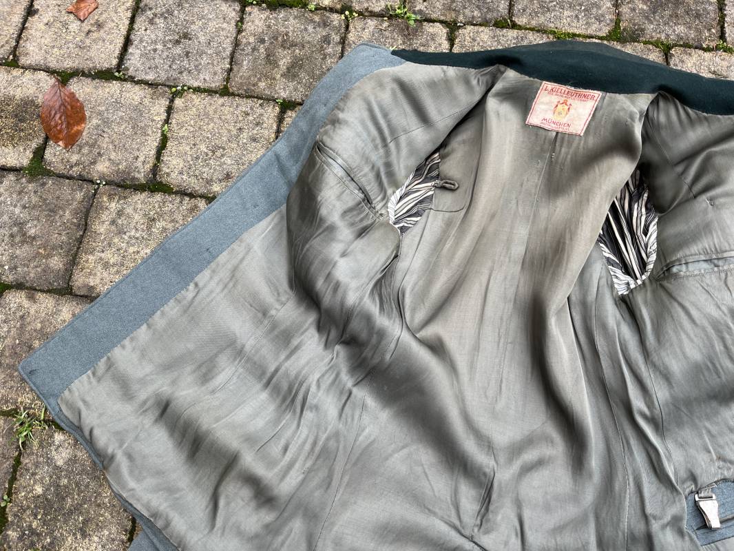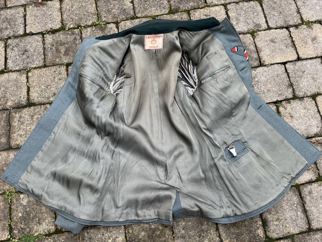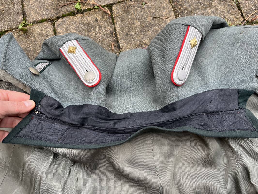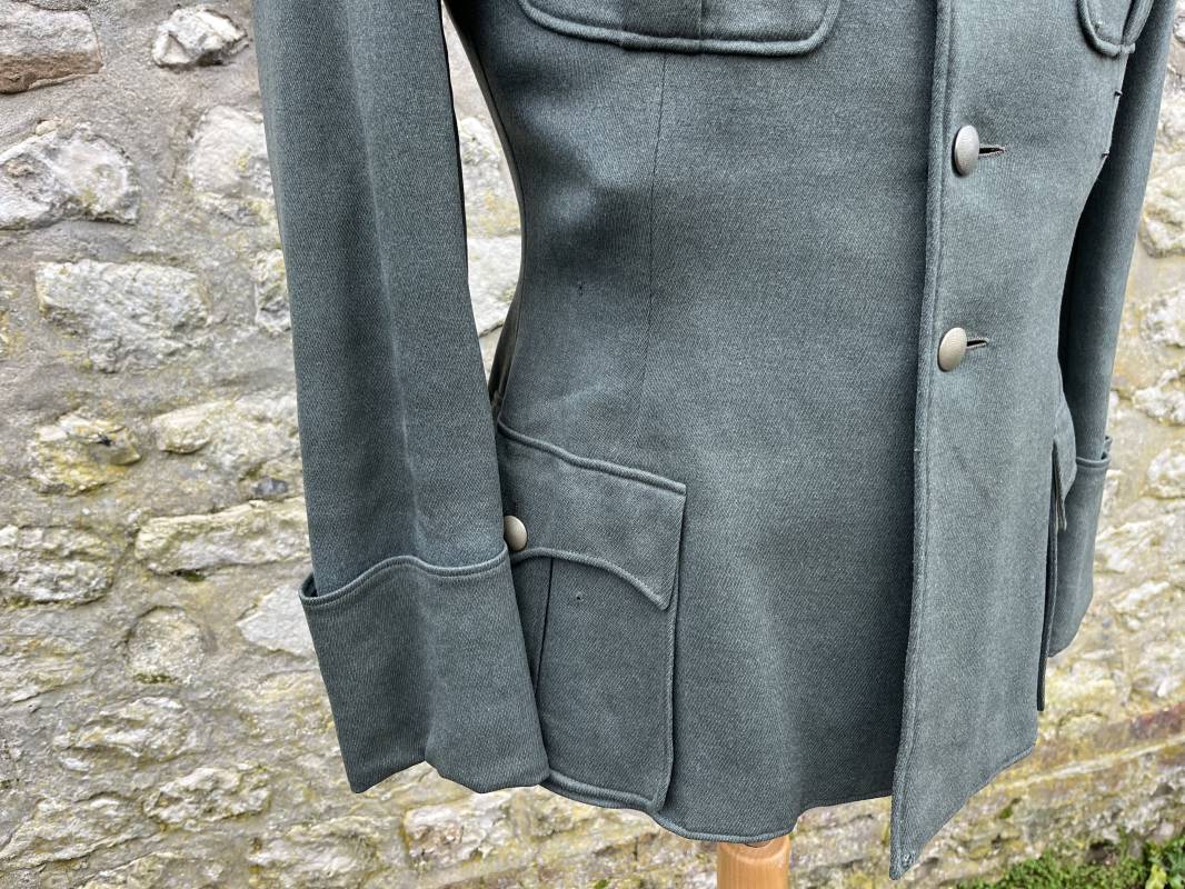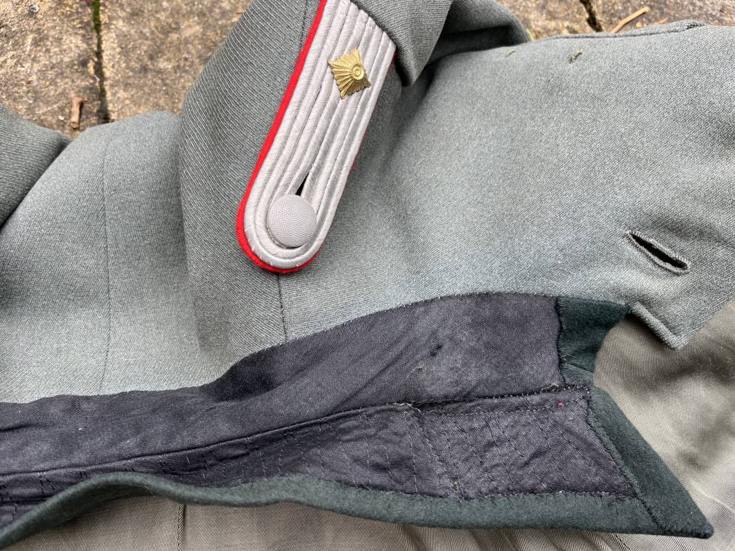 Trés belle veste modéle 1936 d un officier de l artillerie de la Heer . Veste quatre poches a plis watteau en gabardine feldgrau , col en drap vert foncé , Pattes de col montées machine et pattes d épaules cousues aux enmanchures liseré rouge de l artillerie Grade de Lieutenant ( ober leutnant) Aigle de poitrine brodé cannetille pour officier , ruban de croix de fer 2me classe 1939 cousu a la boutonnière . Passants pour le port de badges et décorations de poitrine . Intérieur doublé en satinette feldgrau , deux poches intéreures . Etiquette tailleur militaire a Munich . Veste de service d un artilleur ; legerement portée en parfait état Largeur épaules 40 cm , longueur 74 cm , manches 61 cm . Bel uniforme en parfait état 1935/45 Ref 21575