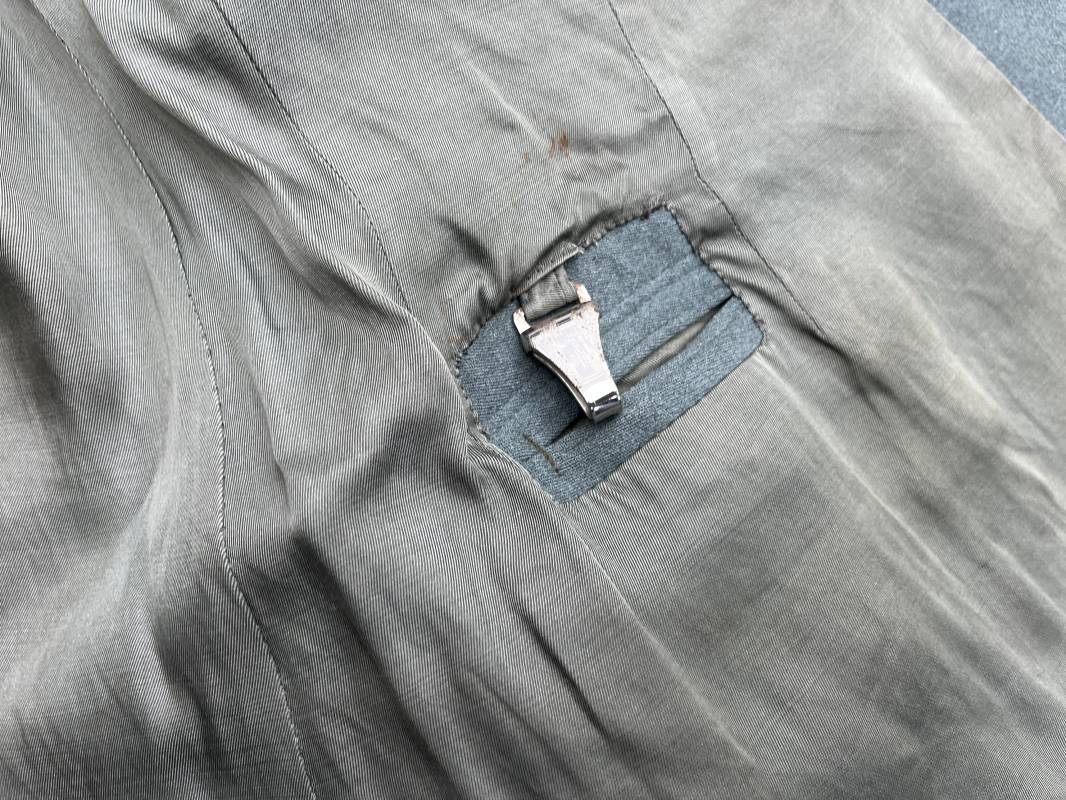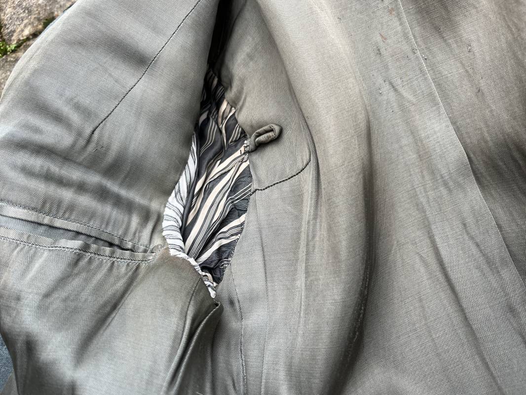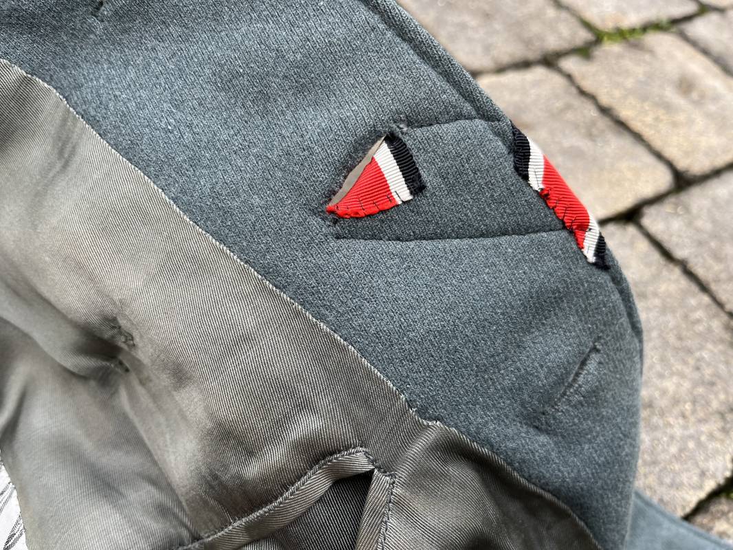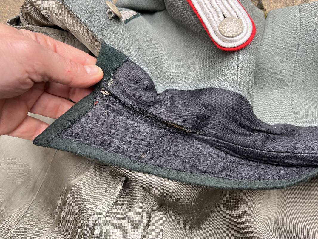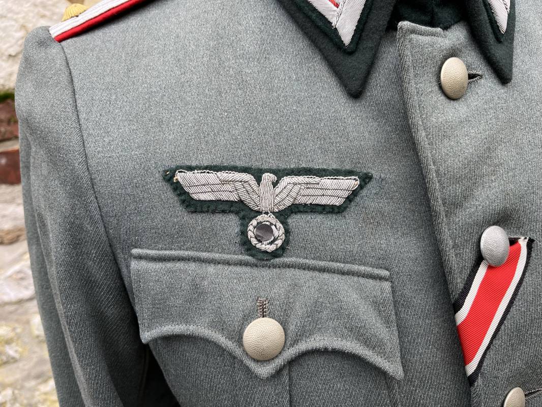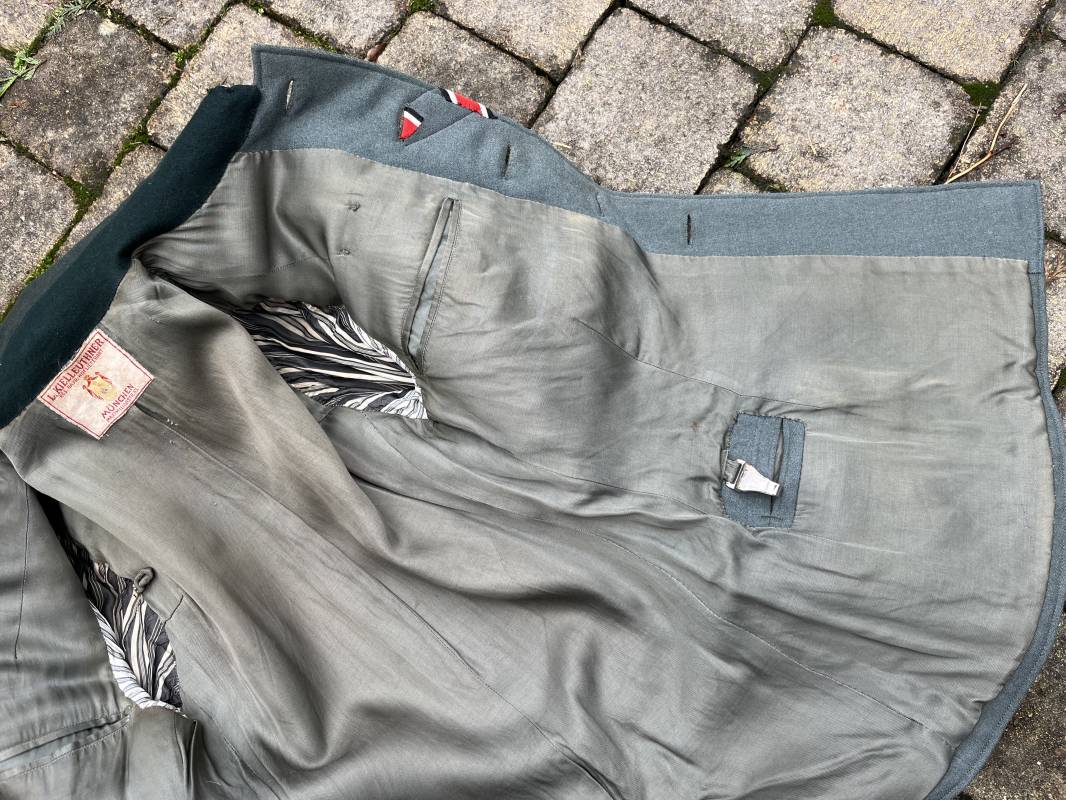Trés belle veste modéle 1936 d un officier de l artillerie de la Heer . Veste quatre poches a plis watteau en gabardine feldgrau , col en drap vert foncé , Pattes de col montées machine et pattes d épaules cousues aux enmanchures liseré rouge de l artillerie Grade de Lieutenant ( ober leutnant) Aigle de poitrine brodé cannetille pour officier , ruban de croix de fer 2me classe 1939 cousu a la boutonnière . Passants pour le port de badges et décorations de poitrine . Intérieur doublé en satinette feldgrau , deux poches intéreures . Etiquette tailleur militaire a Munich . Veste de service d un artilleur ; legerement portée en parfait état Largeur épaules 40 cm , longueur 74 cm , manches 61 cm . Bel uniforme en parfait état 1935/45 Ref 21575