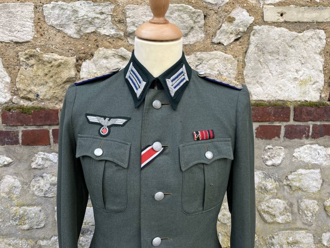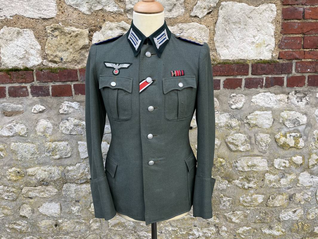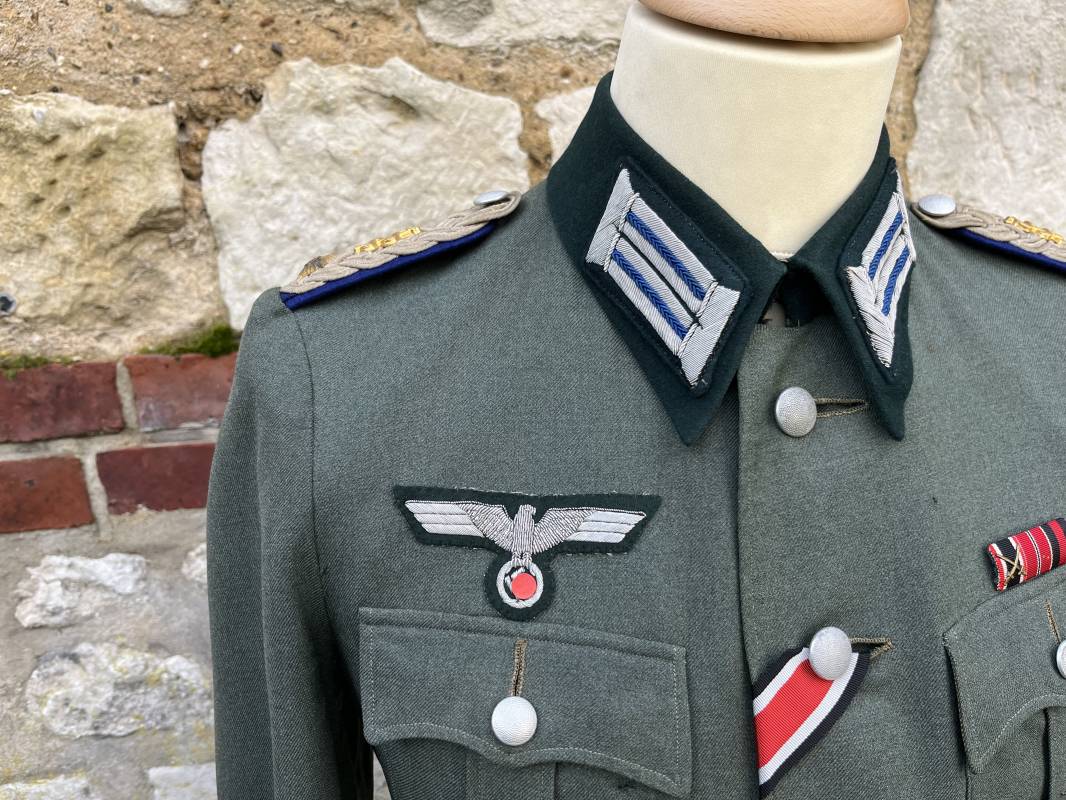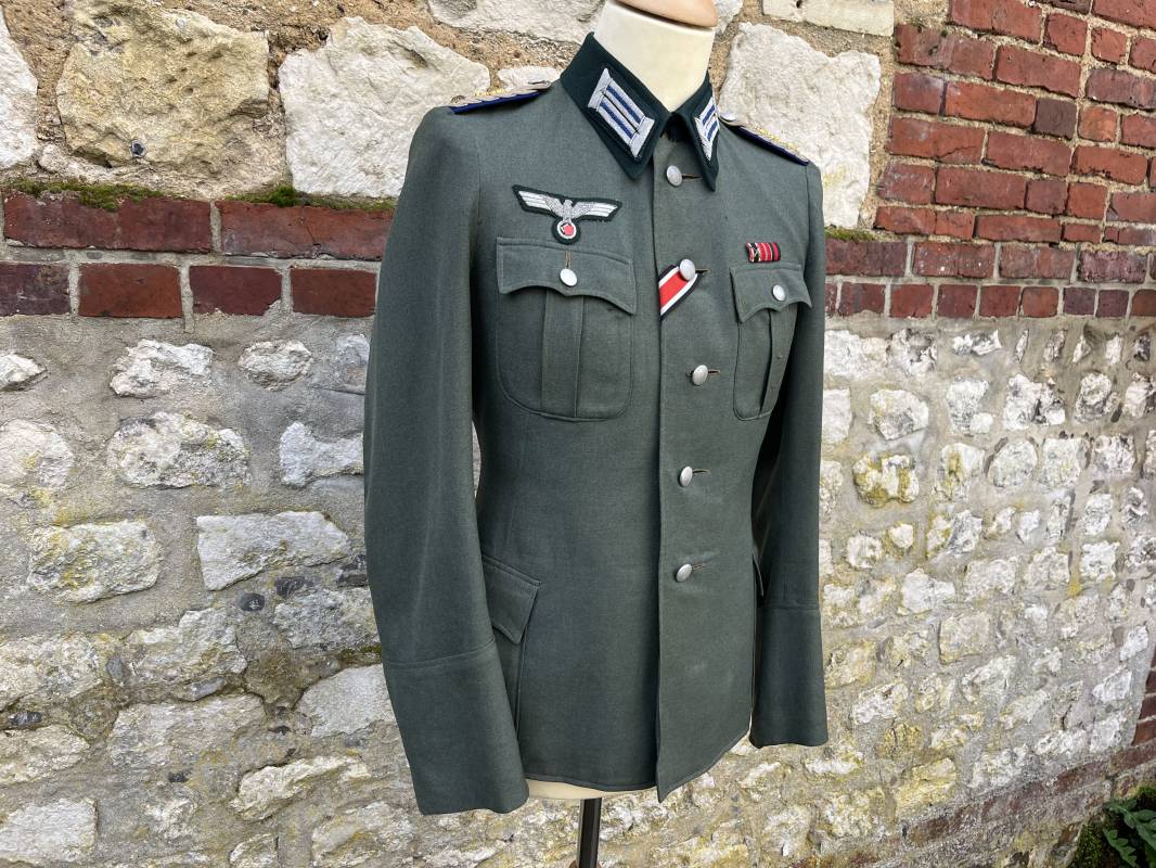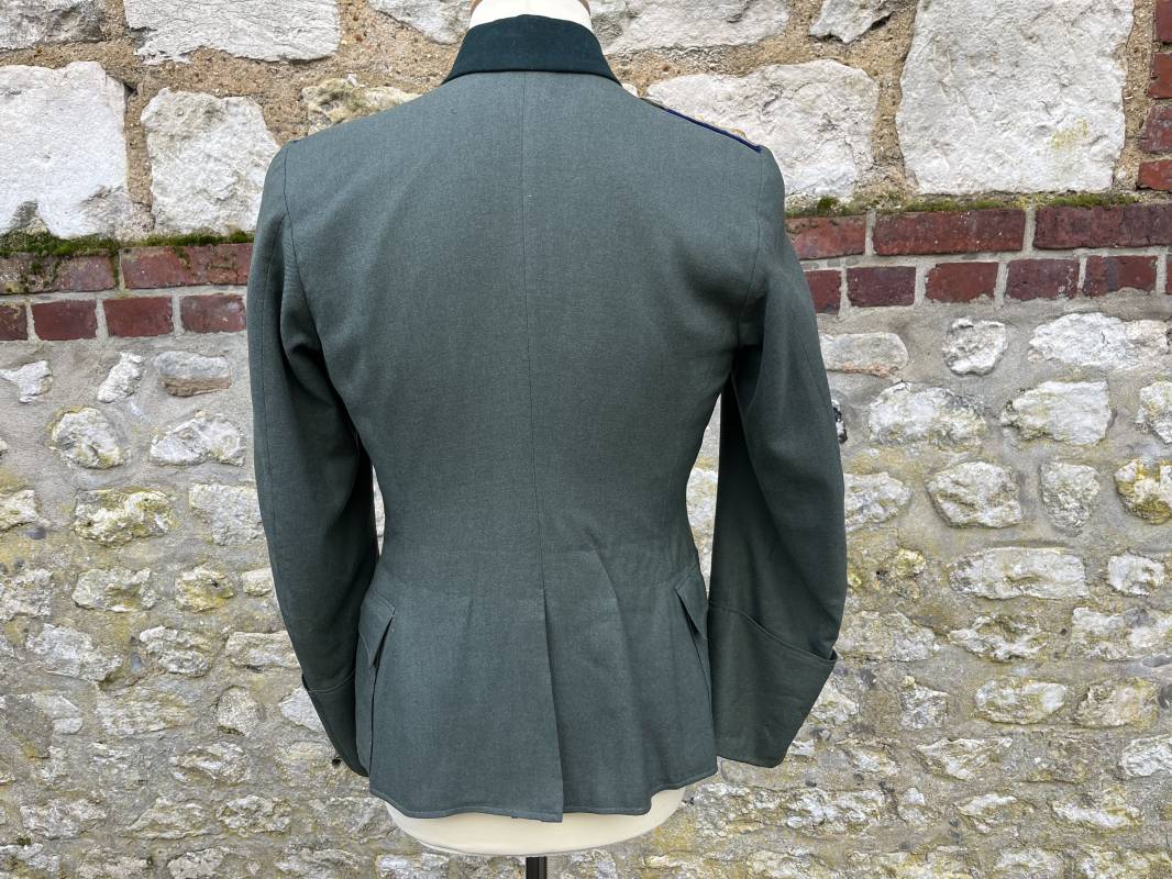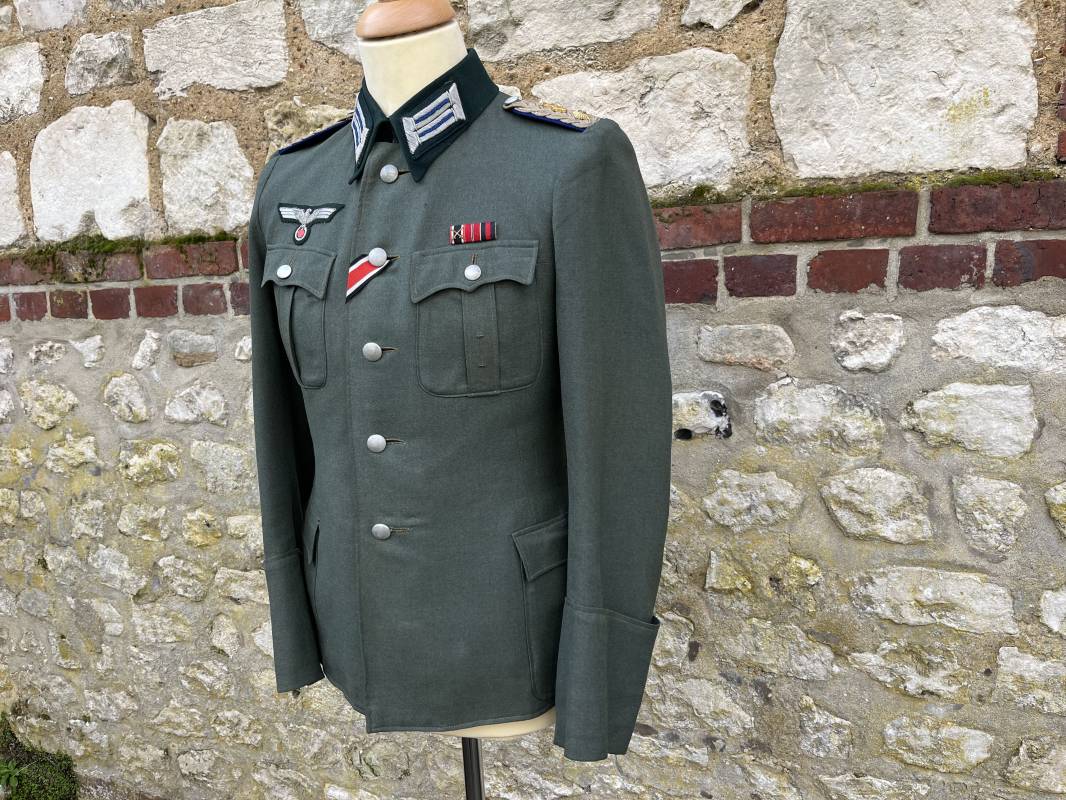Trés belle veste modéle 1936 d un officier médecin de la Heer . Cette veste est entièrement montée d origine . Veste quatre poches a plis watteau en gabardine feldgrau , col en drap de laine vert foncé , Pattes de col montées machine et pattes d épaules cousues aux enmanchures liseré bleu nuit du service de santé ?monograme de specialité caducé du service de santé et clous de grade metallique . Grade de lieutenant colonel ( Oberst) . Fermeture frontale à cinq boutons . Boutons grenelés argent cousus d origine . Aigle de poitrine brodé cannetille pour officier , ruban de croix de fer 2éme classe 1939 cousu a la boutonnière .Passant pour une décoration de poitrine , ruban de trois decorations au dessus de la poche ( KVK II 39 , Médaille de l'est 41/42 , Annexion ) Intérieur doublé en satinette grise , une poche intéreure , passant pour le port de la dague . Veste de service légèrement portée en parfait état . Largeur épaules 42 cm , longueur 69 cm , manches 64 cm . Trés bel uniforme en parfait état 1940/45 Ref 21819