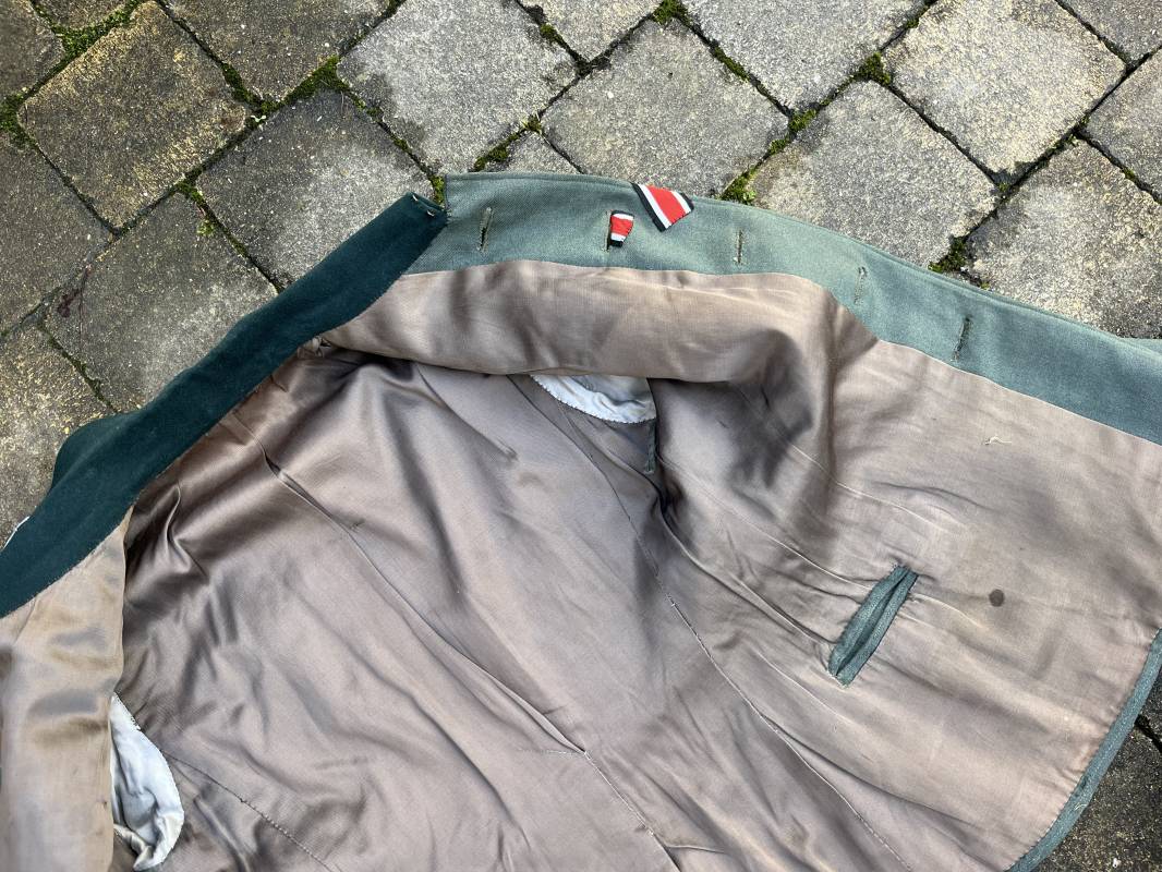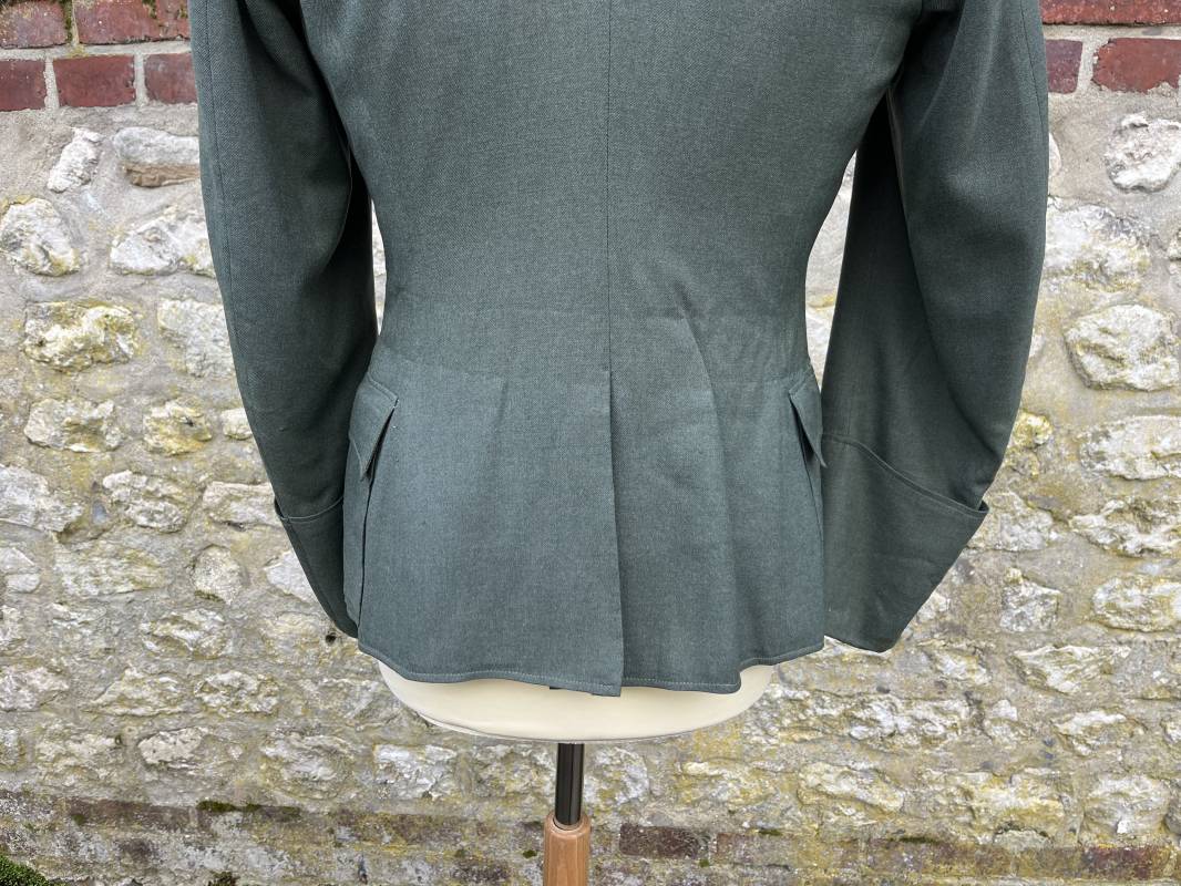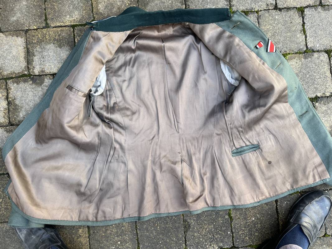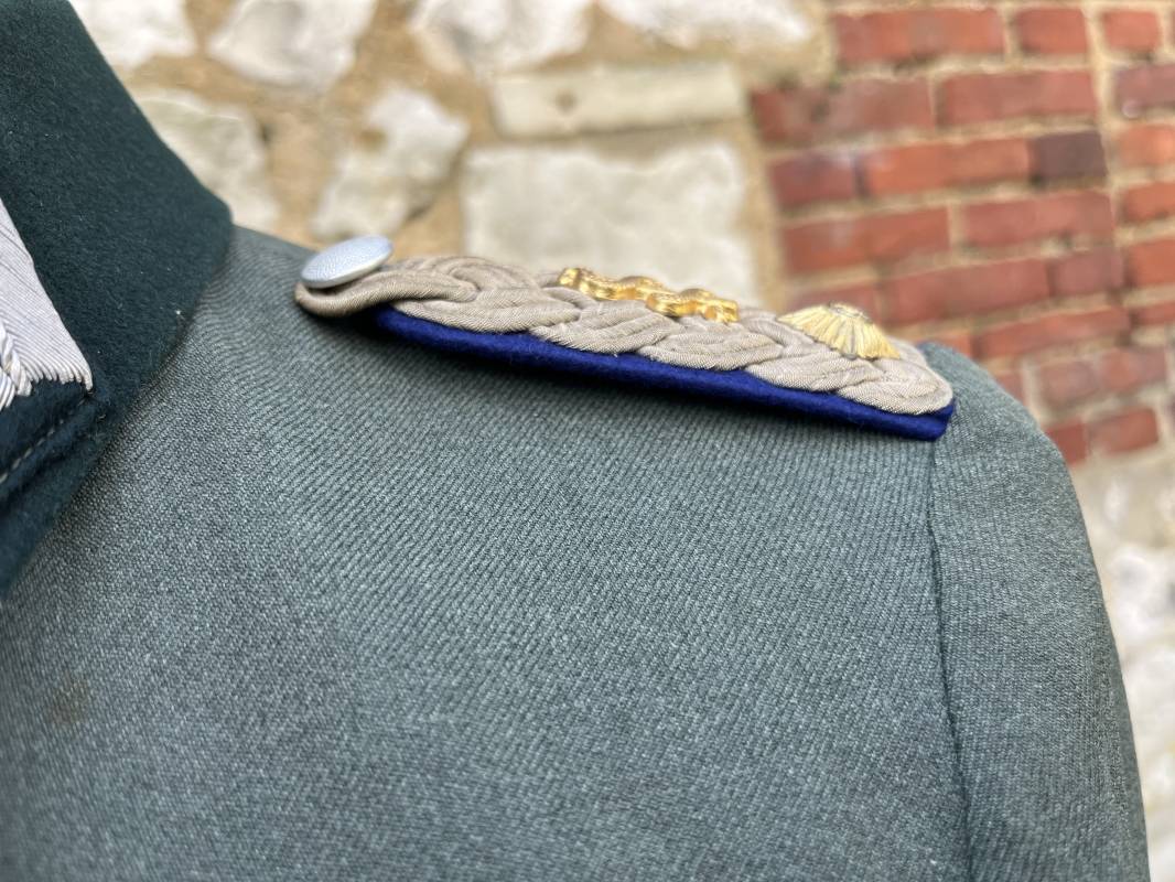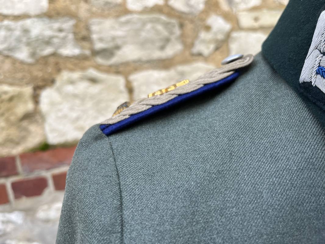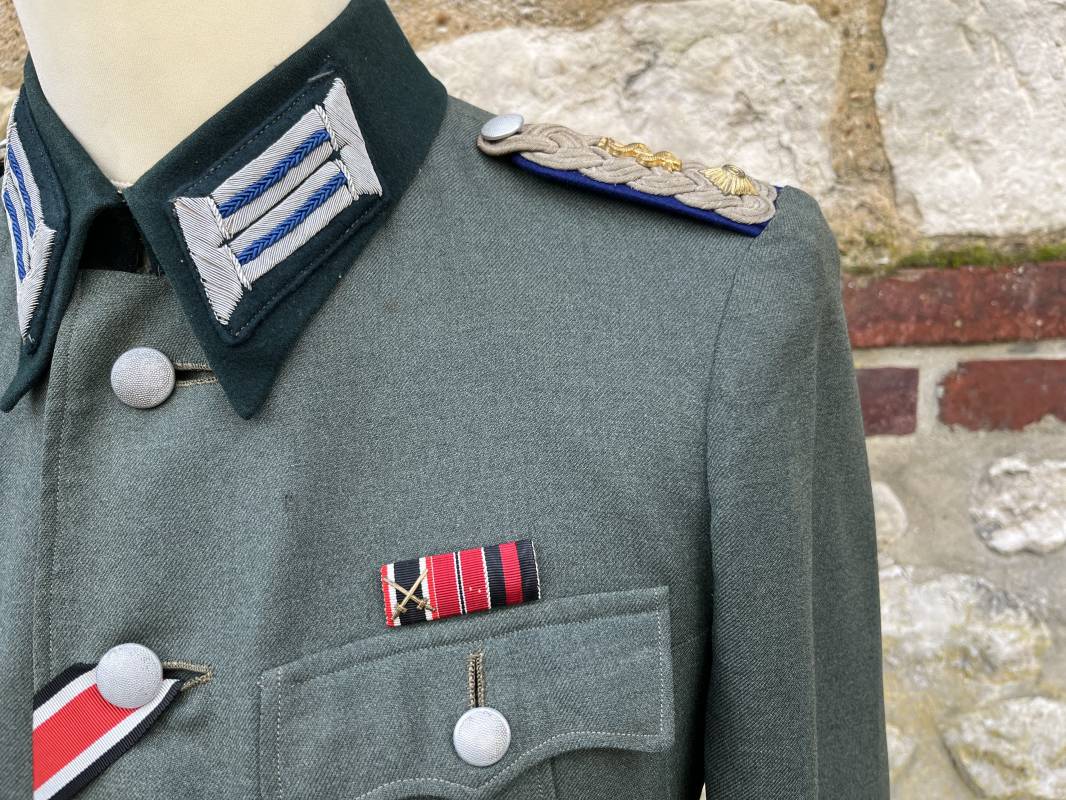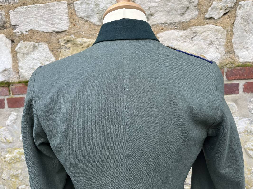Trés belle veste modéle 1936 d un officier médecin de la Heer . Cette veste est entièrement montée d origine . Veste quatre poches a plis watteau en gabardine feldgrau , col en drap de laine vert foncé , Pattes de col montées machine et pattes d épaules cousues aux enmanchures liseré bleu nuit du service de santé ?monograme de specialité caducé du service de santé et clous de grade metallique . Grade de lieutenant colonel ( Oberst) . Fermeture frontale à cinq boutons . Boutons grenelés argent cousus d origine . Aigle de poitrine brodé cannetille pour officier , ruban de croix de fer 2éme classe 1939 cousu a la boutonnière .Passant pour une décoration de poitrine , ruban de trois decorations au dessus de la poche ( KVK II 39 , Médaille de l'est 41/42 , Annexion ) Intérieur doublé en satinette grise , une poche intéreure , passant pour le port de la dague . Veste de service légèrement portée en parfait état . Largeur épaules 42 cm , longueur 69 cm , manches 64 cm . Trés bel uniforme en parfait état 1940/45 Ref 21819