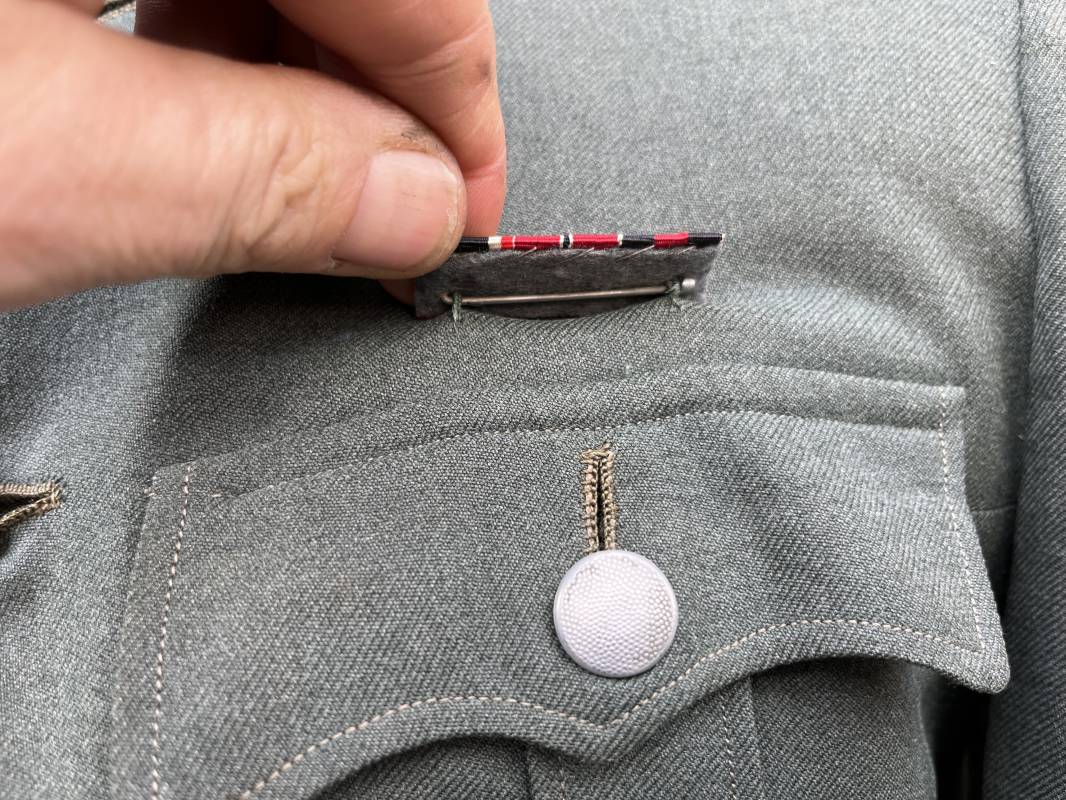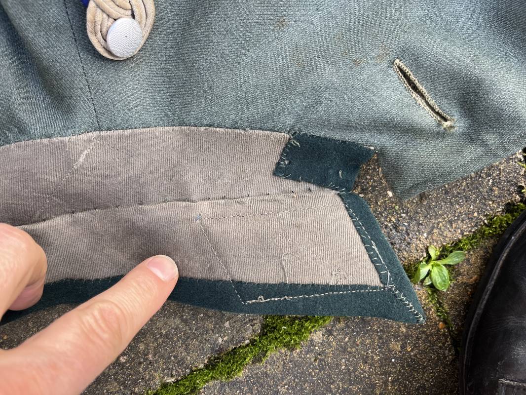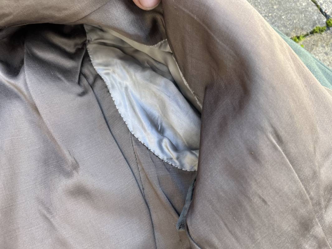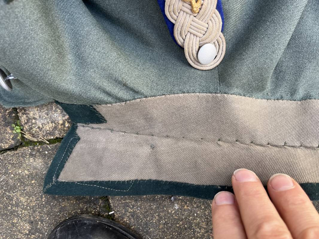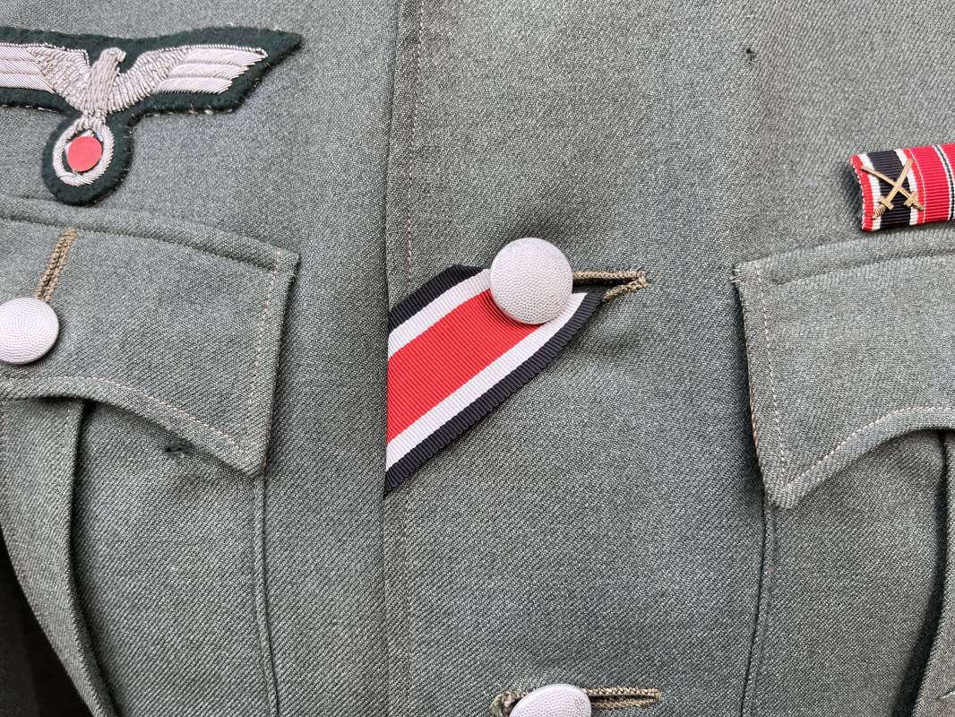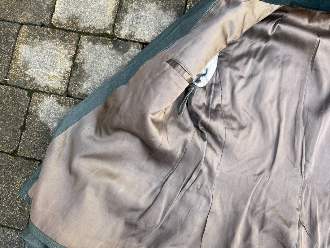 Trés belle veste modéle 1936 d un officier médecin de la Heer . Cette veste est entièrement montée d origine . Veste quatre poches a plis watteau en gabardine feldgrau , col en drap de laine vert foncé , Pattes de col montées machine et pattes d épaules cousues aux enmanchures liseré bleu nuit du service de santé ?monograme de specialité caducé du service de santé et clous de grade metallique . Grade de lieutenant colonel ( Oberst) . Fermeture frontale à cinq boutons . Boutons grenelés argent cousus d origine . Aigle de poitrine brodé cannetille pour officier , ruban de croix de fer 2éme classe 1939 cousu a la boutonnière .Passant pour une décoration de poitrine , ruban de trois decorations au dessus de la poche ( KVK II 39 , Médaille de l'est 41/42 , Annexion ) Intérieur doublé en satinette grise , une poche intéreure , passant pour le port de la dague . Veste de service légèrement portée en parfait état . Largeur épaules 42 cm , longueur 69 cm , manches 64 cm . Trés bel uniforme en parfait état 1940/45 Ref 21819
