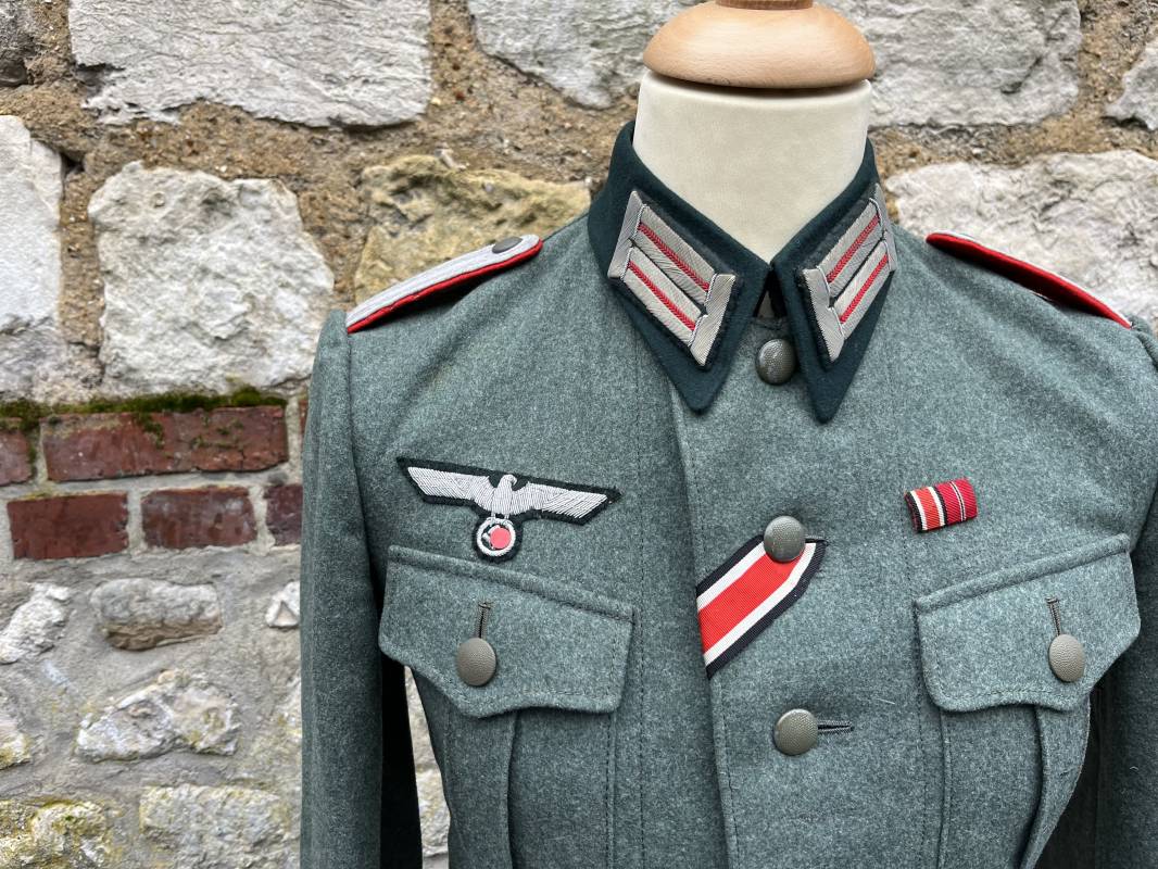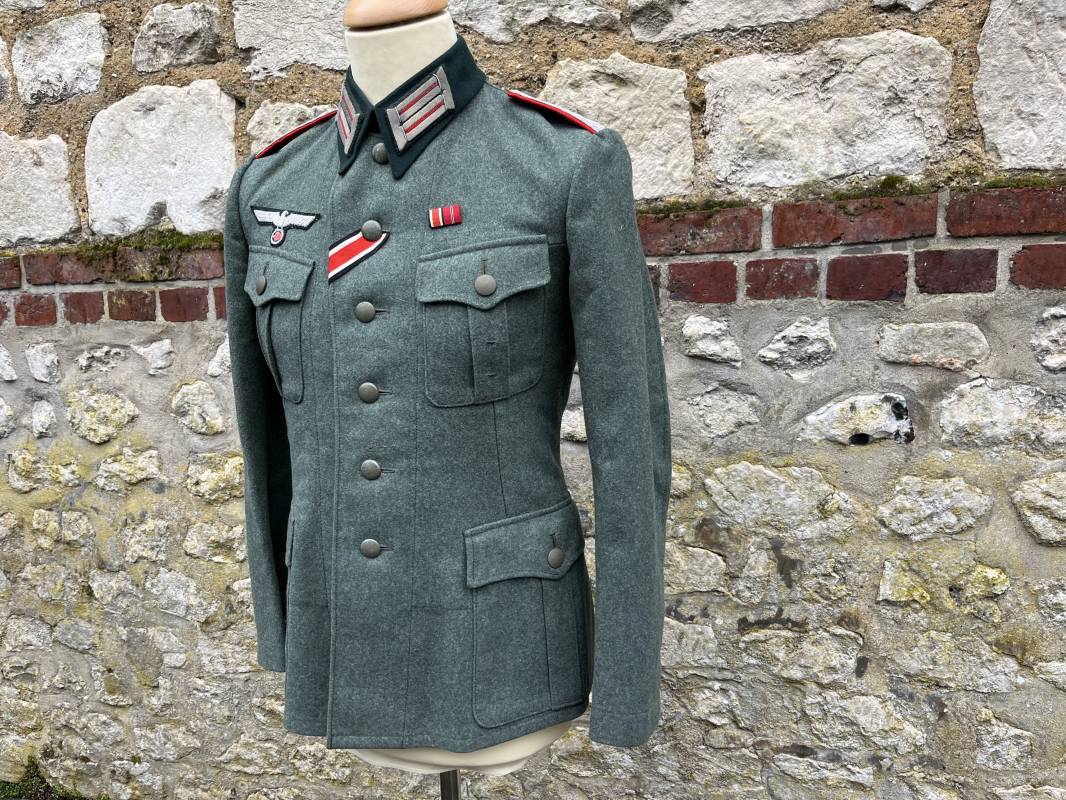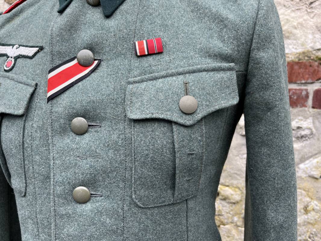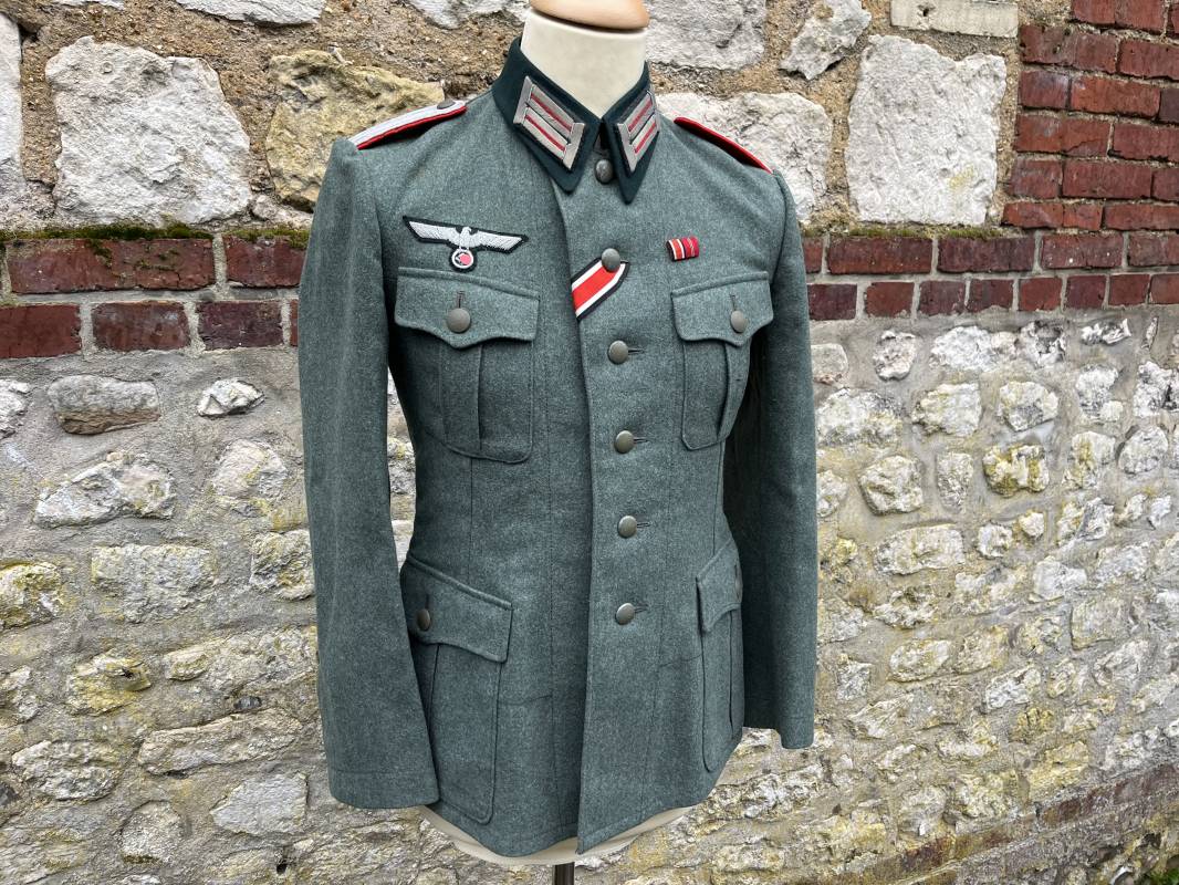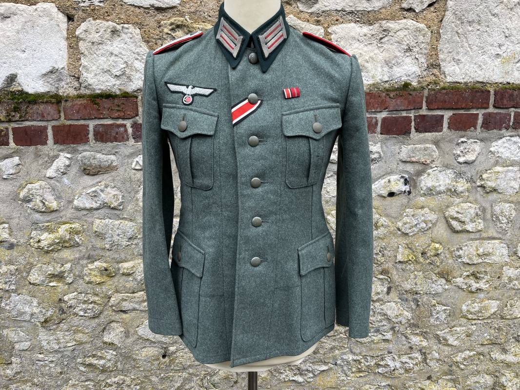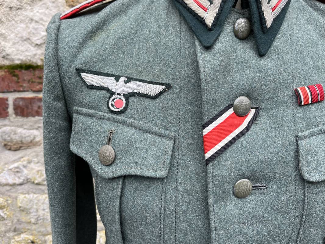 Trés belle veste de combat d un officier de l artillerie de la Heer . Veste modele 1941 de dotation pour la troupe modifiée pour officier . Conformément au réglement cette veste a été fournie par le corps de troupe a l officier pour sa tenue de campagne . Veste entièrement montée d origine en drap feldgrau , fermeture frontale a six boutons . Quatre poches a plis watteau , passants pour le port d un badge de poitrine . Boutons en fer grenelé peints feldgrau . Col vert foncé rigide pour officier crochets metalliques au col , litzen en cannetille argent , liseré rouge de l artillerie . Aigle de poitrine en cannetille argent . Pattes d epaules cousues aux enmanchures , liseré rouge , grade de sous lieutenant ( leutnant ) . Rubans de décorations en boutonnière ( EKII 39 ) , un ruban de poitrine médaille de l est 1941/42 et EKII 1939 . Cette vareuse est totalement montée d origine .Drap d une rare fraicheur en parfait état . La veste a ete tres peu portée . Intérieur doublé en coton gris Passant de dague avec petit plastron en cuir cousu . Largeur épaules 42 cm , longueur 76 cm , manche 62 cm . Rare veste de combat d un chef de section de batterie de l artillerie . Veste sans aucun défaut et définitive en collection 1941/42 Ref 21941
