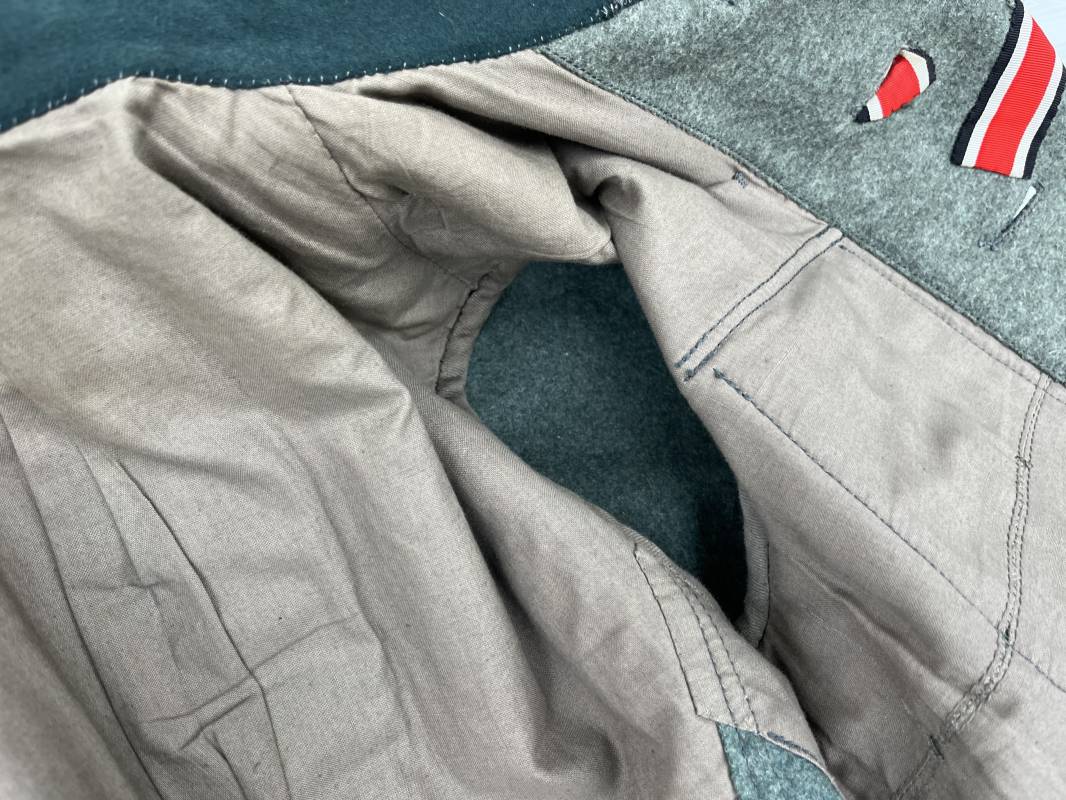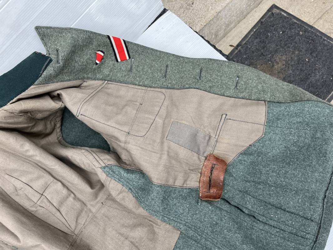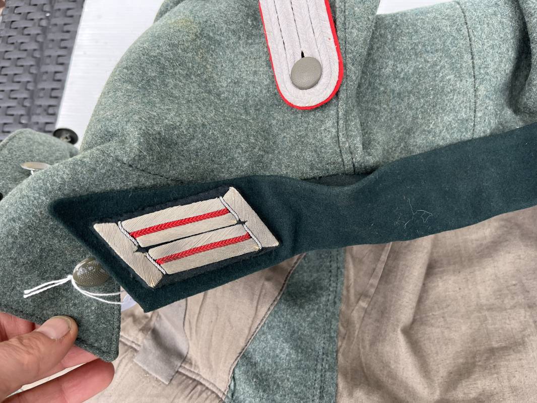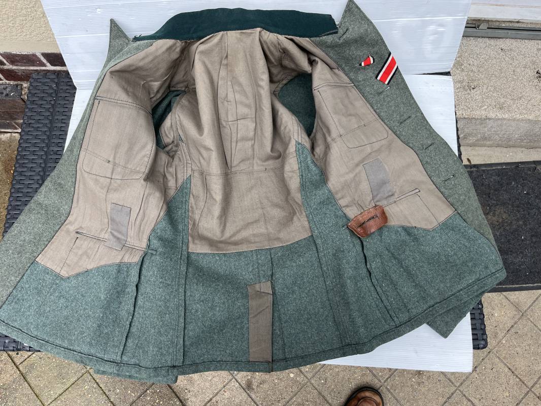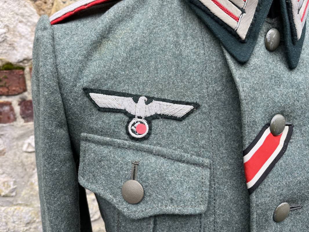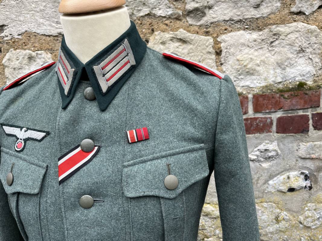 Trés belle veste de combat d un officier de l artillerie de la Heer . Veste modele 1941 de dotation pour la troupe modifiée pour officier . Conformément au réglement cette veste a été fournie par le corps de troupe a l officier pour sa tenue de campagne . Veste entièrement montée d origine en drap feldgrau , fermeture frontale a six boutons . Quatre poches a plis watteau , passants pour le port d un badge de poitrine . Boutons en fer grenelé peints feldgrau . Col vert foncé rigide pour officier crochets metalliques au col , litzen en cannetille argent , liseré rouge de l artillerie . Aigle de poitrine en cannetille argent . Pattes d epaules cousues aux enmanchures , liseré rouge , grade de sous lieutenant ( leutnant ) . Rubans de décorations en boutonnière ( EKII 39 ) , un ruban de poitrine médaille de l est 1941/42 et EKII 1939 . Cette vareuse est totalement montée d origine .Drap d une rare fraicheur en parfait état . La veste a ete tres peu portée . Intérieur doublé en coton gris Passant de dague avec petit plastron en cuir cousu . Largeur épaules 42 cm , longueur 76 cm , manche 62 cm . Rare veste de combat d un chef de section de batterie de l artillerie . Veste sans aucun défaut et définitive en collection 1941/42 Ref 21941