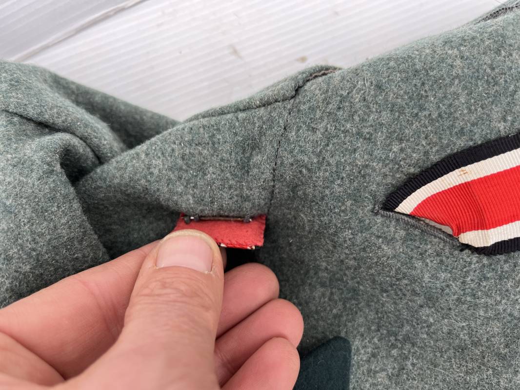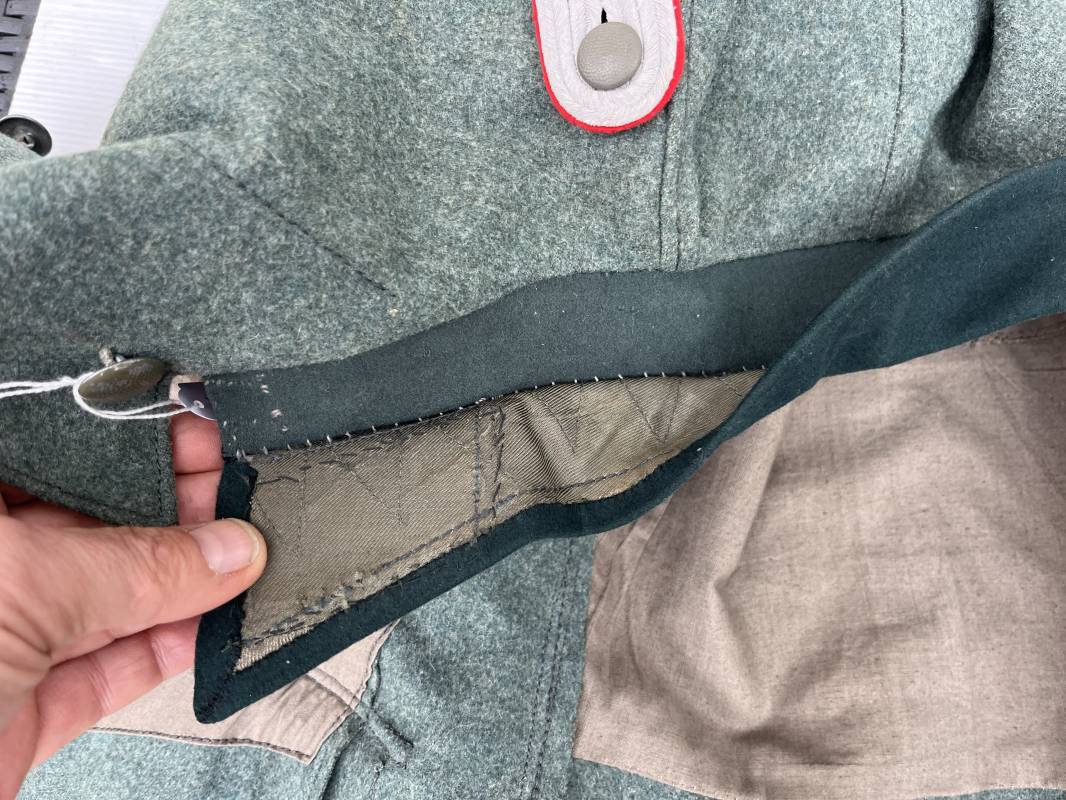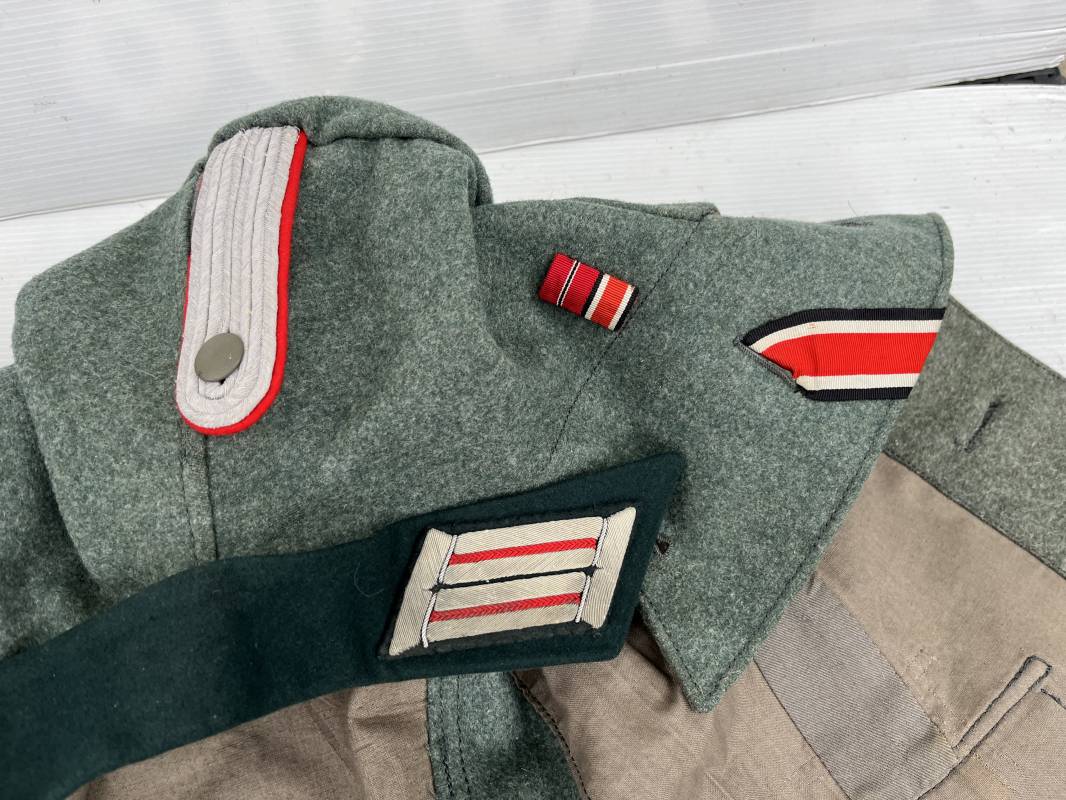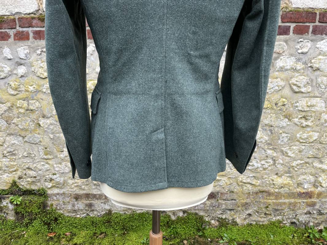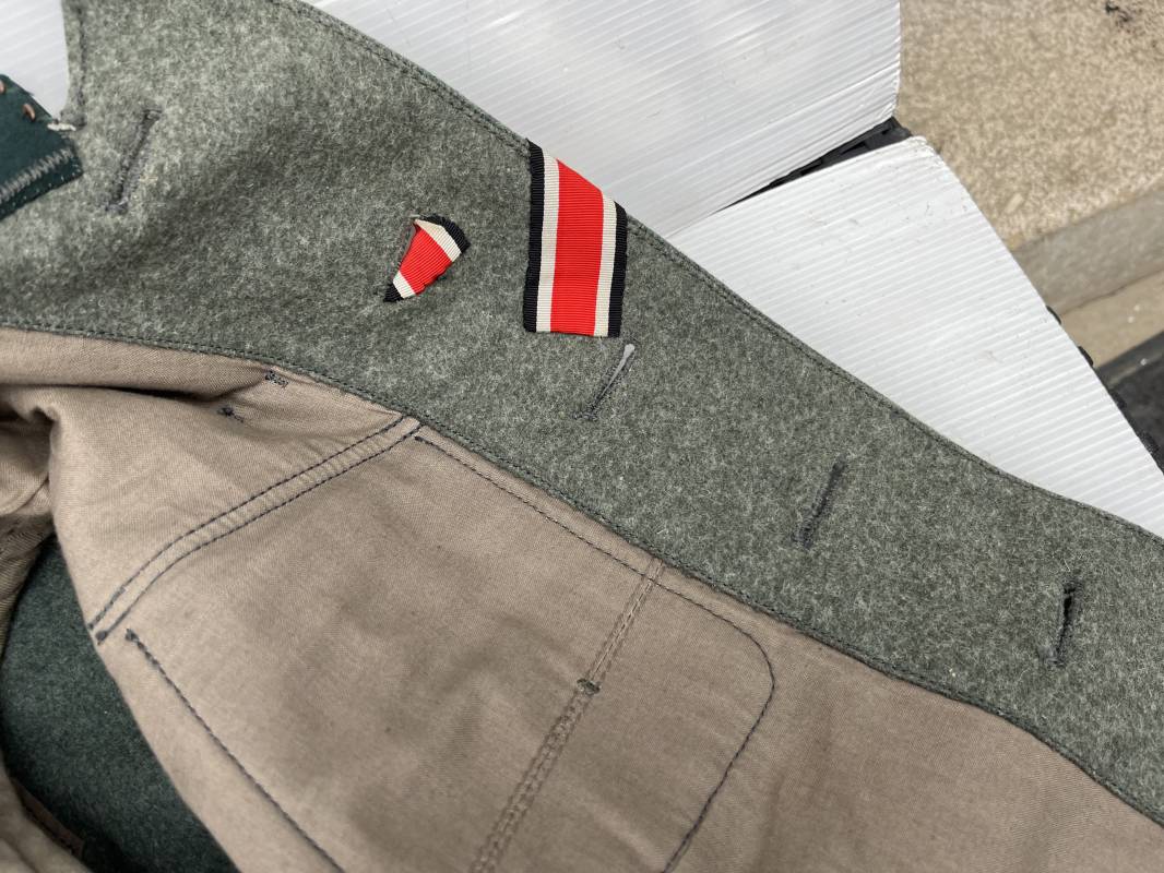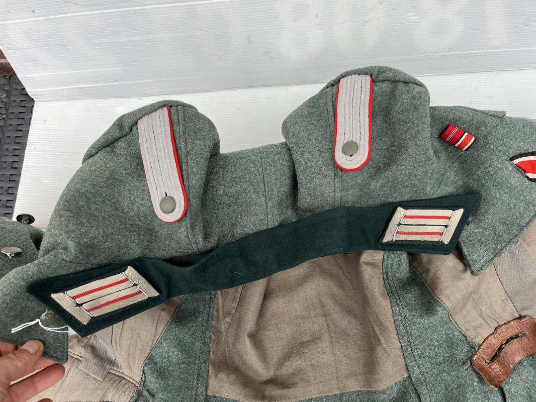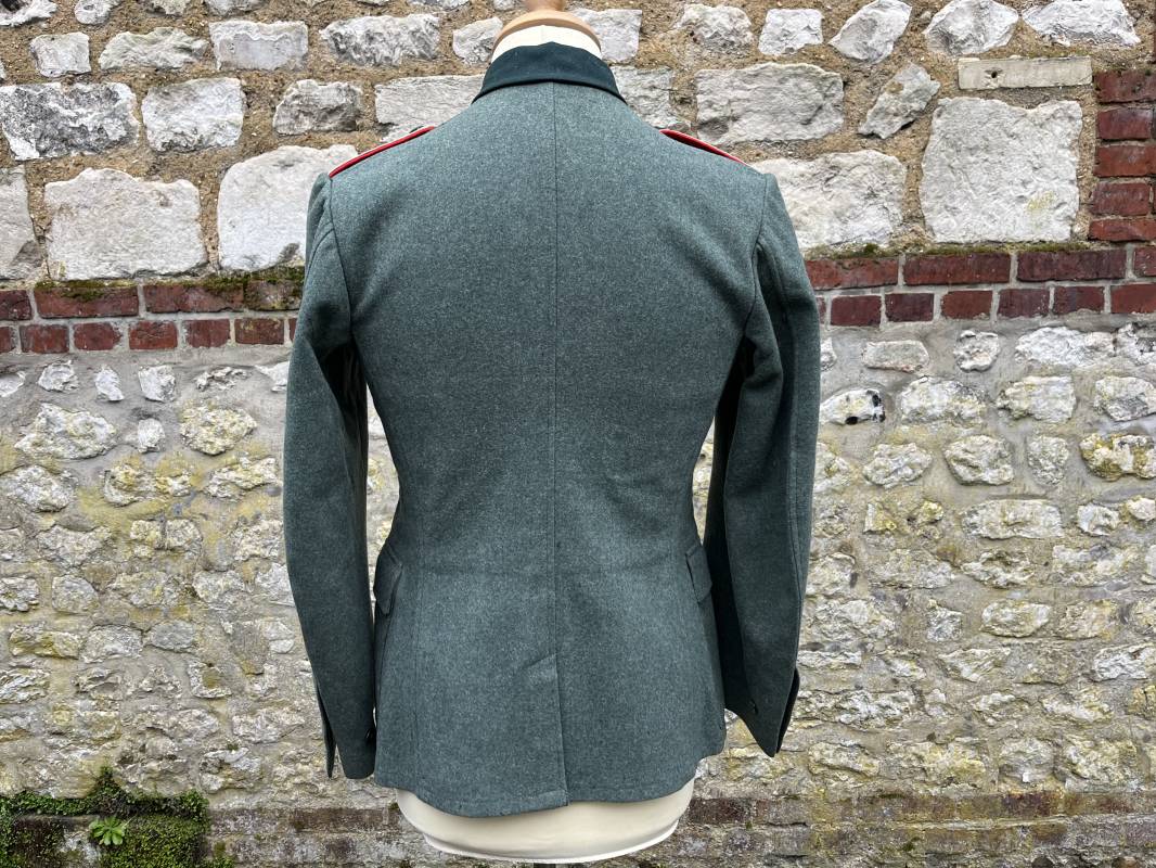 Trés belle veste de combat d un officier de l artillerie de la Heer . Veste modele 1941 de dotation pour la troupe modifiée pour officier . Conformément au réglement cette veste a été fournie par le corps de troupe a l officier pour sa tenue de campagne . Veste entièrement montée d origine en drap feldgrau , fermeture frontale a six boutons . Quatre poches a plis watteau , passants pour le port d un badge de poitrine . Boutons en fer grenelé peints feldgrau . Col vert foncé rigide pour officier crochets metalliques au col , litzen en cannetille argent , liseré rouge de l artillerie . Aigle de poitrine en cannetille argent . Pattes d epaules cousues aux enmanchures , liseré rouge , grade de sous lieutenant ( leutnant ) . Rubans de décorations en boutonnière ( EKII 39 ) , un ruban de poitrine médaille de l est 1941/42 et EKII 1939 . Cette vareuse est totalement montée d origine .Drap d une rare fraicheur en parfait état . La veste a ete tres peu portée . Intérieur doublé en coton gris Passant de dague avec petit plastron en cuir cousu . Largeur épaules 42 cm , longueur 76 cm , manche 62 cm . Rare veste de combat d un chef de section de batterie de l artillerie . Veste sans aucun défaut et définitive en collection 1941/42 Ref 21941