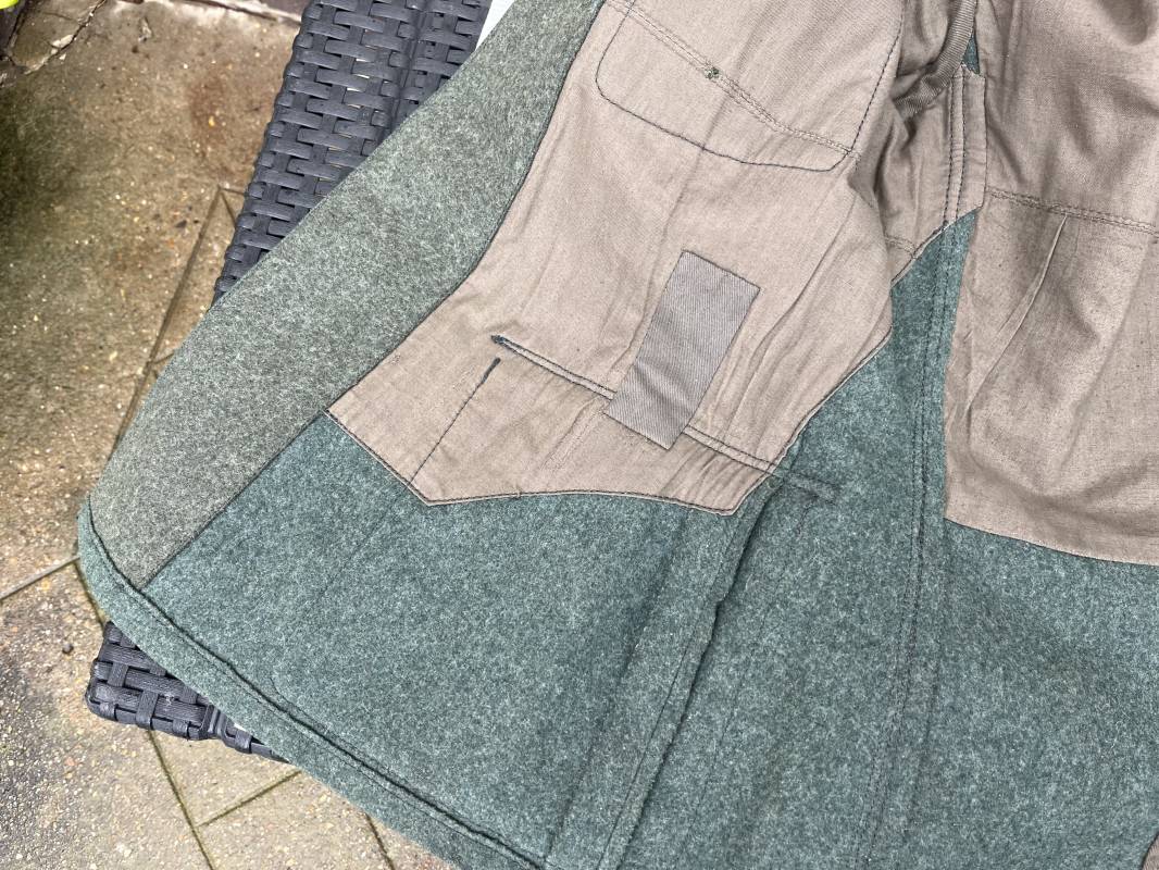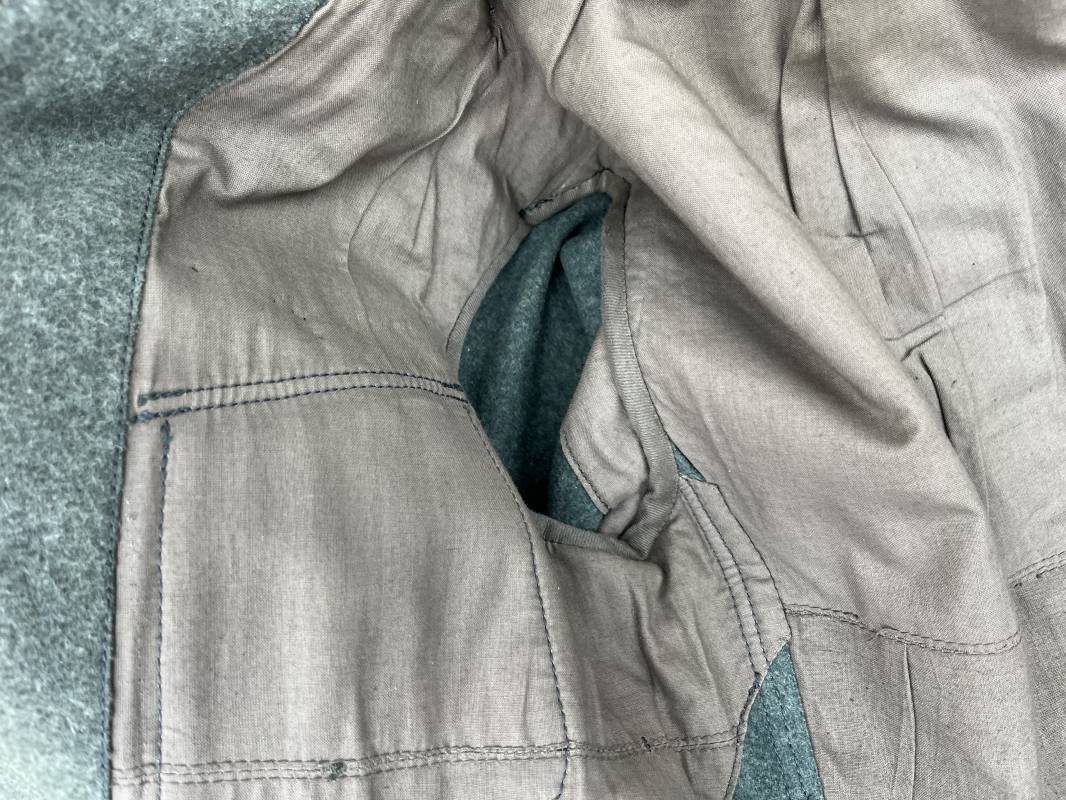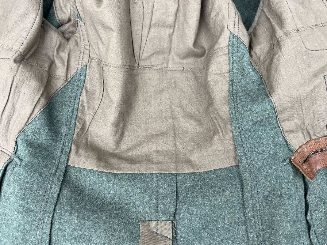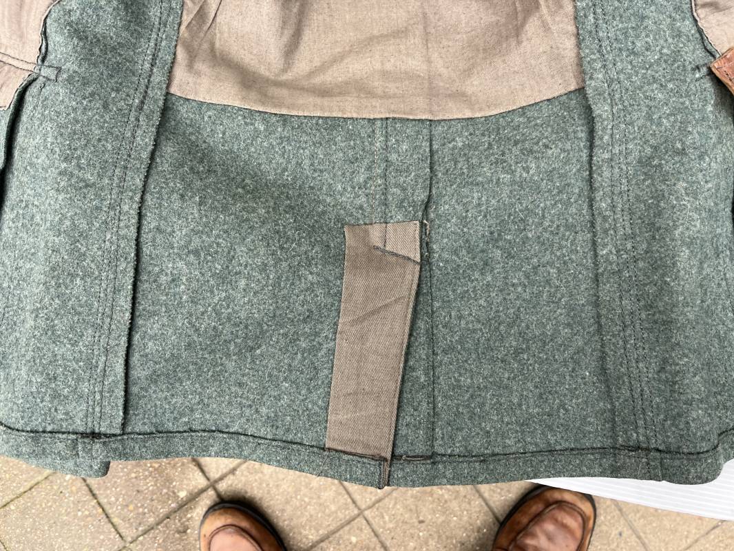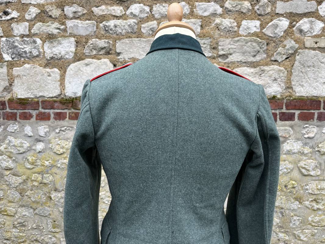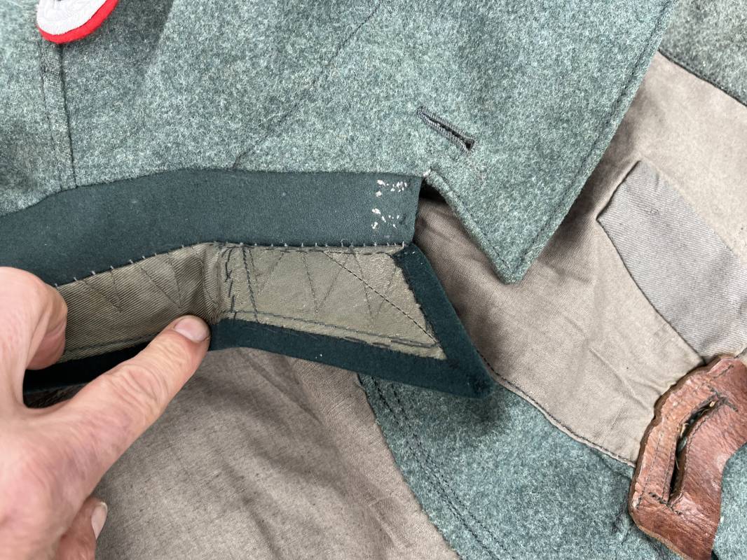 Trés belle veste de combat d un officier de l artillerie de la Heer . Veste modele 1941 de dotation pour la troupe modifiée pour officier . Conformément au réglement cette veste a été fournie par le corps de troupe a l officier pour sa tenue de campagne . Veste entièrement montée d origine en drap feldgrau , fermeture frontale a six boutons . Quatre poches a plis watteau , passants pour le port d un badge de poitrine . Boutons en fer grenelé peints feldgrau . Col vert foncé rigide pour officier crochets metalliques au col , litzen en cannetille argent , liseré rouge de l artillerie . Aigle de poitrine en cannetille argent . Pattes d epaules cousues aux enmanchures , liseré rouge , grade de sous lieutenant ( leutnant ) . Rubans de décorations en boutonnière ( EKII 39 ) , un ruban de poitrine médaille de l est 1941/42 et EKII 1939 . Cette vareuse est totalement montée d origine .Drap d une rare fraicheur en parfait état . La veste a ete tres peu portée . Intérieur doublé en coton gris Passant de dague avec petit plastron en cuir cousu . Largeur épaules 42 cm , longueur 76 cm , manche 62 cm . Rare veste de combat d un chef de section de batterie de l artillerie . Veste sans aucun défaut et définitive en collection 1941/42 Ref 21941