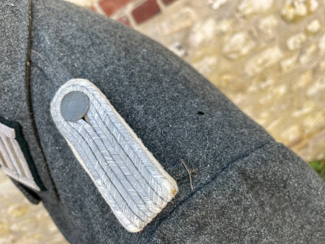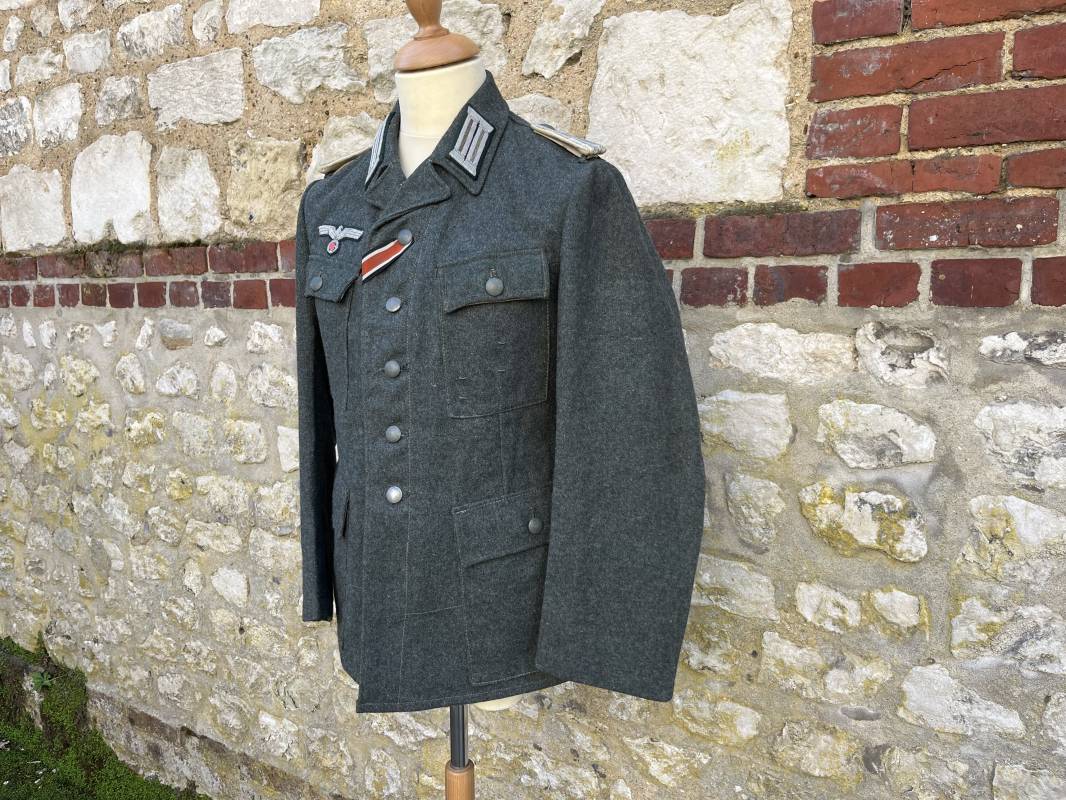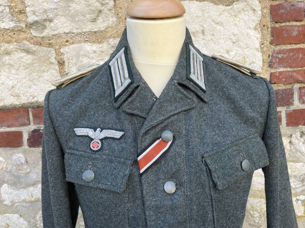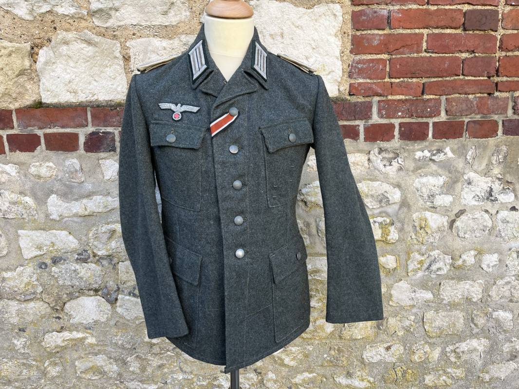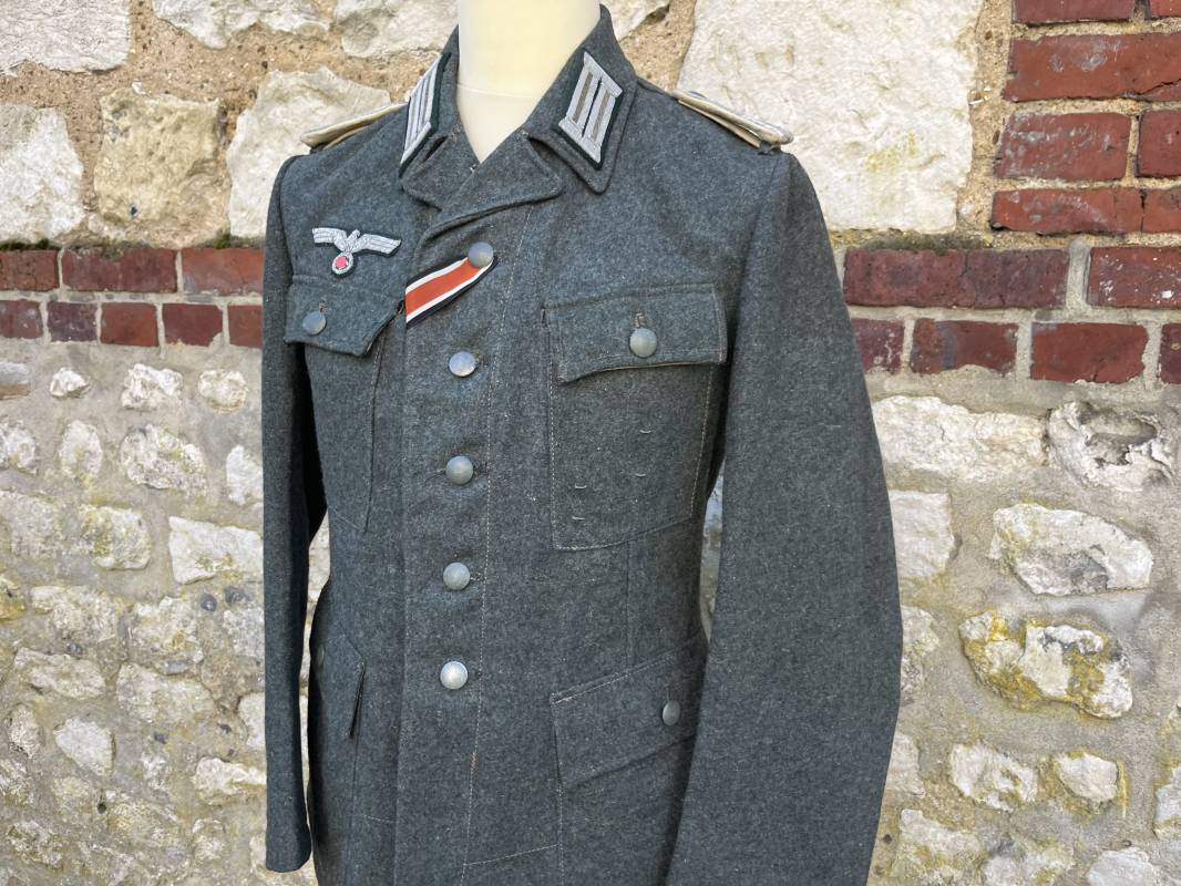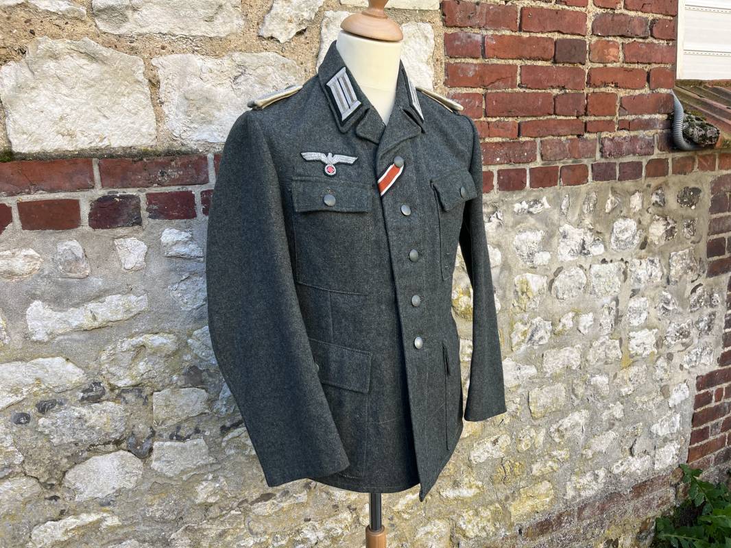 Rare veste modéle 1943 pour tenue de campagne d un officier de l infanterie de la Heer . Veste modele 1943 de dotation pour la troupe modifiée pour officier . Conformément au réglement cette veste a été fournie par le corps de troupe a l officier pour sa tenue de campagne . Veste en drap vert de' type ortie ' ( drap d importation italien ), fermeture frontale a six boutons . Quatre poches sans plis watteau . Boutons en fer grenelé mdle 1943 peints en gris . Col en drap de fond , litzen en cannetille argent , liseré blanc . Aigle de poitrine en cannetille argent . Pattes d epaules du modéle a rabat , liseré blanc , grade de sous lieutenant ( leutnant ) . Ruban croix de fer deuxième classe 1939 cousu a la boutonnière . . Passants en fil de coton pour le port de deux badges de poitrine . Cette vareuse est totalement montée d origine . Intéreur doublé en satinette grise , marquage taille et datée F44 . Tampon SS BW provenant d une chute de satinette dans laquelle la vareuse a été confectionnée !!! . Largeur épaules 44 cm , longueur 75 cm , manche 60 cm . Drap trés frais , veste legerement portée en parfait état Rare veste de combat d un chef de section de l infanterie 1944/45 Ref 21521
