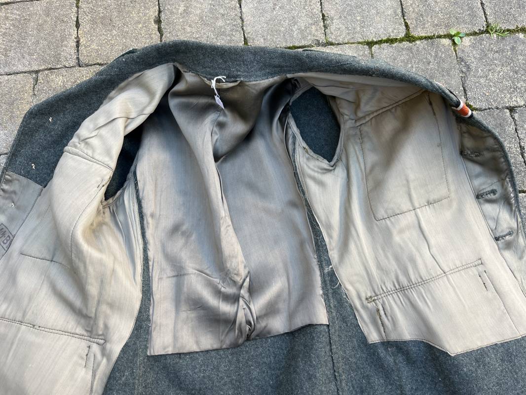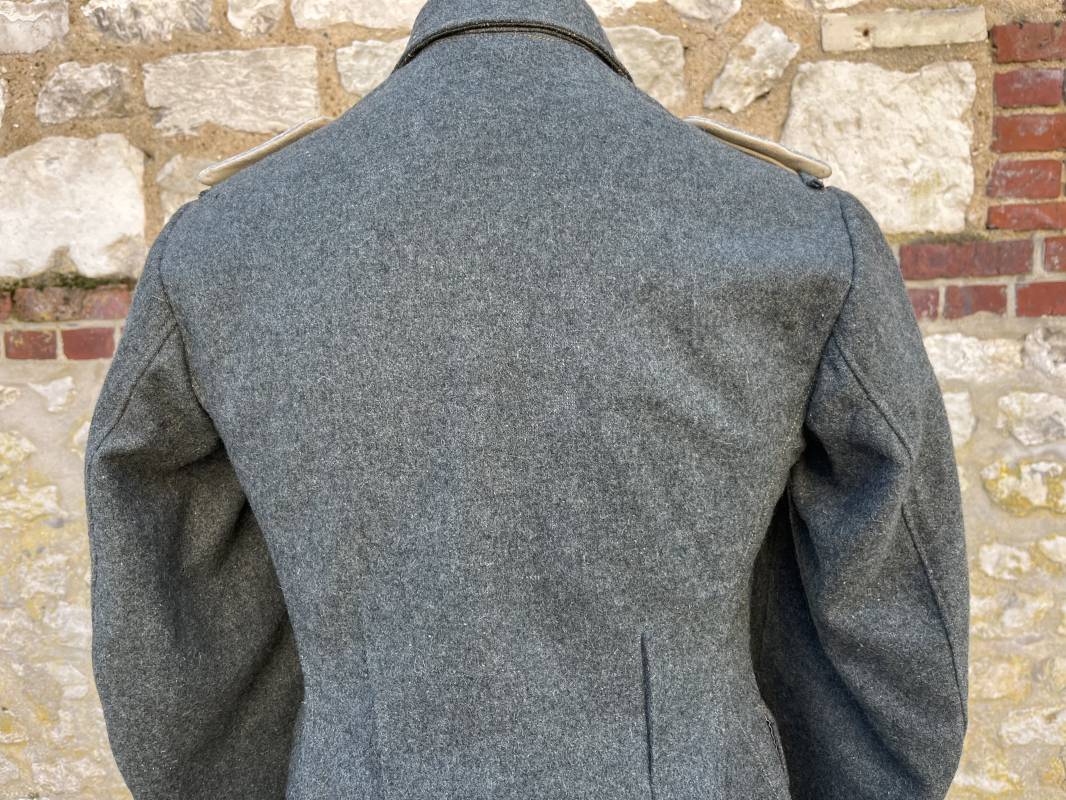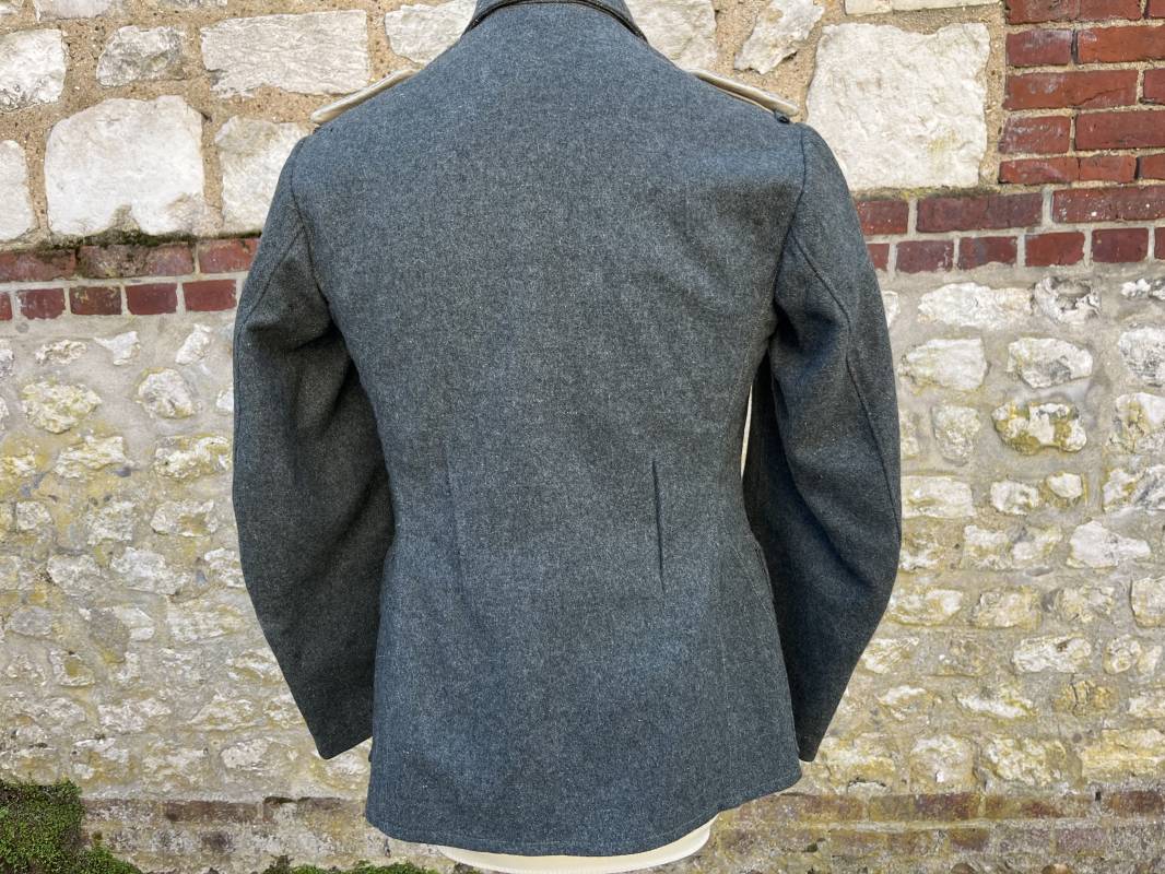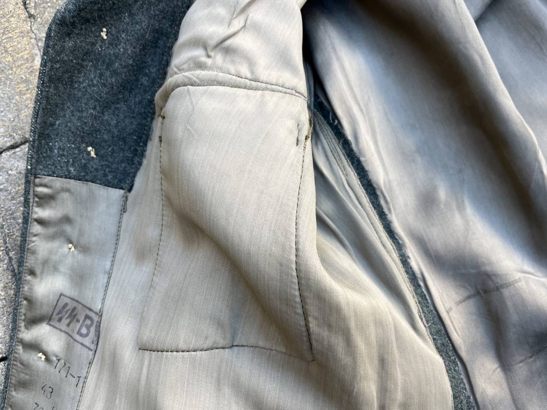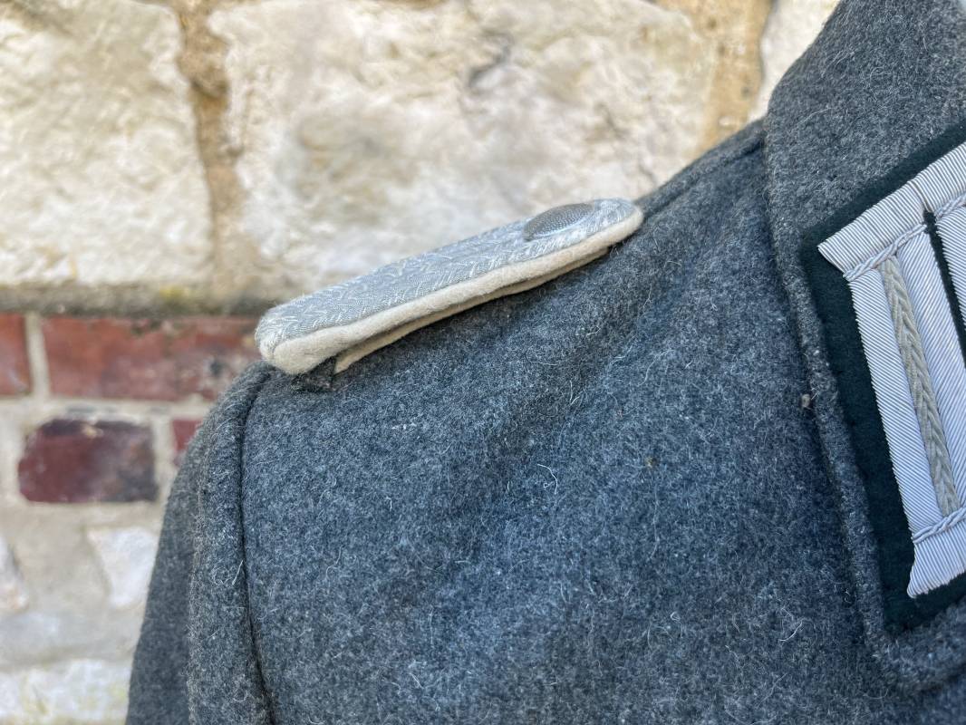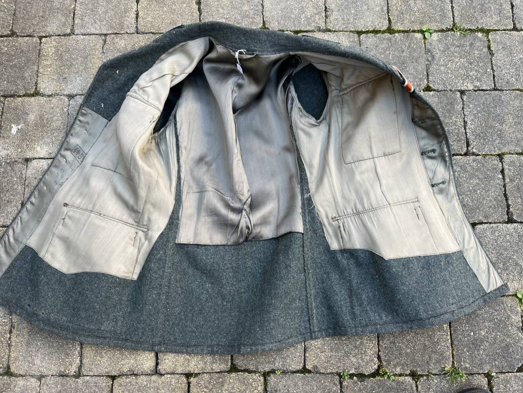 Rare veste modéle 1943 pour tenue de campagne d un officier de l infanterie de la Heer . Veste modele 1943 de dotation pour la troupe modifiée pour officier . Conformément au réglement cette veste a été fournie par le corps de troupe a l officier pour sa tenue de campagne . Veste en drap vert de' type ortie ' ( drap d importation italien ), fermeture frontale a six boutons . Quatre poches sans plis watteau . Boutons en fer grenelé mdle 1943 peints en gris . Col en drap de fond , litzen en cannetille argent , liseré blanc . Aigle de poitrine en cannetille argent . Pattes d epaules du modéle a rabat , liseré blanc , grade de sous lieutenant ( leutnant ) . Ruban croix de fer deuxième classe 1939 cousu a la boutonnière . . Passants en fil de coton pour le port de deux badges de poitrine . Cette vareuse est totalement montée d origine . Intéreur doublé en satinette grise , marquage taille et datée F44 . Tampon SS BW provenant d une chute de satinette dans laquelle la vareuse a été confectionnée !!! . Largeur épaules 44 cm , longueur 75 cm , manche 60 cm . Drap trés frais , veste legerement portée en parfait état Rare veste de combat d un chef de section de l infanterie 1944/45 Ref 21521