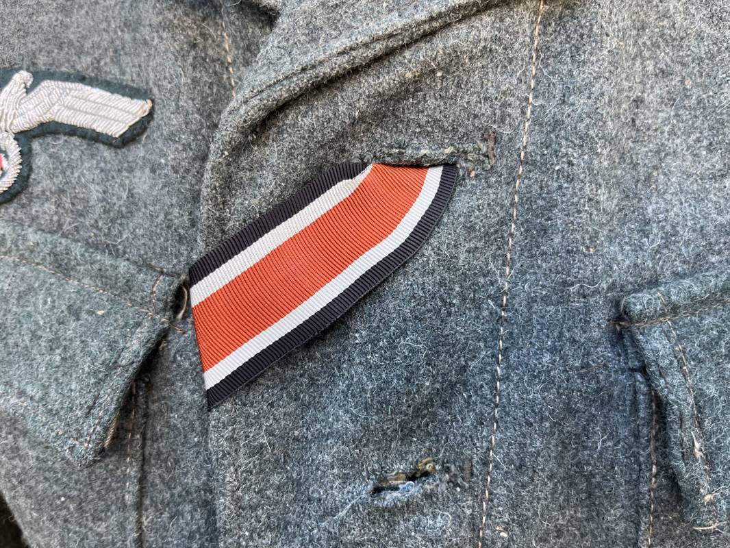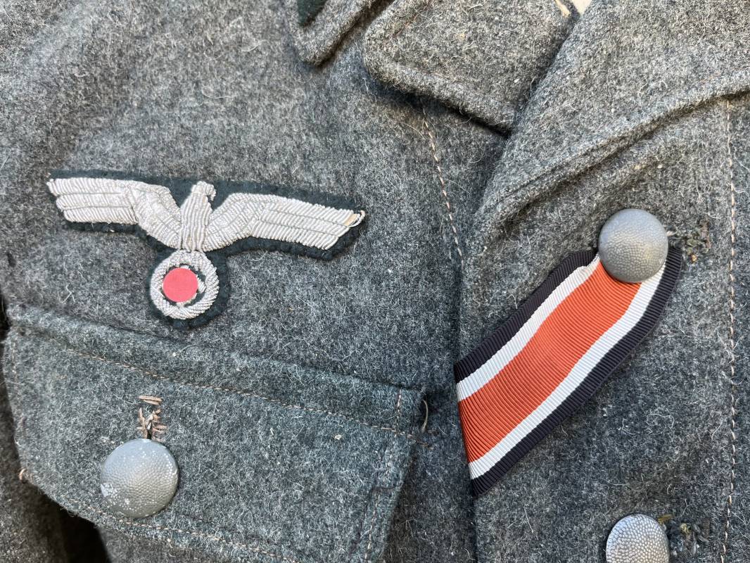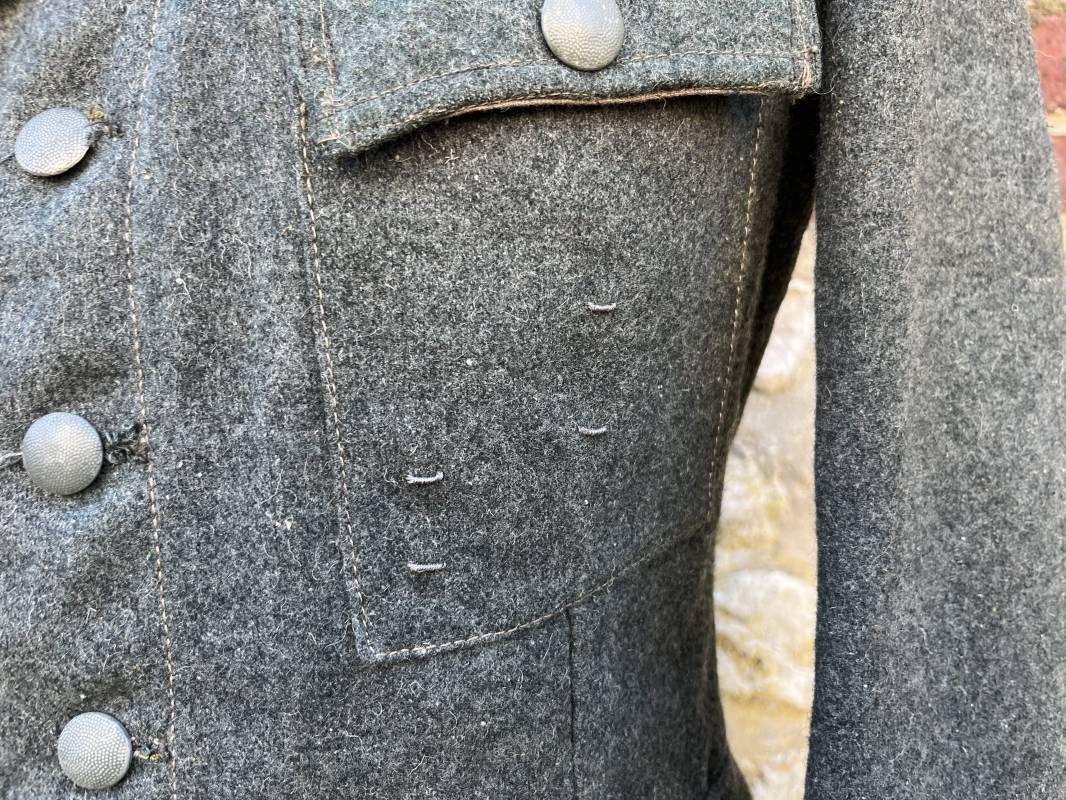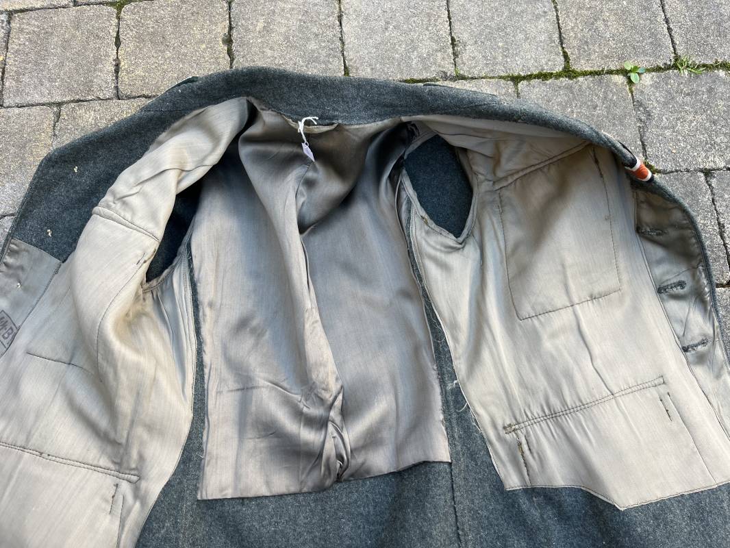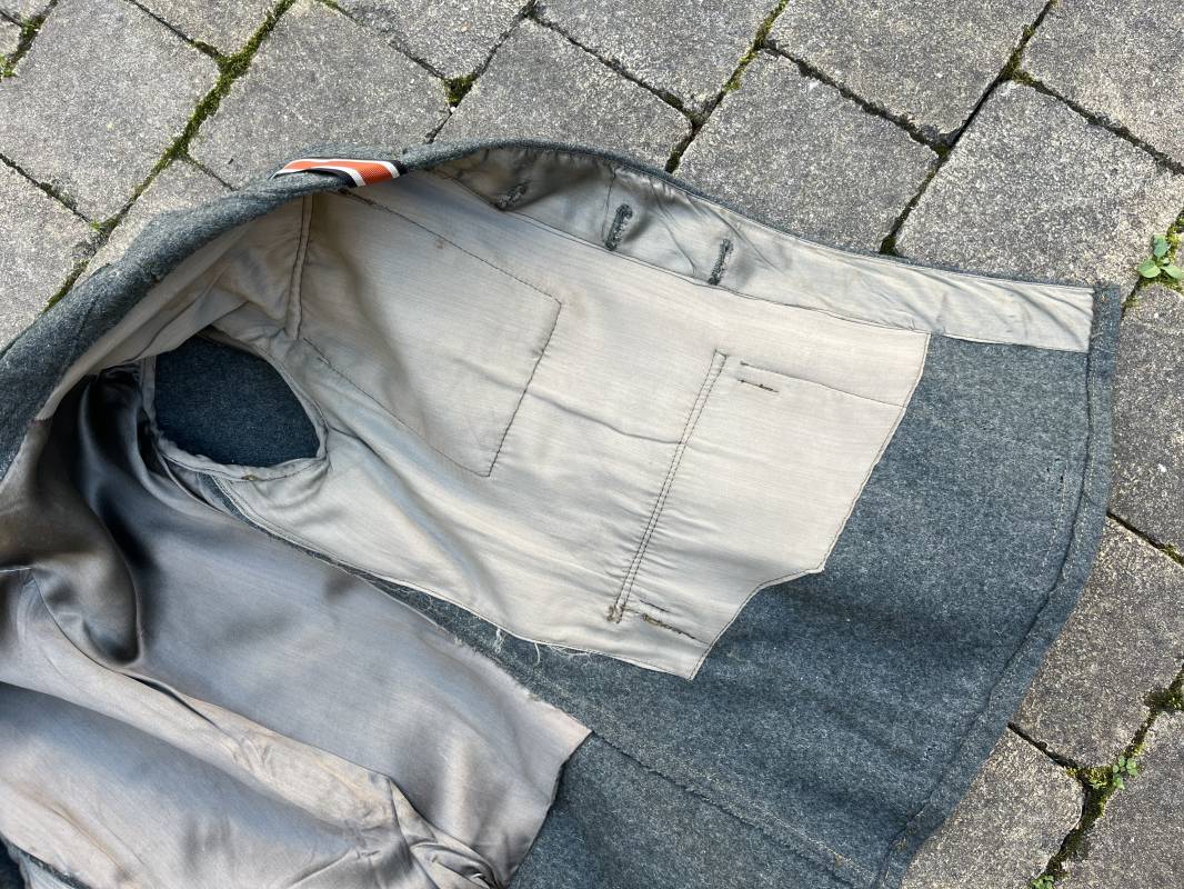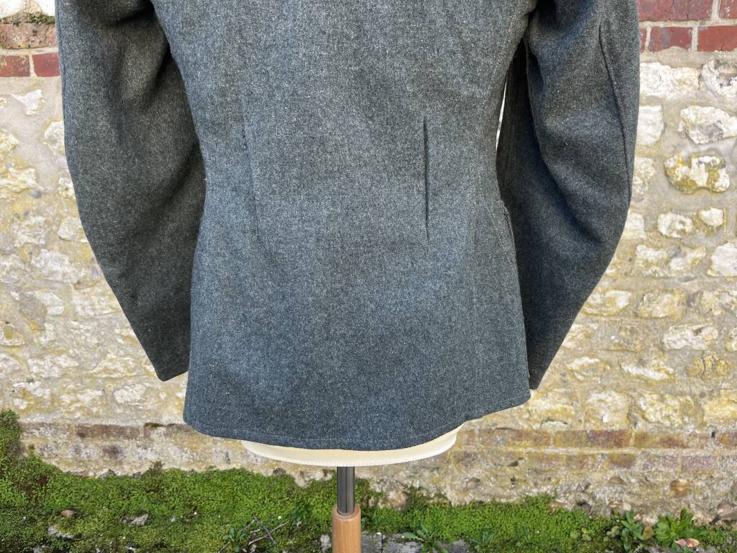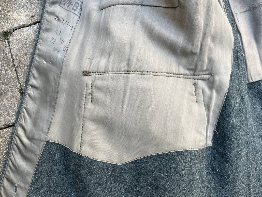 Rare veste modéle 1943 pour tenue de campagne d un officier de l infanterie de la Heer . Veste modele 1943 de dotation pour la troupe modifiée pour officier . Conformément au réglement cette veste a été fournie par le corps de troupe a l officier pour sa tenue de campagne . Veste en drap vert de' type ortie ' ( drap d importation italien ), fermeture frontale a six boutons . Quatre poches sans plis watteau . Boutons en fer grenelé mdle 1943 peints en gris . Col en drap de fond , litzen en cannetille argent , liseré blanc . Aigle de poitrine en cannetille argent . Pattes d epaules du modéle a rabat , liseré blanc , grade de sous lieutenant ( leutnant ) . Ruban croix de fer deuxième classe 1939 cousu a la boutonnière . . Passants en fil de coton pour le port de deux badges de poitrine . Cette vareuse est totalement montée d origine . Intéreur doublé en satinette grise , marquage taille et datée F44 . Tampon SS BW provenant d une chute de satinette dans laquelle la vareuse a été confectionnée !!! . Largeur épaules 44 cm , longueur 75 cm , manche 60 cm . Drap trés frais , veste legerement portée en parfait état Rare veste de combat d un chef de section de l infanterie 1944/45 Ref 21521