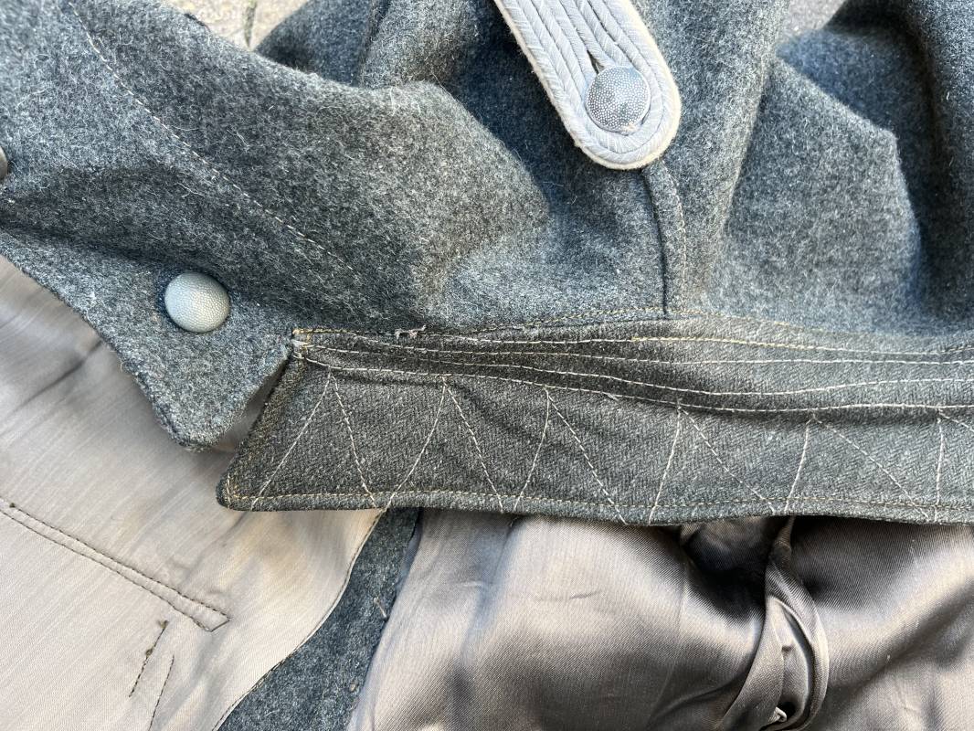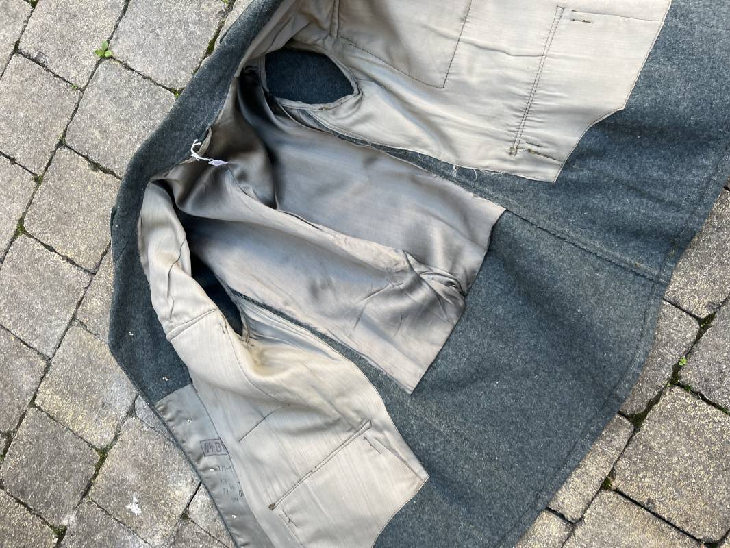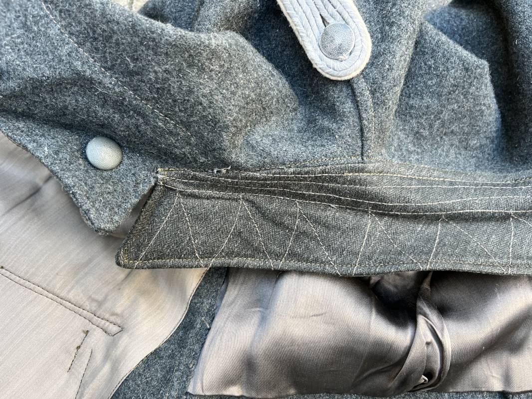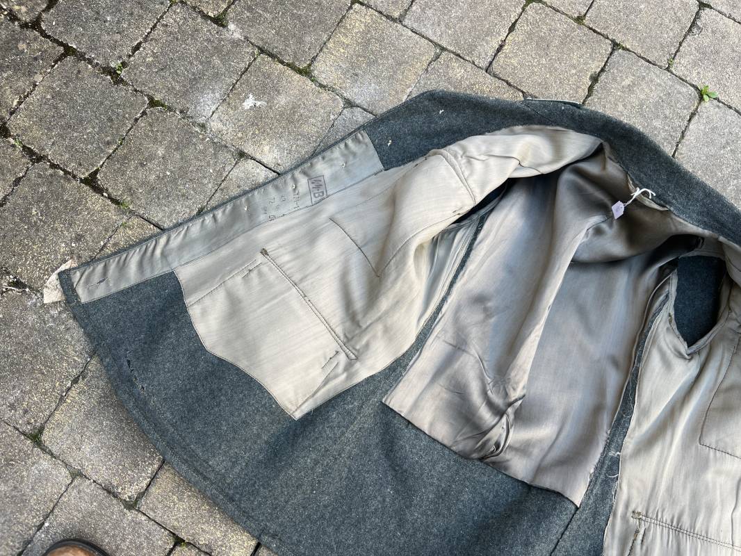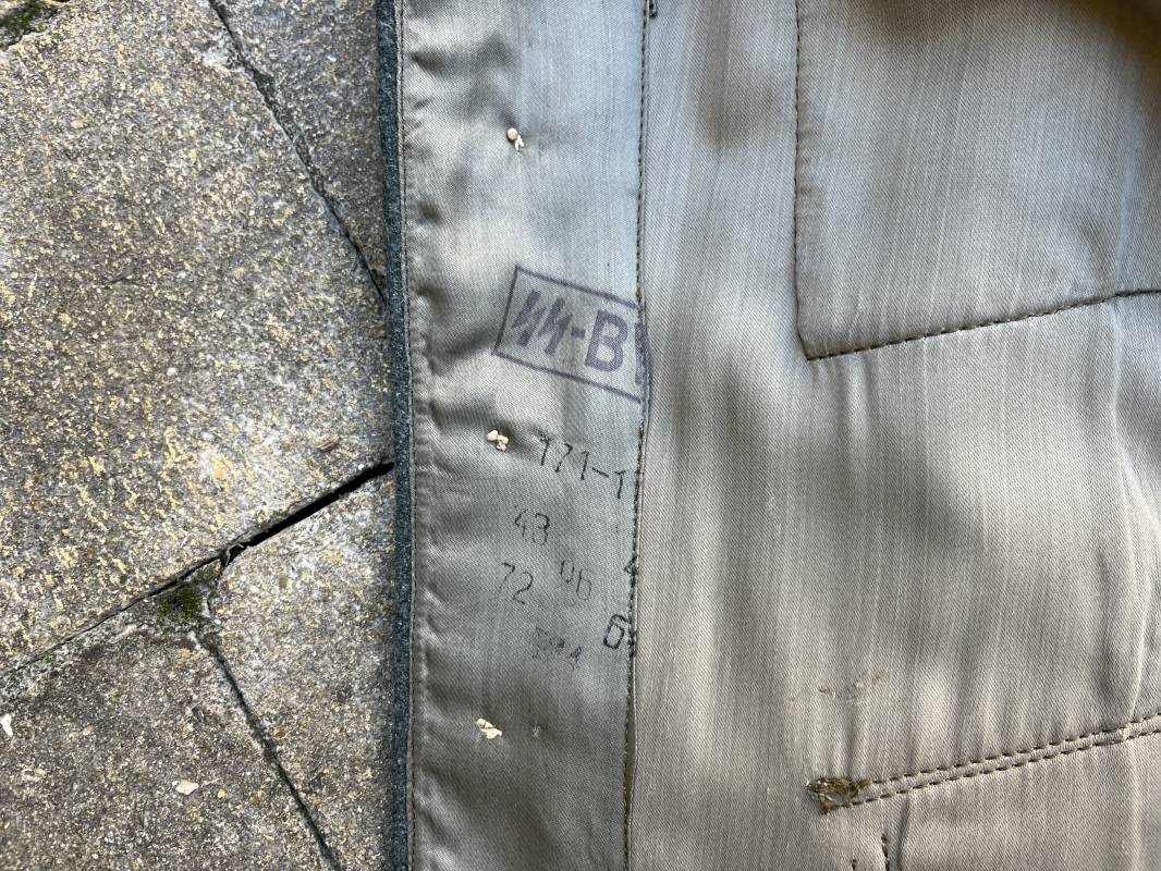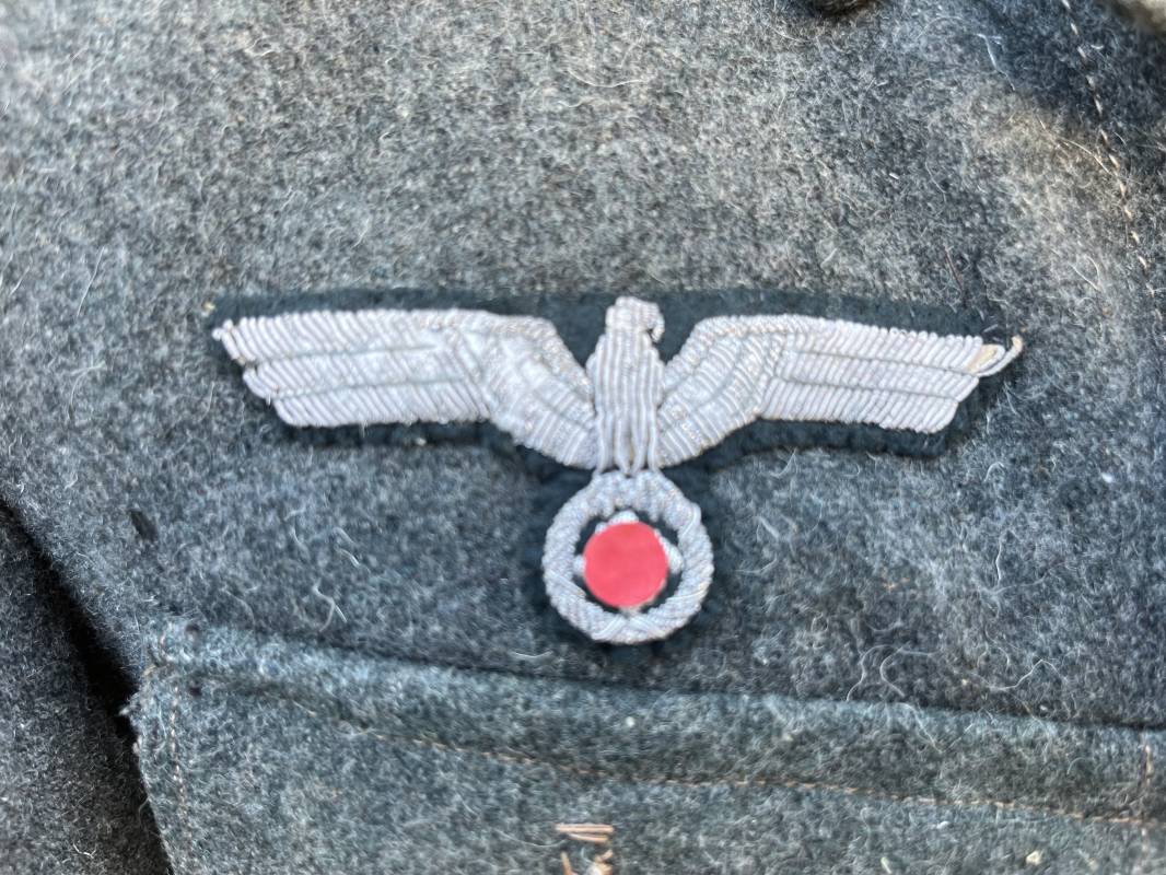 Rare veste modéle 1943 pour tenue de campagne d un officier de l infanterie de la Heer . Veste modele 1943 de dotation pour la troupe modifiée pour officier . Conformément au réglement cette veste a été fournie par le corps de troupe a l officier pour sa tenue de campagne . Veste en drap vert de' type ortie ' ( drap d importation italien ), fermeture frontale a six boutons . Quatre poches sans plis watteau . Boutons en fer grenelé mdle 1943 peints en gris . Col en drap de fond , litzen en cannetille argent , liseré blanc . Aigle de poitrine en cannetille argent . Pattes d epaules du modéle a rabat , liseré blanc , grade de sous lieutenant ( leutnant ) . Ruban croix de fer deuxième classe 1939 cousu a la boutonnière . . Passants en fil de coton pour le port de deux badges de poitrine . Cette vareuse est totalement montée d origine . Intéreur doublé en satinette grise , marquage taille et datée F44 . Tampon SS BW provenant d une chute de satinette dans laquelle la vareuse a été confectionnée !!! . Largeur épaules 44 cm , longueur 75 cm , manche 60 cm . Drap trés frais , veste legerement portée en parfait état Rare veste de combat d un chef de section de l infanterie 1944/45 Ref 21521