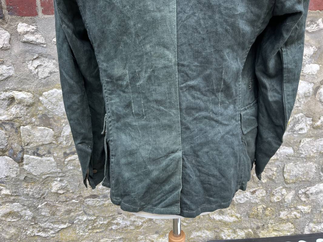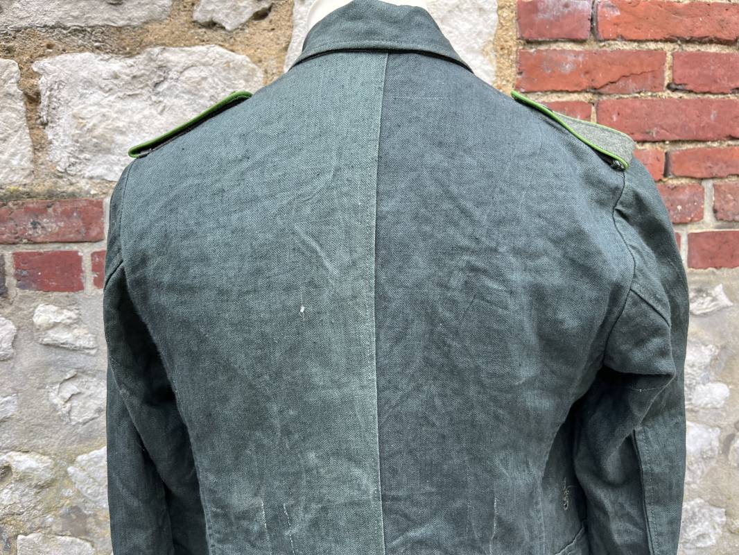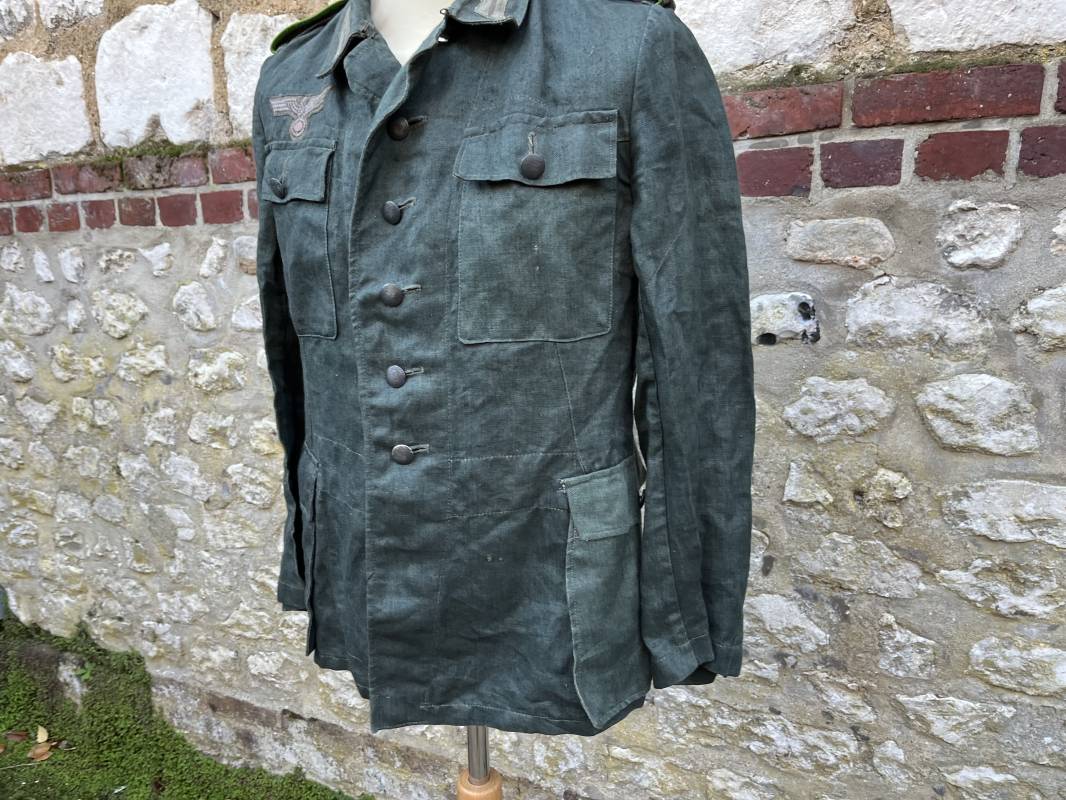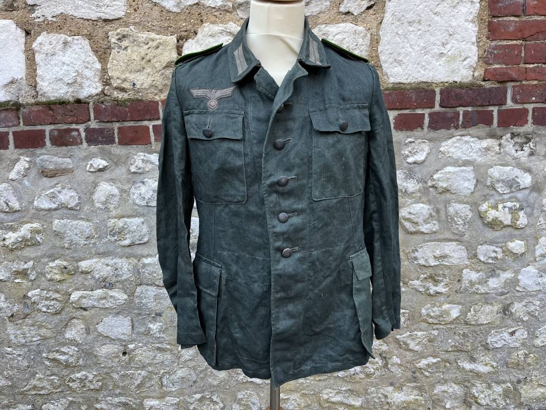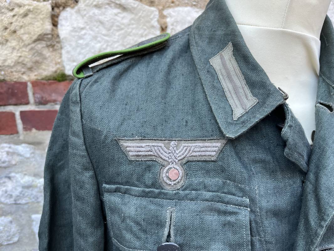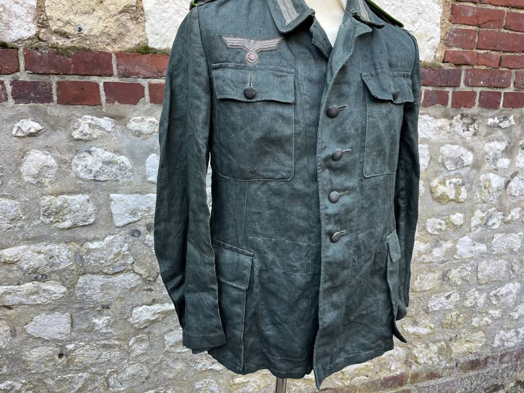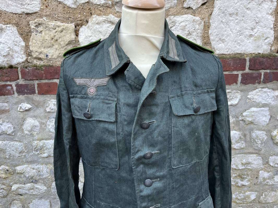 Superbe veste troupe modéle 1943 en treillis vert d'unsoldat panzer grenadier de la Heer . Cette veste en superbe état est entièrement montée d 'origine . Fermeture frontale à six boutons amovibles , bouton métalliques grenelé peints en vert foncé ( modéle 1943 ) , Quatre poche à rabats droits boutonnés . Col avec coins de col ( litzen) modéle 1943 toute arme . Aigle de poitrine troupe du modéle 1943 brodé en coton gris . Les insignes sont montés d 'origine a la confection de la veste . Pattes d 'épaules à rabats modéle 1943 , liseré vert pré des panzer grenadier de la Heer . Tous les boutons sont montés d 'origine . Intérieur pour partie doublé satinette grise . Marquage encre des taille Marquage code fabricant Rbnr M 1943 Largeur épaules 42 cm , longueur 70 cm , manche 62 cm . Superbe veste légérement portée en superbe état . Aucun déaut . Uniforme définitif en collection . 1943/45 Ref 17015