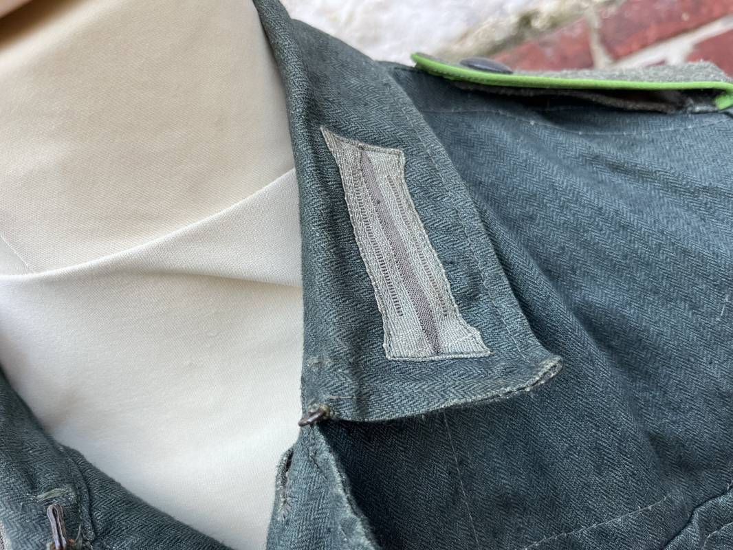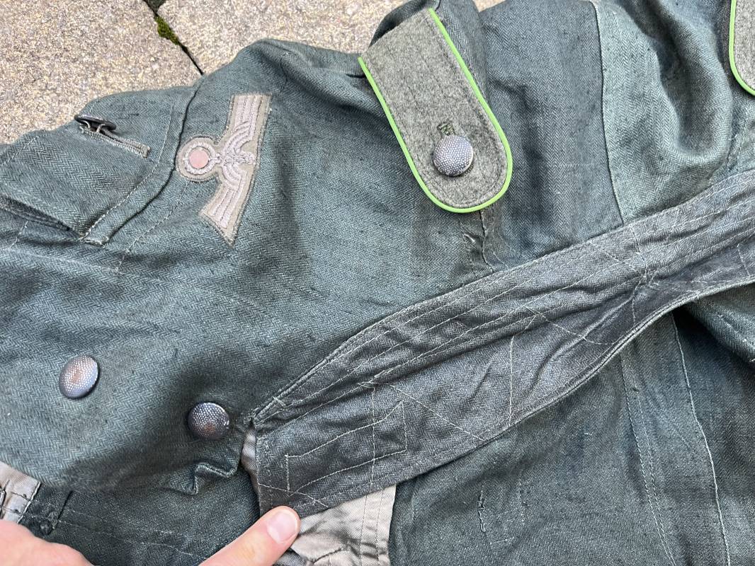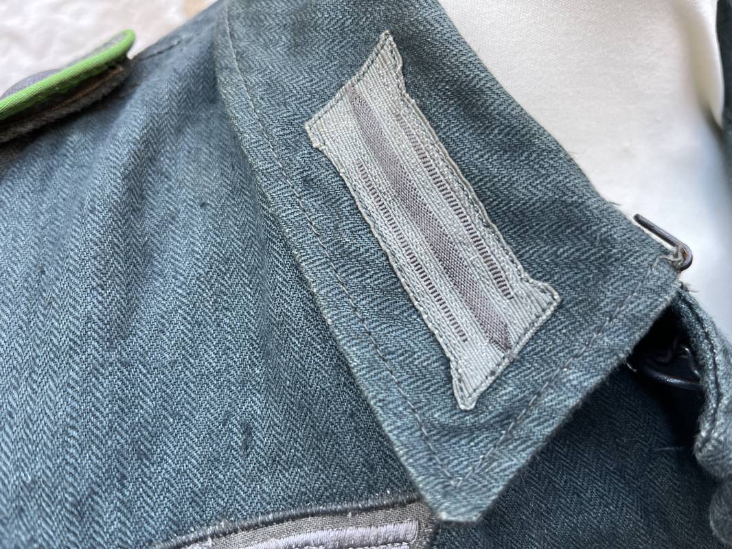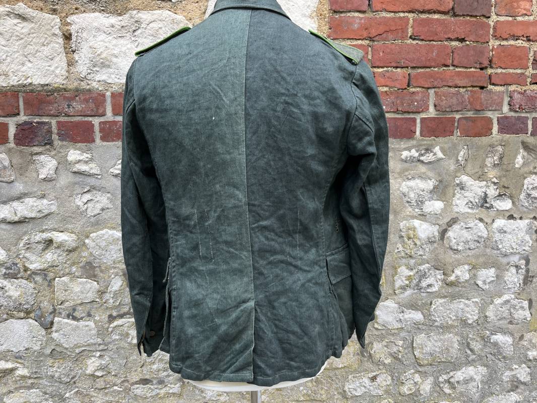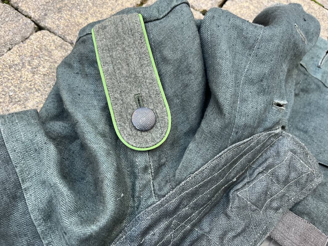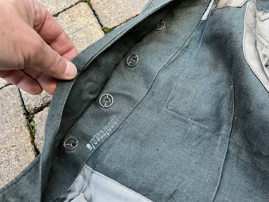 Superbe veste troupe modéle 1943 en treillis vert d'unsoldat panzer grenadier de la Heer . Cette veste en superbe état est entièrement montée d 'origine . Fermeture frontale à six boutons amovibles , bouton métalliques grenelé peints en vert foncé ( modéle 1943 ) , Quatre poche à rabats droits boutonnés . Col avec coins de col ( litzen) modéle 1943 toute arme . Aigle de poitrine troupe du modéle 1943 brodé en coton gris . Les insignes sont montés d 'origine a la confection de la veste . Pattes d 'épaules à rabats modéle 1943 , liseré vert pré des panzer grenadier de la Heer . Tous les boutons sont montés d 'origine . Intérieur pour partie doublé satinette grise . Marquage encre des taille Marquage code fabricant Rbnr M 1943 Largeur épaules 42 cm , longueur 70 cm , manche 62 cm . Superbe veste légérement portée en superbe état . Aucun déaut . Uniforme définitif en collection . 1943/45 Ref 17015