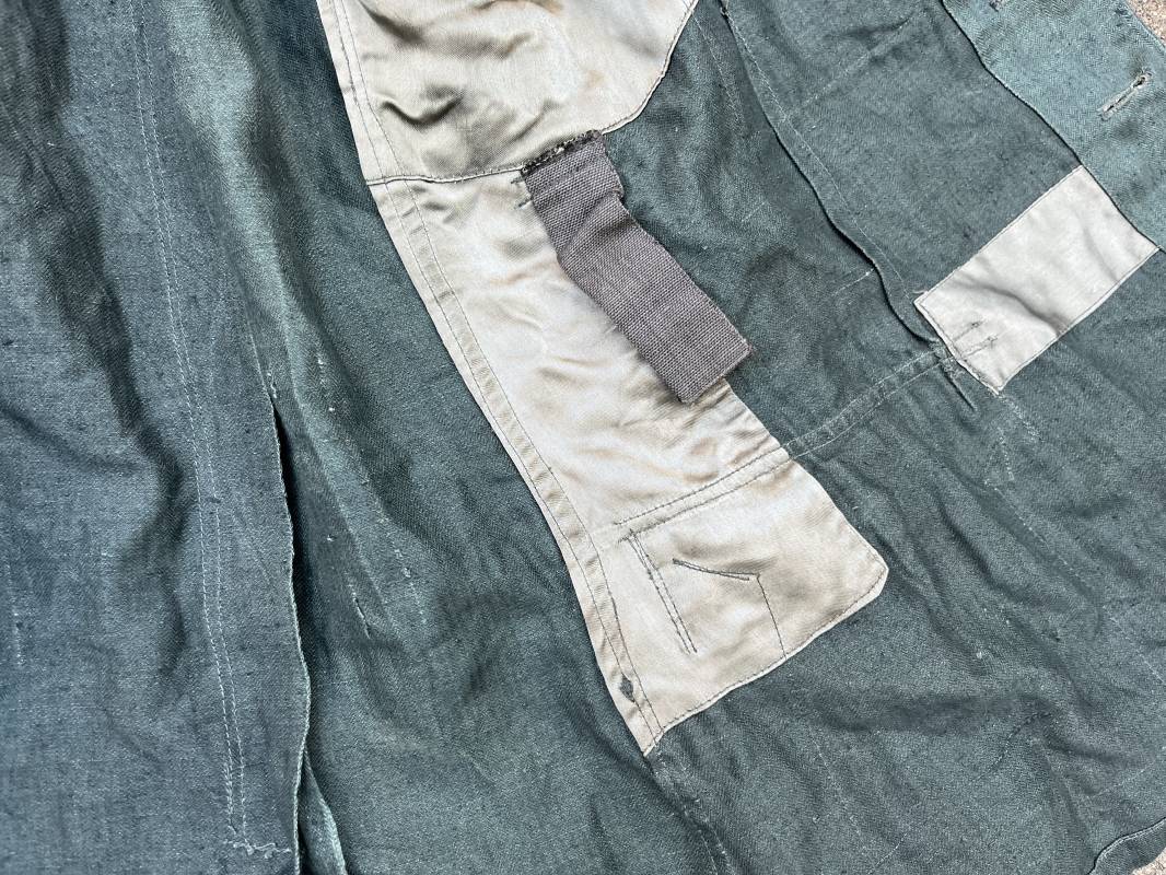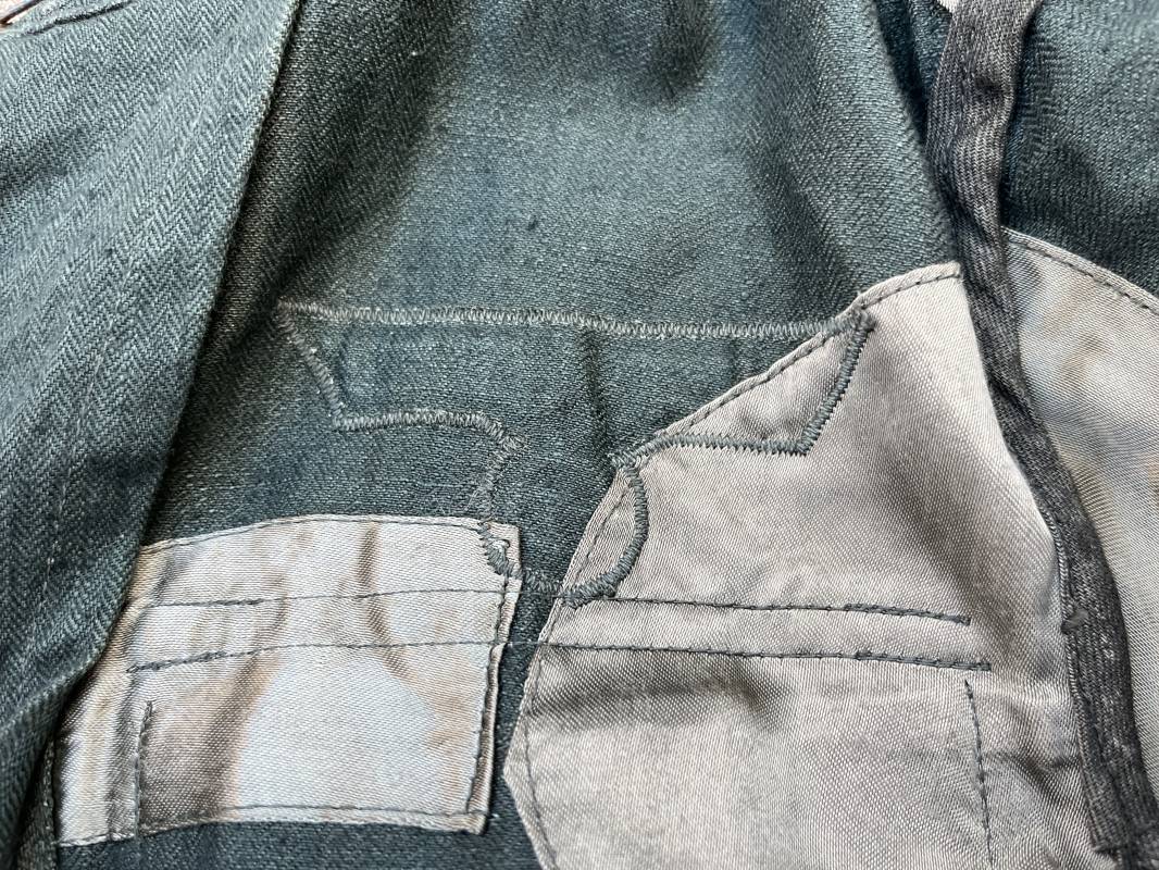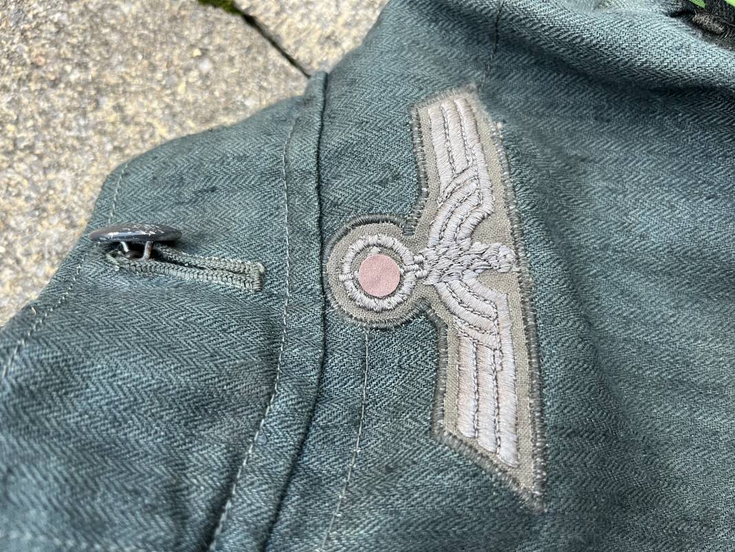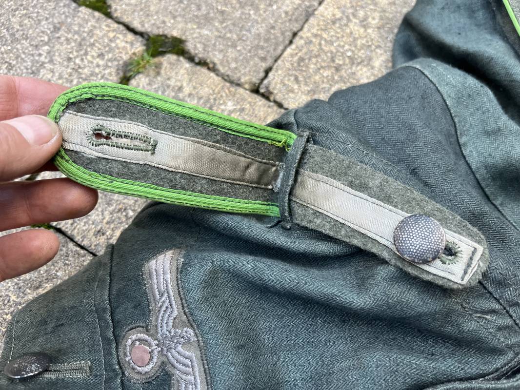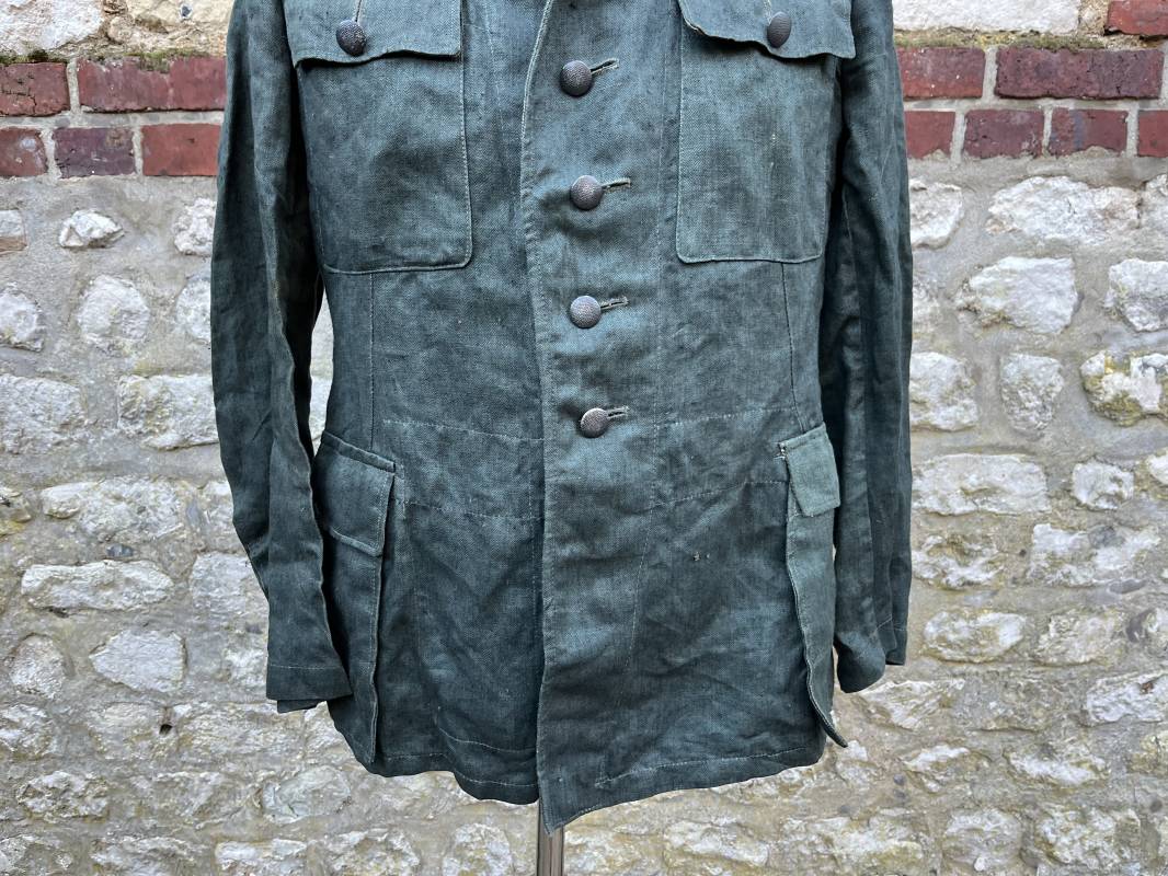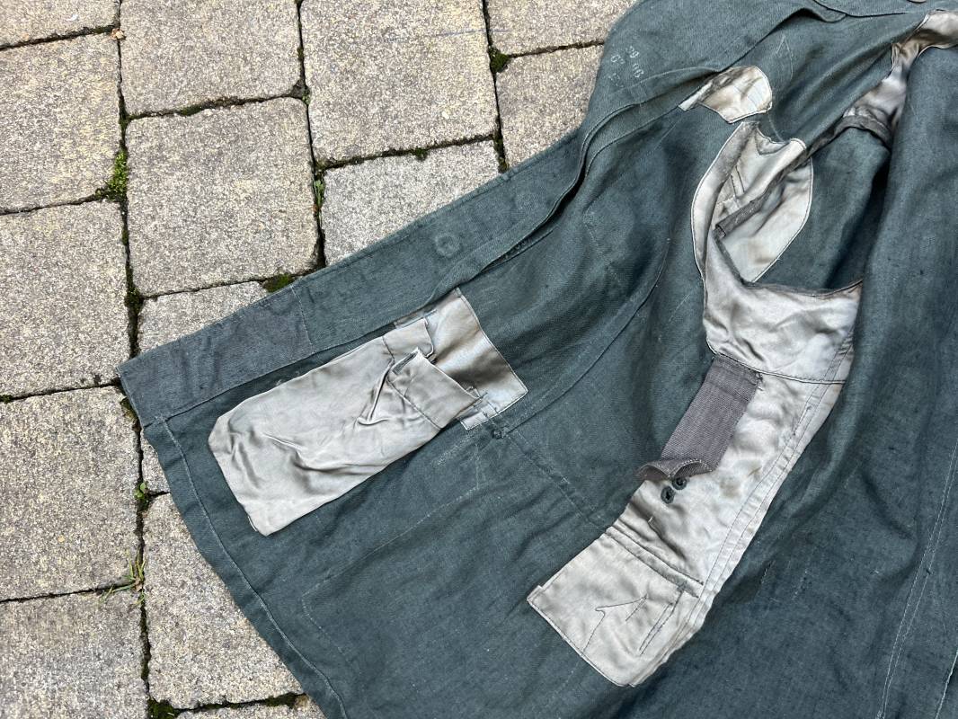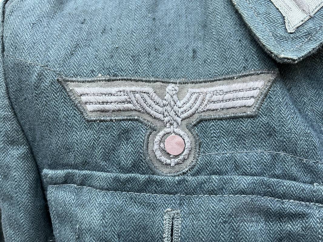 Superbe veste troupe modéle 1943 en treillis vert d'unsoldat panzer grenadier de la Heer . Cette veste en superbe état est entièrement montée d 'origine . Fermeture frontale à six boutons amovibles , bouton métalliques grenelé peints en vert foncé ( modéle 1943 ) , Quatre poche à rabats droits boutonnés . Col avec coins de col ( litzen) modéle 1943 toute arme . Aigle de poitrine troupe du modéle 1943 brodé en coton gris . Les insignes sont montés d 'origine a la confection de la veste . Pattes d 'épaules à rabats modéle 1943 , liseré vert pré des panzer grenadier de la Heer . Tous les boutons sont montés d 'origine . Intérieur pour partie doublé satinette grise . Marquage encre des taille Marquage code fabricant Rbnr M 1943 Largeur épaules 42 cm , longueur 70 cm , manche 62 cm . Superbe veste légérement portée en superbe état . Aucun déaut . Uniforme définitif en collection . 1943/45 Ref 17015