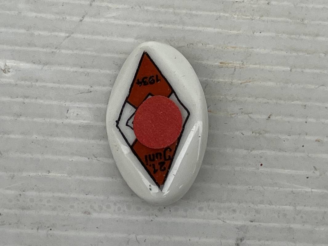 Bon badge en porcelaine de la Jeunesse Hitlérienne Dimensions 28X18 mm .Marque 21 Juni 1934 Porcelaine en parfait état . Epingle de fixation au dos . Légérement porté en parfait état 1935/45 Ref 21326