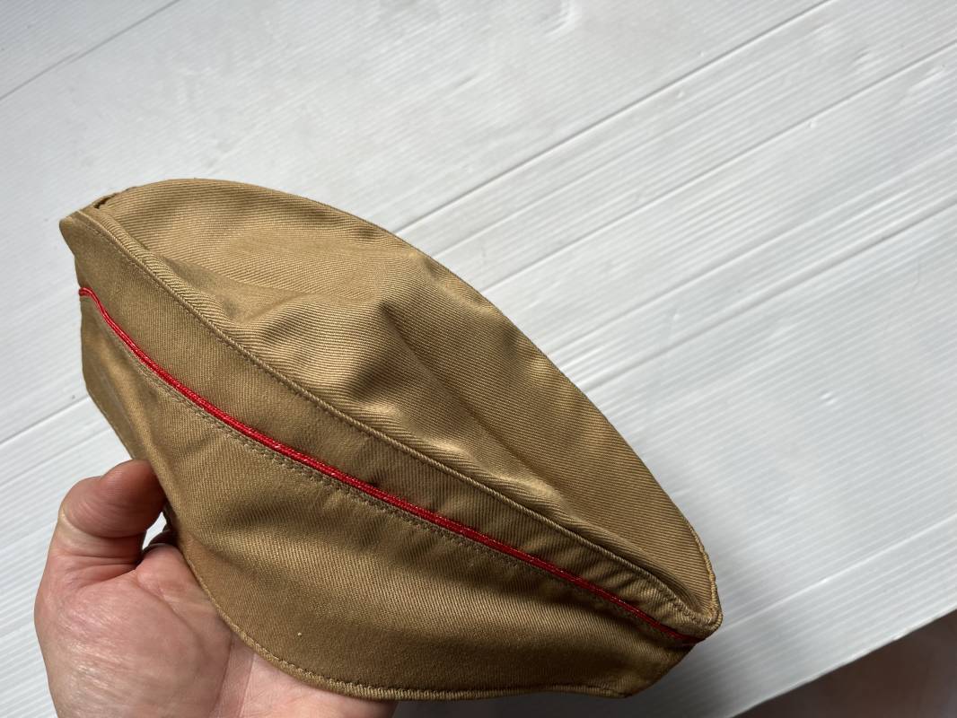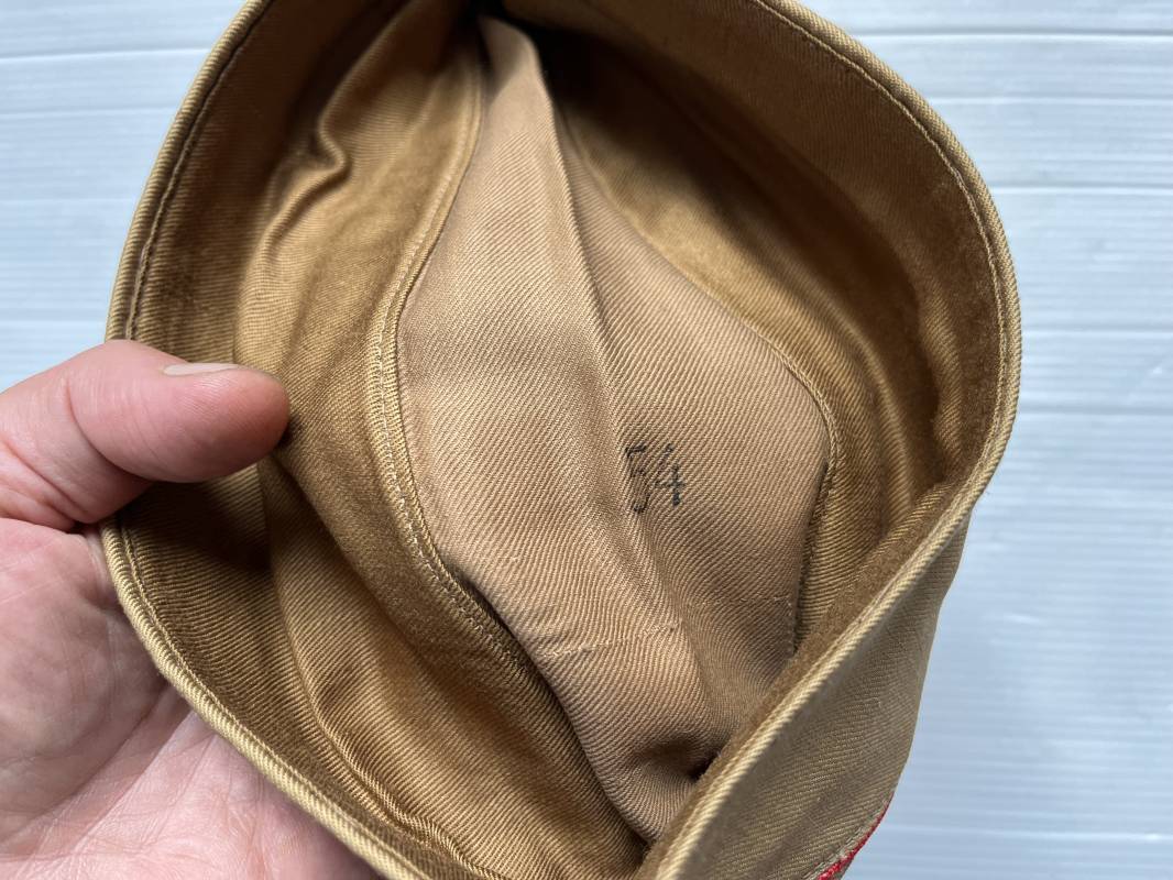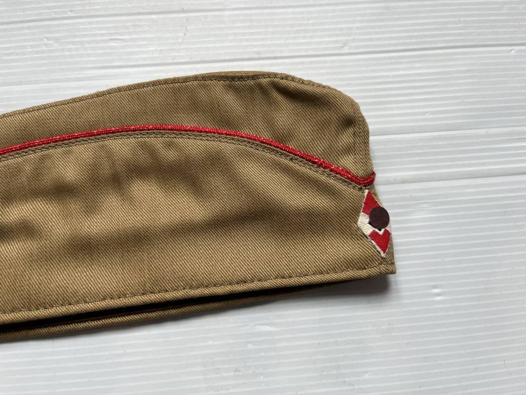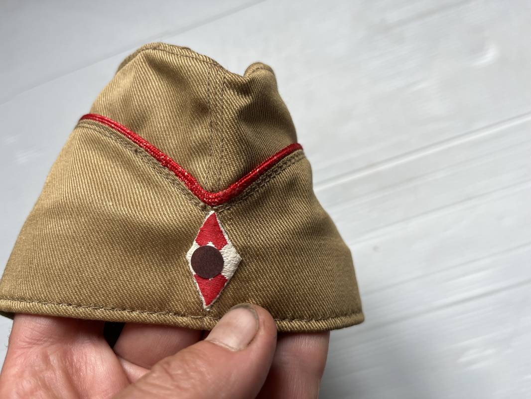 Trés beau calot d'été de la Jeunesse Hitlérienne ( sommer mutze ) . Calot en coton beige , liseré rouge . Insigne losange de la HJ tissé bevo cousu d'origine sur le devant , Intérieur doublé en satinette brune , bandeau de coiffe intérieure en carton cuir sous la doublure . Tampon encre Taille 54 . Calot dans un état quasi neuf . Trés belle coiffe provenance directe de famille en Allemagne Jamais touché . Coiffure définitive en collection HJ/DJ 1935/45 Ref 22084