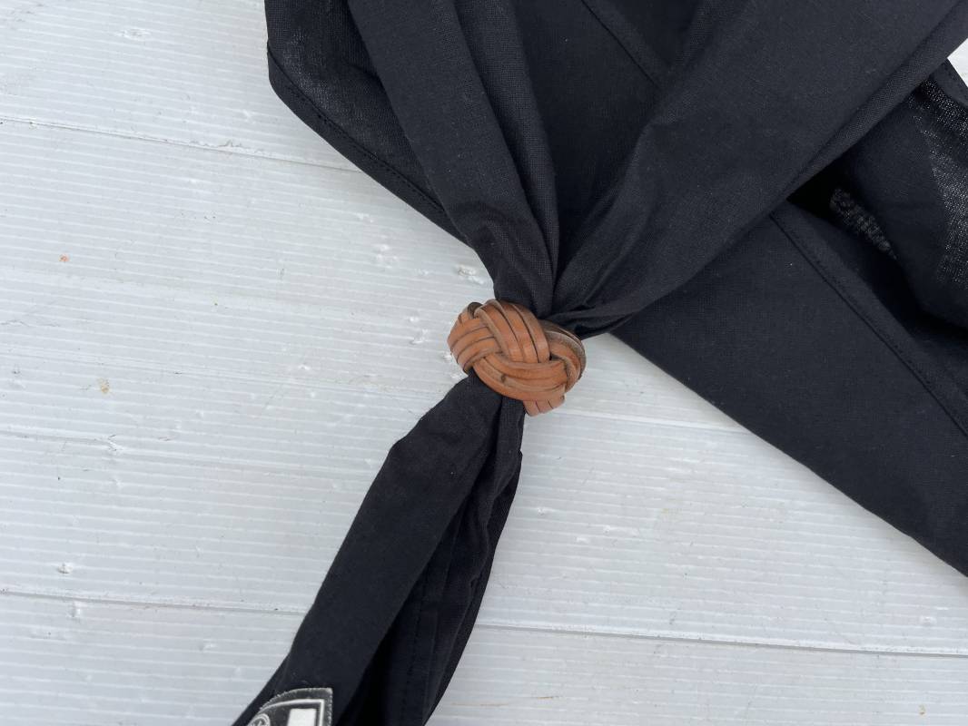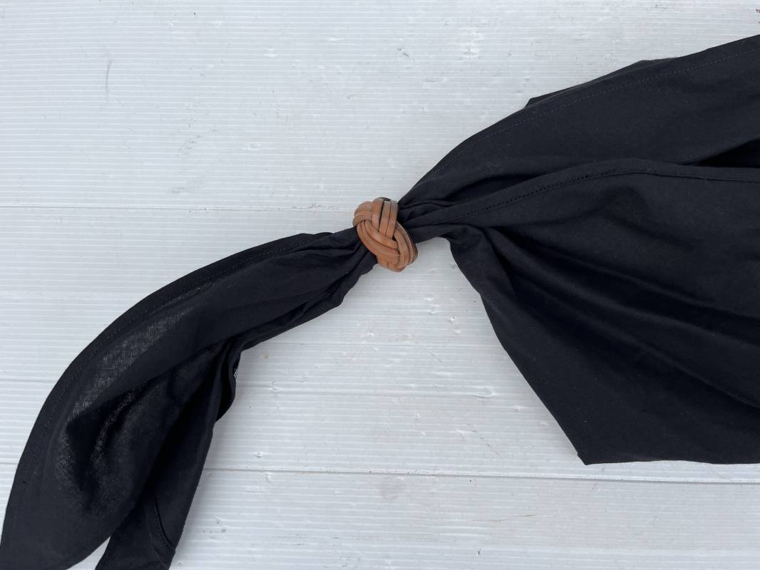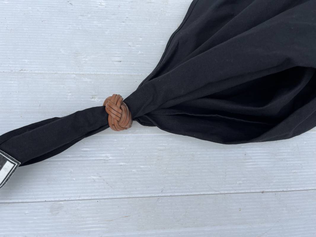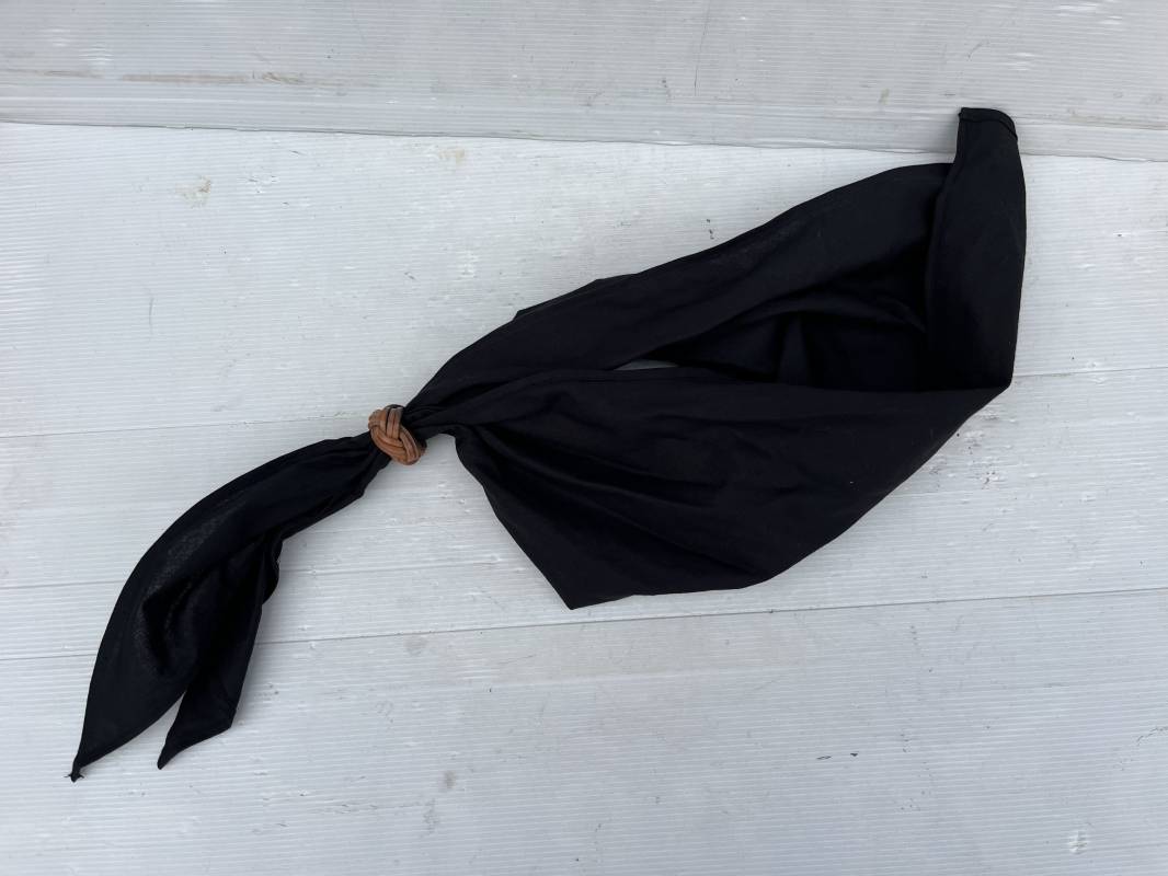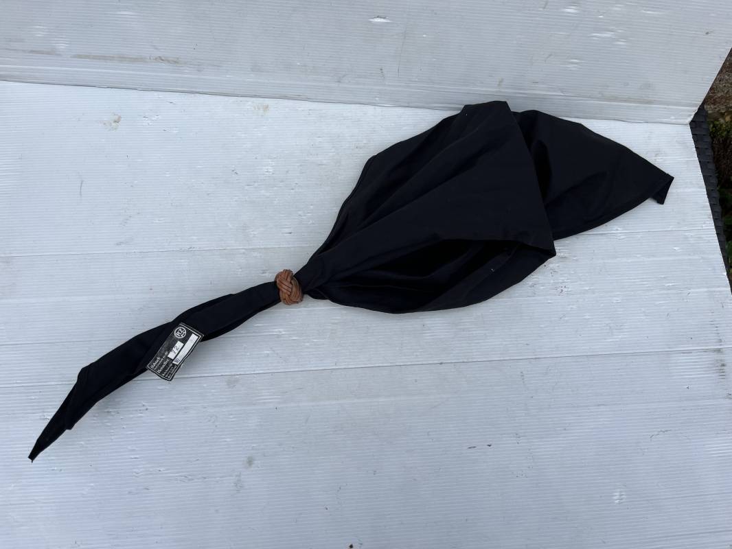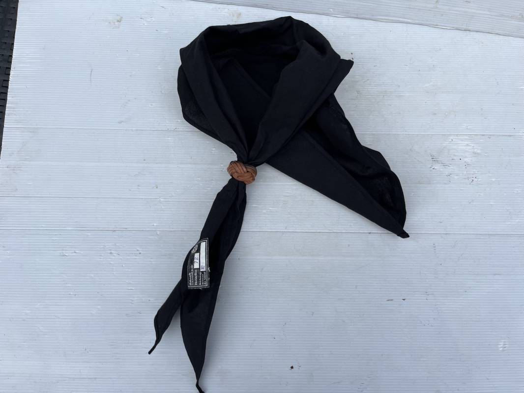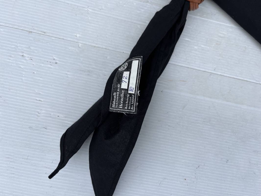 Très beau foulard et noeud en cuir marron de la Jeunesse Hitlérienne. Foulard en coton noir. Etiquette RZM 'Halstuch' avec code fabricant 72 Noeud tressé en cuir marron clair. Légèrement porté en parfait état 1935/45 ref 20624