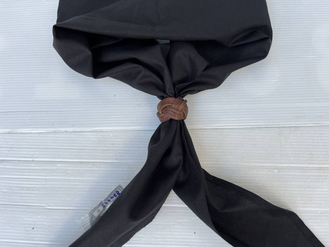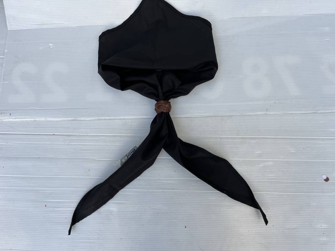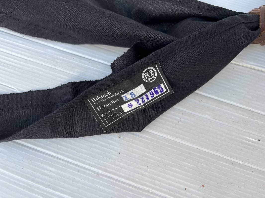 Très beau foulard ( Halstuch ) et noeud en cuir marron de la Jeunesse Hitlérienne. Foulard en coton noir. Noeud tressé en cuir marron . Etiquette fabricant RZM Code fabricant Hersteller 18 . Légèrement porté en parfait état 1935/45 ref 18624