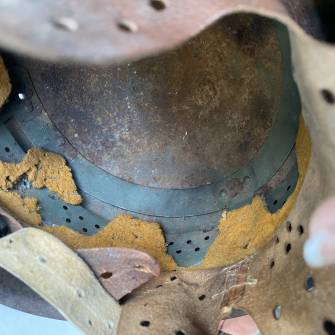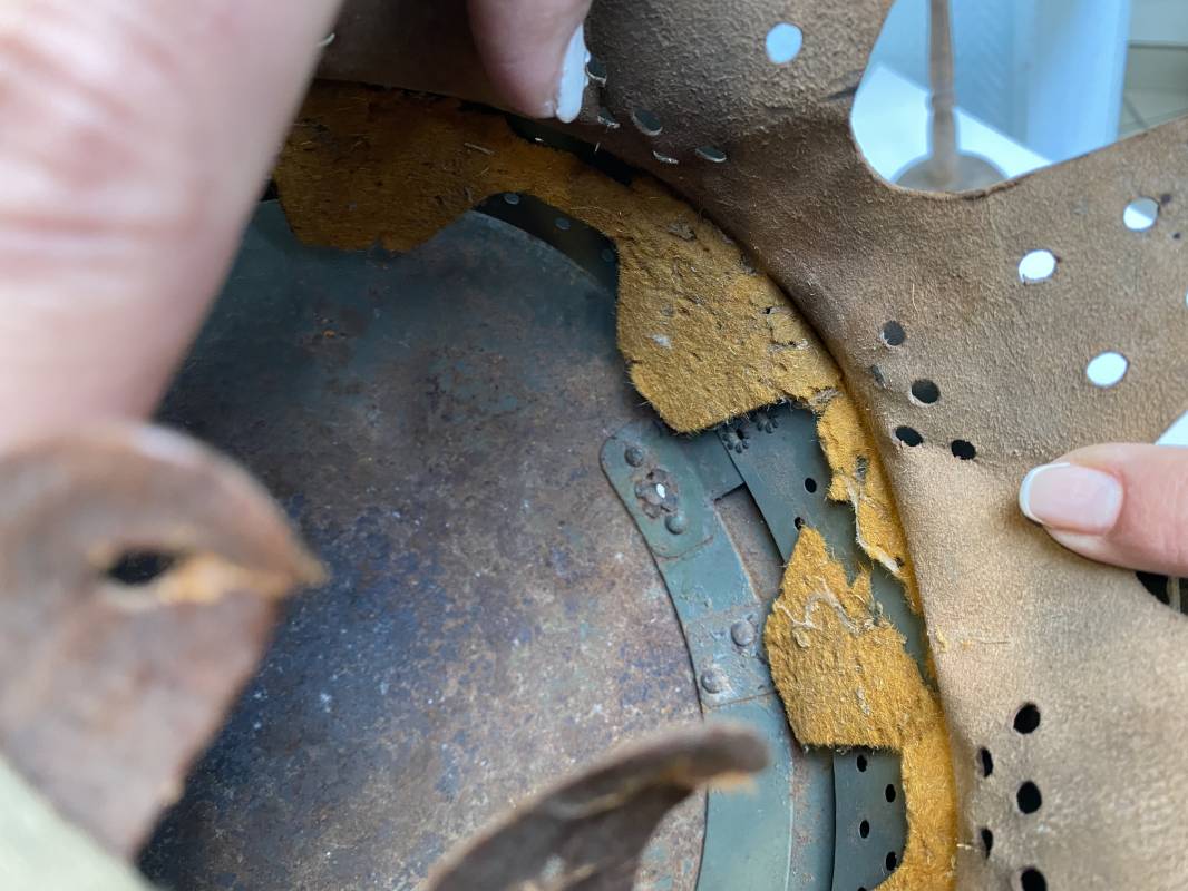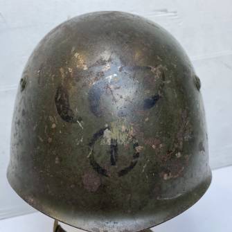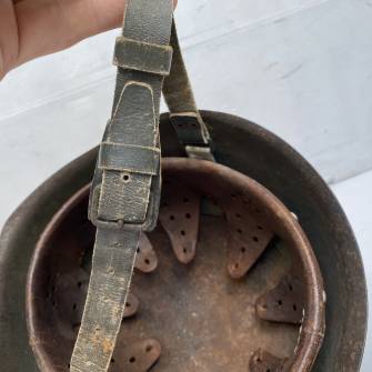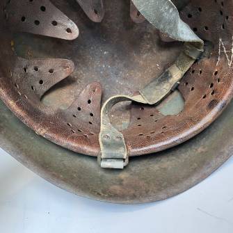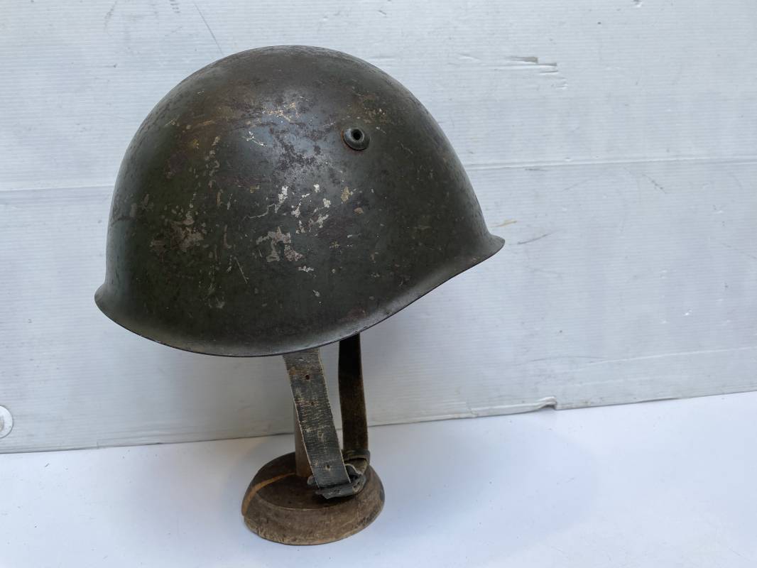 Trés beau casque modéle 1933 de l'infanterie italienne . Casque 100 % nature et totalement intouché trouvé en succession familiale en Corse . Ce casque n'a jamais été en collection . Coque acier avec peinture verte d'origine .Peinture au pochoir sur le devant de la grenade de l'infanterie . Jugulaire en cuir gris clair et boucle métallique à un ardillon . Cuir souple . Coiffe intérieure en cuir marron . Manque le lacet . Marquage taille 58 . Casque porté en bel état . 1939/45 Ref 19023