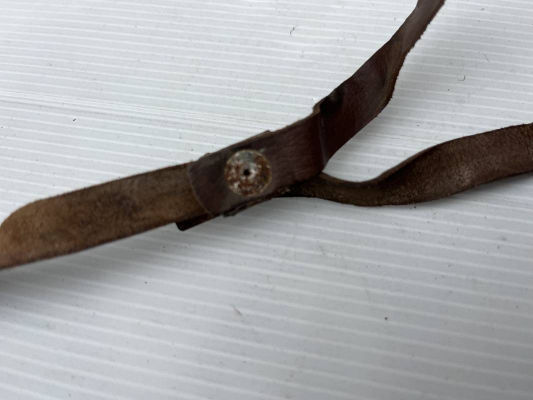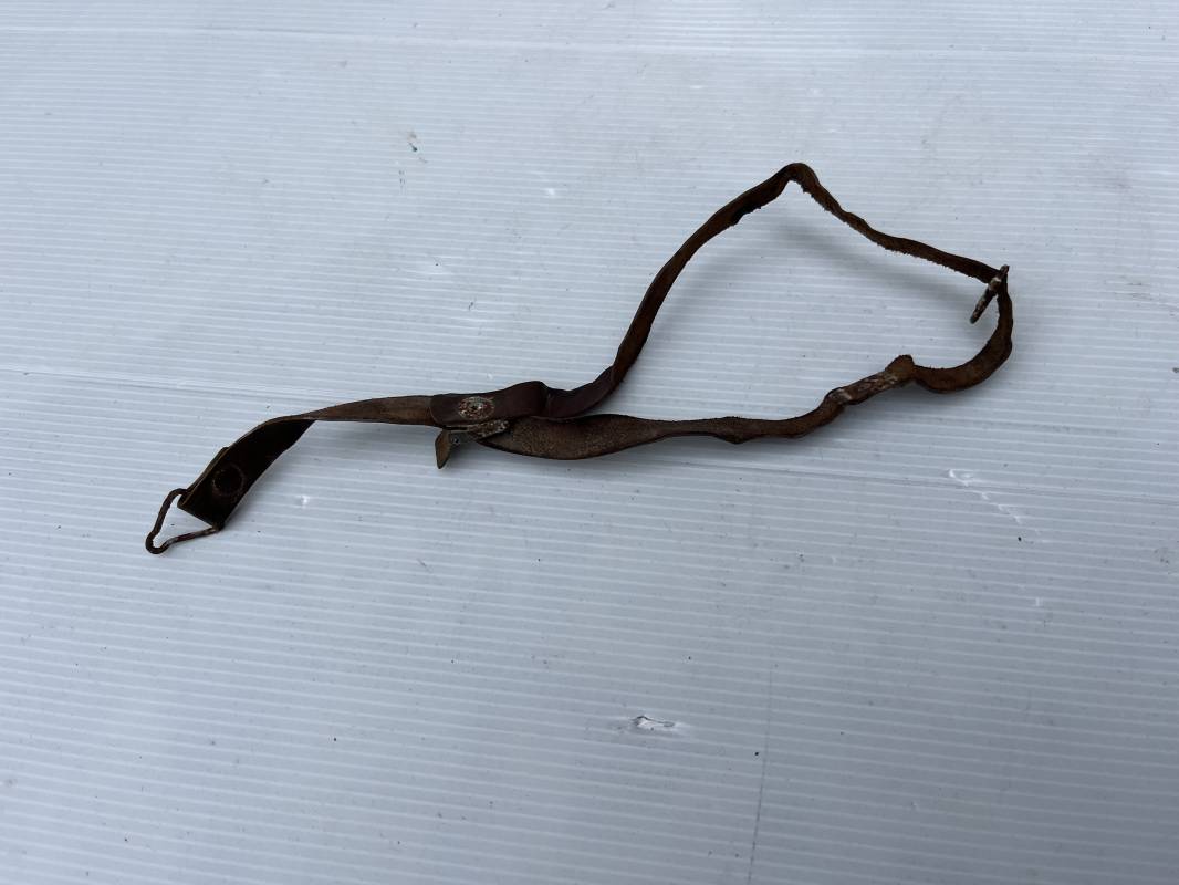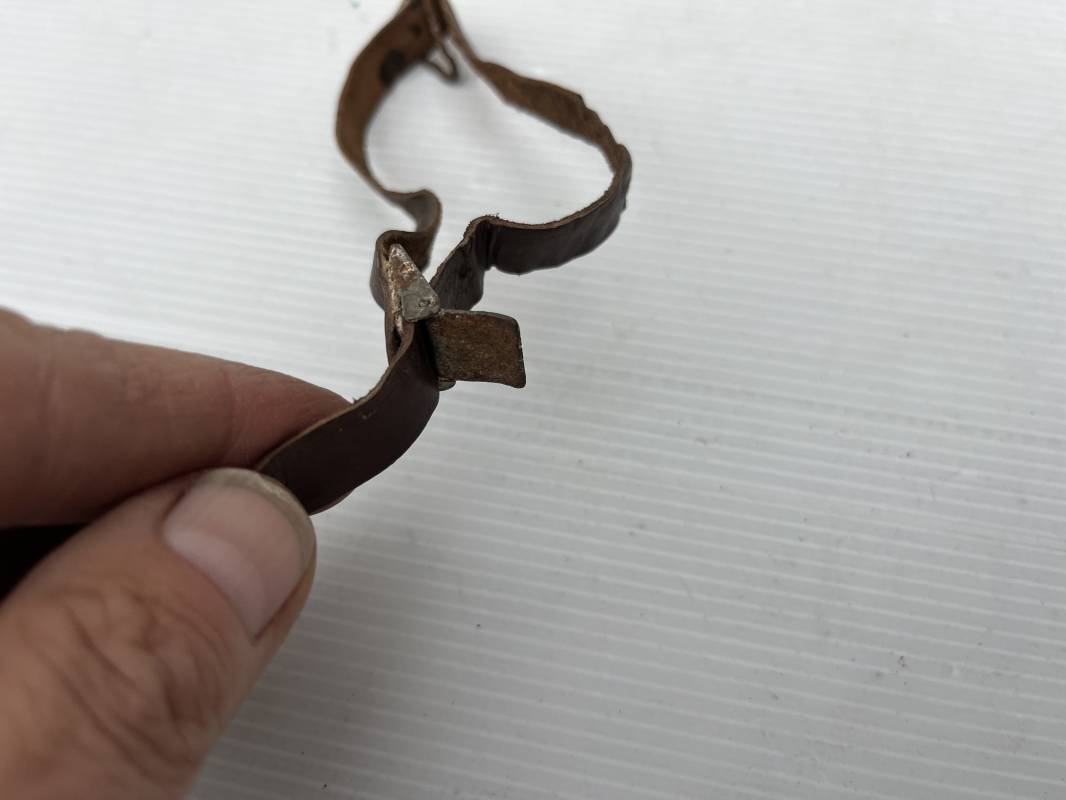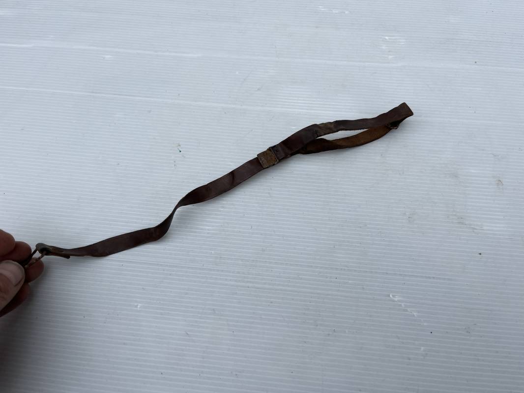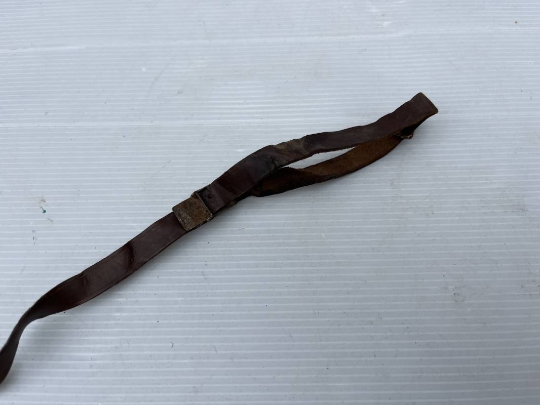 Belle jugulaire de sous casque USM1 ( liner ) en cuir marron . Fabrication 1942/43 . Boucle et rivets en métal .Légeres Traces oxydation sur métal . Passants métallique de fixation . Cuir souple . Parfait état 1942/43 Ref 19604