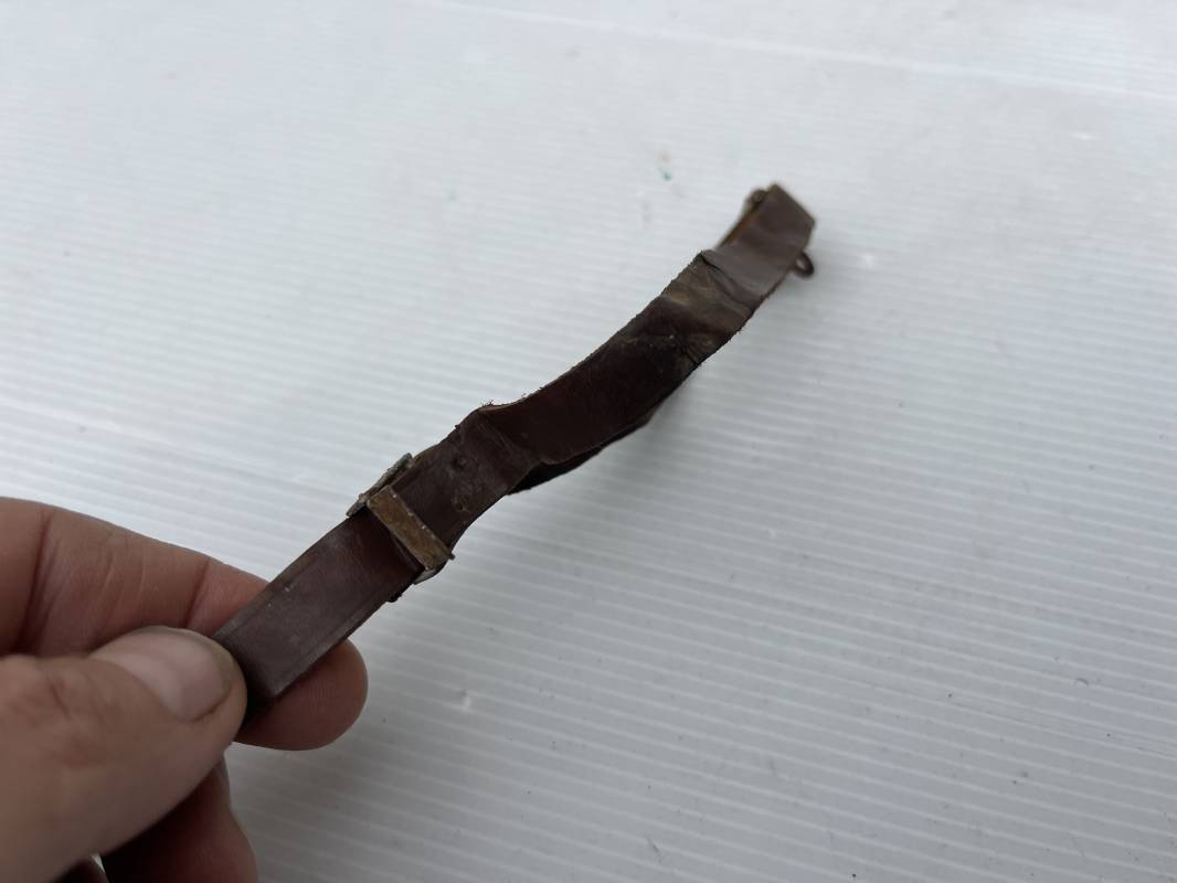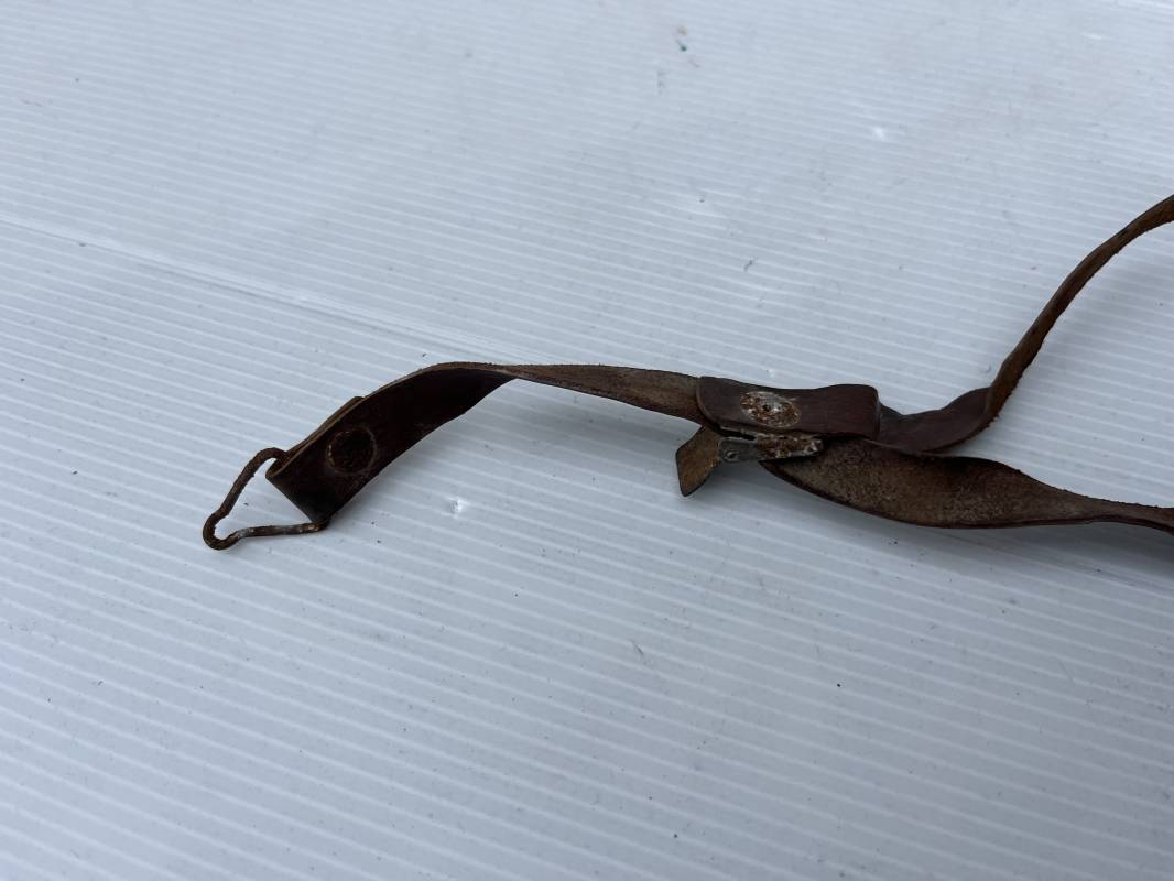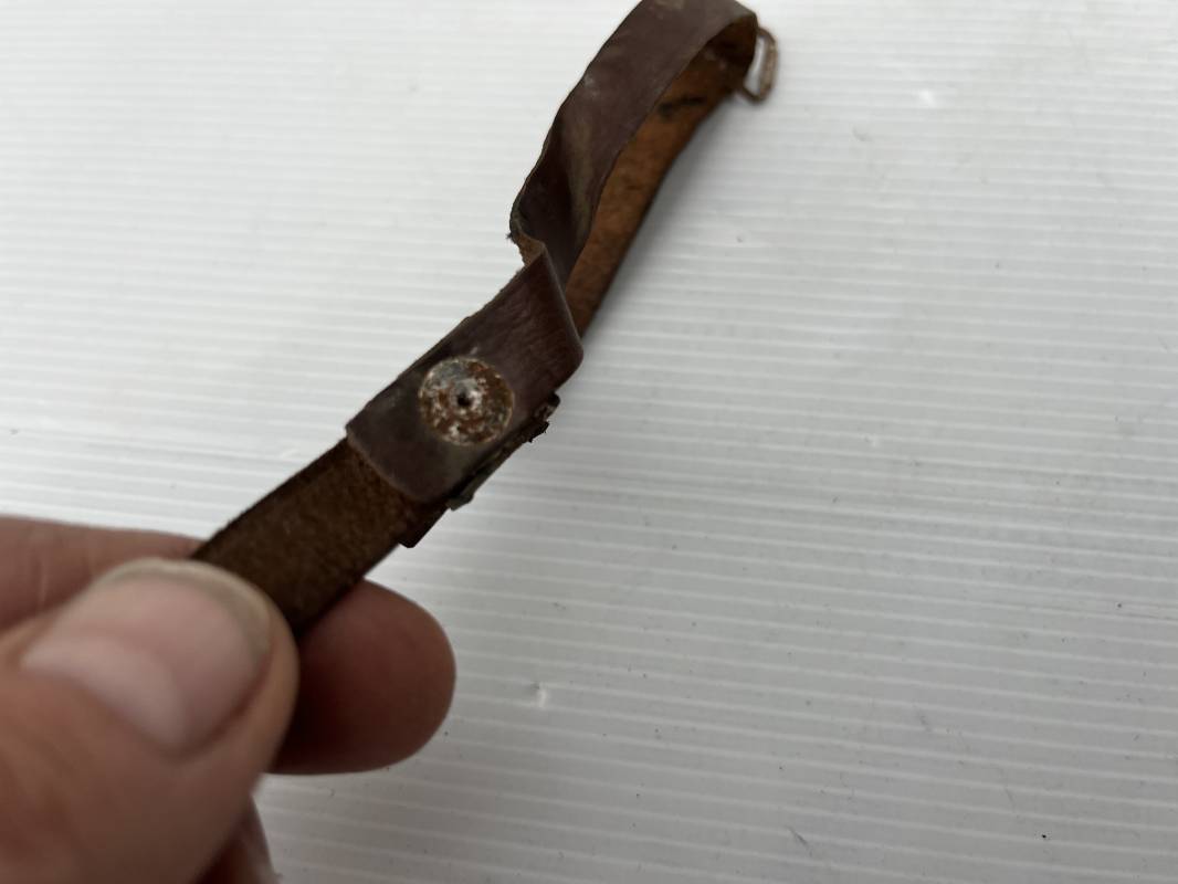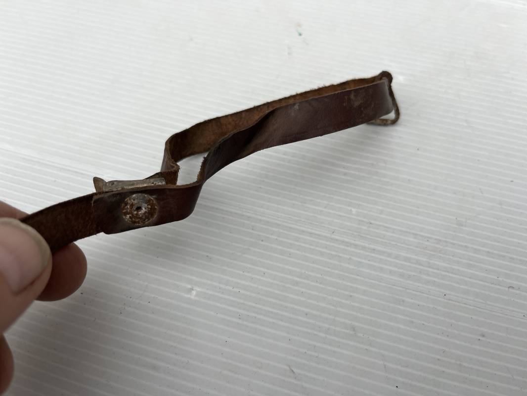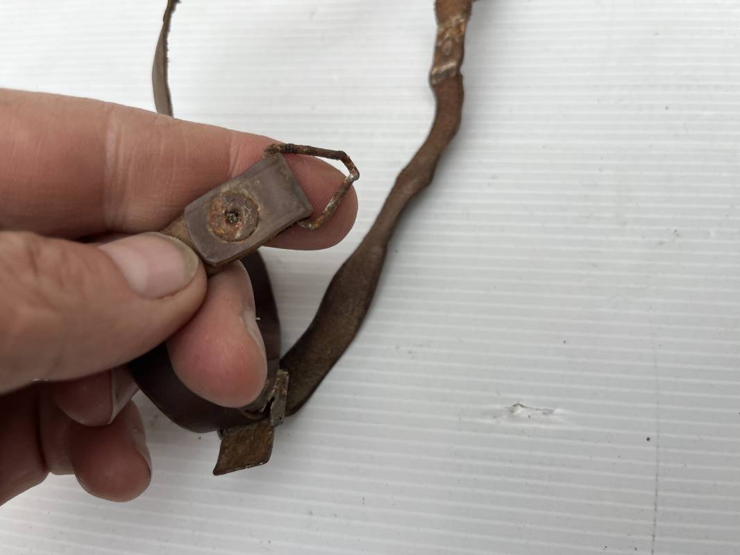 Belle jugulaire de sous casque USM1 ( liner ) en cuir marron . Fabrication 1942/43 . Boucle et rivets en métal .Légeres Traces oxydation sur métal . Passants métallique de fixation . Cuir souple . Parfait état 1942/43 Ref 19604
