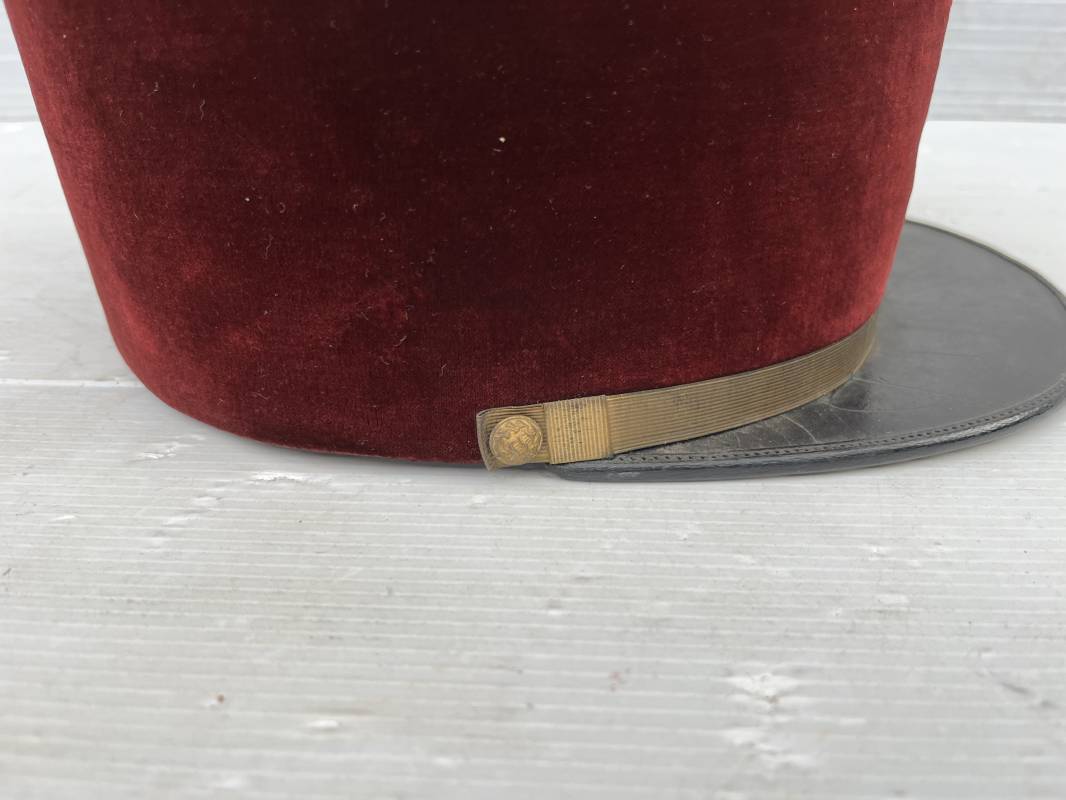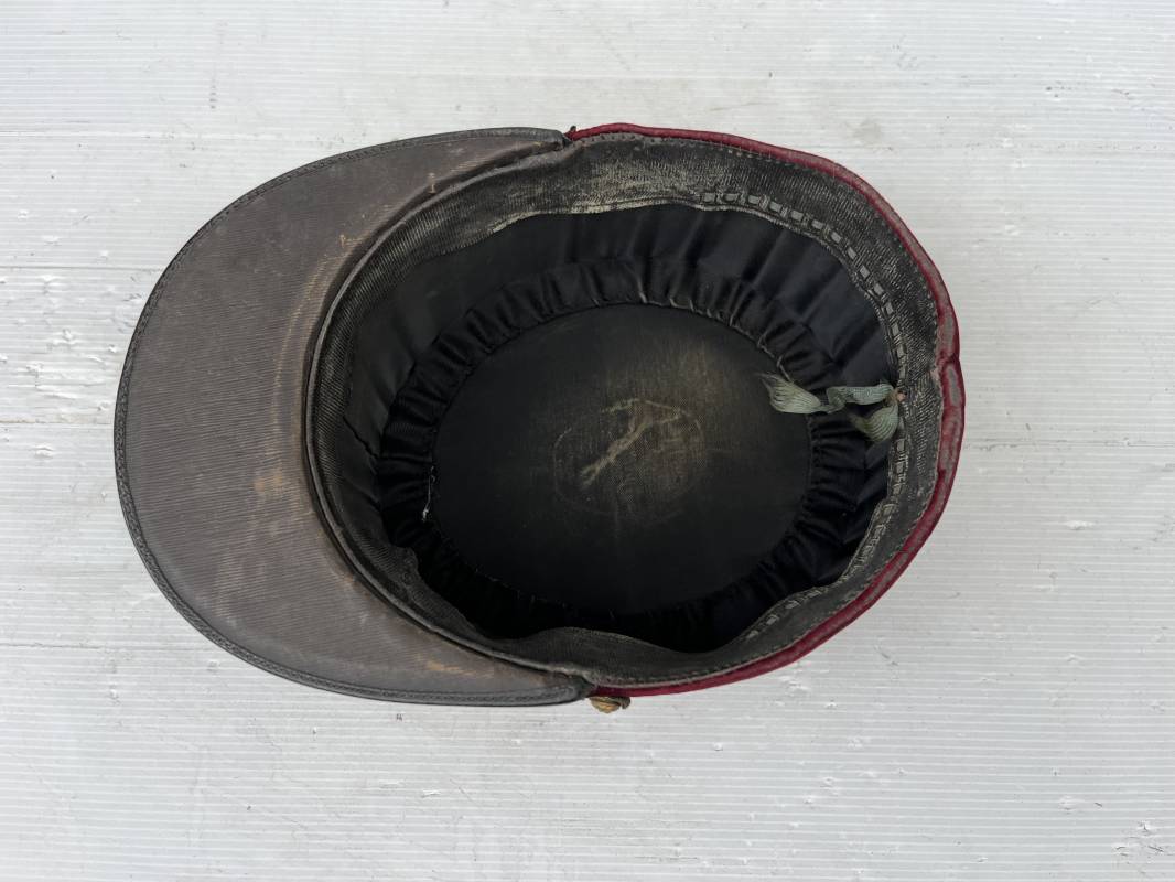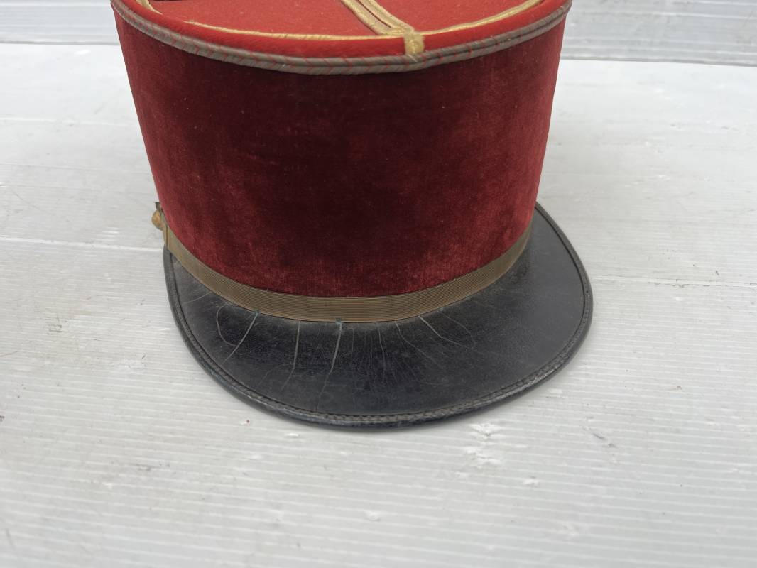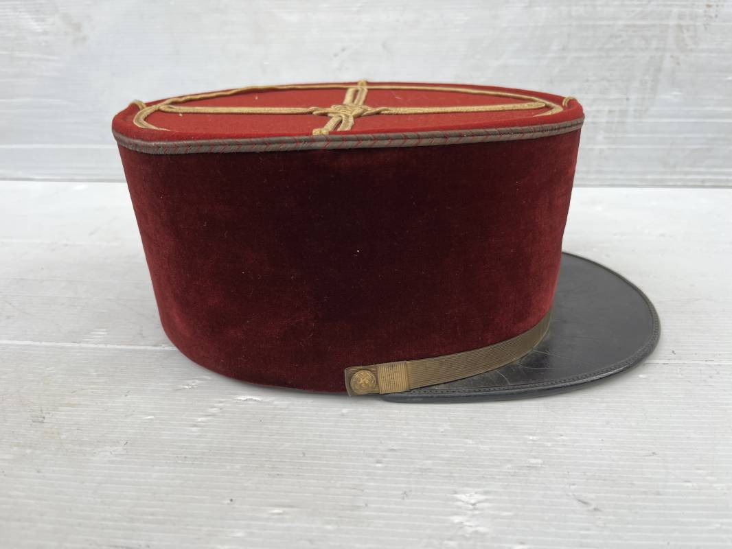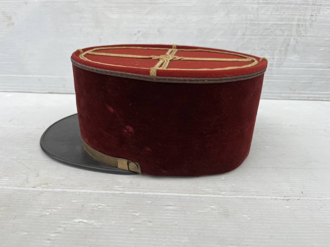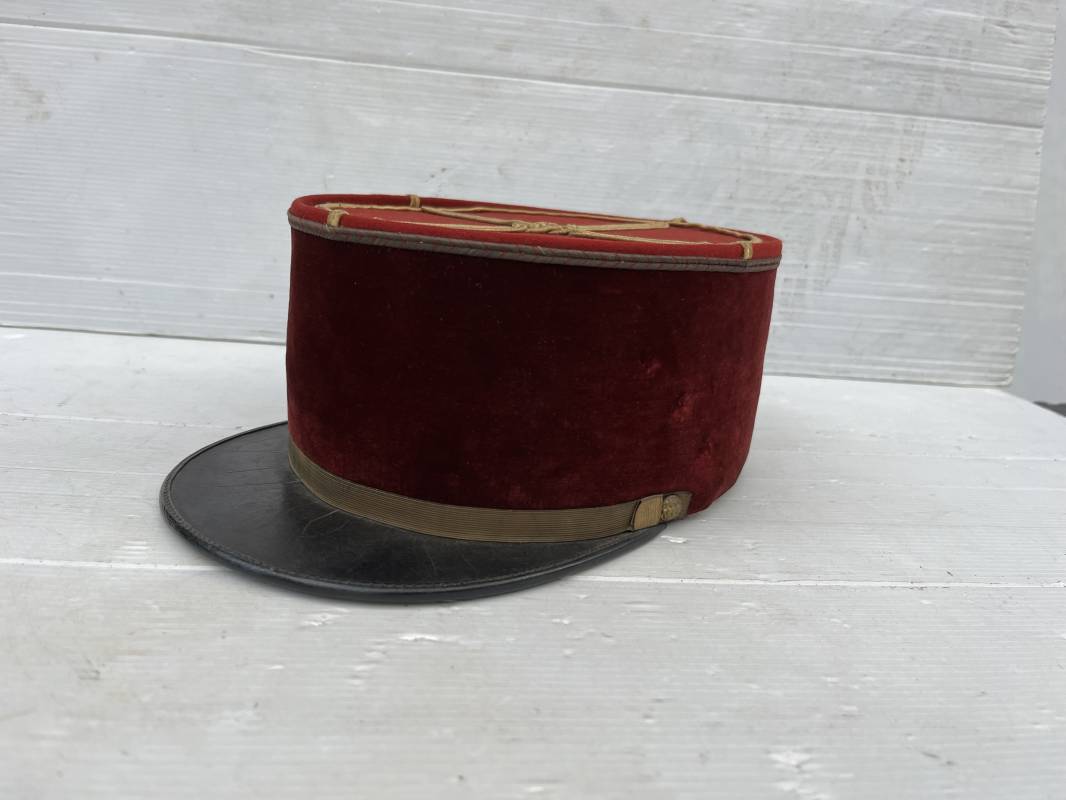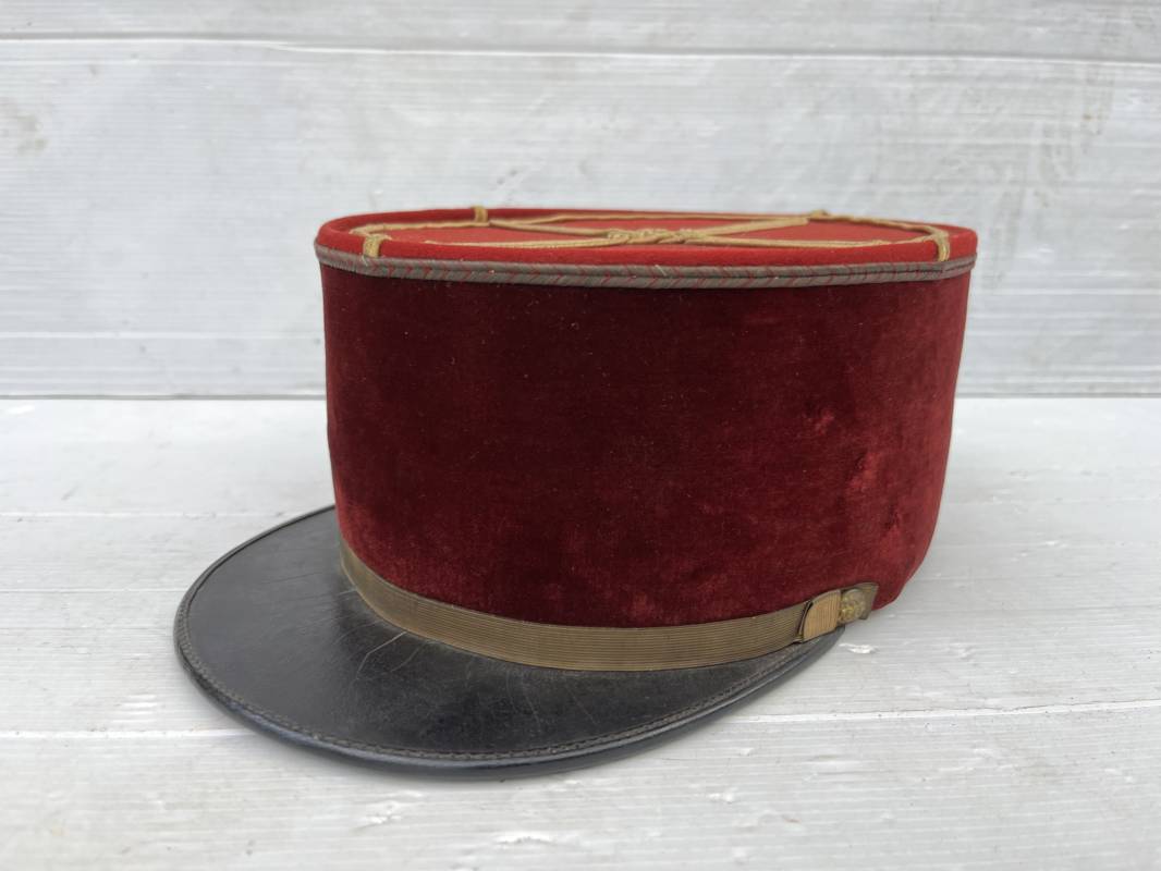 Beau képi modéle 1931 d un officier médecin . Bandeau de velours cramoisi , galons dorés , fausse jugulaire et petits boutons dorés du service de santé . Galons d aspirant . Hauteur kepi 103 mm . Visière en cuir noir , petit jonc sur le pourtour . Intérieur doublé en coton noir , bandeau de coiffe intérieur en cuir noir taille 581/2 . Képi légérement porté en tres bel état 1935/40 Ref 20234