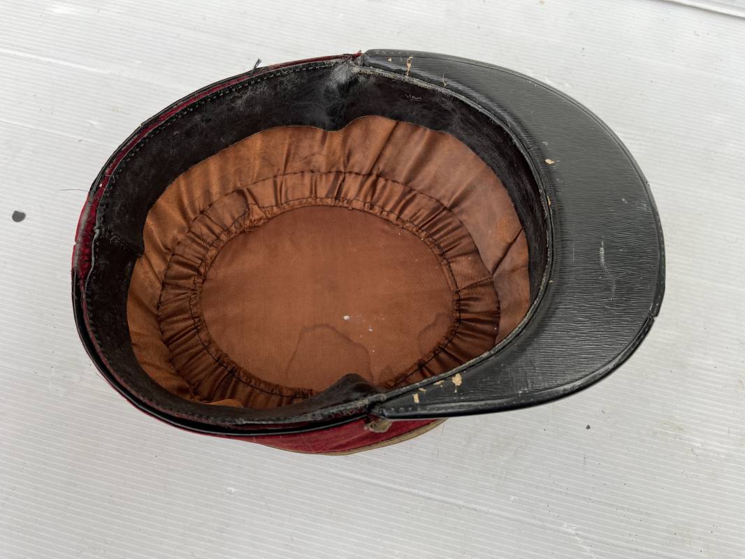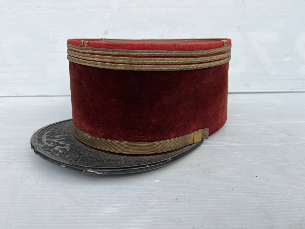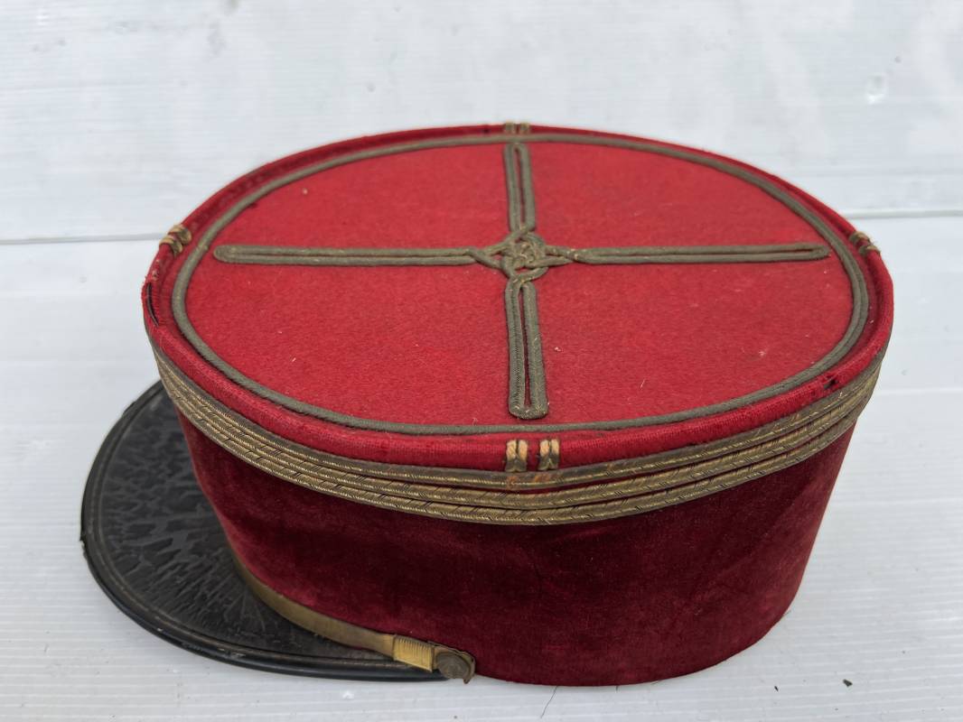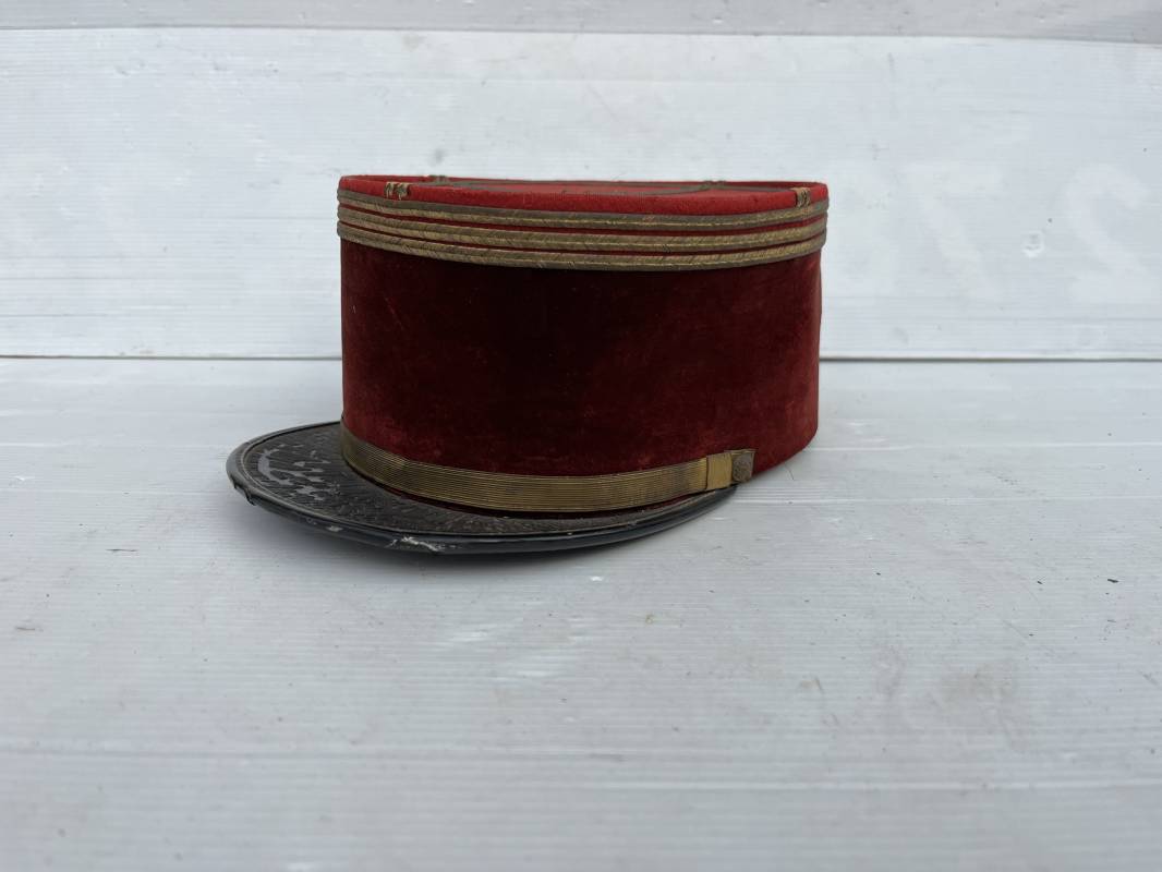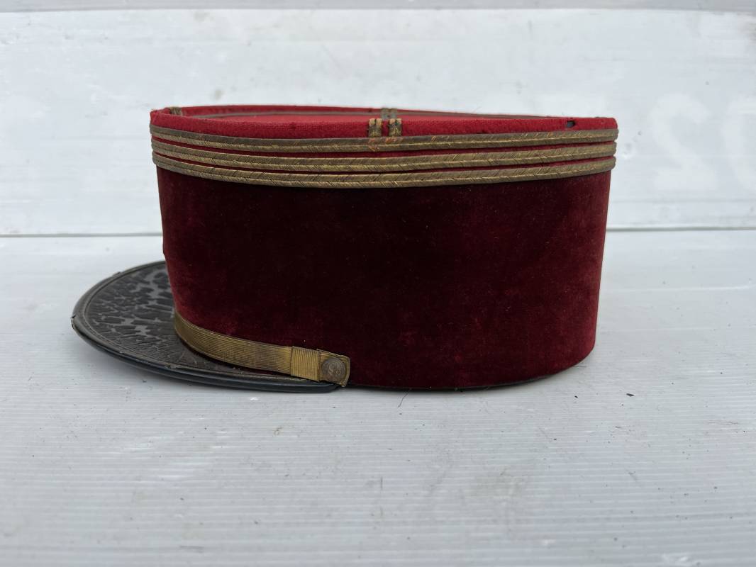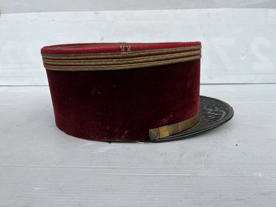 Beau képi modéle 1931 d un officier médecin . Bandeau de velours cramoisi , galons dorés , fausse jugulaire et petits boutons dorés du service de santé . Galons de capitaine . Hauteur kepi 103 mm . Visière en cuir noir , petit jonc sur le pourtour . Intérieur doublé en satinette brune , bandeau de coiffe intérieur en cuir noir taille 58. Képi légérement porté en tres bel état 1935/40 Ref 21645