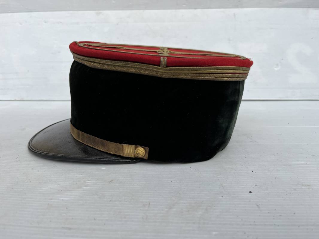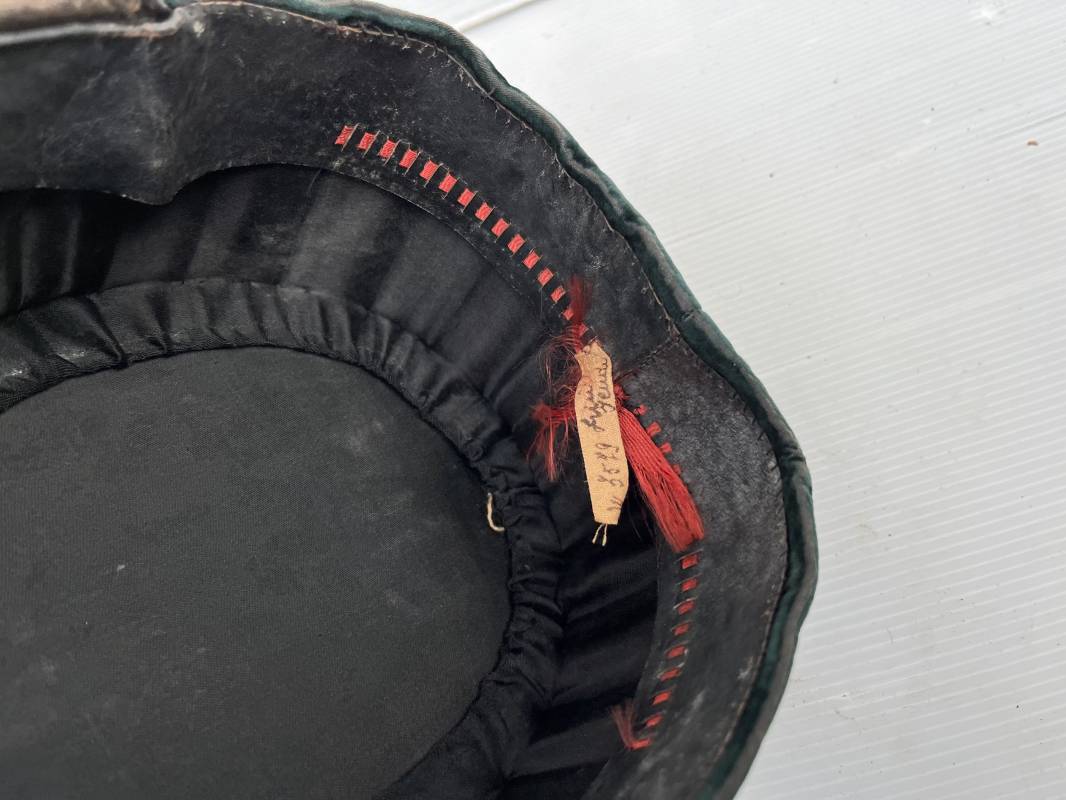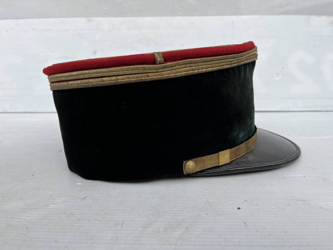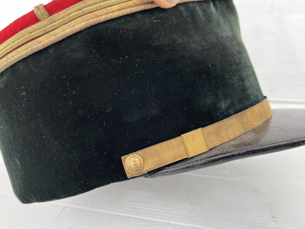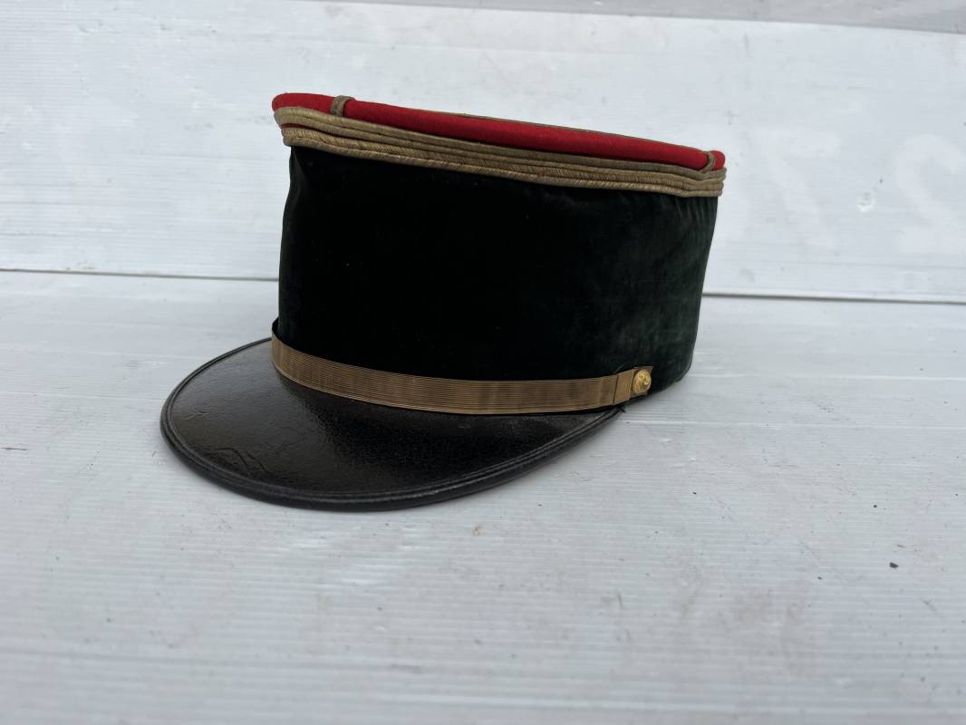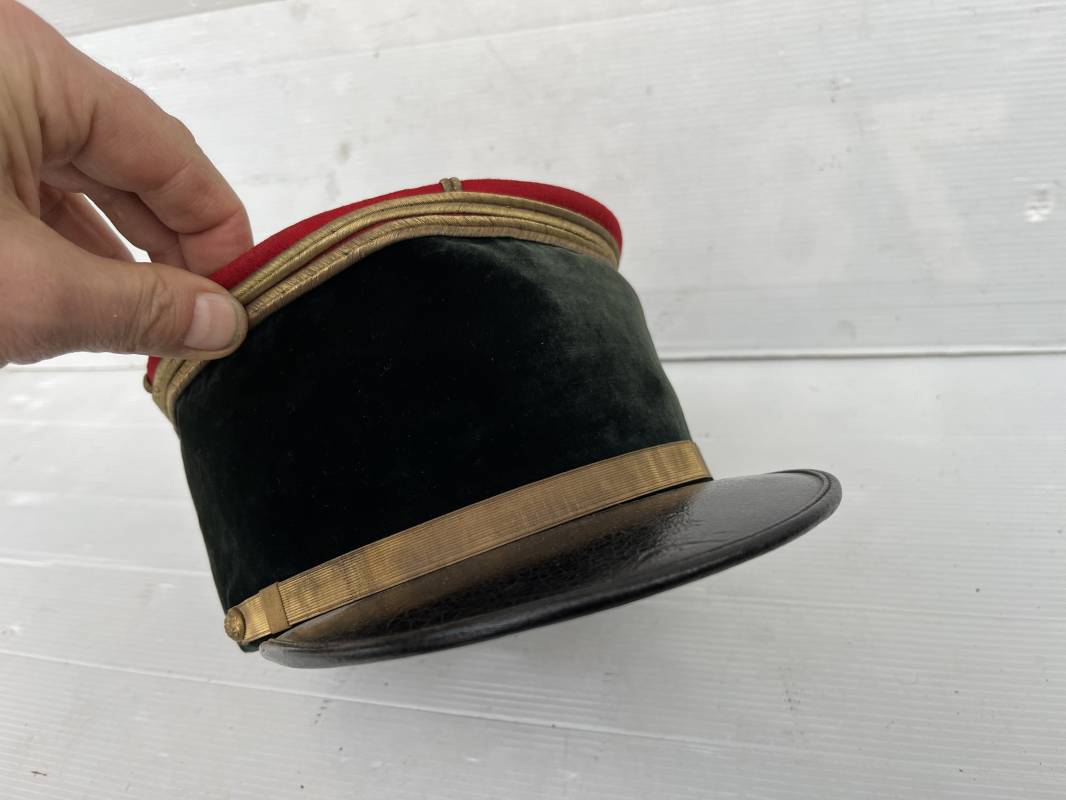 Beau képi modéle 1931 d un officier Pharmacien . Bandeau de velours vert , galons doré , fausse jugulaire et petits boutons dorés du service de santé . Galons de lieutenant . Hauteur kepi 103 mm . Visière en cuir noir , petit jonc sur le pourtour . Intérieur doublé en coton noir , bandeau de coiffe intérieur en cuir noir taille 57 . Képi légérement porté en tres bel état 1935/40 Ref 19783