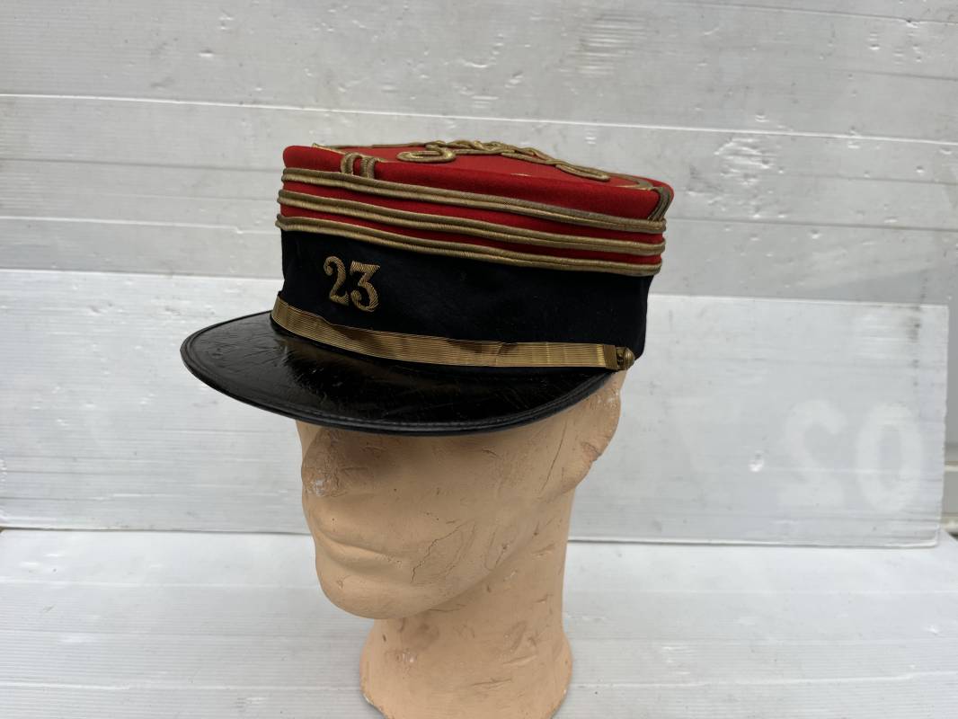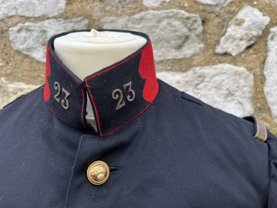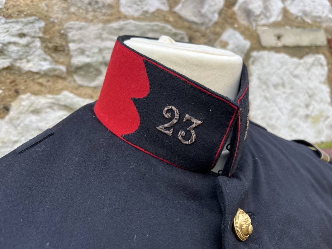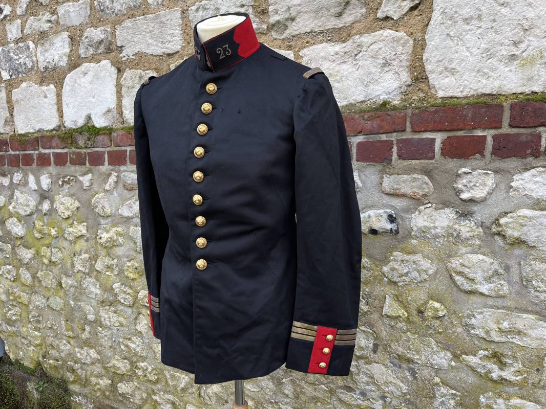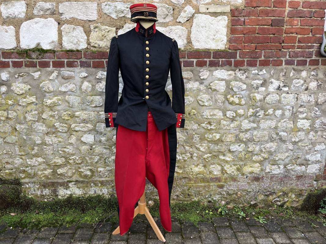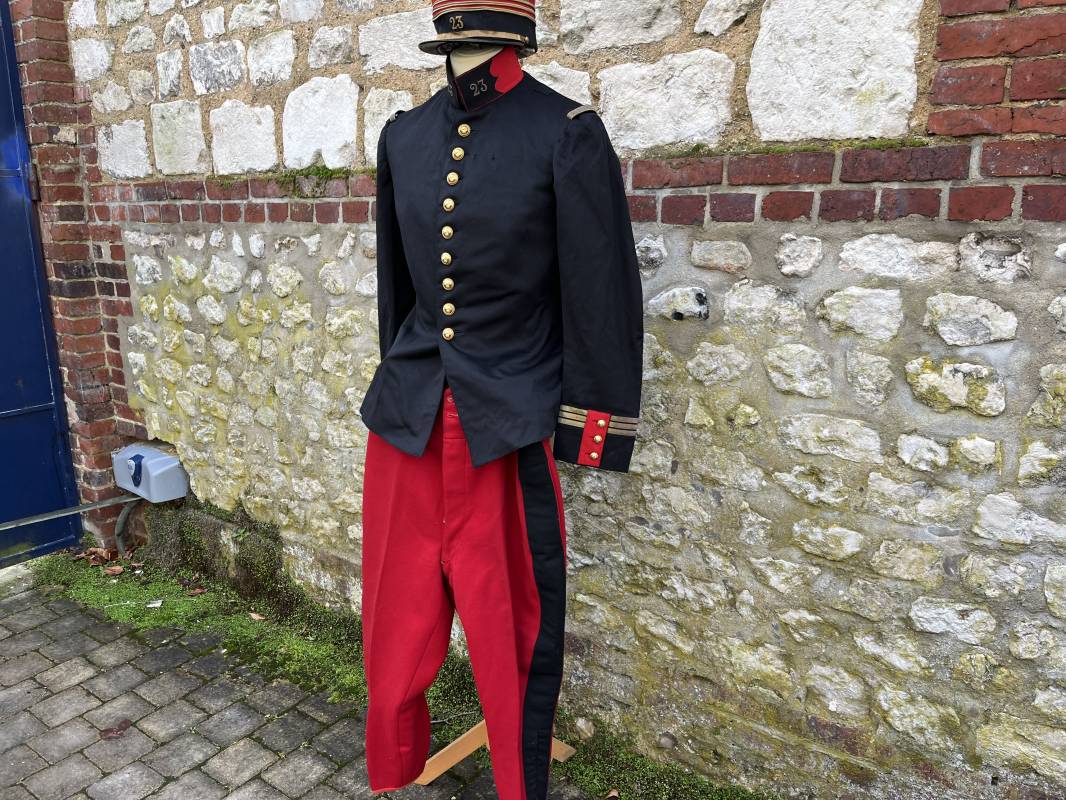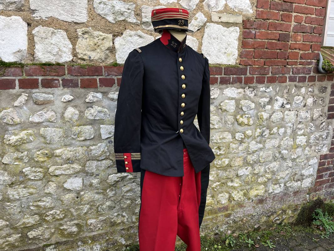 Trés bel ensemble d un capitaine du 23éme Régiment de infanterie de Ligne . Képi Polo mdle 1910 en drap noir et calot garance , galons dorés de capitaine . Chiffres brodés ' 23' en cannetille dorée sur le devant . Fausse jugulaire en aluminium doré , petits boutons a grenade de l infanterie . Visière en cuir noir . Hauteur kepi 90 mm Intérieur doublé en coton noir . Bandeau de coiffe intérieur en cuir noir Taille 59 . Veste Modele 1893 en drap noir , boutons dorés a grenade de l infanterie Pattes de col du 23 éme Régiment d infanterie de ligne , galons dorés de capitaine . Col droit en drap garance . Passants dorés pour le port des épaulettes . Intérieur doublé en satinette noire , manches doublées en coton rayé blanc , deux poches intérieures avec etiquette nominette au nom de l officier ' Montjamont Septembre 1913' . Etiquette du tailleur militaire E.Pichard Ecole de guerre a Paris . Largeur épaules 43 cm , longueur 75 cm , manche 62 cm . Culotte officier Mdle 1893 en drap garance et bandes de commandement en drap noir sur les cotés . Boutons en plastique rouge et noir . Martingale dans le dos . Bas des jambes boutonnés . Deux poches latérales , une poche a gousset . Intérieur doublé en coton rayé blanc et noir . Poches en coton blanc . Taille 46 longueur 95 cm . Tres bel ensemble légèrement porté en parfait état . Tres bel ensemble d un capitaire du prestigieux 23 éme Régiment d infanterie de Ligne en Aout 1914 Ref 21580