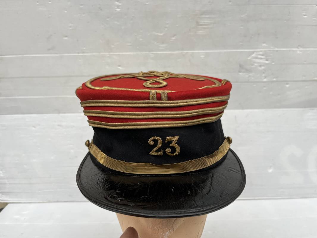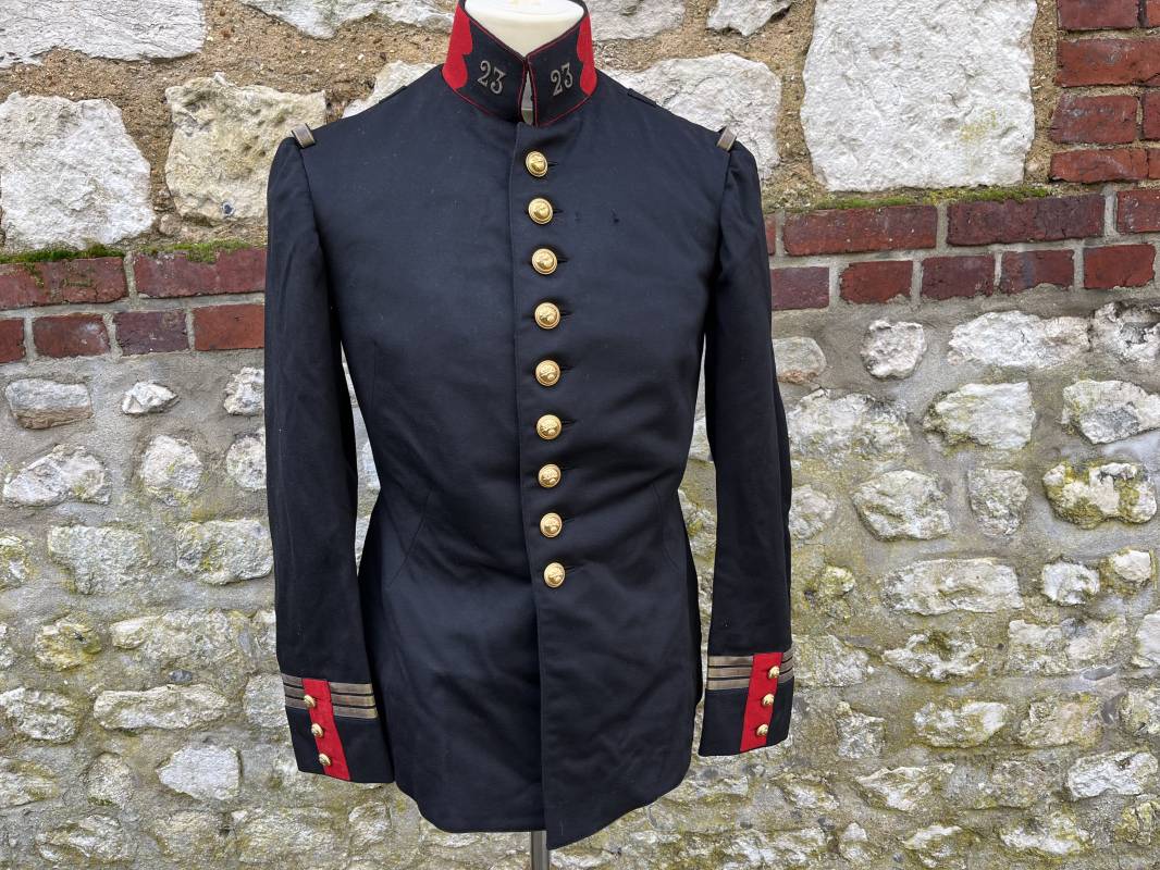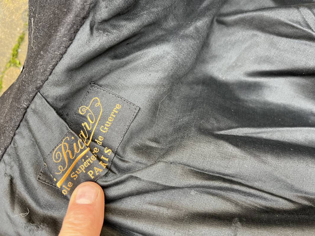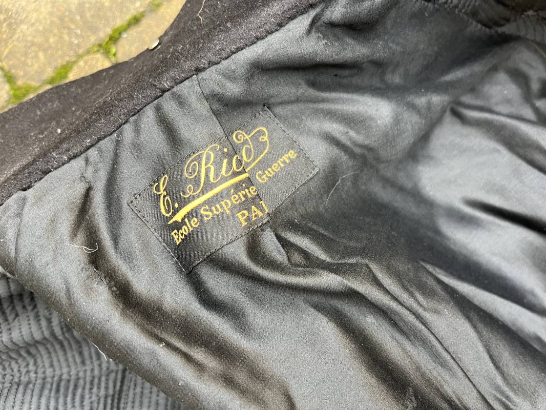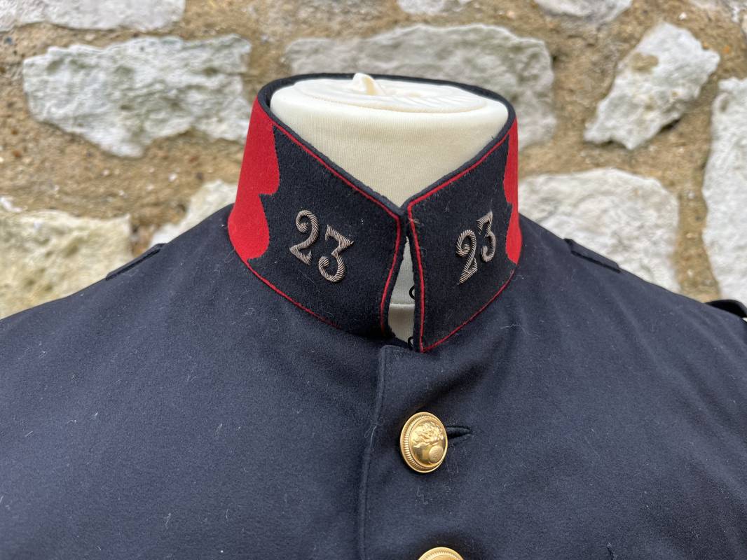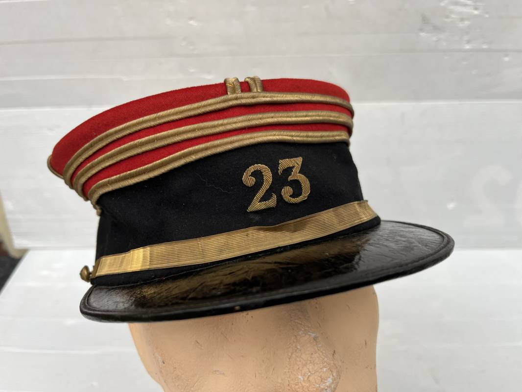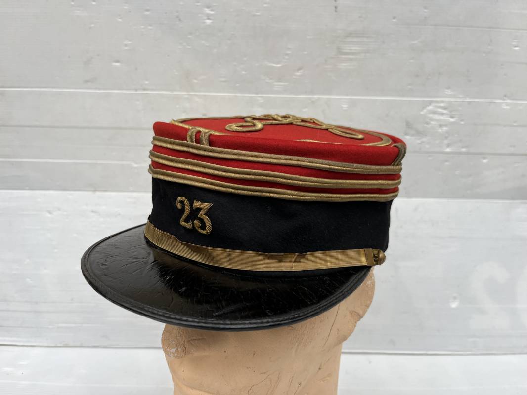 Trés bel ensemble d un capitaine du 23éme Régiment de infanterie de Ligne . Képi Polo mdle 1910 en drap noir et calot garance , galons dorés de capitaine . Chiffres brodés ' 23' en cannetille dorée sur le devant . Fausse jugulaire en aluminium doré , petits boutons a grenade de l infanterie . Visière en cuir noir . Hauteur kepi 90 mm Intérieur doublé en coton noir . Bandeau de coiffe intérieur en cuir noir Taille 59 . Veste Modele 1893 en drap noir , boutons dorés a grenade de l infanterie Pattes de col du 23 éme Régiment d infanterie de ligne , galons dorés de capitaine . Col droit en drap garance . Passants dorés pour le port des épaulettes . Intérieur doublé en satinette noire , manches doublées en coton rayé blanc , deux poches intérieures avec etiquette nominette au nom de l officier ' Montjamont Septembre 1913' . Etiquette du tailleur militaire E.Pichard Ecole de guerre a Paris . Largeur épaules 43 cm , longueur 75 cm , manche 62 cm . Culotte officier Mdle 1893 en drap garance et bandes de commandement en drap noir sur les cotés . Boutons en plastique rouge et noir . Martingale dans le dos . Bas des jambes boutonnés . Deux poches latérales , une poche a gousset . Intérieur doublé en coton rayé blanc et noir . Poches en coton blanc . Taille 46 longueur 95 cm . Tres bel ensemble légèrement porté en parfait état . Tres bel ensemble d un capitaire du prestigieux 23 éme Régiment d infanterie de Ligne en Aout 1914 Ref 21580