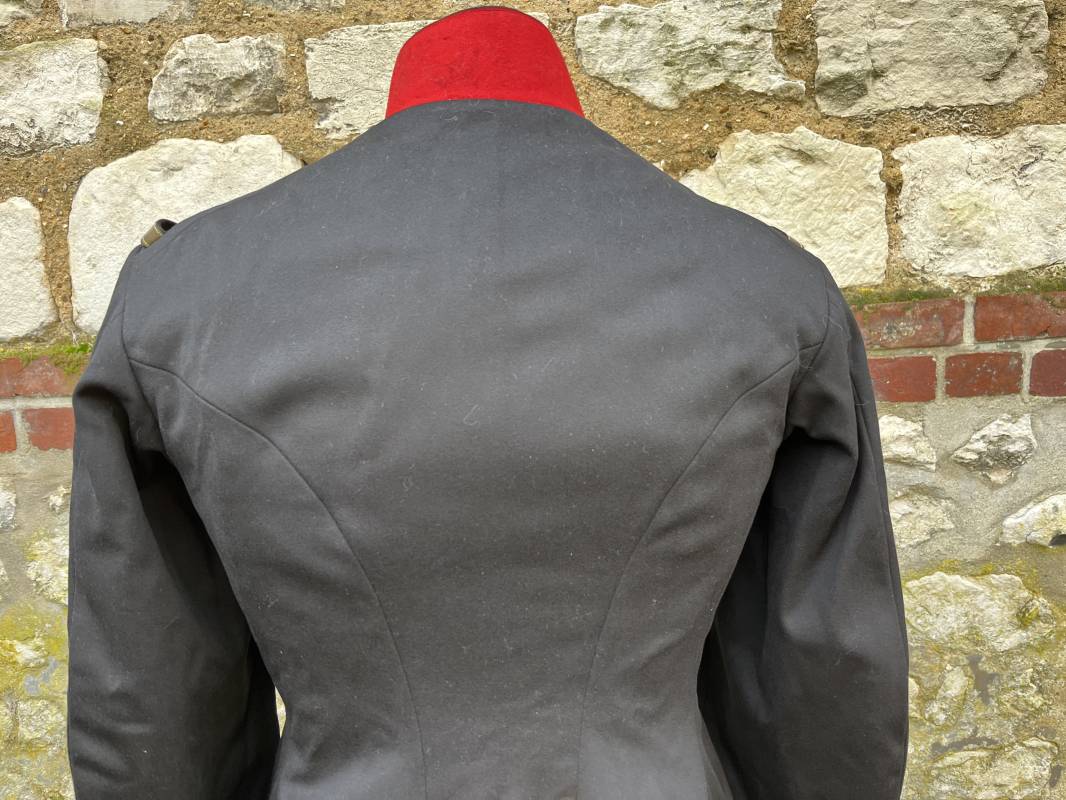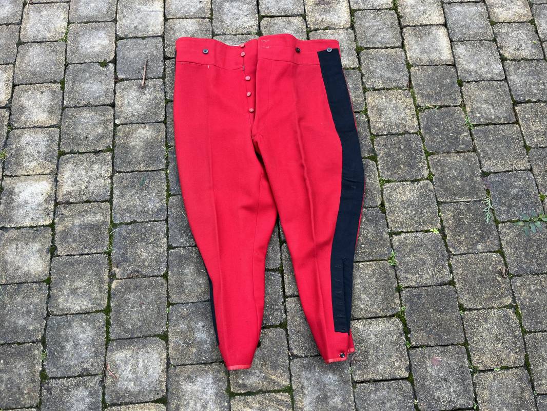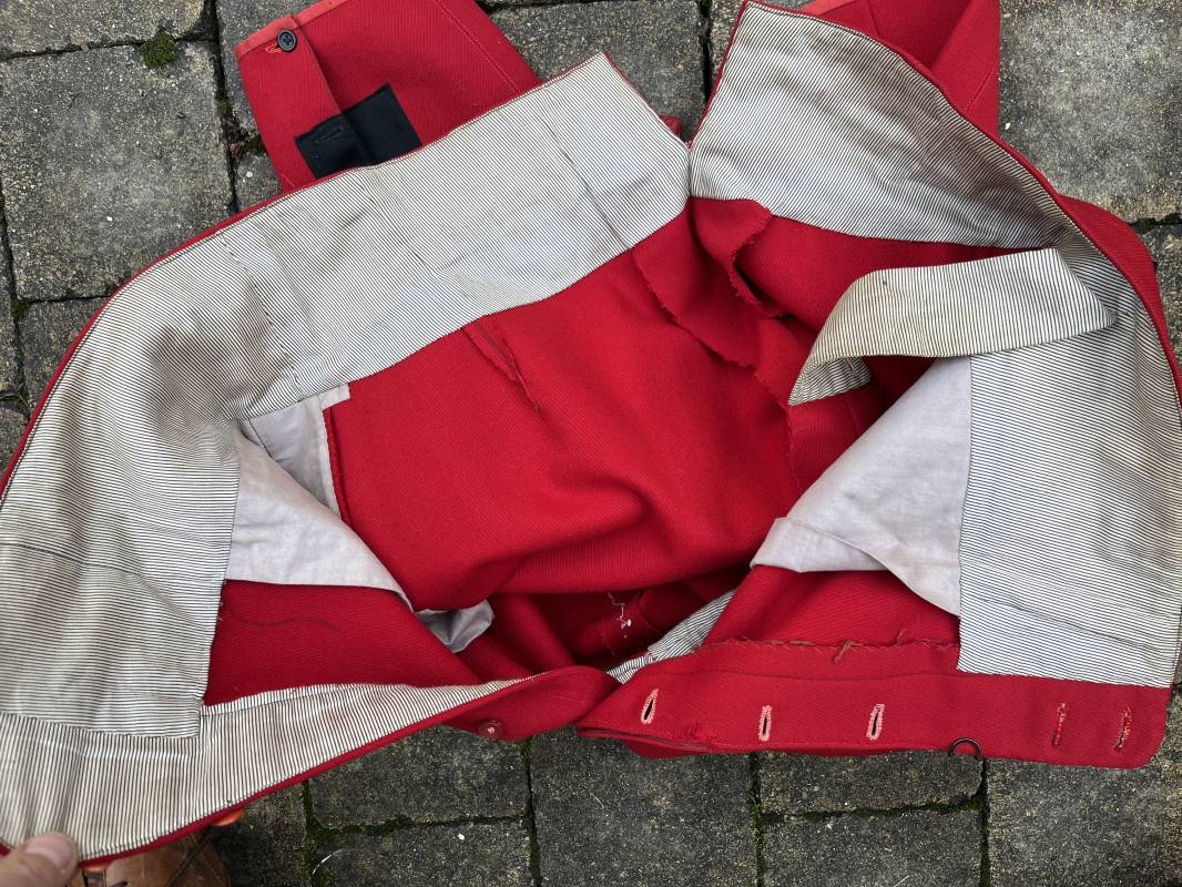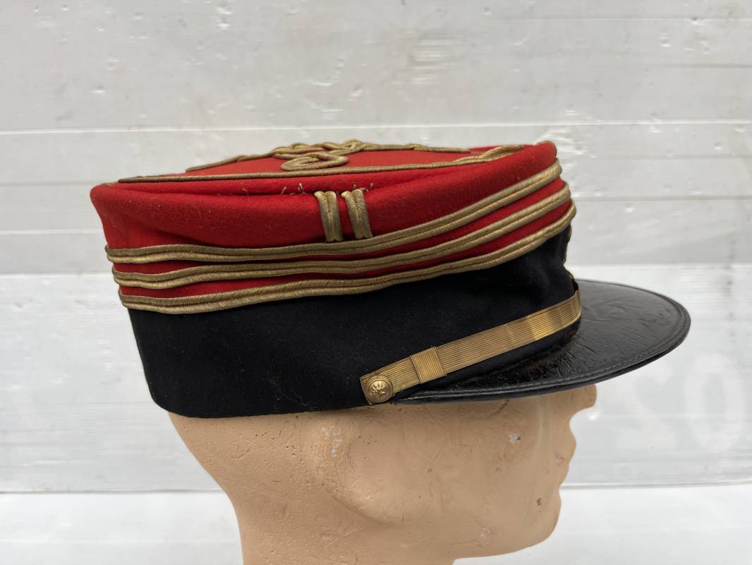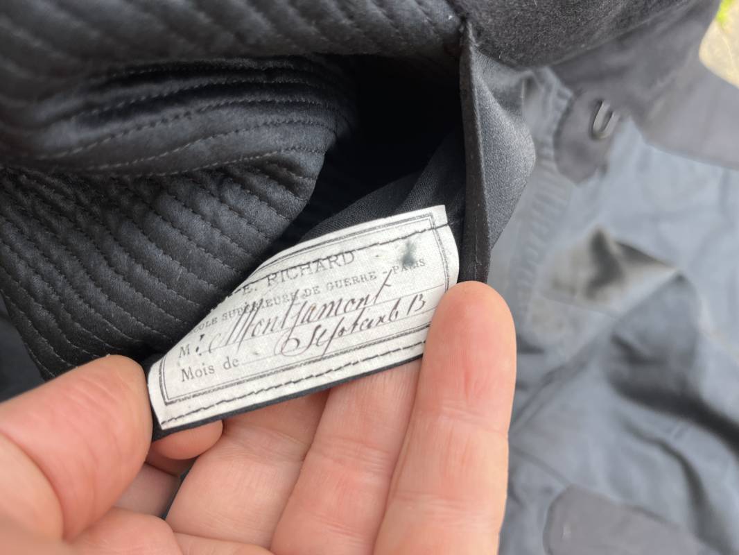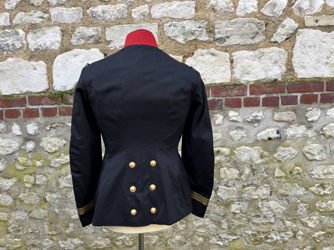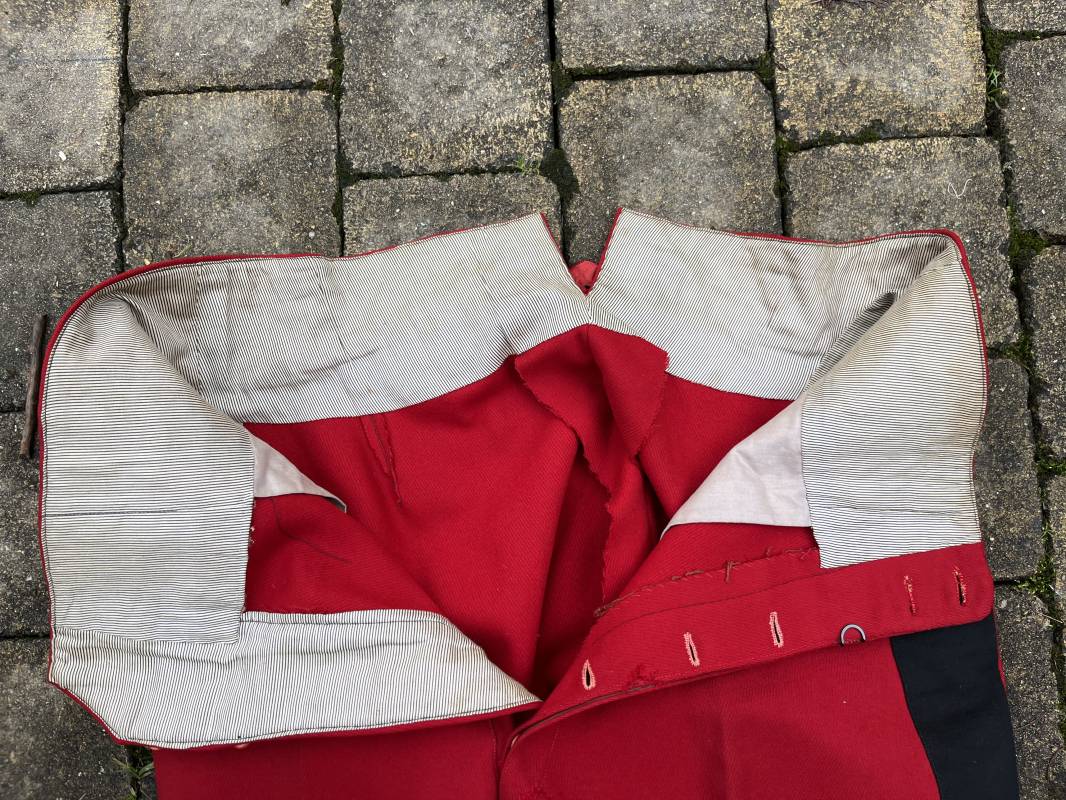 Trés bel ensemble d un capitaine du 23éme Régiment de infanterie de Ligne . Képi Polo mdle 1910 en drap noir et calot garance , galons dorés de capitaine . Chiffres brodés ' 23' en cannetille dorée sur le devant . Fausse jugulaire en aluminium doré , petits boutons a grenade de l infanterie . Visière en cuir noir . Hauteur kepi 90 mm Intérieur doublé en coton noir . Bandeau de coiffe intérieur en cuir noir Taille 59 . Veste Modele 1893 en drap noir , boutons dorés a grenade de l infanterie Pattes de col du 23 éme Régiment d infanterie de ligne , galons dorés de capitaine . Col droit en drap garance . Passants dorés pour le port des épaulettes . Intérieur doublé en satinette noire , manches doublées en coton rayé blanc , deux poches intérieures avec etiquette nominette au nom de l officier ' Montjamont Septembre 1913' . Etiquette du tailleur militaire E.Pichard Ecole de guerre a Paris . Largeur épaules 43 cm , longueur 75 cm , manche 62 cm . Culotte officier Mdle 1893 en drap garance et bandes de commandement en drap noir sur les cotés . Boutons en plastique rouge et noir . Martingale dans le dos . Bas des jambes boutonnés . Deux poches latérales , une poche a gousset . Intérieur doublé en coton rayé blanc et noir . Poches en coton blanc . Taille 46 longueur 95 cm . Tres bel ensemble légèrement porté en parfait état . Tres bel ensemble d un capitaire du prestigieux 23 éme Régiment d infanterie de Ligne en Aout 1914 Ref 21580
