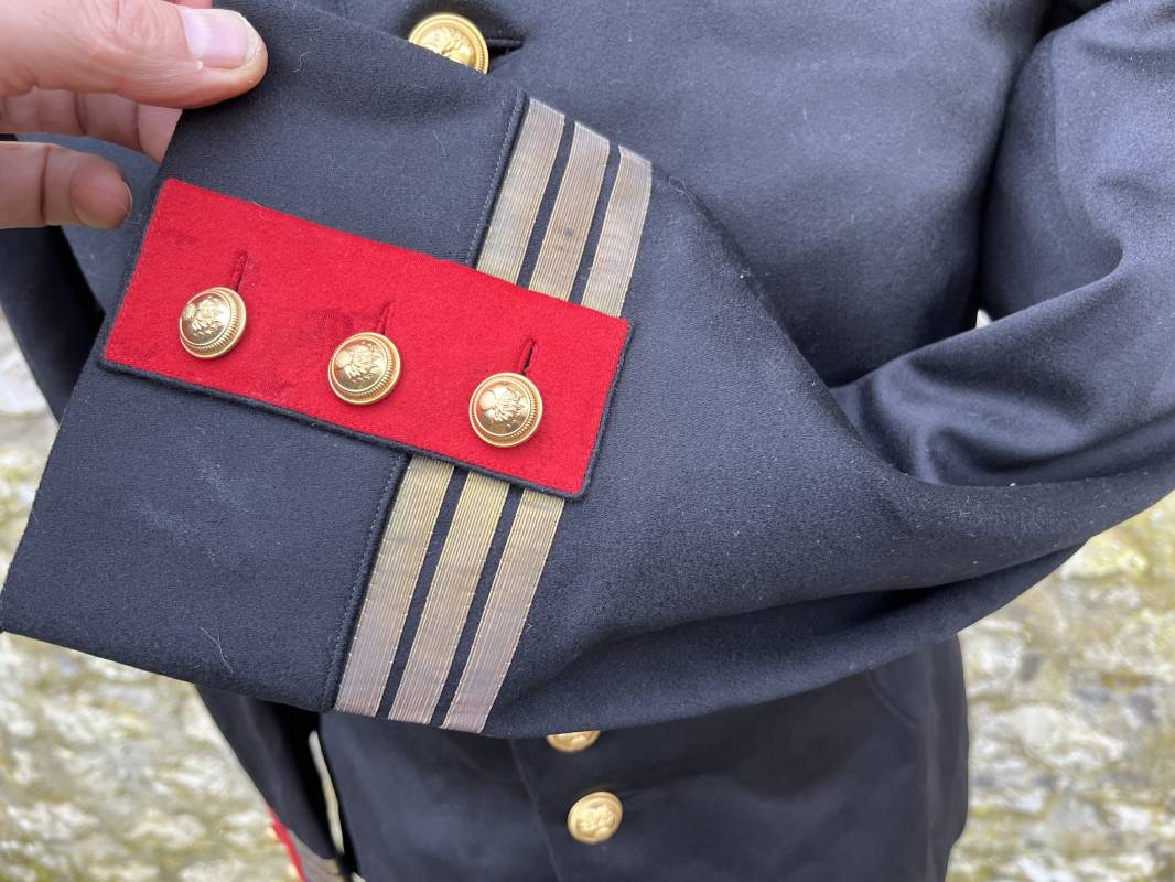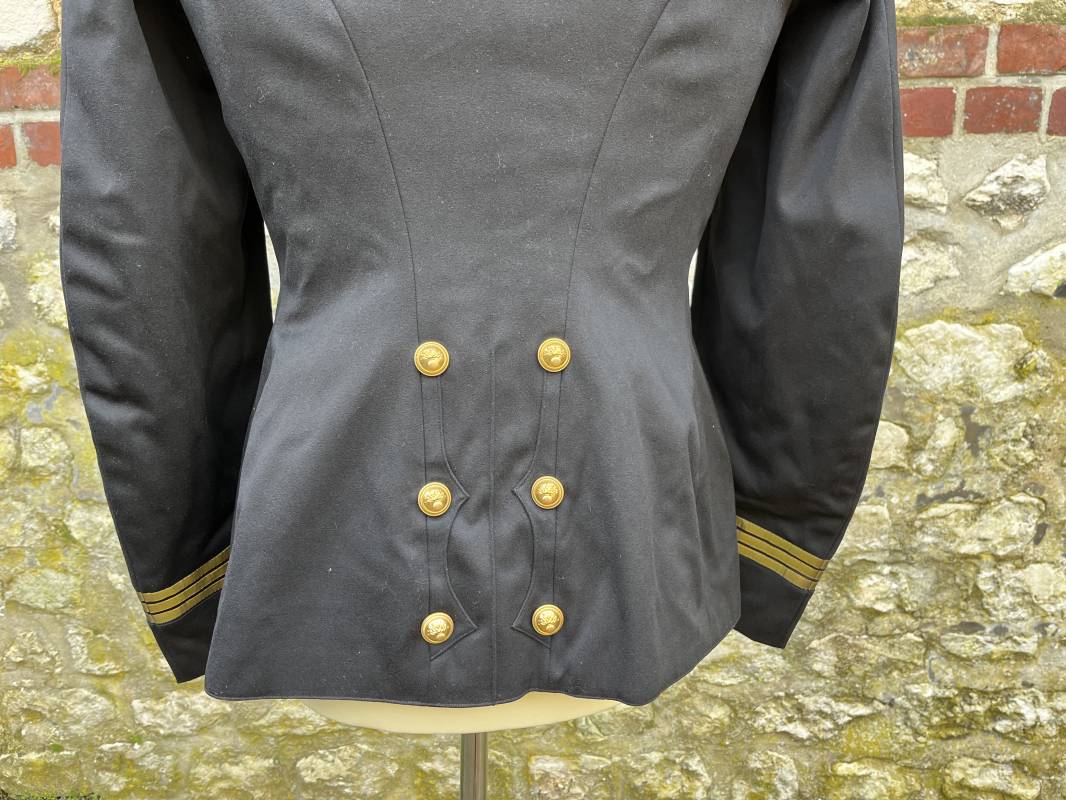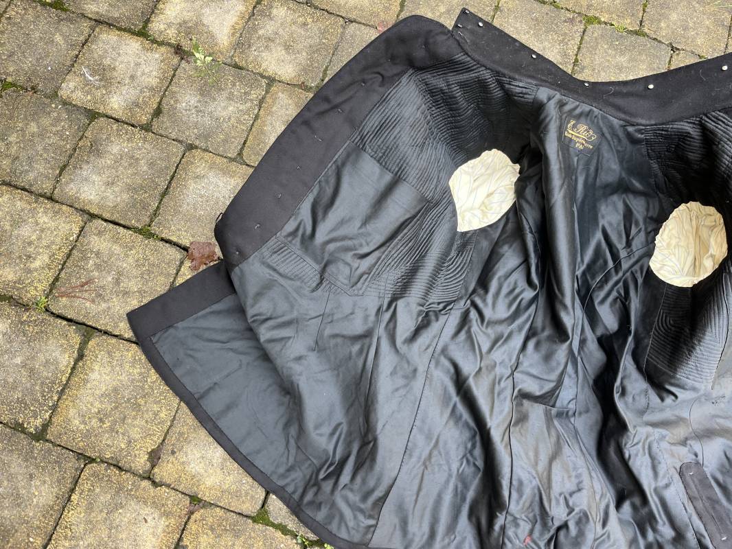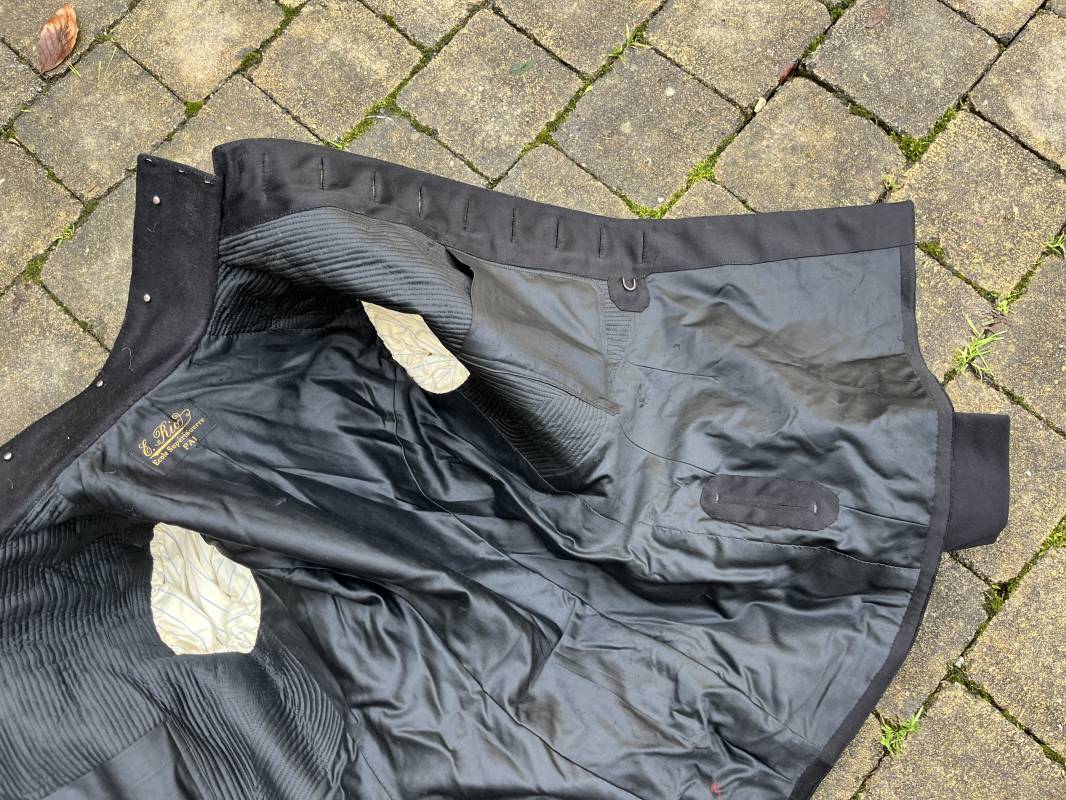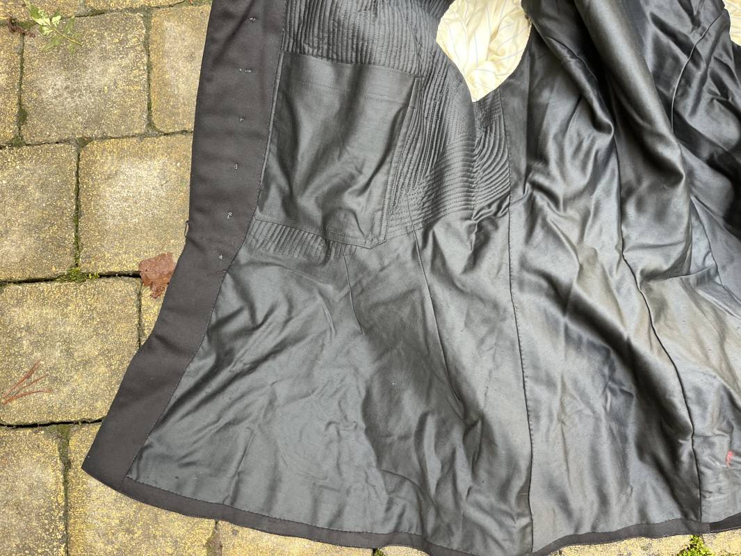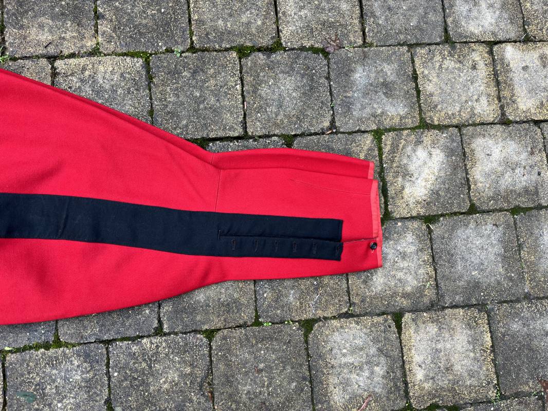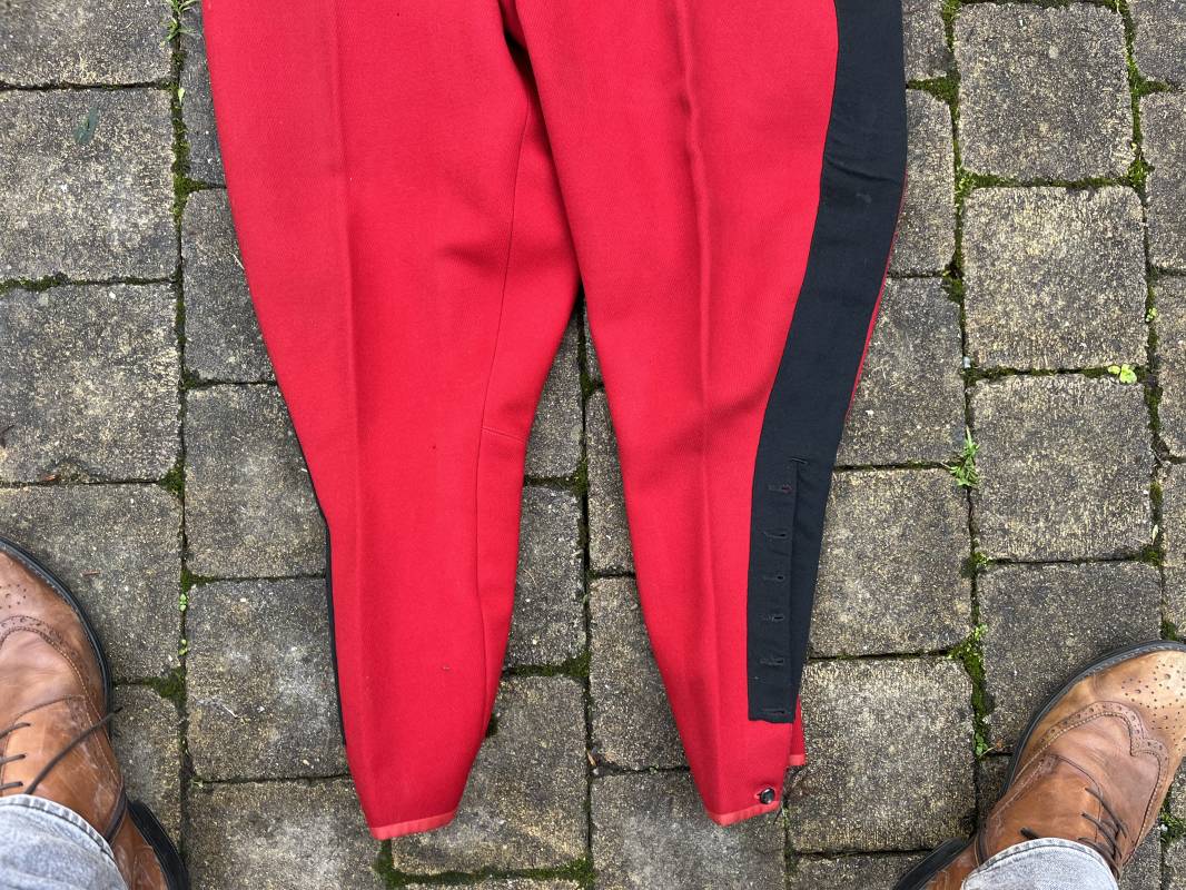 Trés bel ensemble d un capitaine du 23éme Régiment de infanterie de Ligne . Képi Polo mdle 1910 en drap noir et calot garance , galons dorés de capitaine . Chiffres brodés ' 23' en cannetille dorée sur le devant . Fausse jugulaire en aluminium doré , petits boutons a grenade de l infanterie . Visière en cuir noir . Hauteur kepi 90 mm Intérieur doublé en coton noir . Bandeau de coiffe intérieur en cuir noir Taille 59 . Veste Modele 1893 en drap noir , boutons dorés a grenade de l infanterie Pattes de col du 23 éme Régiment d infanterie de ligne , galons dorés de capitaine . Col droit en drap garance . Passants dorés pour le port des épaulettes . Intérieur doublé en satinette noire , manches doublées en coton rayé blanc , deux poches intérieures avec etiquette nominette au nom de l officier ' Montjamont Septembre 1913' . Etiquette du tailleur militaire E.Pichard Ecole de guerre a Paris . Largeur épaules 43 cm , longueur 75 cm , manche 62 cm . Culotte officier Mdle 1893 en drap garance et bandes de commandement en drap noir sur les cotés . Boutons en plastique rouge et noir . Martingale dans le dos . Bas des jambes boutonnés . Deux poches latérales , une poche a gousset . Intérieur doublé en coton rayé blanc et noir . Poches en coton blanc . Taille 46 longueur 95 cm . Tres bel ensemble légèrement porté en parfait état . Tres bel ensemble d un capitaire du prestigieux 23 éme Régiment d infanterie de Ligne en Aout 1914 Ref 21580