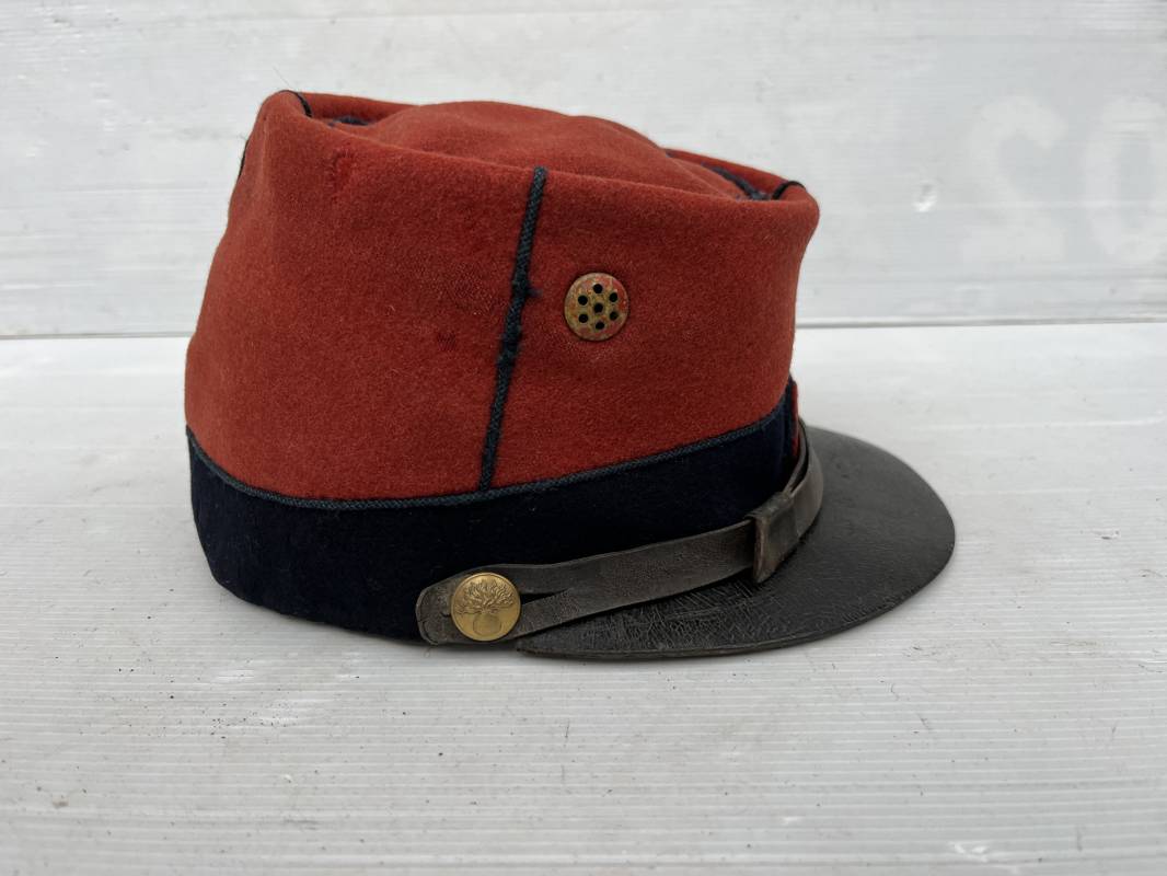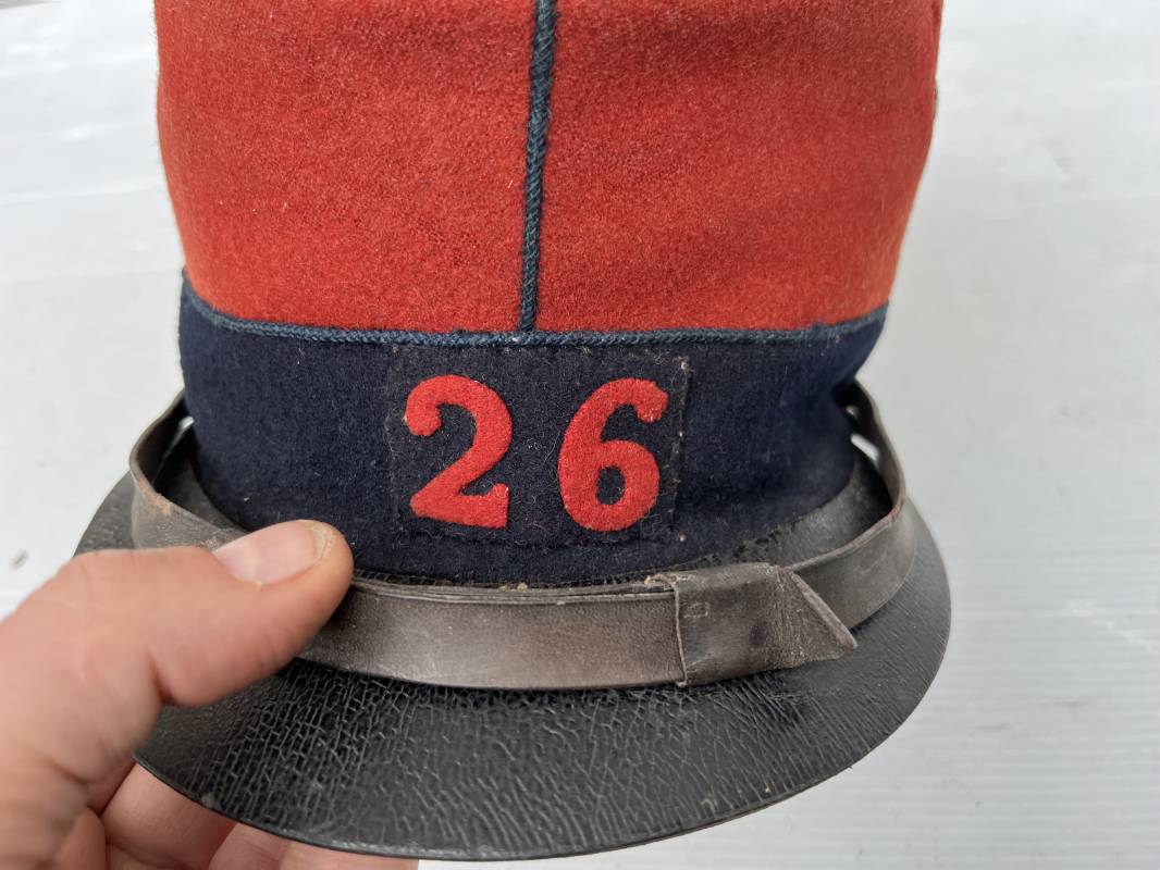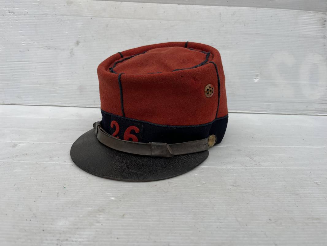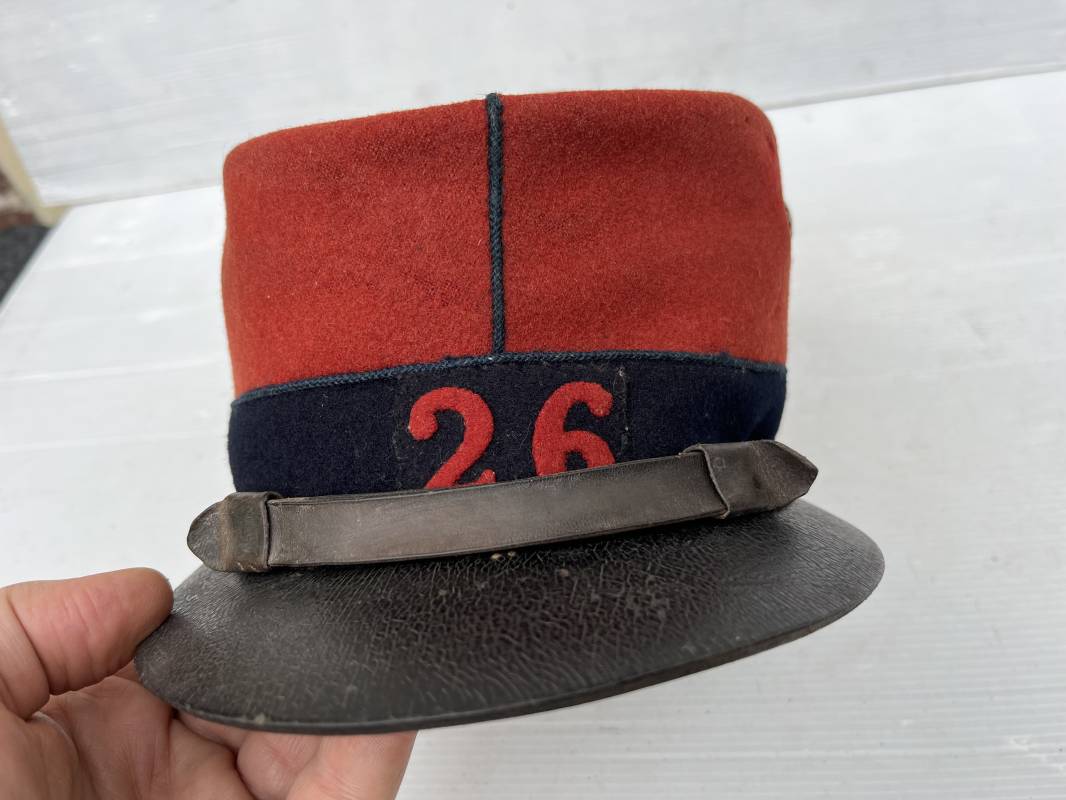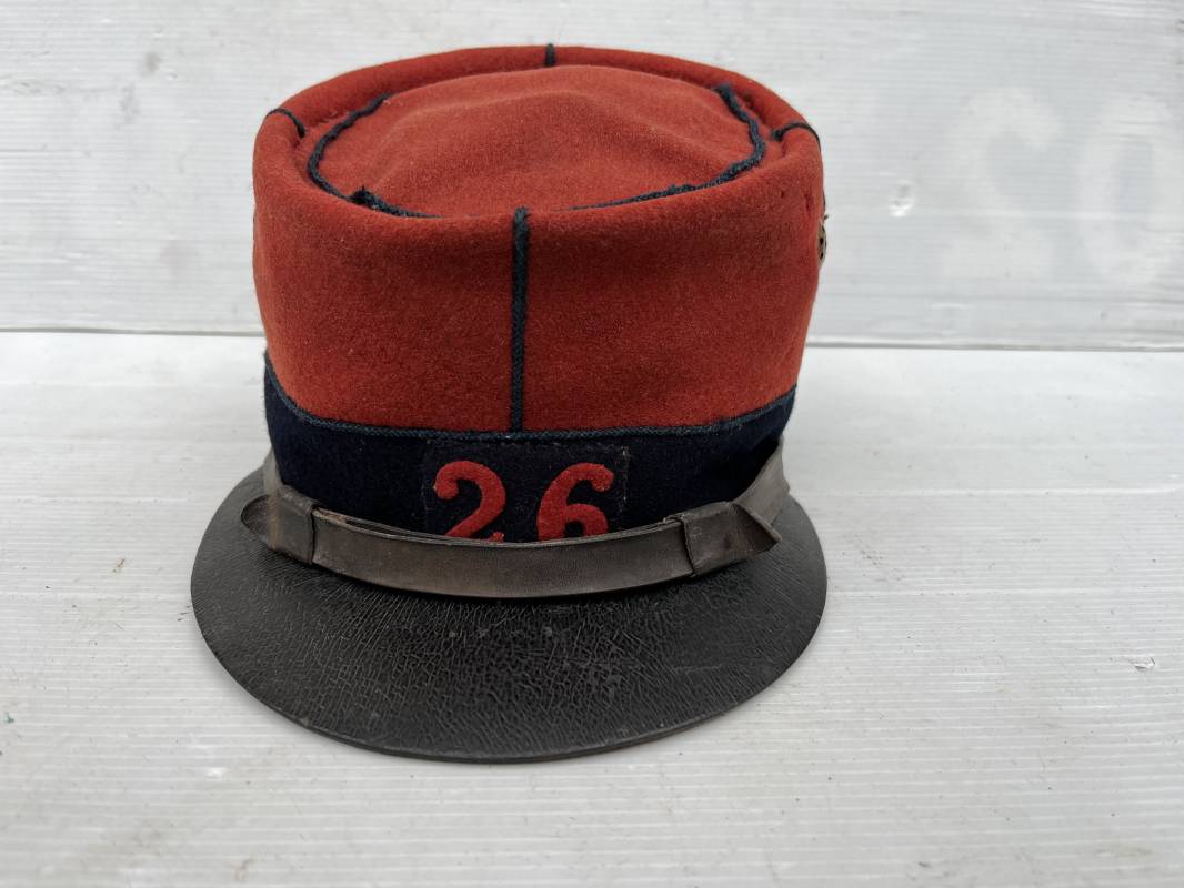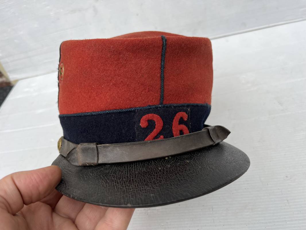 Très beau képi troupe modèle 1884 d'un soldat du 26 ème Régiment d'Infanterie de Ligne ( Nancy ) . Képi de dotation en drap garance et gris de fer bleuté. Oeillets de ventilation. Visière en cuir noir. Jugulaire troupe en cuir noir à coulisse. Deux boutons dorés à grenade de l'Infanterie. Chiffres découpés du 26 ème RI cousus sur le devant. Bandeau de coiffe intérieure en cuir noir. Taille 54. Fond du képi doublé coton et cuir. Carcasse en lin . Drap frais, képi porté en bel état . Belle forme. Belle patine générale 1900/1914. Ref 22066