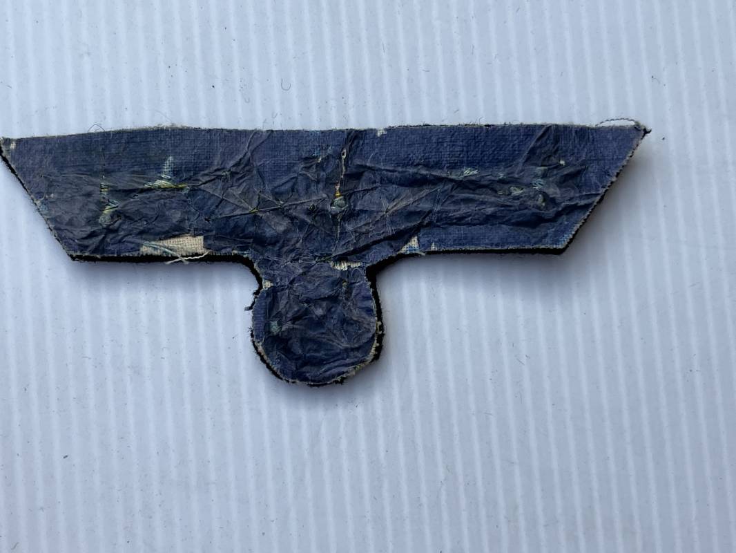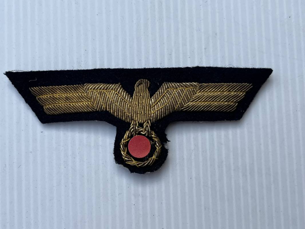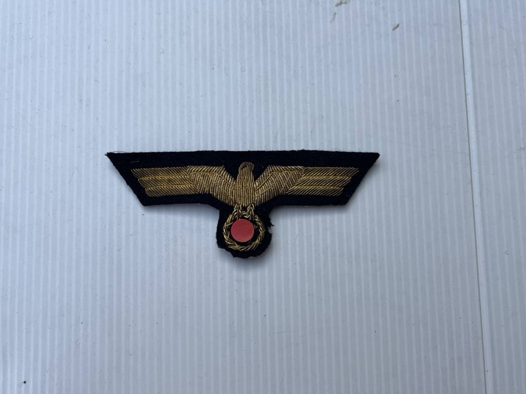 Trés bel aigle de poitrine d un officier de la Krigsmarine . Aigle en cannetille dorée . Drap de fond bleu nuit . Longueur 100 mm Revers papier . Aigle en parfait état Jamais monté . Ref 20043
