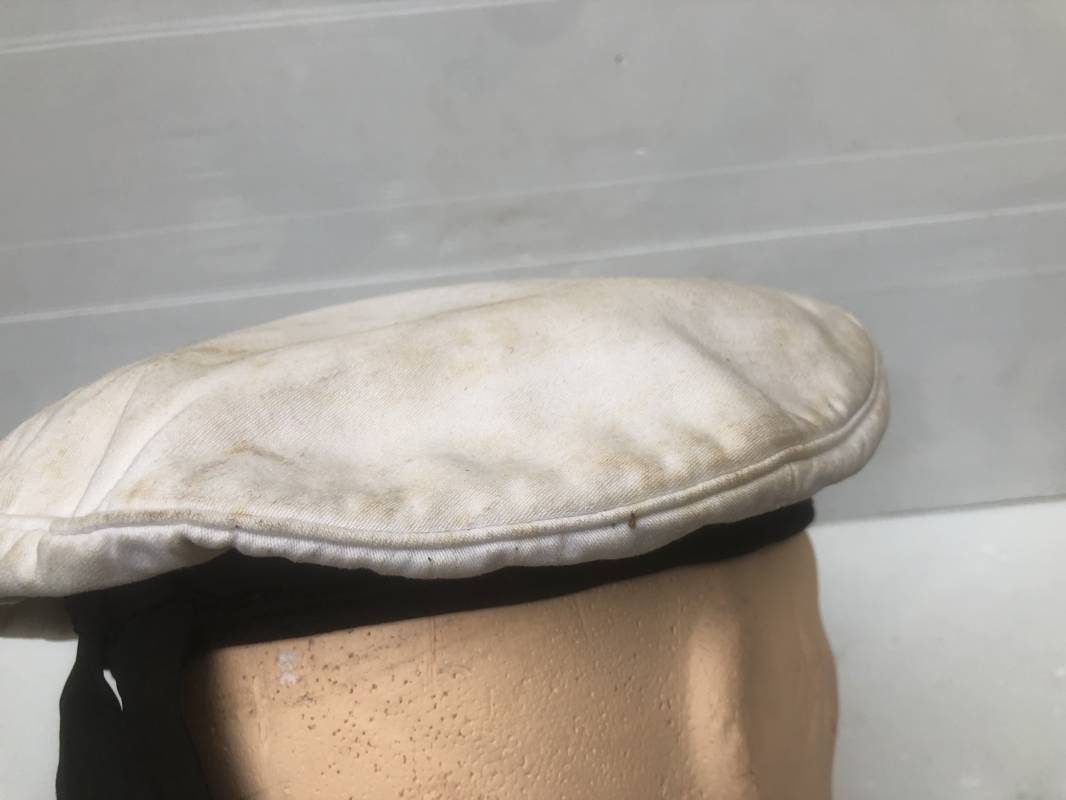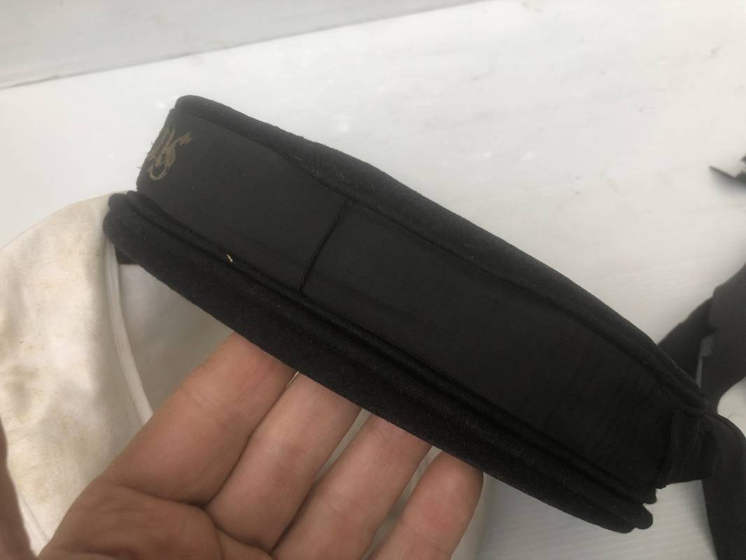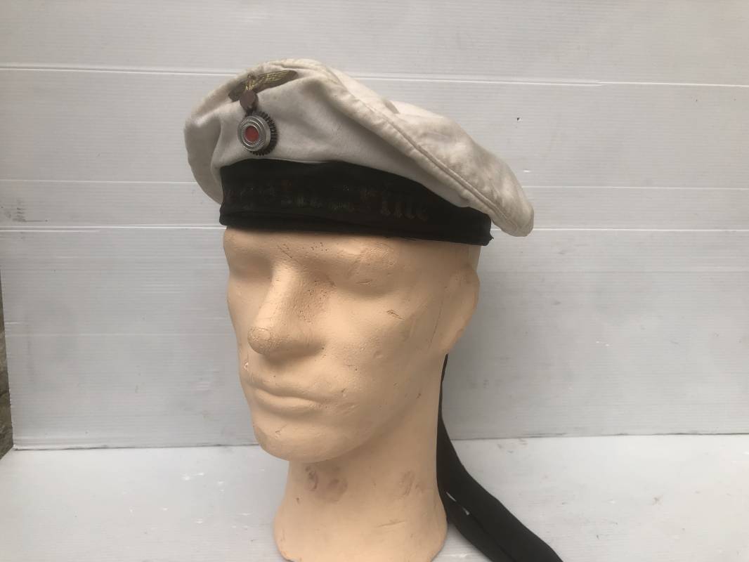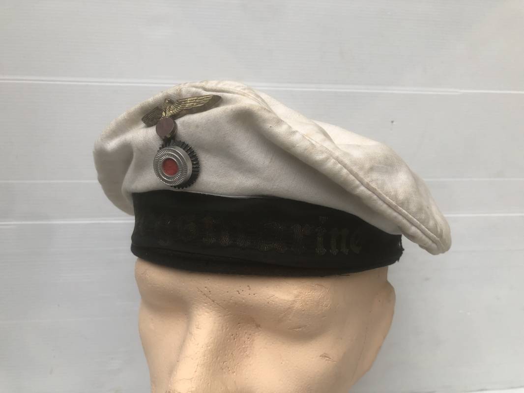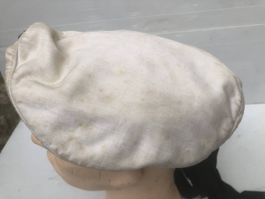Rare bachis réglementaire d'un matelot de la Kriegsmarine . Bachis amovible avec sa coiffe en coton blanc Bachis en coton bleu nuit , bande de bachis en soie noire tissée BEVO en fil doré ' KRIEGSMARINE' Pourtour de coiffe en célléon translucide typique des bonne fabrication 2éme guerre . Célléon cassé avec manque ( voir photos ) Bandeau de coiffe intérieure en cuir gris . Cuir souple taille 57 Peties déchirures . Coiffe en coton blanc de dotation avec marquage encre de taille 57 , nom du matelot manuscrit en fond de coiffe . Insignes mono bloc , aigle doré et cocarde métalliques avec fixation par épingle verticale . Bachis porté , trés belle patine générale . Rare coiffure 100 % dans son jus et totalement intouchée 1940/45 Ref 19526