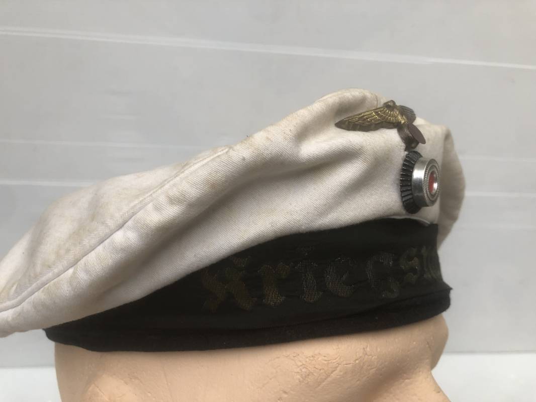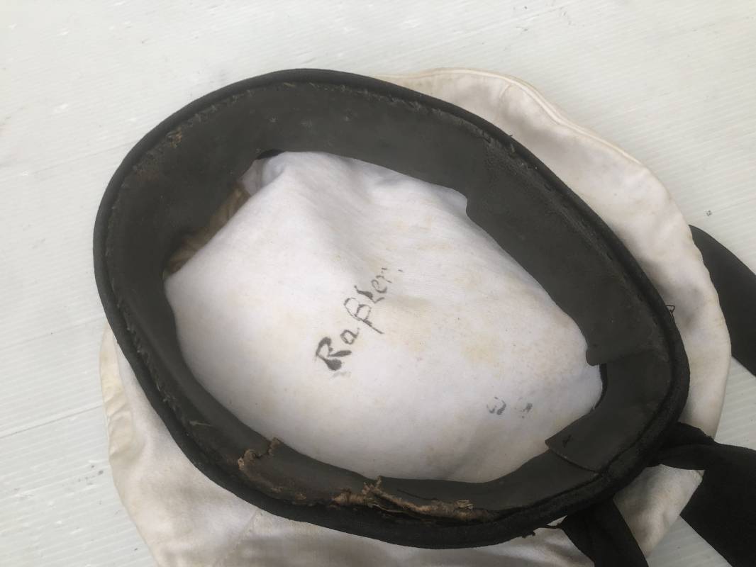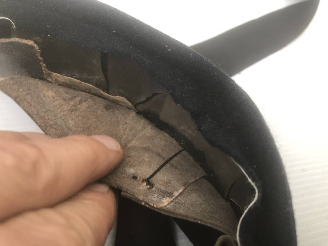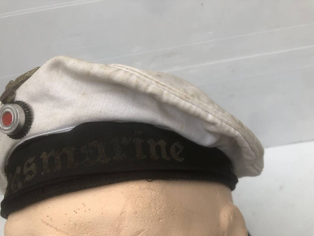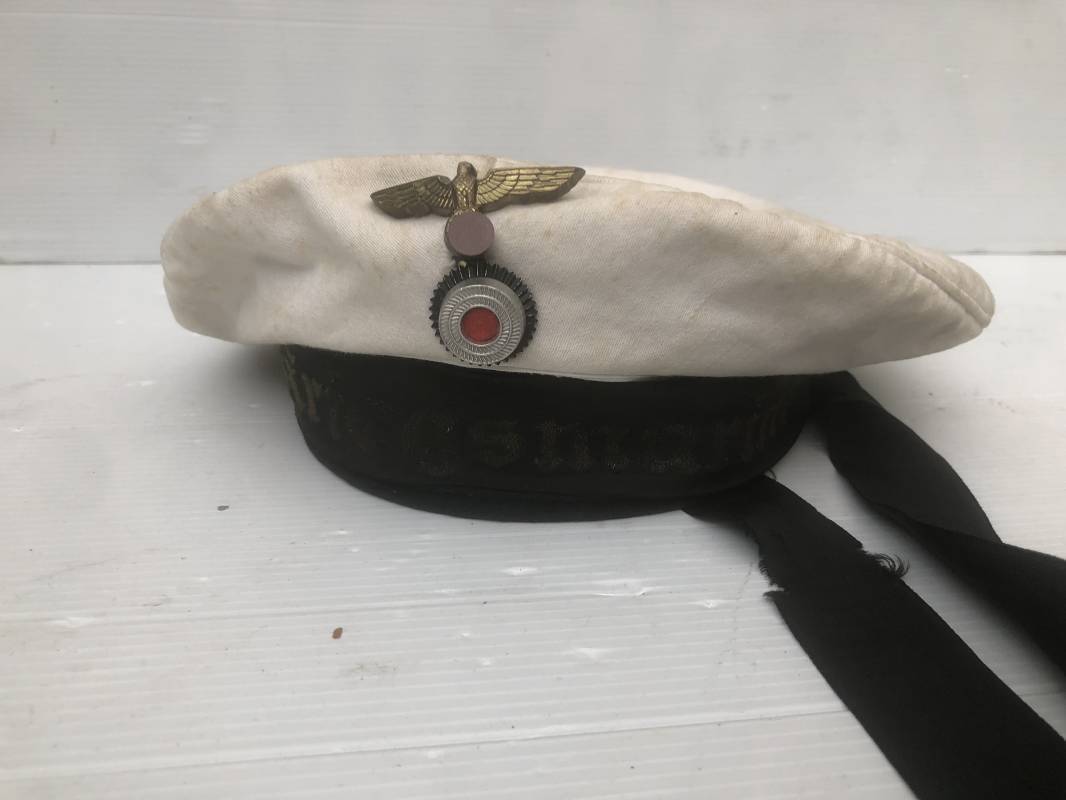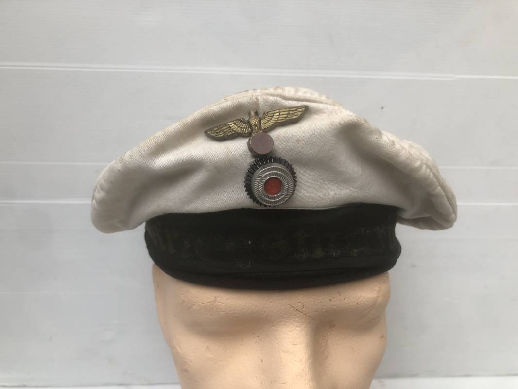 Rare bachis réglementaire d'un matelot de la Kriegsmarine . Bachis amovible avec sa coiffe en coton blanc Bachis en coton bleu nuit , bande de bachis en soie noire tissée BEVO en fil doré ' KRIEGSMARINE' Pourtour de coiffe en célléon translucide typique des bonne fabrication 2éme guerre . Célléon cassé avec manque ( voir photos ) Bandeau de coiffe intérieure en cuir gris . Cuir souple taille 57 Peties déchirures . Coiffe en coton blanc de dotation avec marquage encre de taille 57 , nom du matelot manuscrit en fond de coiffe . Insignes mono bloc , aigle doré et cocarde métalliques avec fixation par épingle verticale . Bachis porté , trés belle patine générale . Rare coiffure 100 % dans son jus et totalement intouchée 1940/45 Ref 19526