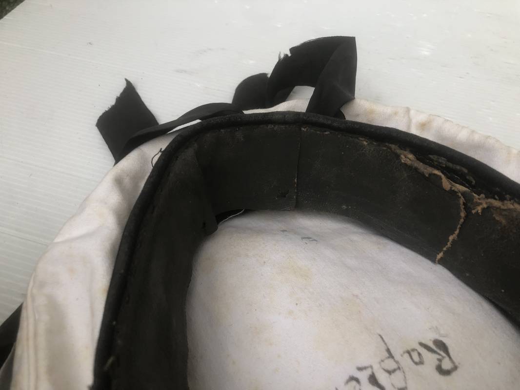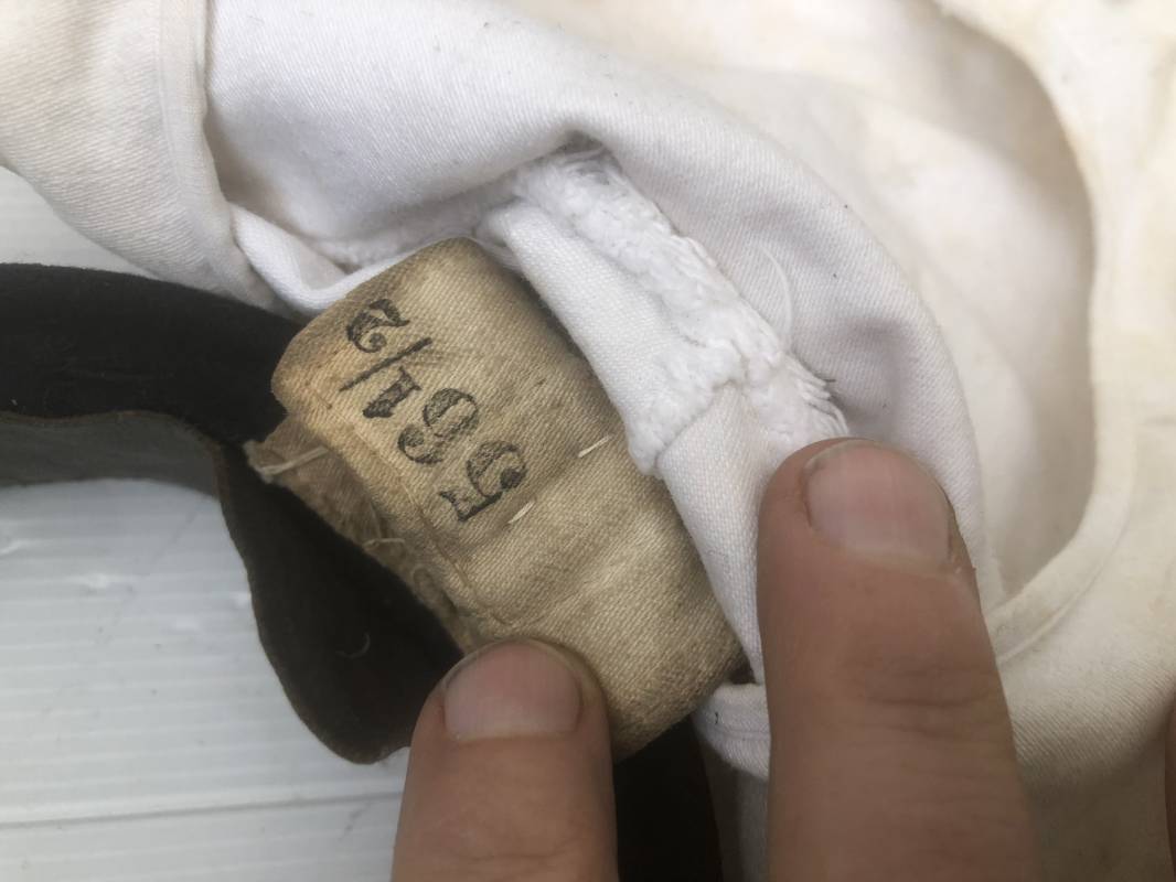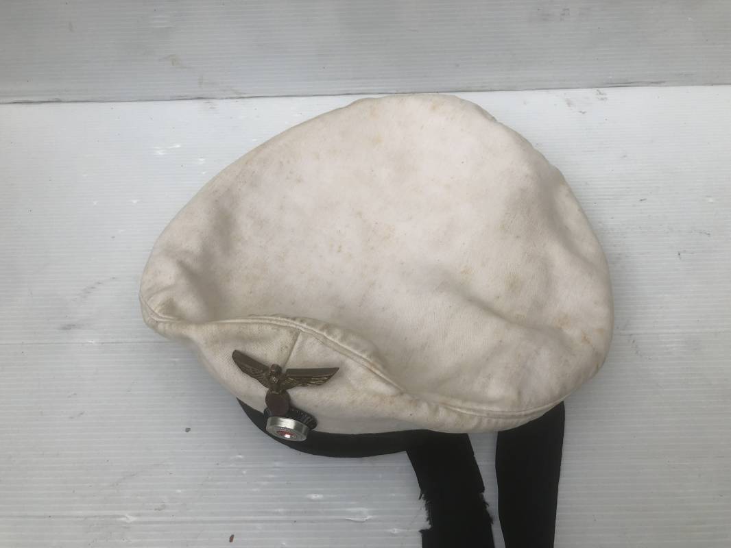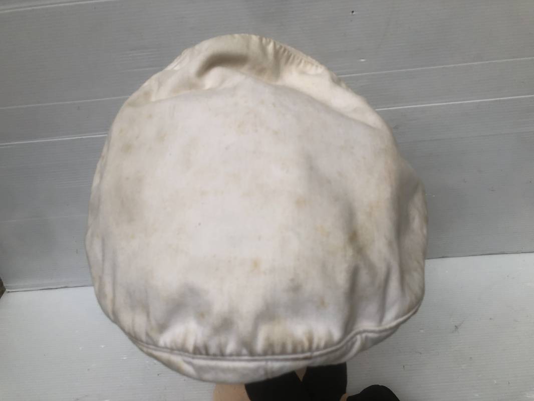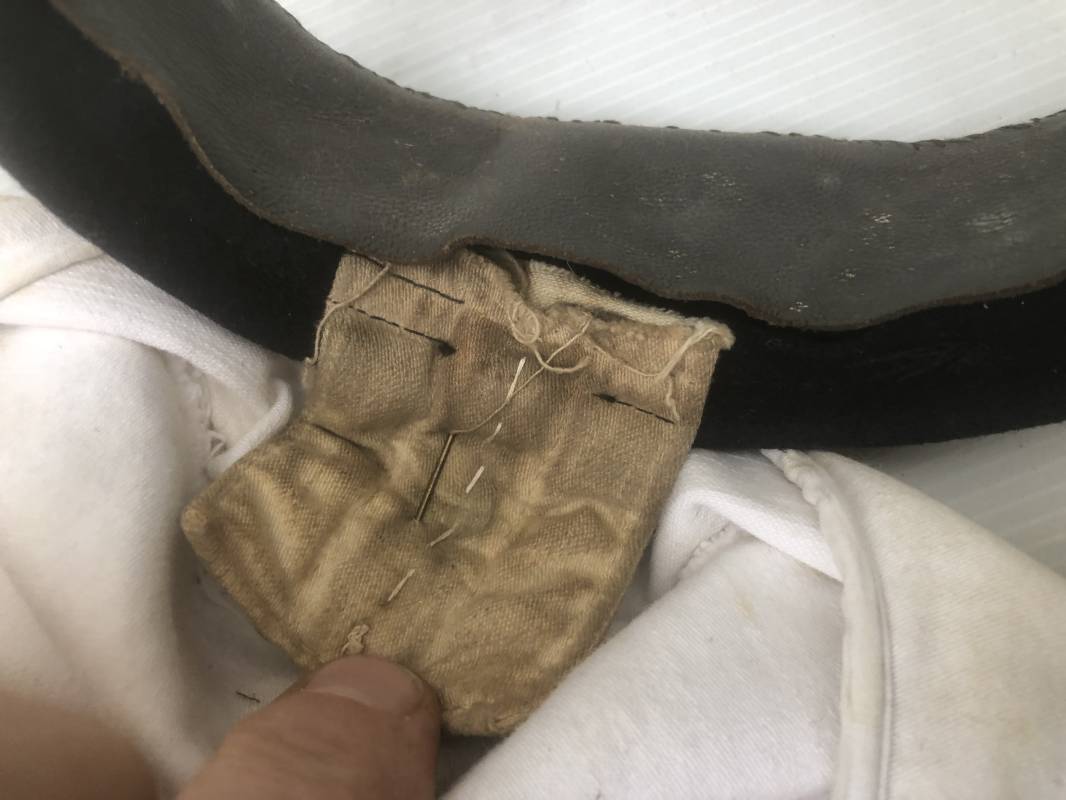 Rare bachis réglementaire d'un matelot de la Kriegsmarine . Bachis amovible avec sa coiffe en coton blanc Bachis en coton bleu nuit , bande de bachis en soie noire tissée BEVO en fil doré ' KRIEGSMARINE' Pourtour de coiffe en célléon translucide typique des bonne fabrication 2éme guerre . Célléon cassé avec manque ( voir photos ) Bandeau de coiffe intérieure en cuir gris . Cuir souple taille 57 Peties déchirures . Coiffe en coton blanc de dotation avec marquage encre de taille 57 , nom du matelot manuscrit en fond de coiffe . Insignes mono bloc , aigle doré et cocarde métalliques avec fixation par épingle verticale . Bachis porté , trés belle patine générale . Rare coiffure 100 % dans son jus et totalement intouchée 1940/45 Ref 19526